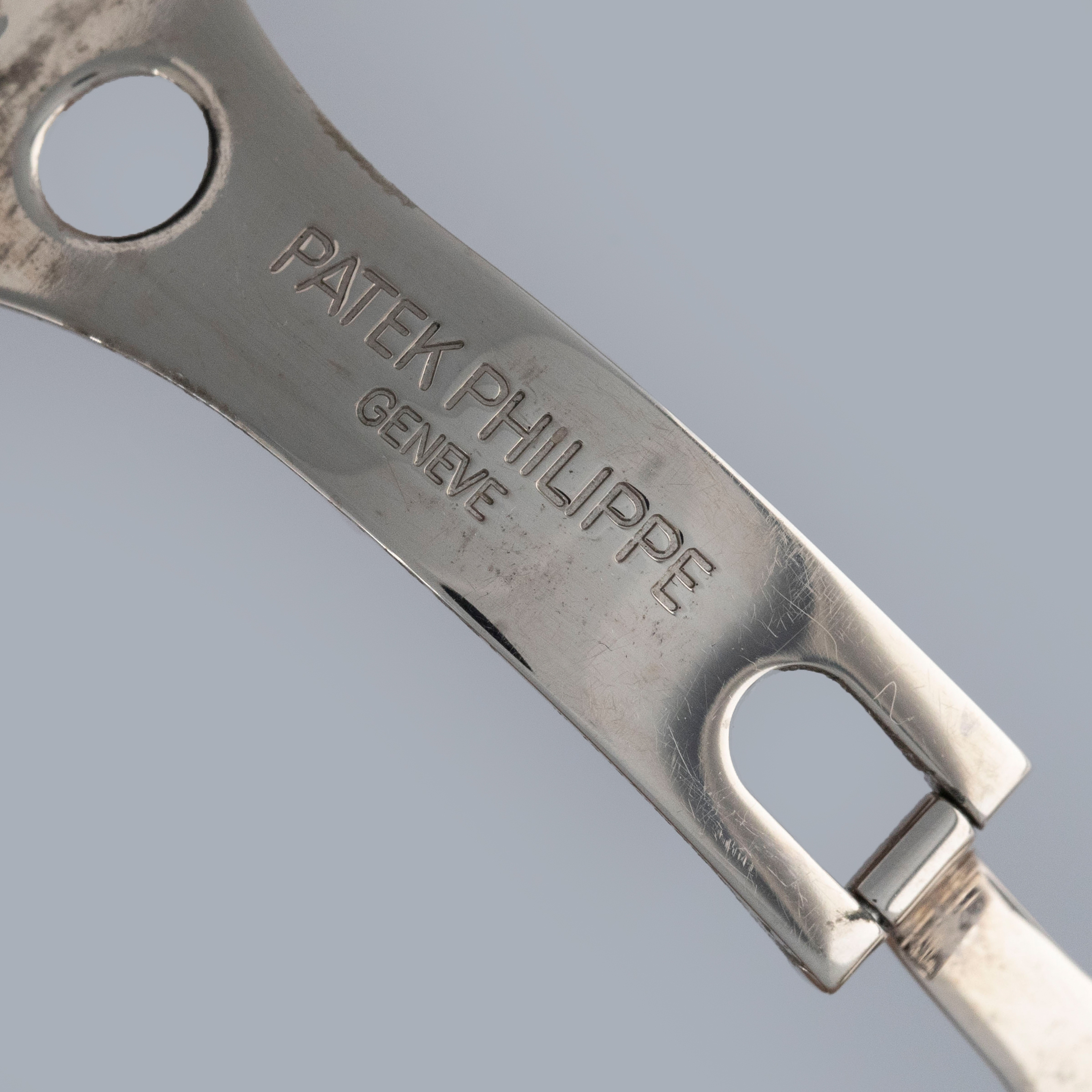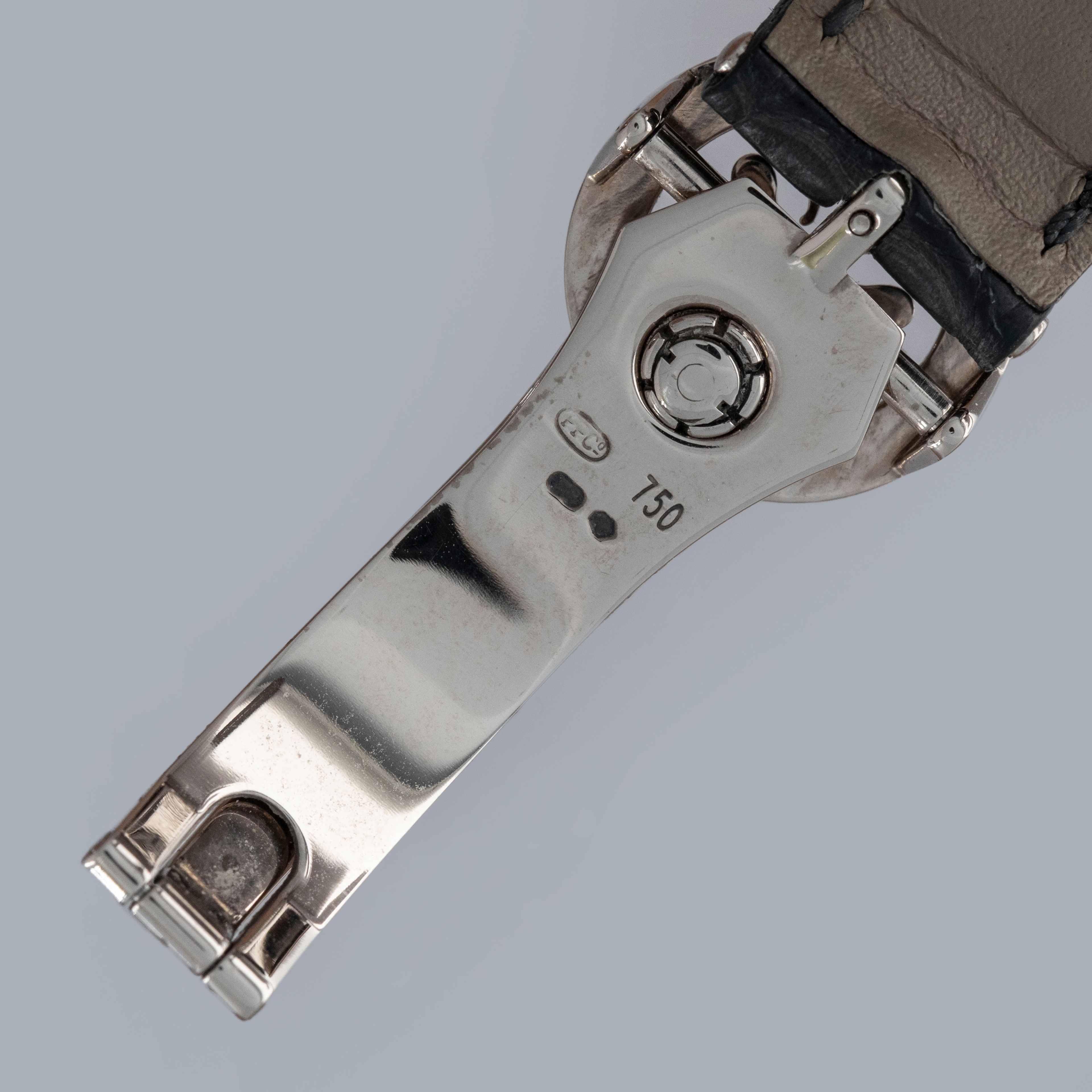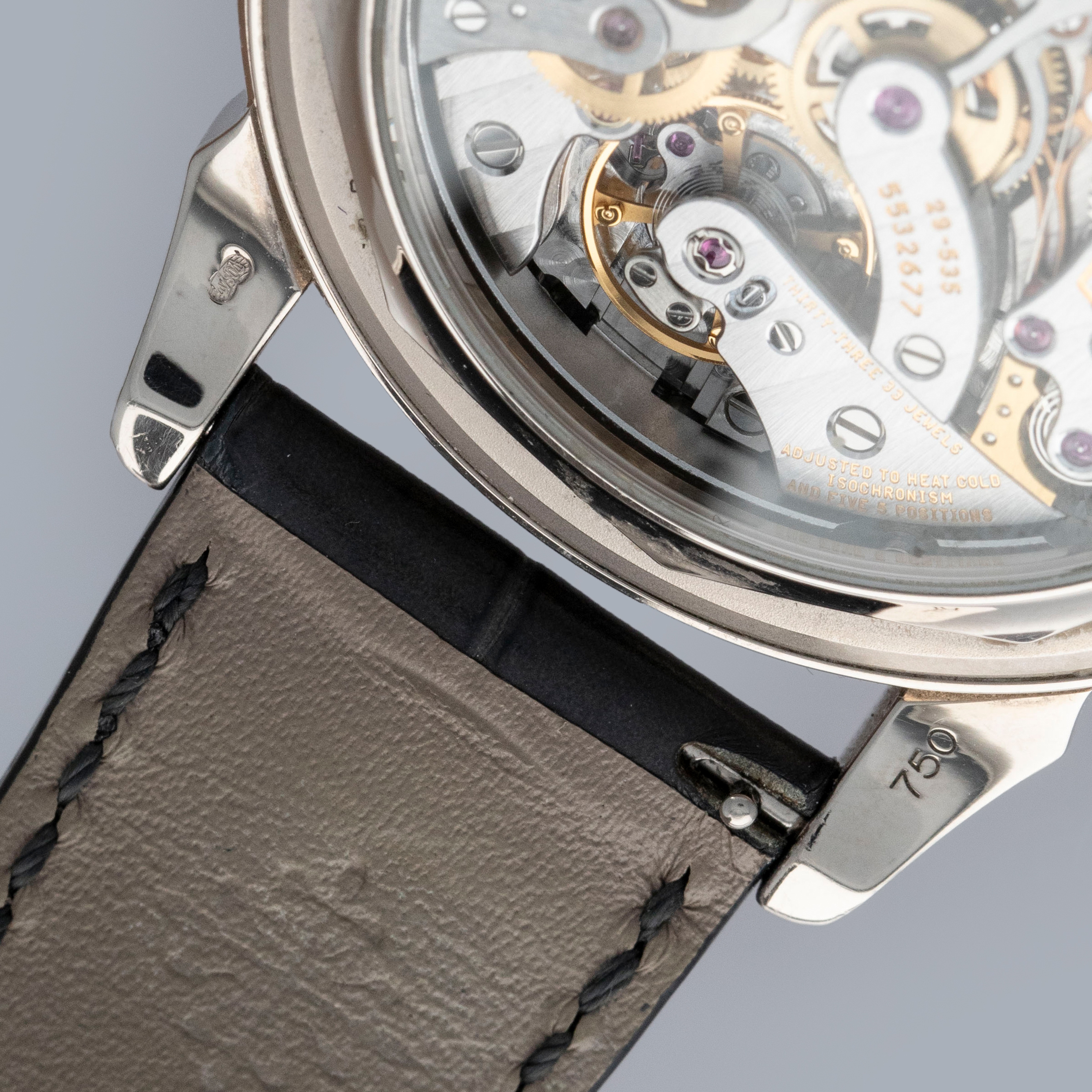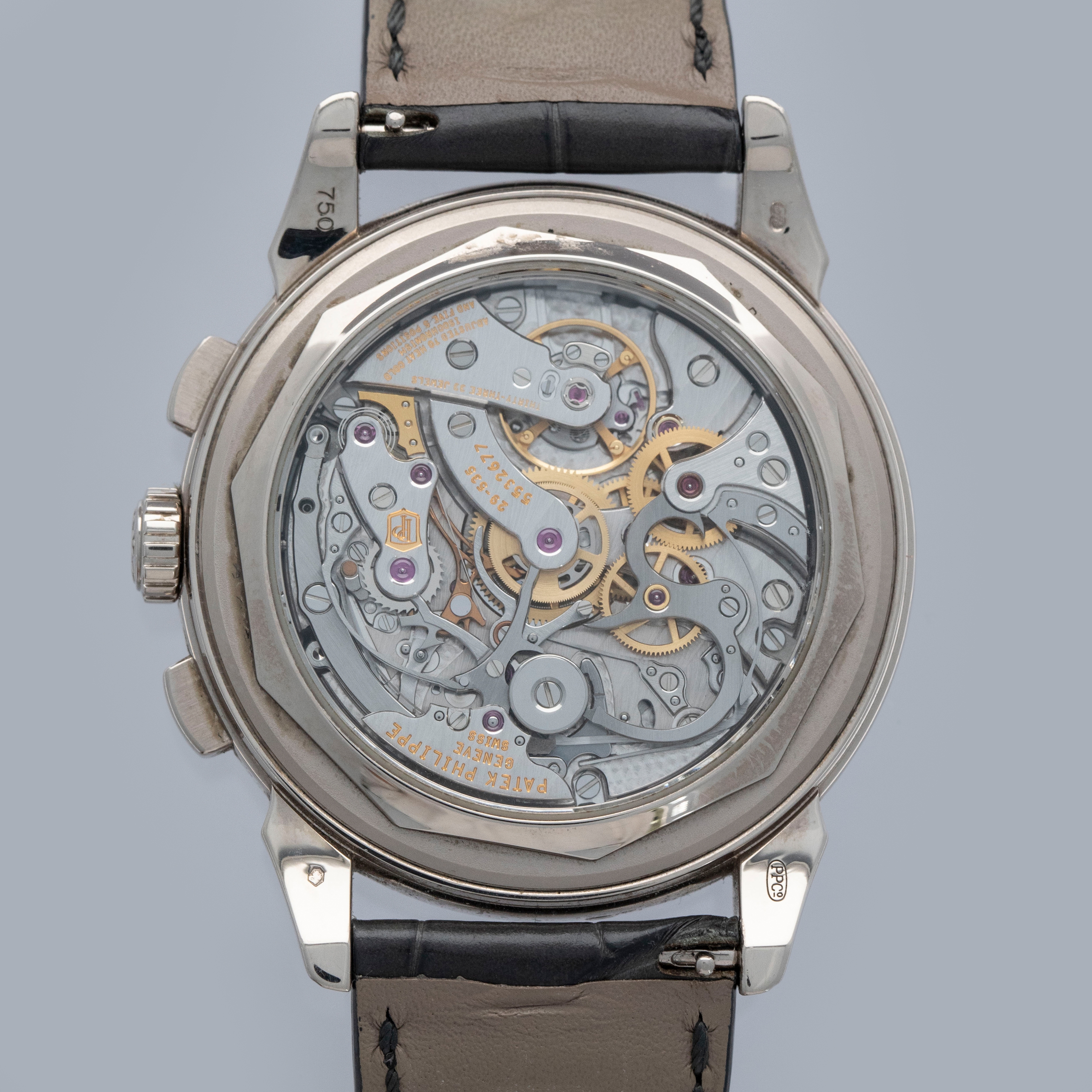 The watch is in overall excellent condition. The white gold case shows light scratches and a couple of small nicks, with crisp hallmarks on the rear of the lugs. The display case back is clean, with some light scratches on the white gold outer edge. The dial and hands are like new. It is fitted with a Patek Philippe alligator strap and a white gold deployant clasp in excellent condition. The watch is accompanied by its inner and outer boxes, original certificate, booklets, wallet, hang tag, spare solid case back, and setting pin.