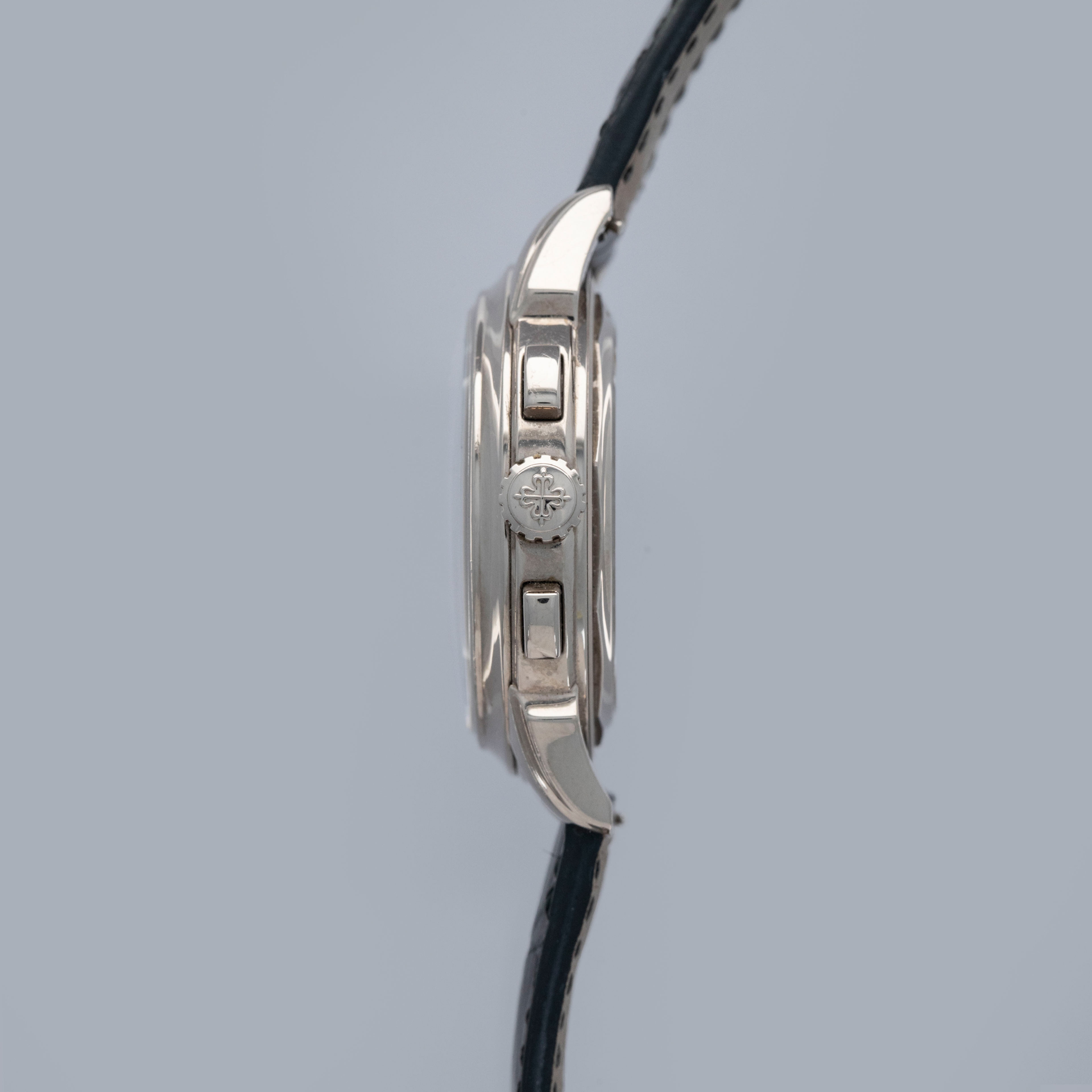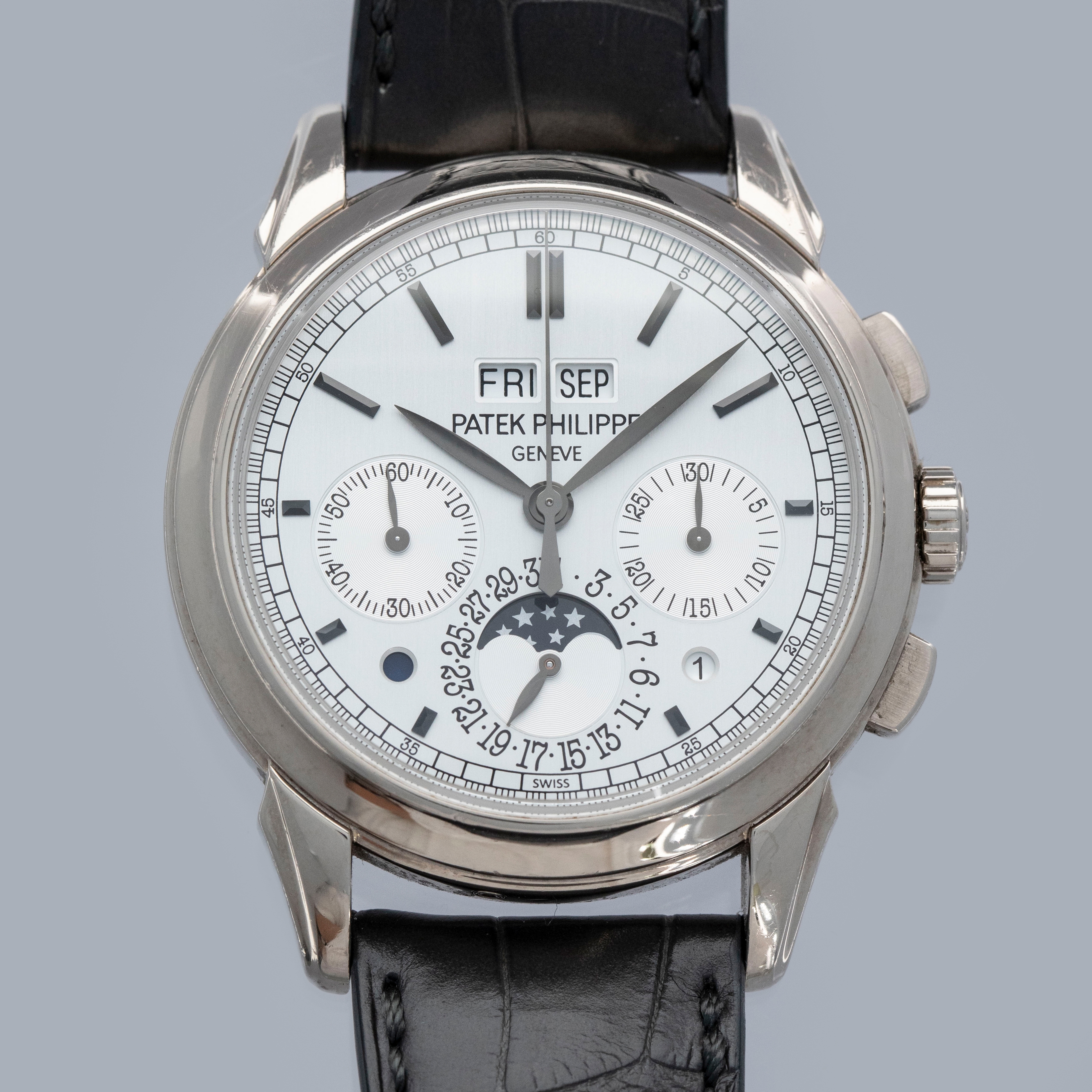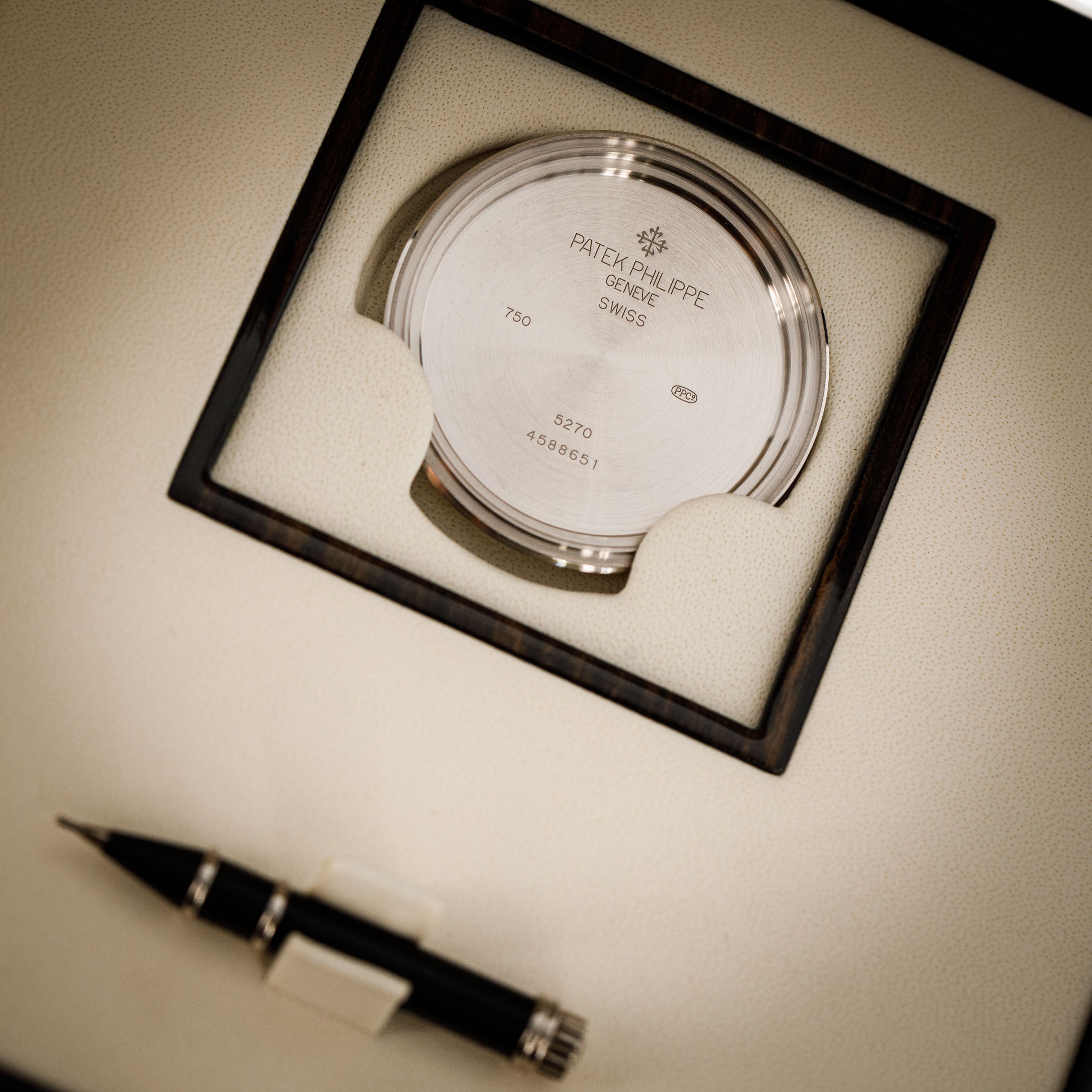 Offered as a first-generation ref. 5270, this example's bright silver dial lacks the rather ungainly "chin" that was later added to the dial whereby the pointer date subdial at 6 o'clock was dropped down into the minute scale that surrounds the dial periphery, making the first generation of the ref. 5270 the one to have.