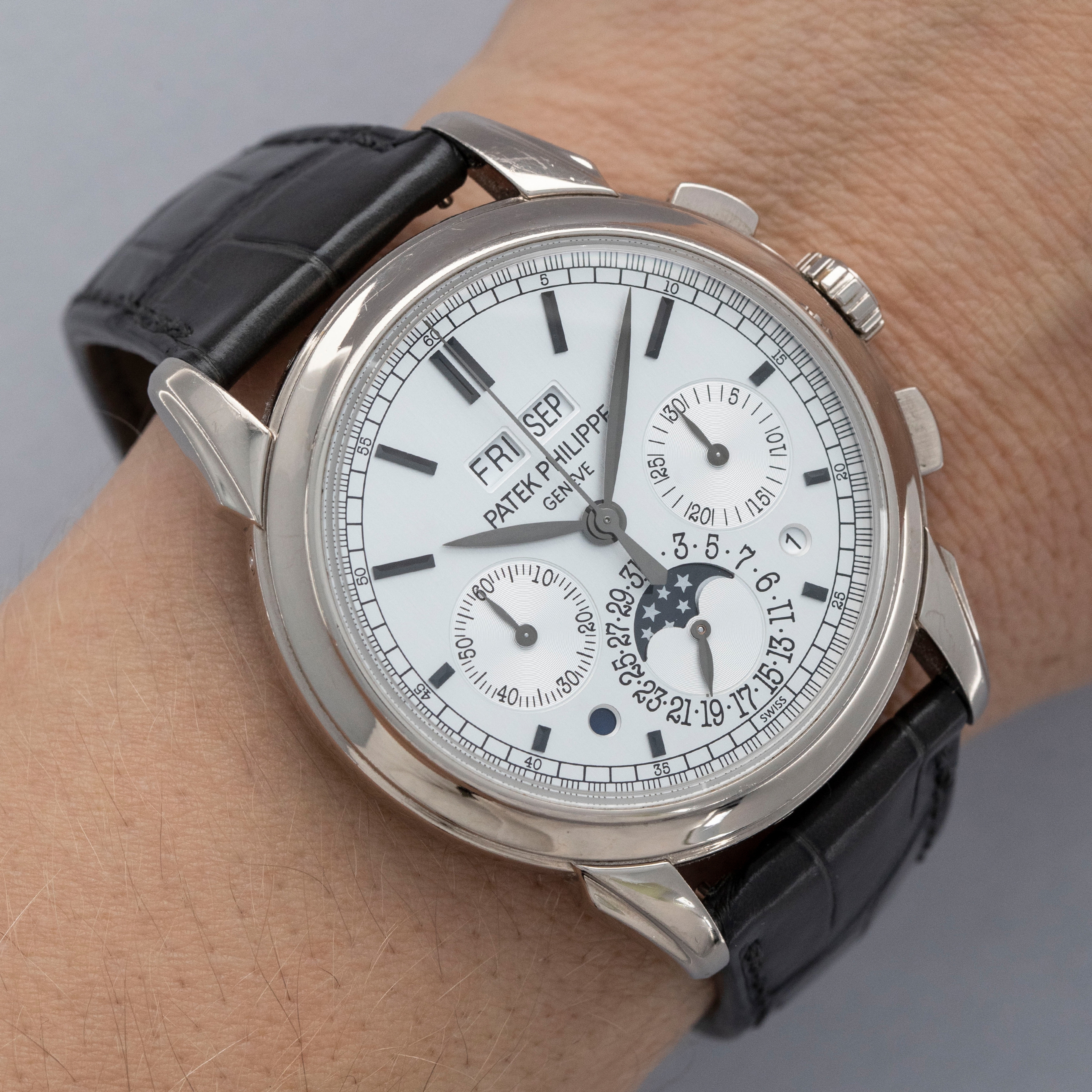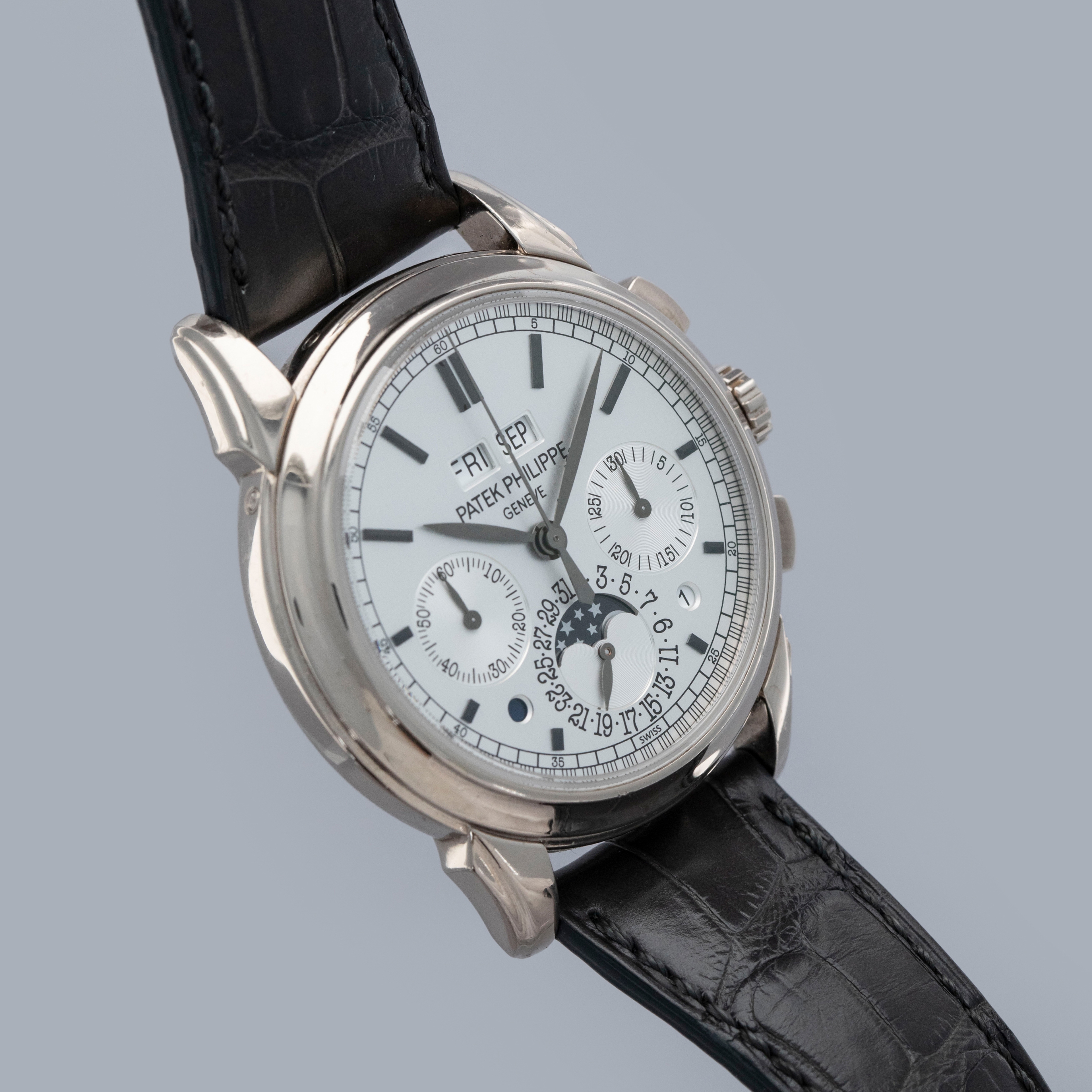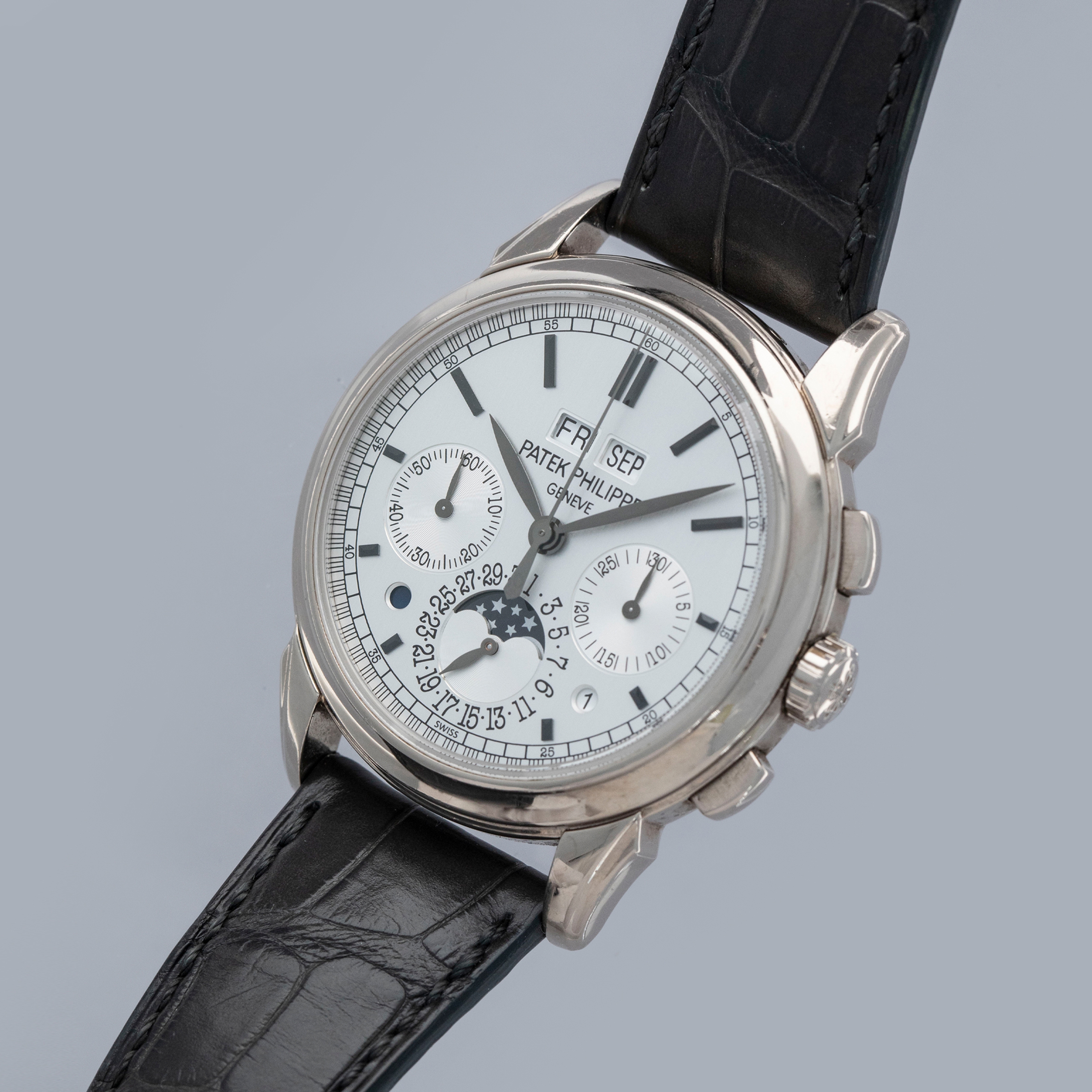 Offered as a first-generation ref. 5270, this example's bright silver dial lacks the rather ungainly "chin" that was later added to the dial whereby the pointer date subdial at 6 o'clock was dropped down into the minute scale that surrounds the dial periphery, making the first generation of the ref. 5270 the one to have.