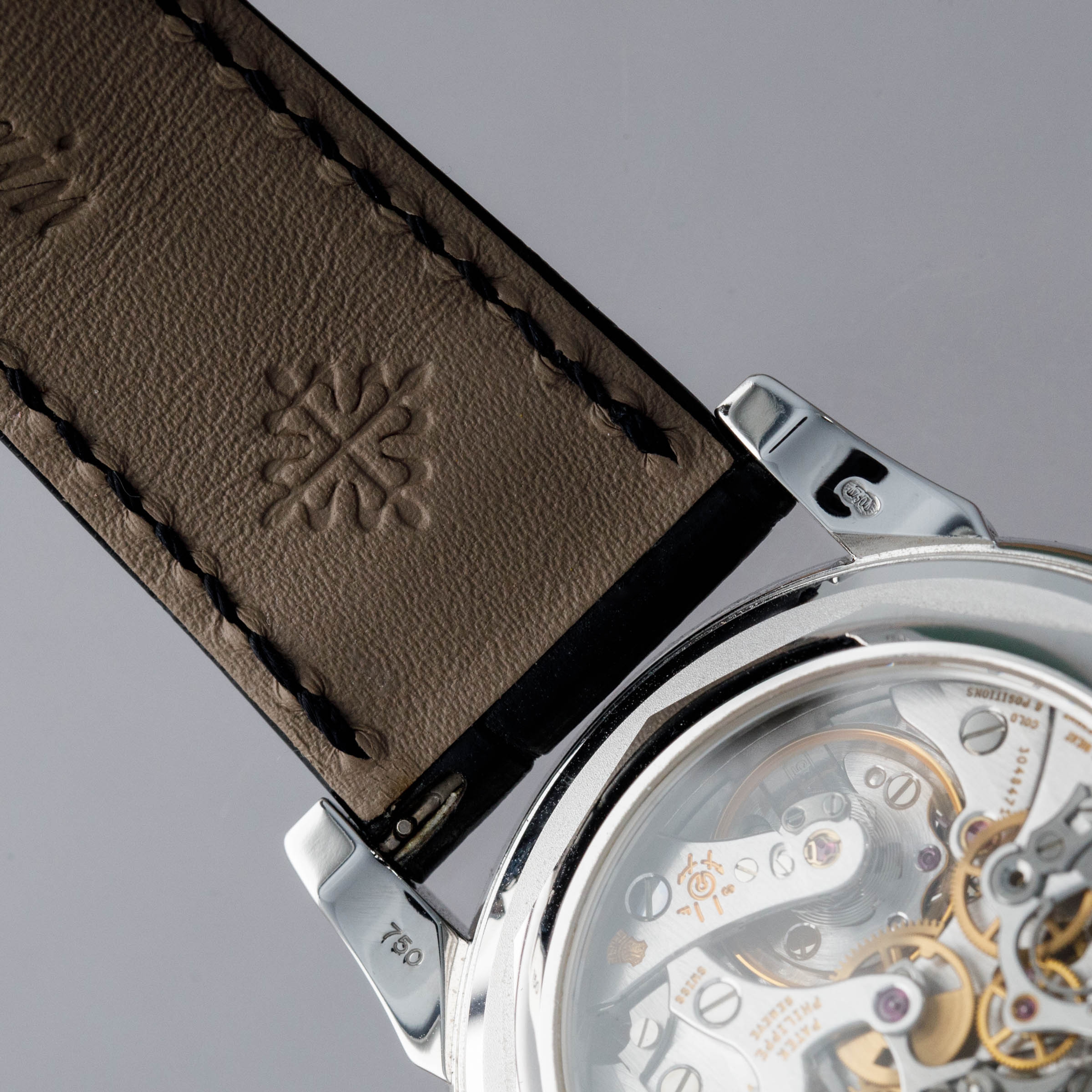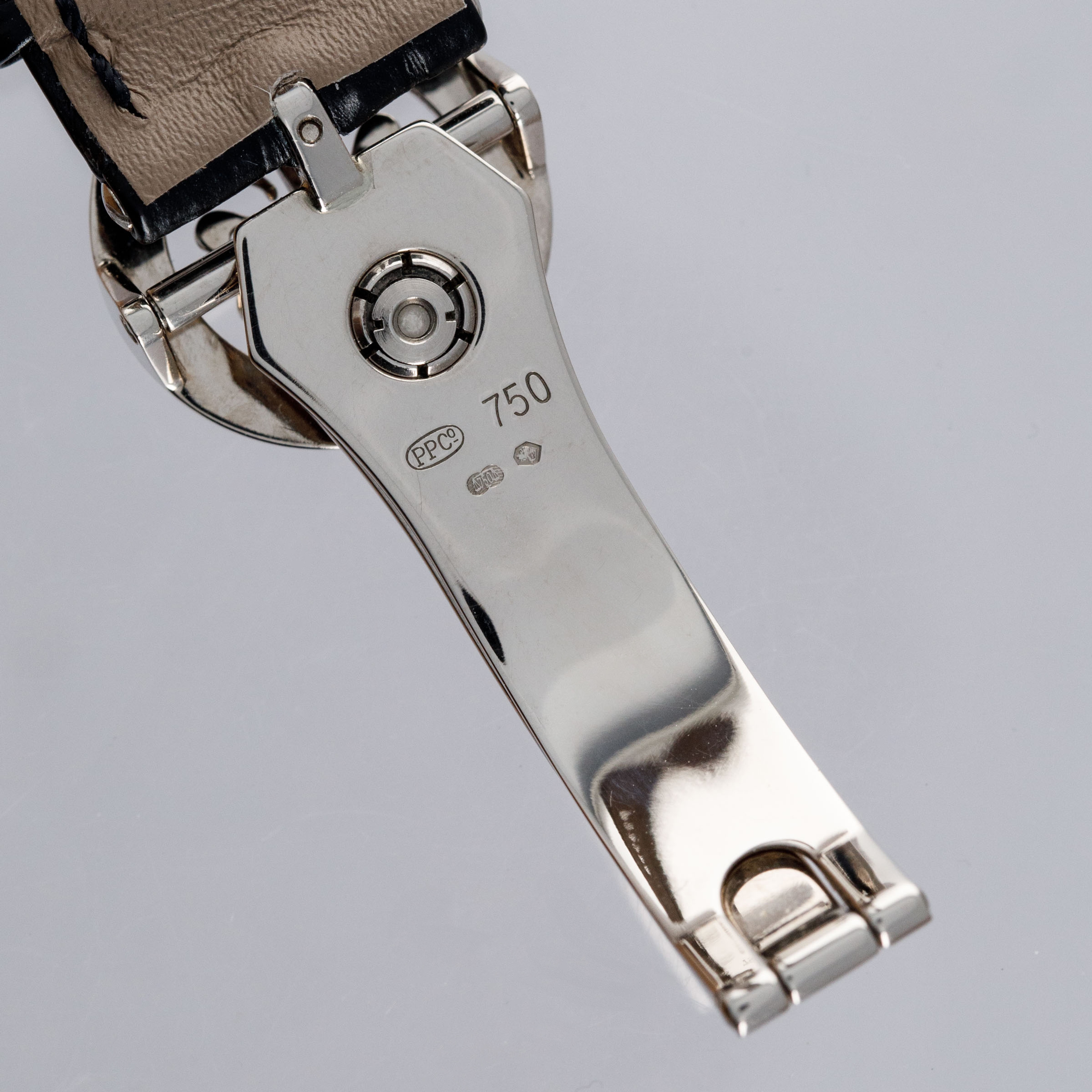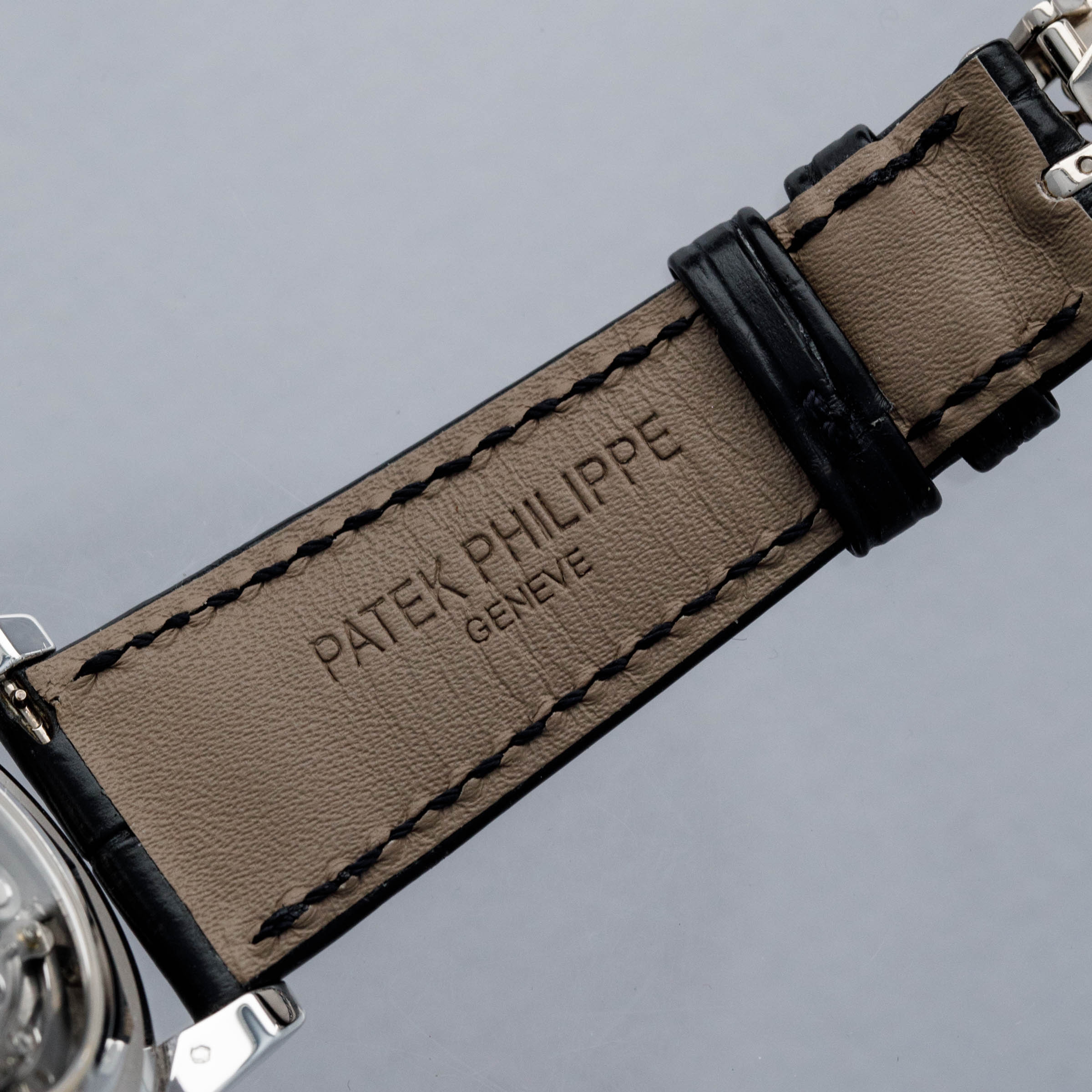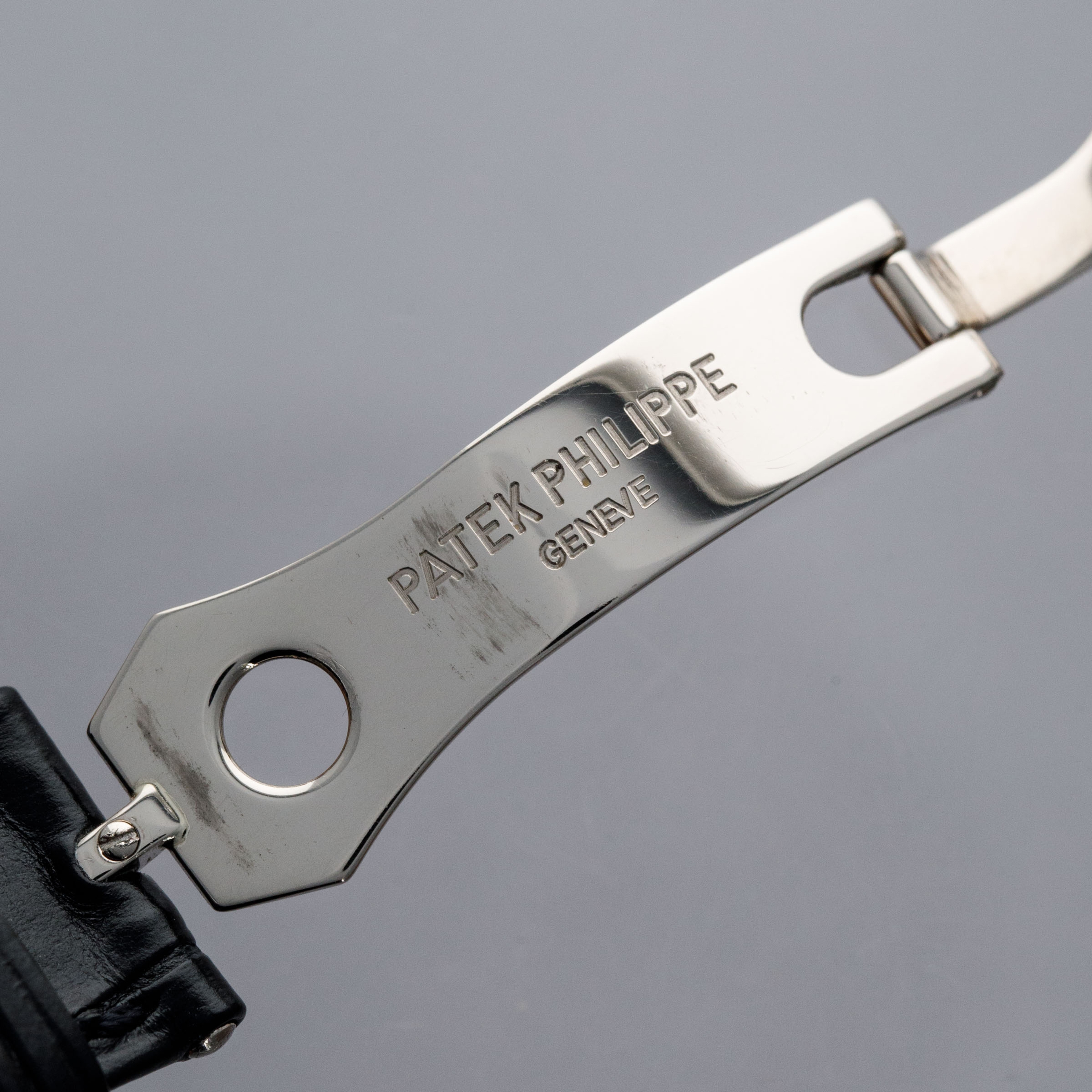 Watch is in near-mint overall condition. Case exhibits light signs of wear, with some hairlines and small marks visible on some of the surfaces. Hallmarks are crisp and fully visible on the rear of the lugs. Dial in pristine condition, blackened hands show light signs of oxidation- a common trait of blackened hands from Patek Philippe. Watch comes on an original Patek alligator strap in like new condition, and an original 18k deployant buckle. The buckle shows minor surface wear.