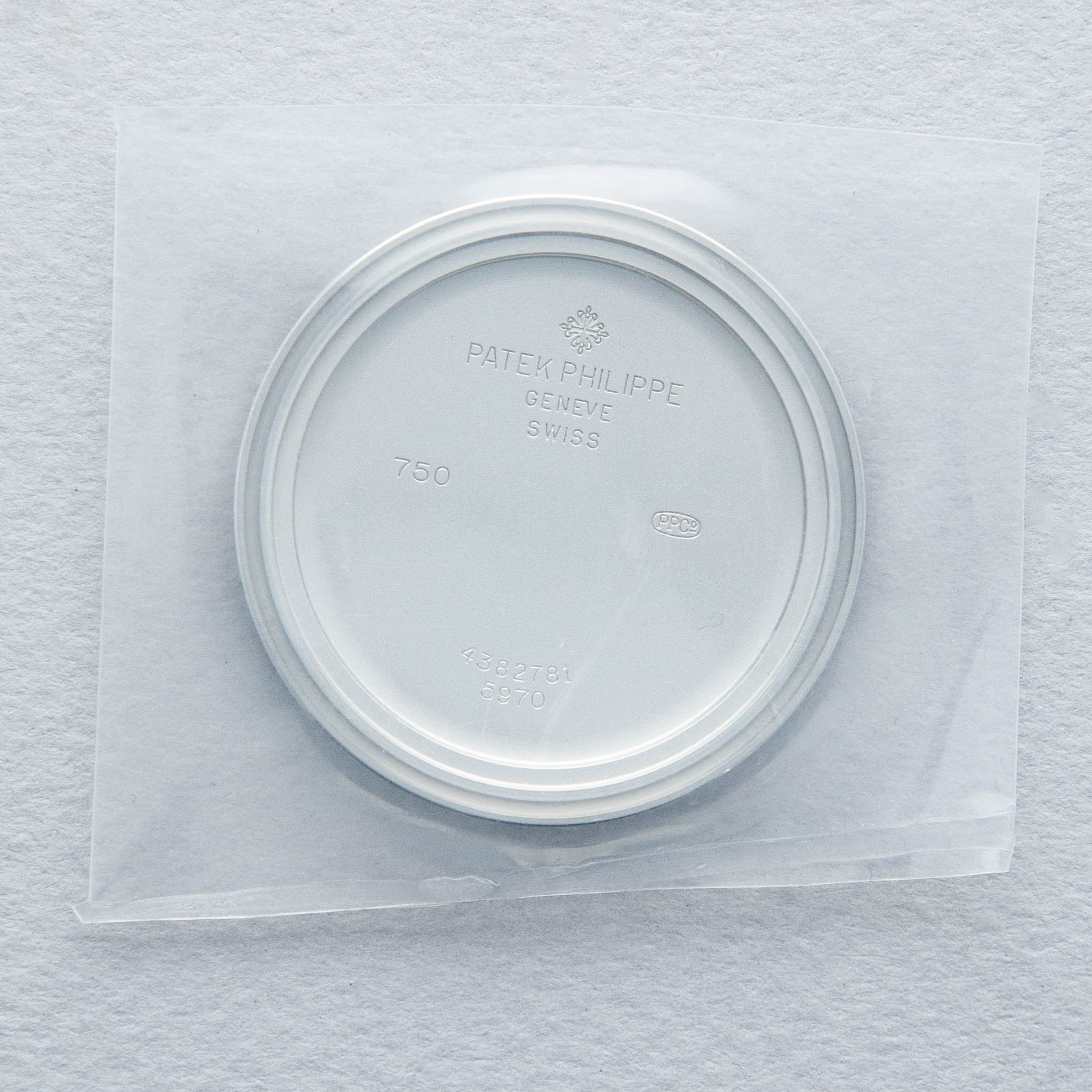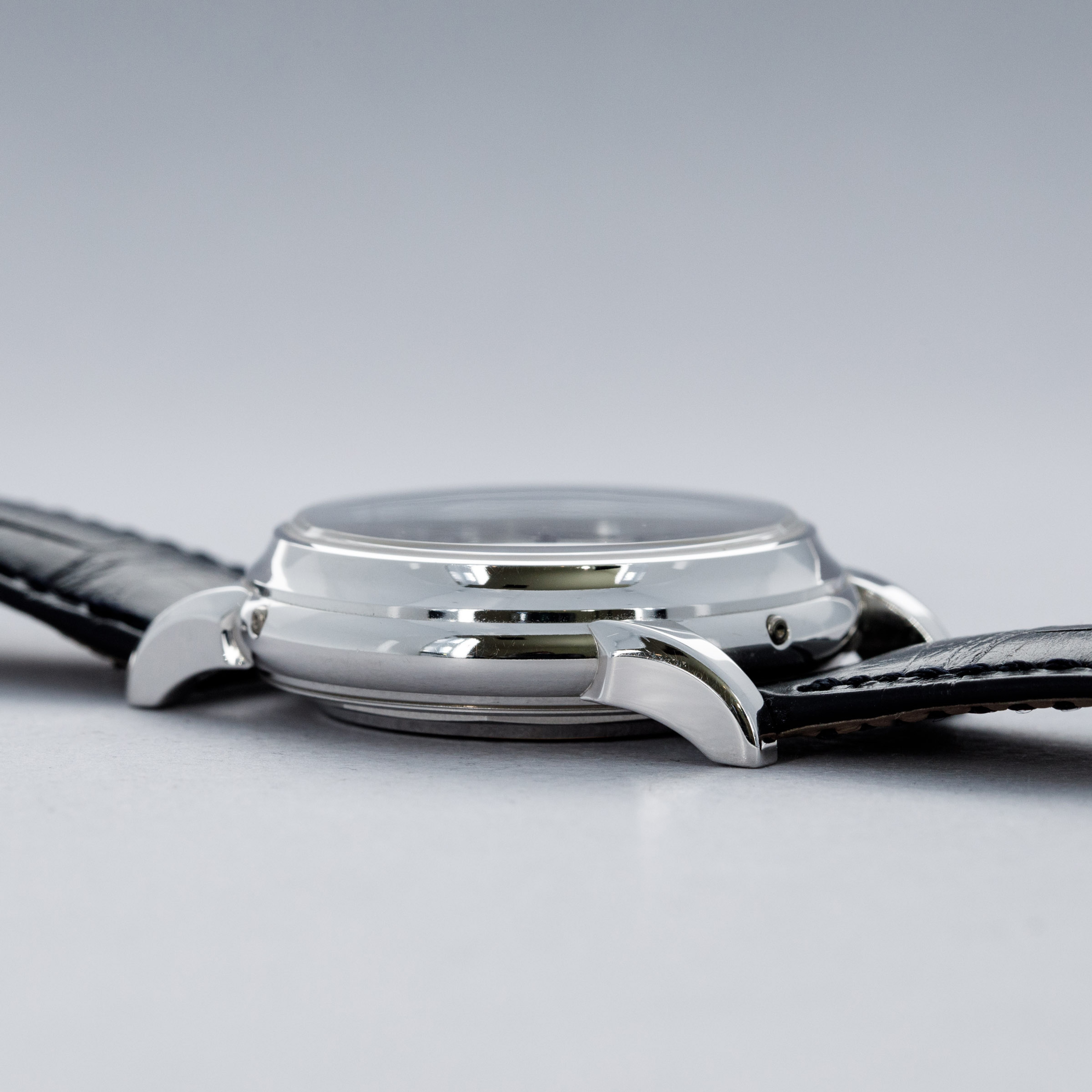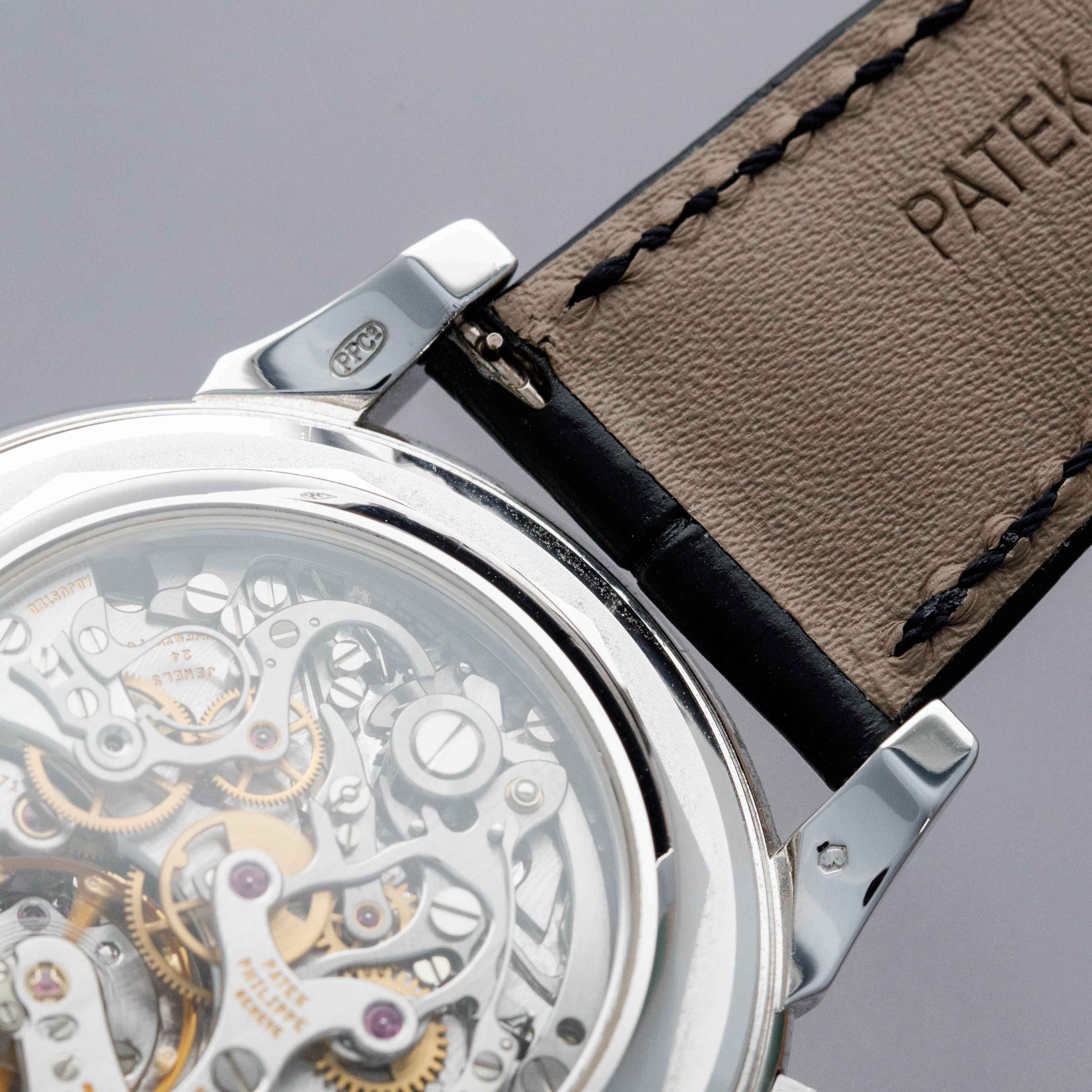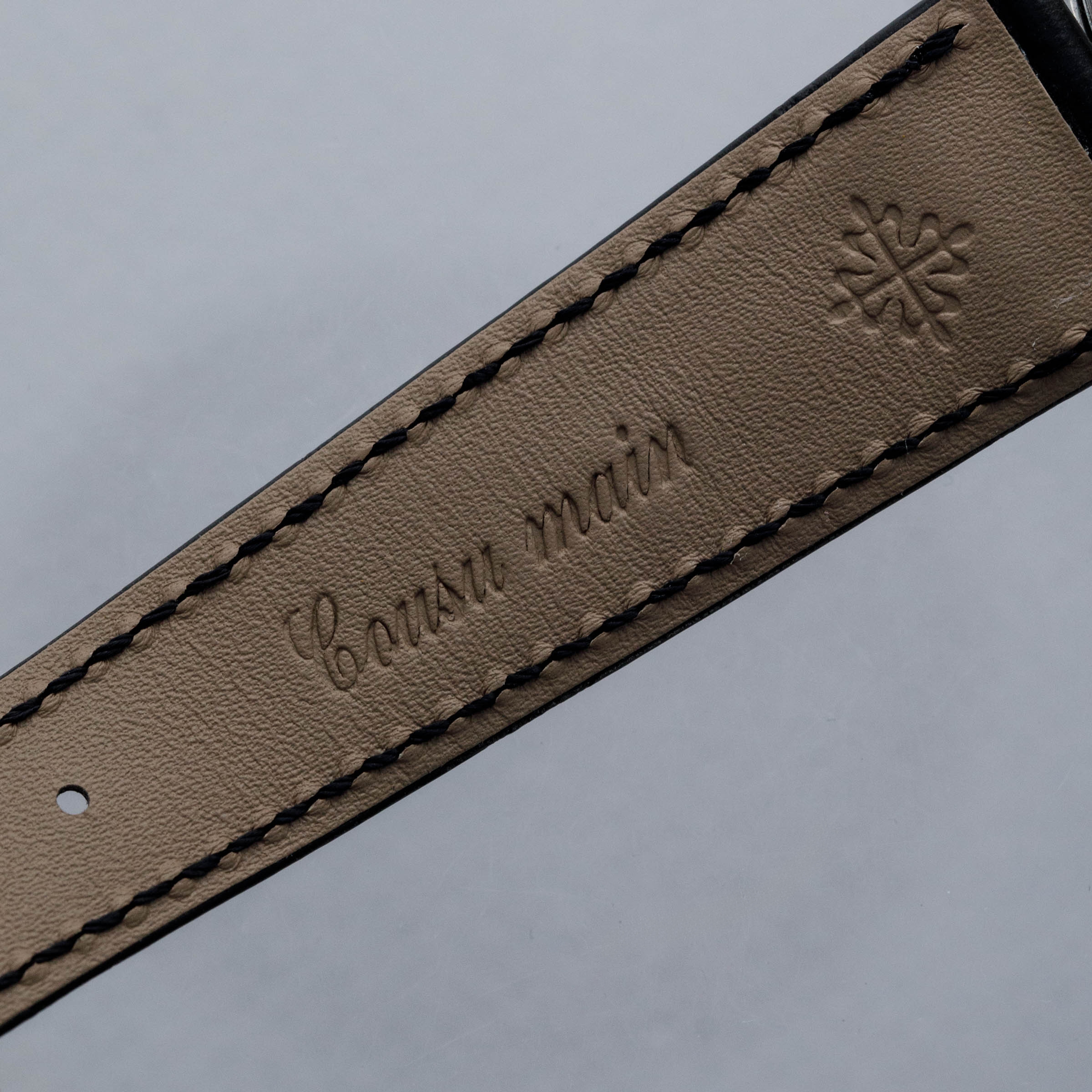 Watch is in near-mint overall condition. Case exhibits light signs of wear, with some hairlines and small marks visible on some of the surfaces. Hallmarks are crisp and fully visible on the rear of the lugs. Dial in pristine condition, blackened hands show light signs of oxidation- a common trait of blackened hands from Patek Philippe. Watch comes on an original Patek alligator strap in like new condition, and an original 18k deployant buckle. The buckle shows minor surface wear.