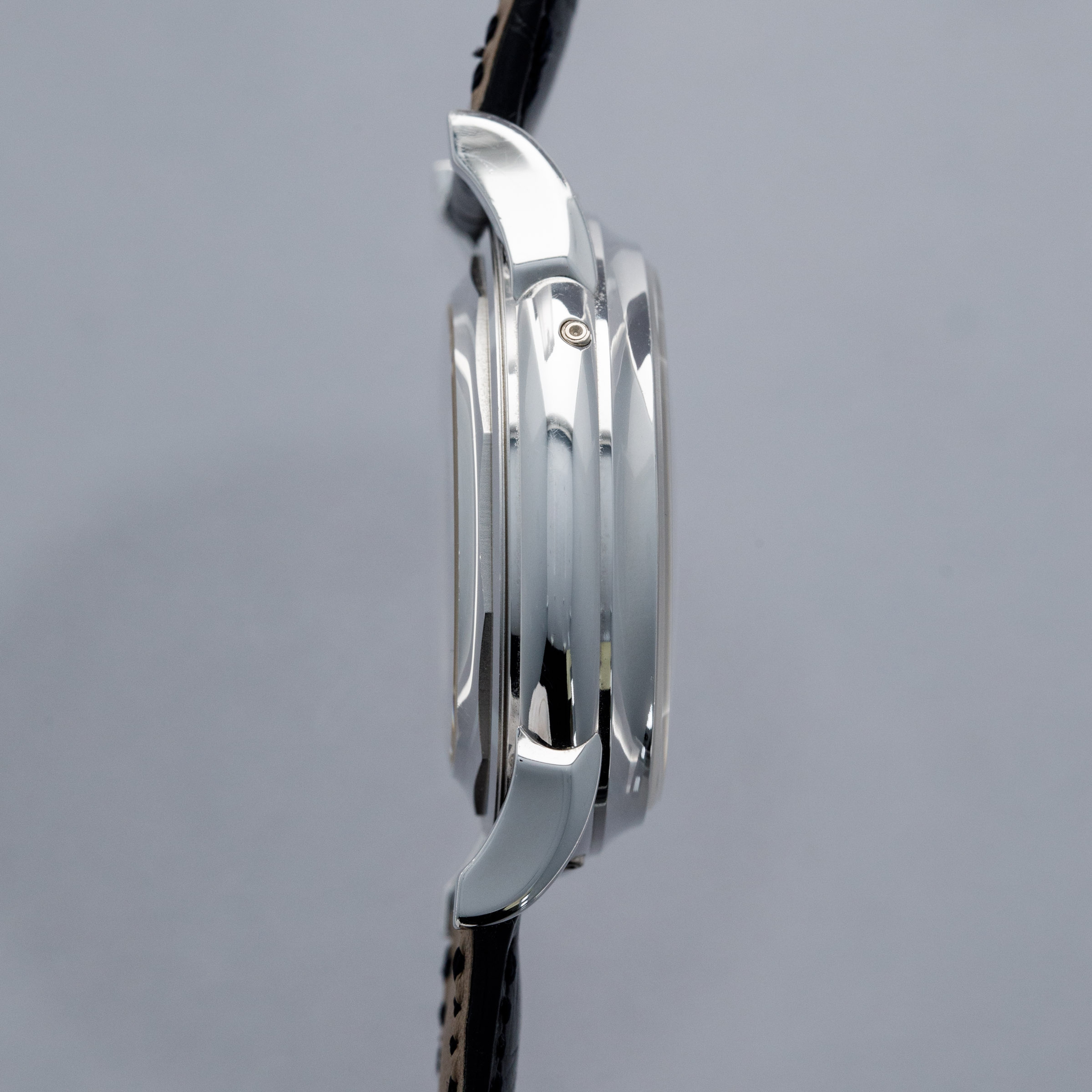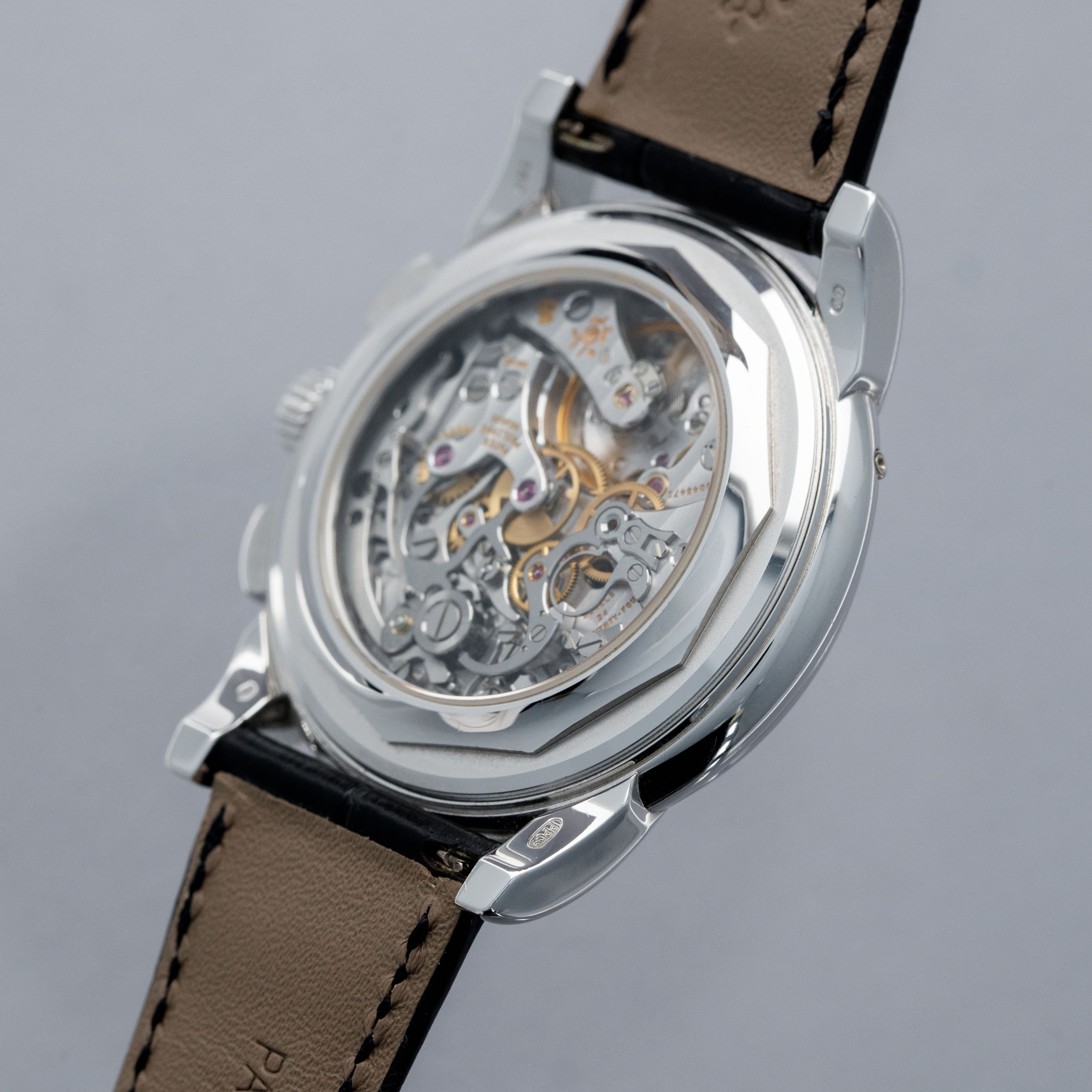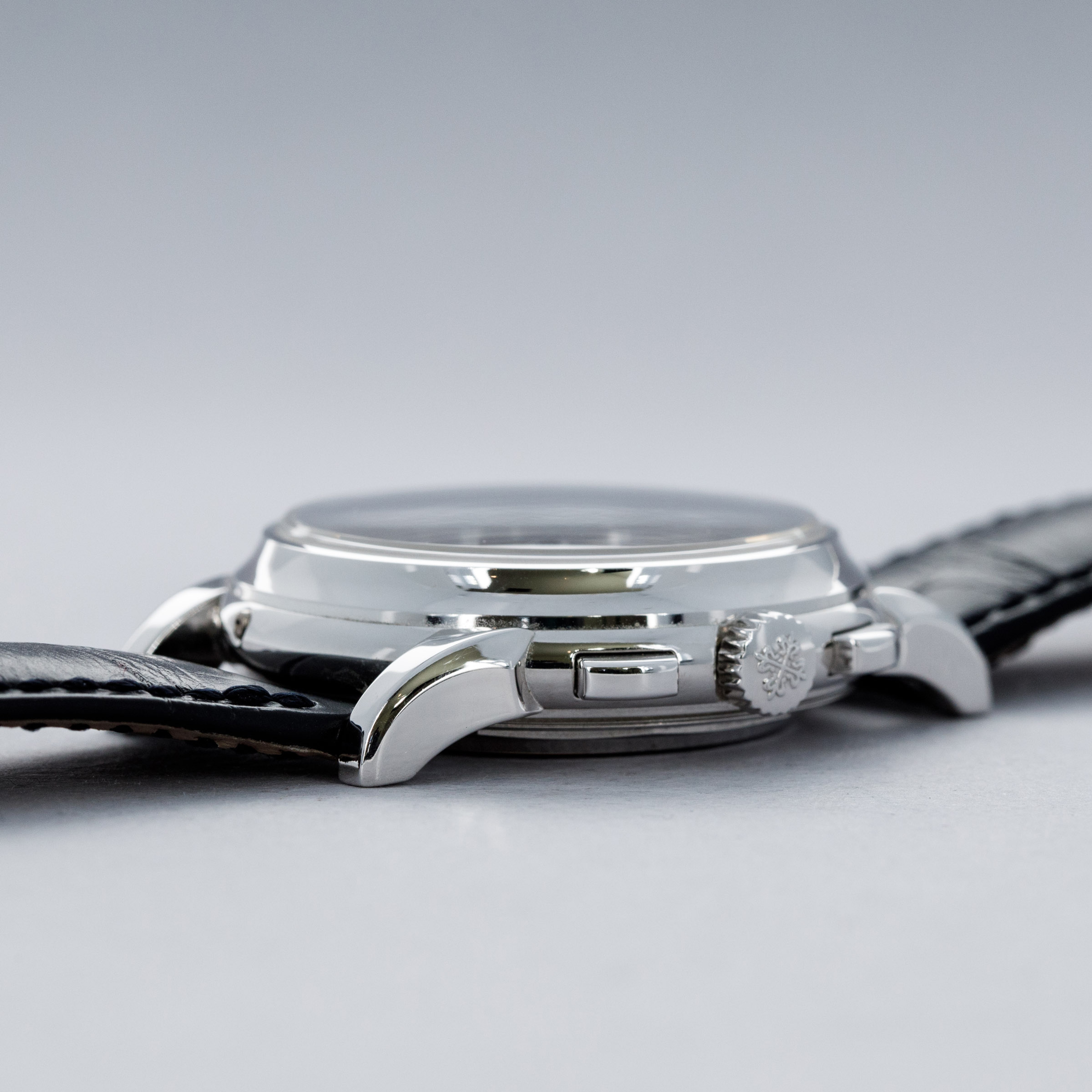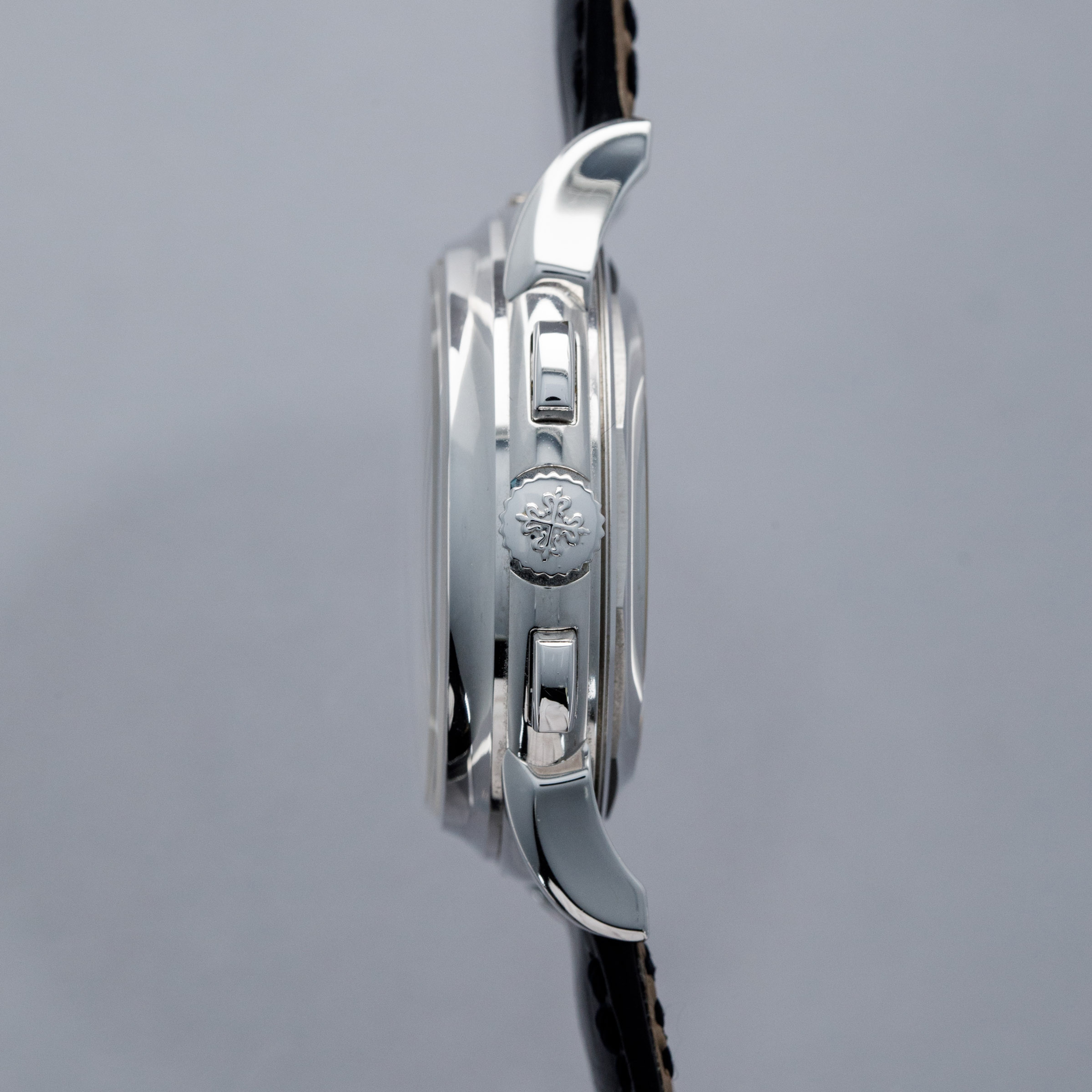 Hailing from an extended family of perpetual calendar chronographs, the Patek Philippe Perpetual Calendar Chronograph ref. 5970 is a timepiece that embodies the famed watchmaker’s traditional approach to Haute Horlogerie. Launched in 2004 and beginning production in 2005 and produced for a short six years until 2011, the ref. 5970 was offered as part of Patek’s long and storied past of producing perpetual calendar chronographs. Powered by one of the most stunning column wheel chronograph movements ever made, the ref. 5790 displays behind its exhibition caseback the beautiful Lemania cal. CH 27-70Q movement. Produced exclusively for Patek Philippe, this labyrinthine movement combines a perpetual calendar within its chronograph subdials in keeping with the iconic design language of its predecessor, the ref. 1518. Featuring a leap-year indicator, a pointer date, a 24-hour indicator, and a moon phase all within its three subdials and the day and month within two apertures at 12 o’clock, the ref. 5970’s silver dial is as well-balanced and symmetrical as possible. Found within a modern 40mm 18kt white gold case, the ref. 5970 is modern in its execution. Made of 18kt white gold, the ref. 5970G that we have here was only offered for a short two year period until 2007, which is when it was then removed from the catalog.