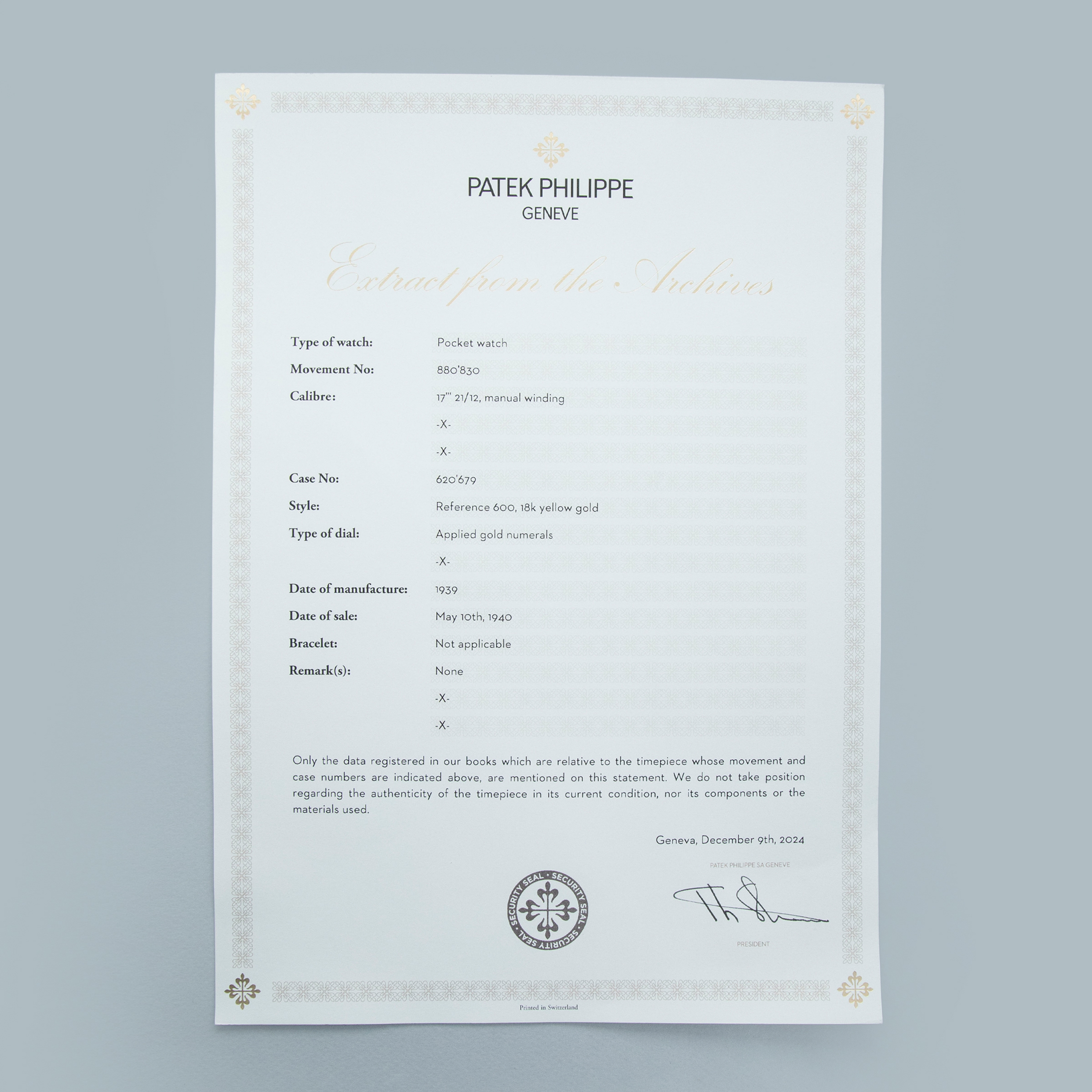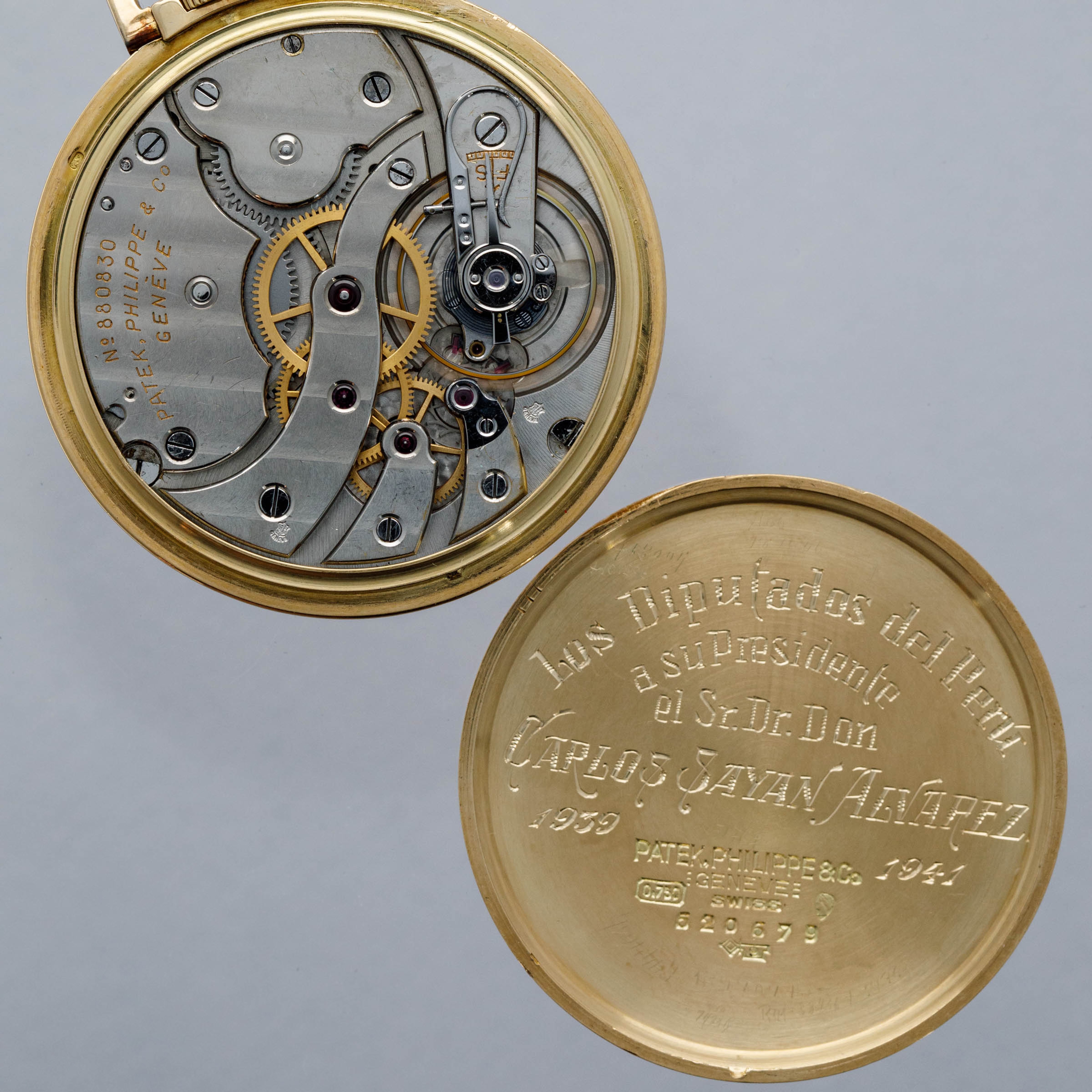 Famed for their intensely luxurious eye for detail and unparalleled heritage within the watchmaking industry, Patek Philippe has long been at the top of the horology pyramid. While their modern plaudits come from their infamously desirable wristwatches, the brand began life creating pocket watches, much like other watchmakers that began life during the 19th century and before. As such, it is pocket watches, like the example we have here, that drew attention to Patek Philippe’s original legendary aesthetic and unwavering level of craftsmanship. Featuring an 18kt yellow gold construction, a beautiful silver dial with gold applied Arabic numerals and oversized feuille hands, and an engraved caseback within which its wonderfully finished manual-movement is hidden, this 1939 pocket watch is a stunning example of why Patek Philippe has been widely regarded as one of horology’s best watchmakers for centuries now - a reputation that they certainly have earned and will not lose any time soon. Offered as a watch that was once property of the Peruvian politician Carlos Alvarez who was an important Peruvian politician and magistrate with government positions such as constituent deputy from 1931 to 1936, Minister of Justice, Culture and Education in 1932, deputy for Chancay from 1939 to 1945 and president of its chamber in four legislative periods (1939-1940 and 1943-1944), and member and president of the Supreme Court of Justice from 1957 to 1958, this timepiece holds a special place within the history of Peru. Marking its lineage, this example’s caseback is engraved “LOS DIPUTADOS DEL PERÚ A SU PRESIDENTE EL SR. DR. DON CARLOS SAYÁN ALVAREZ 1939-1941” which translates to “THE DEPUTIES OF PERU TO ITS SR. Dr. DON CARLOS SAYÁN ALVAREZ 1939-1941”.