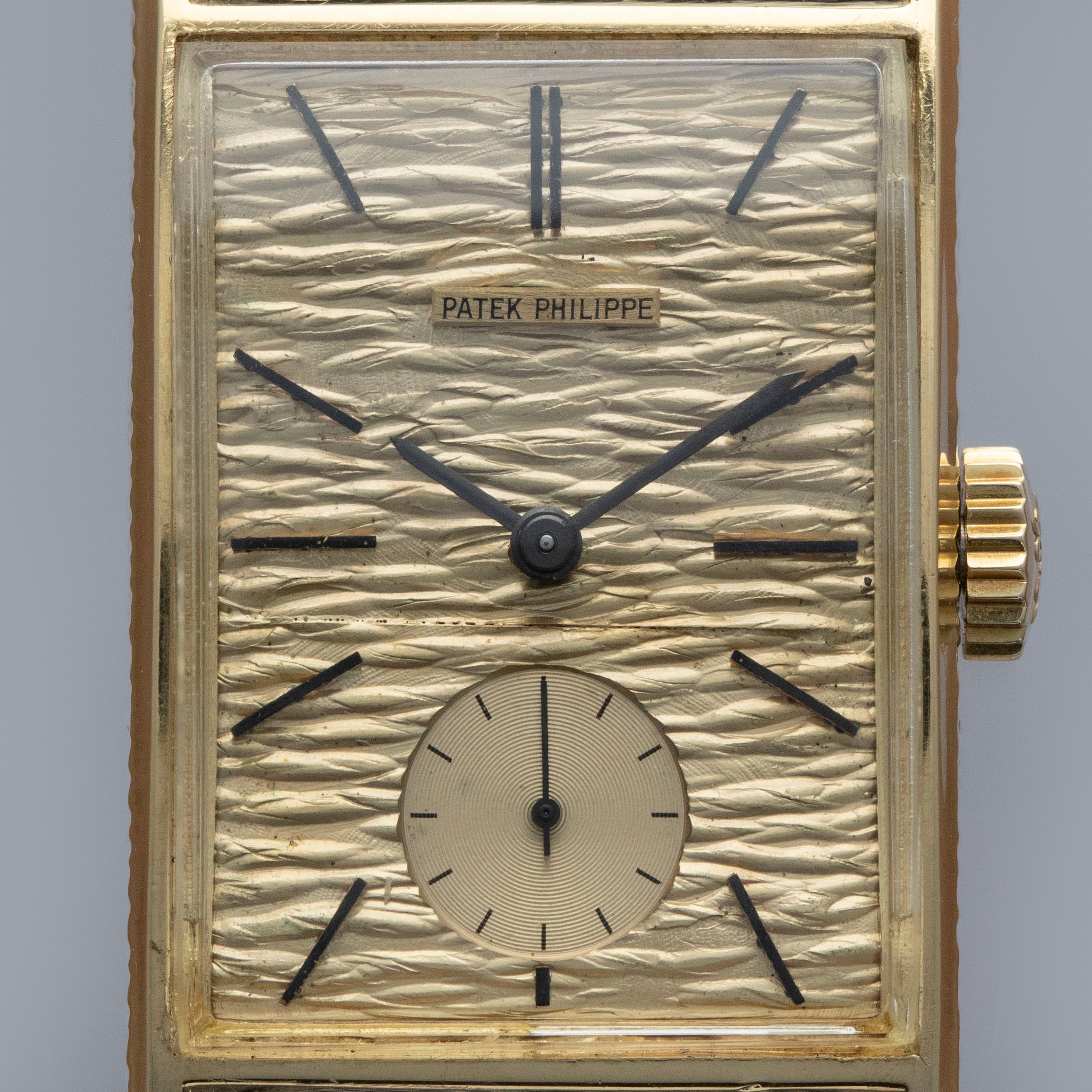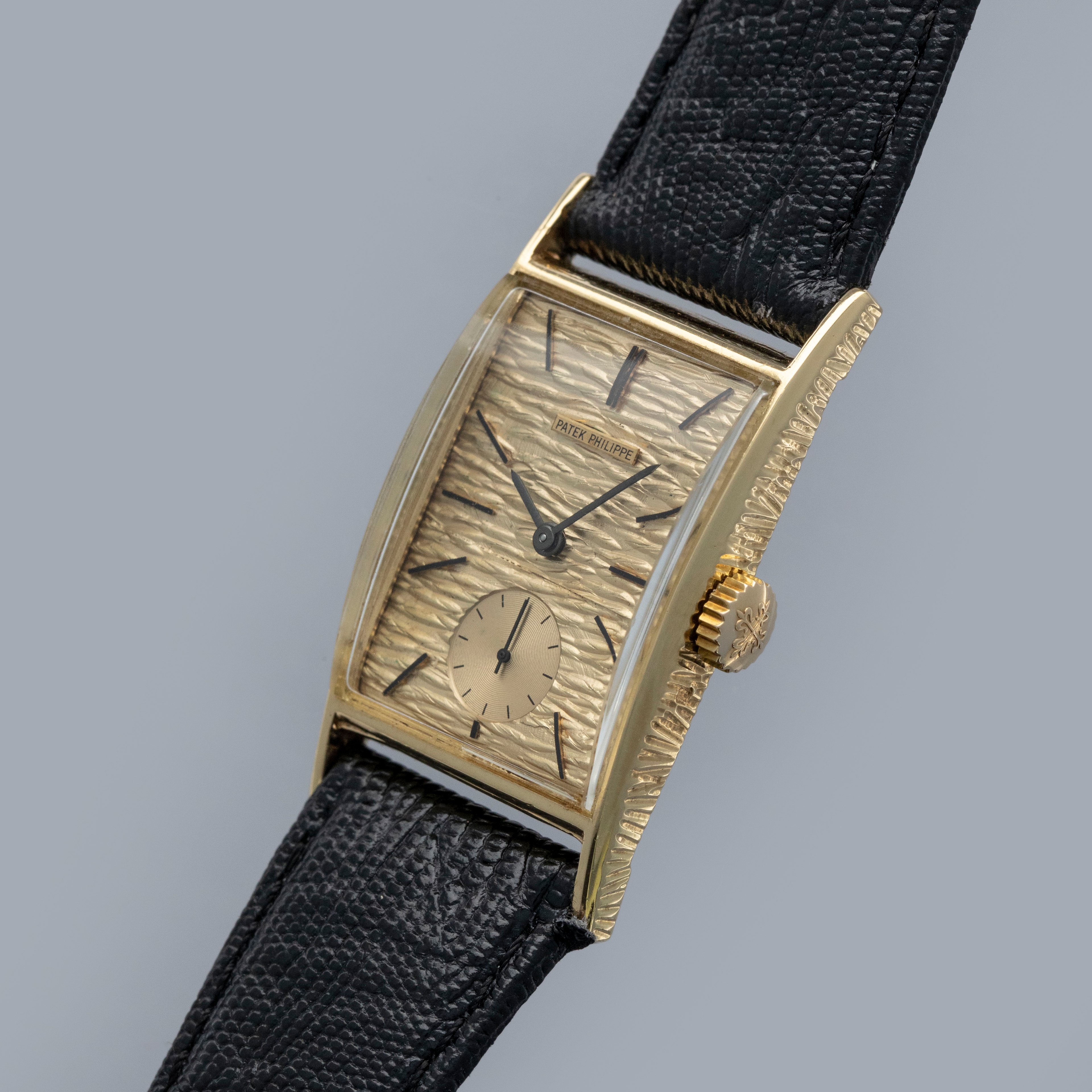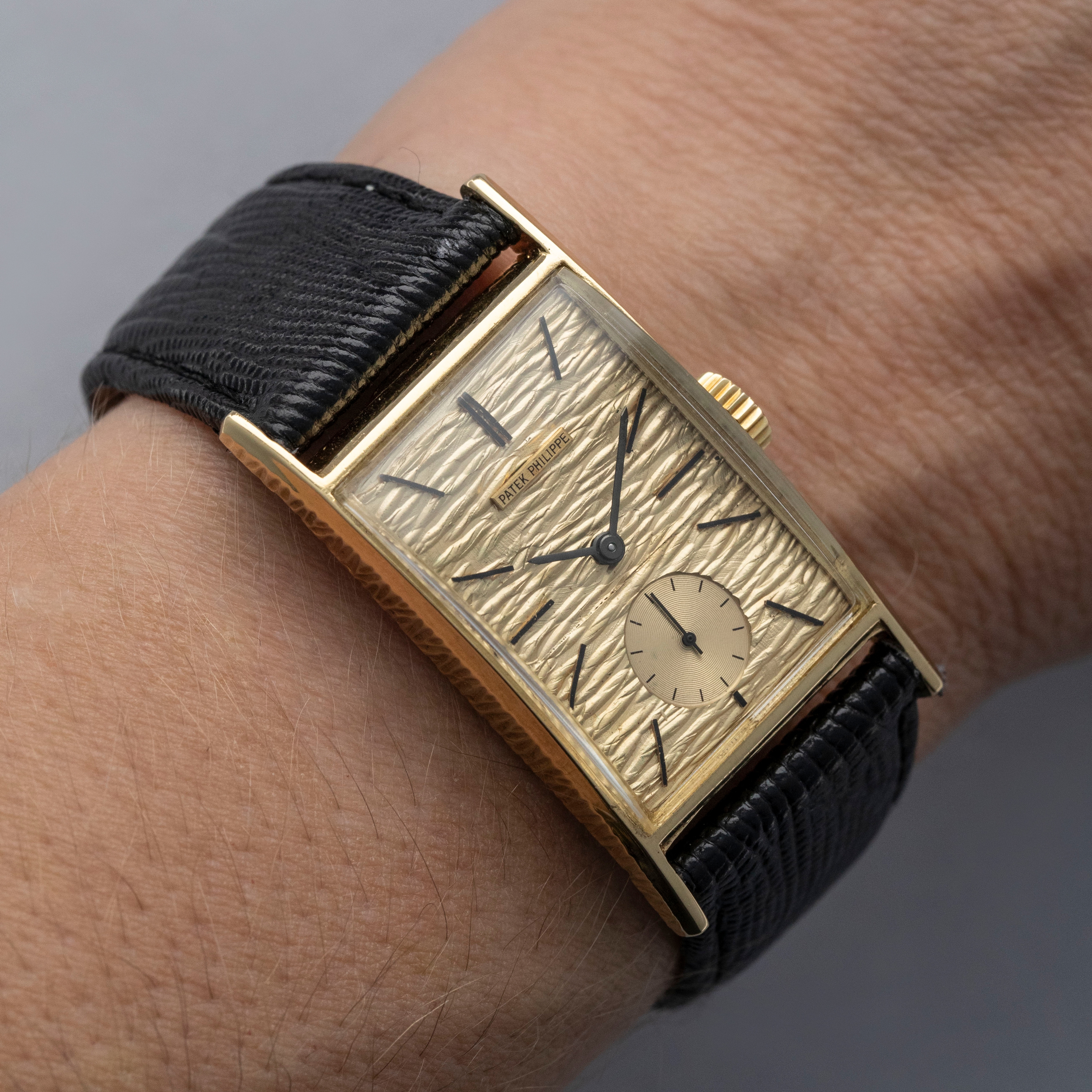 Launched in 1950 and produced until the 1960s, the Patek Philippe ref. 2554 is a wide-ranging collection of unique rectangular offerings that were largely ahead of their time. Powered by the manual-wind cal. 9-90 movement and rather large at 40mm tall and 28mm wide, the resulting rectangular watch was massive for its time. Presented with a champagne textured dial to match its textured 18kt yellow gold case, the ref. 2554/10 fits within the aesthetic styling of today, with textured cases being all the rage.