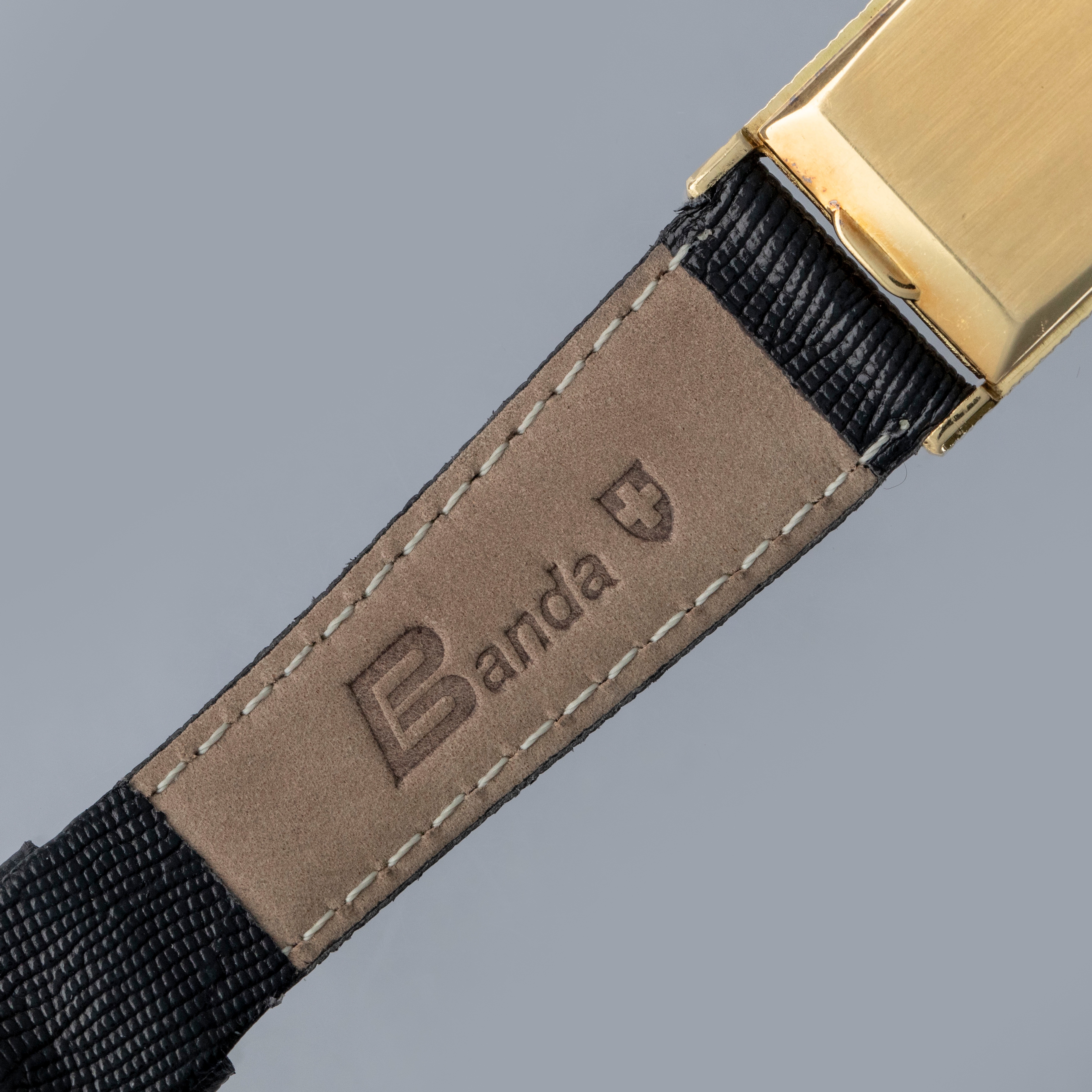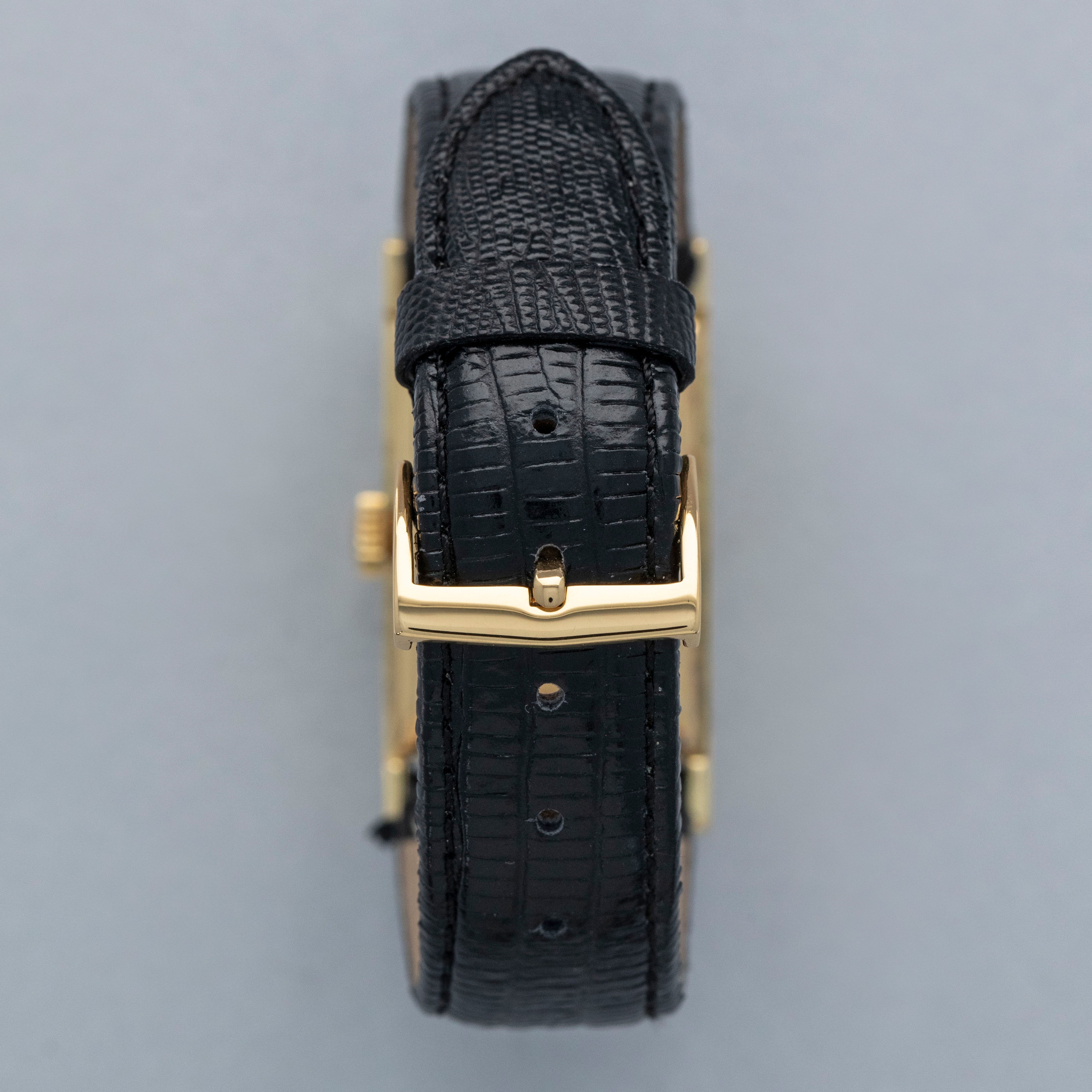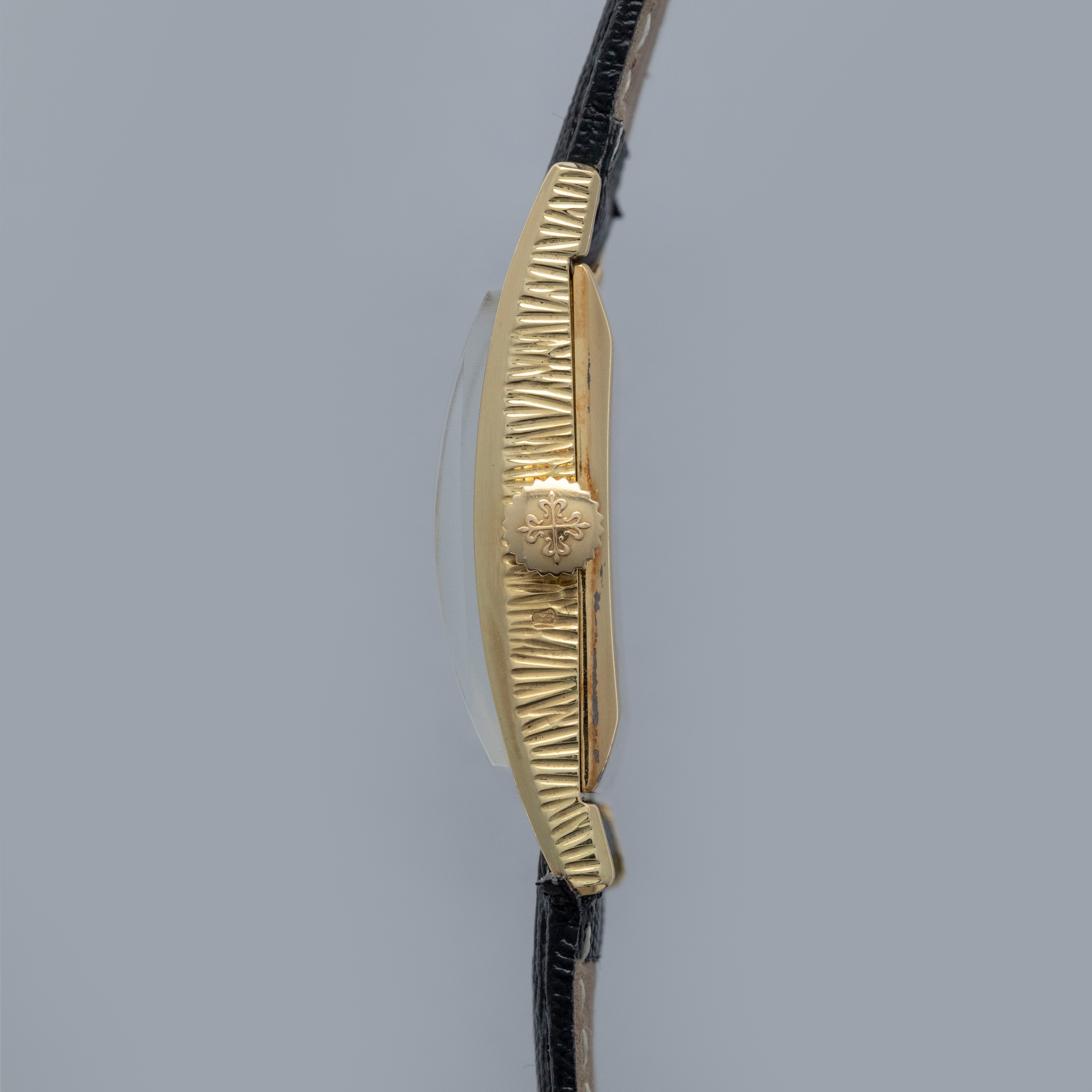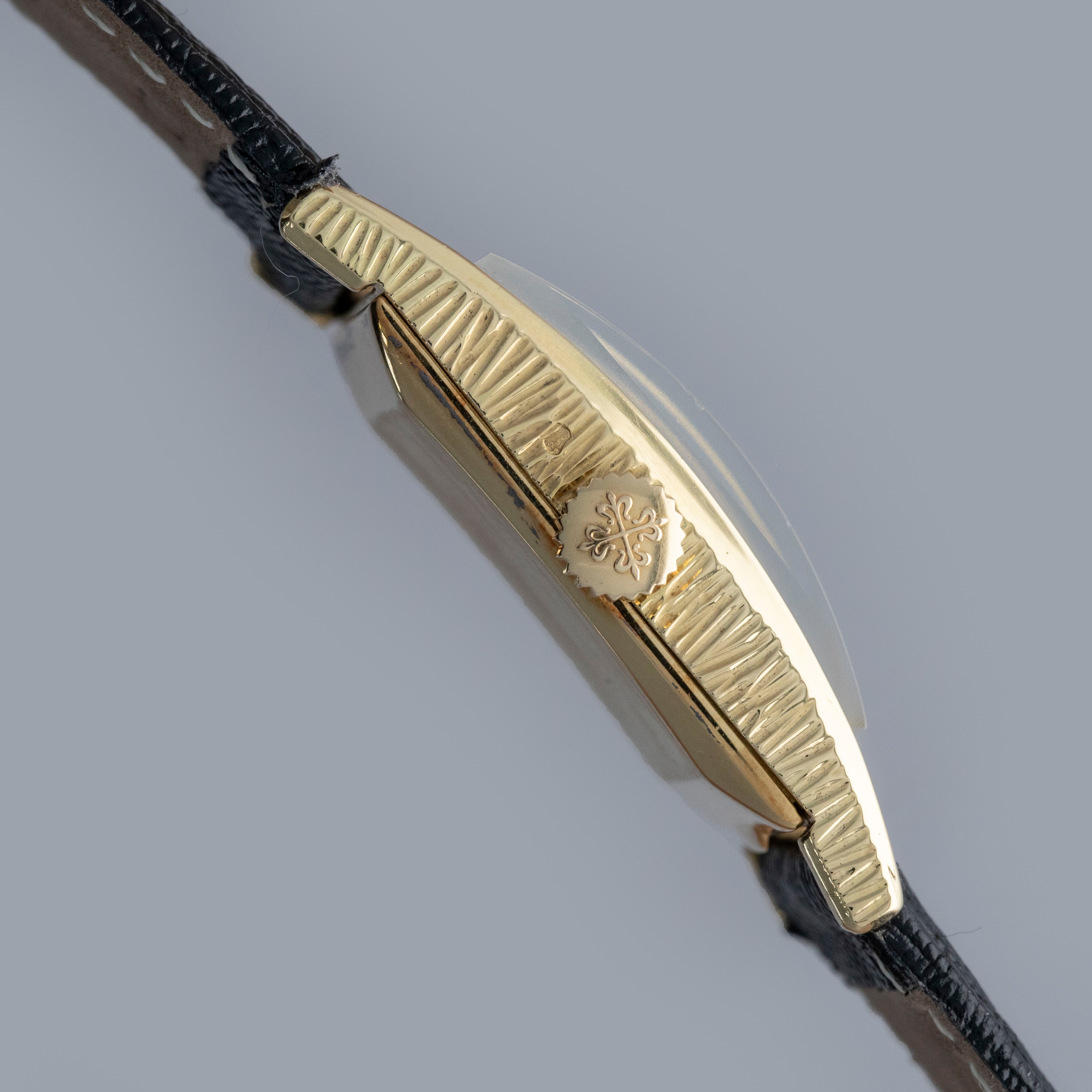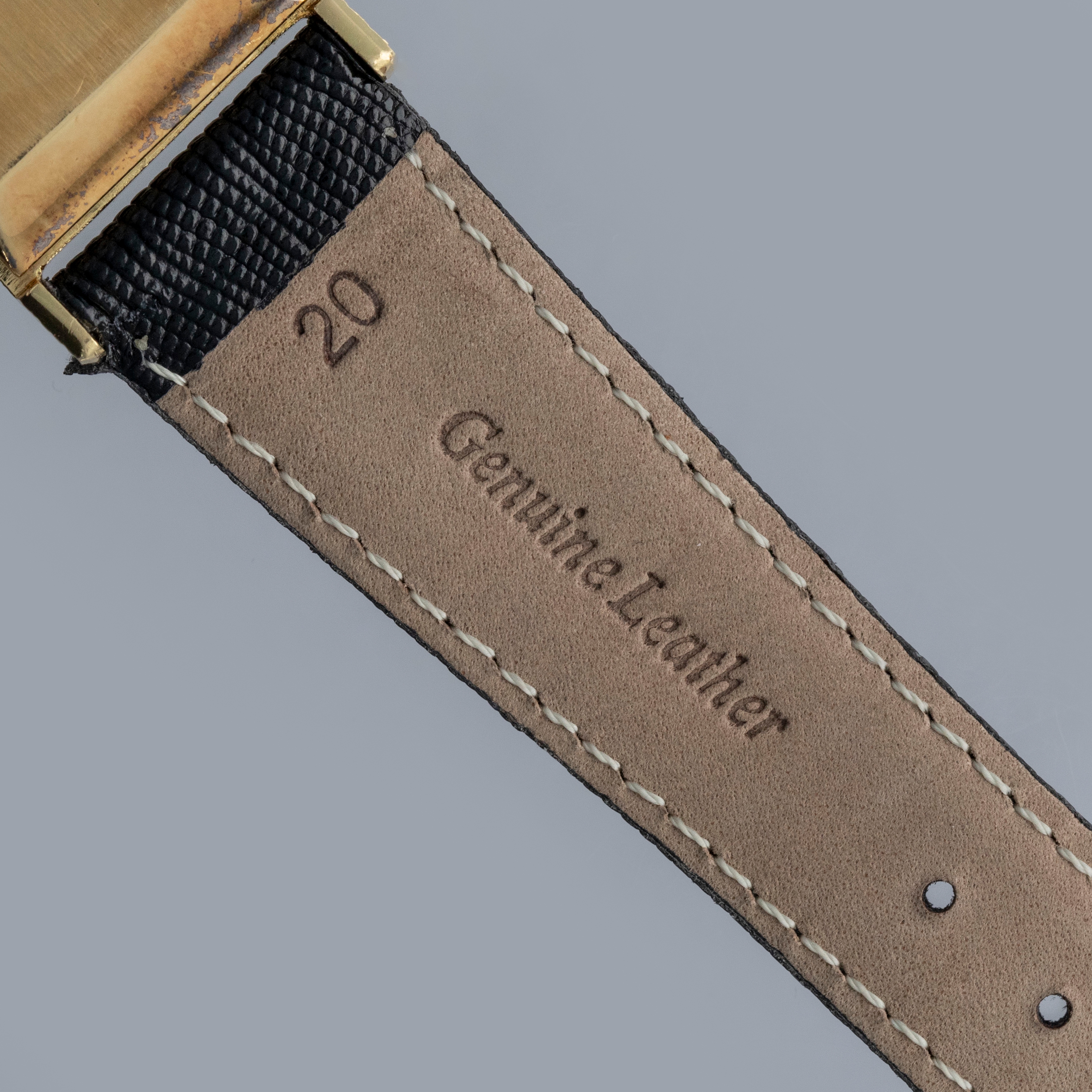 Watch is in overall excellent condition. The yellow gold case shows surface scratches and small nicks to the front polished sections, while the bark-finish sides remain well defined with a still-legible hallmark on the crown side. The Calatrava cross–embossed winding crown remains in excellent condition. The case back shows light surface scratches along with some tarnishing around the edges. The bark-finish gold dial remains excellent, with light surface marks and clean hands. It is fitted with a black leather strap and an unsigned Wenger-style gold-plated pin buckle, both remaining in very good condition. Please note that the watch ticks at time of cataloging, but timekeeping is poor and a service is recommended.