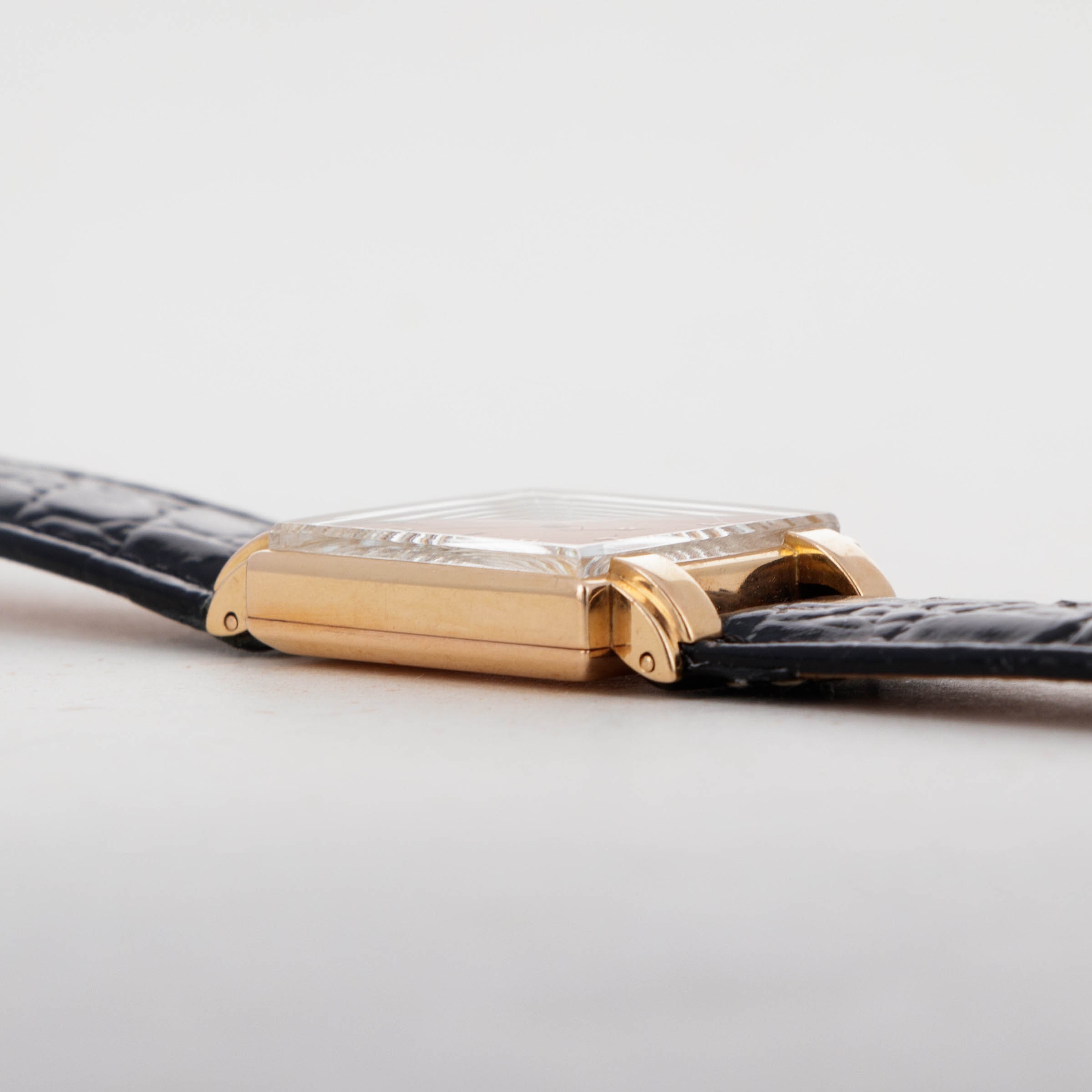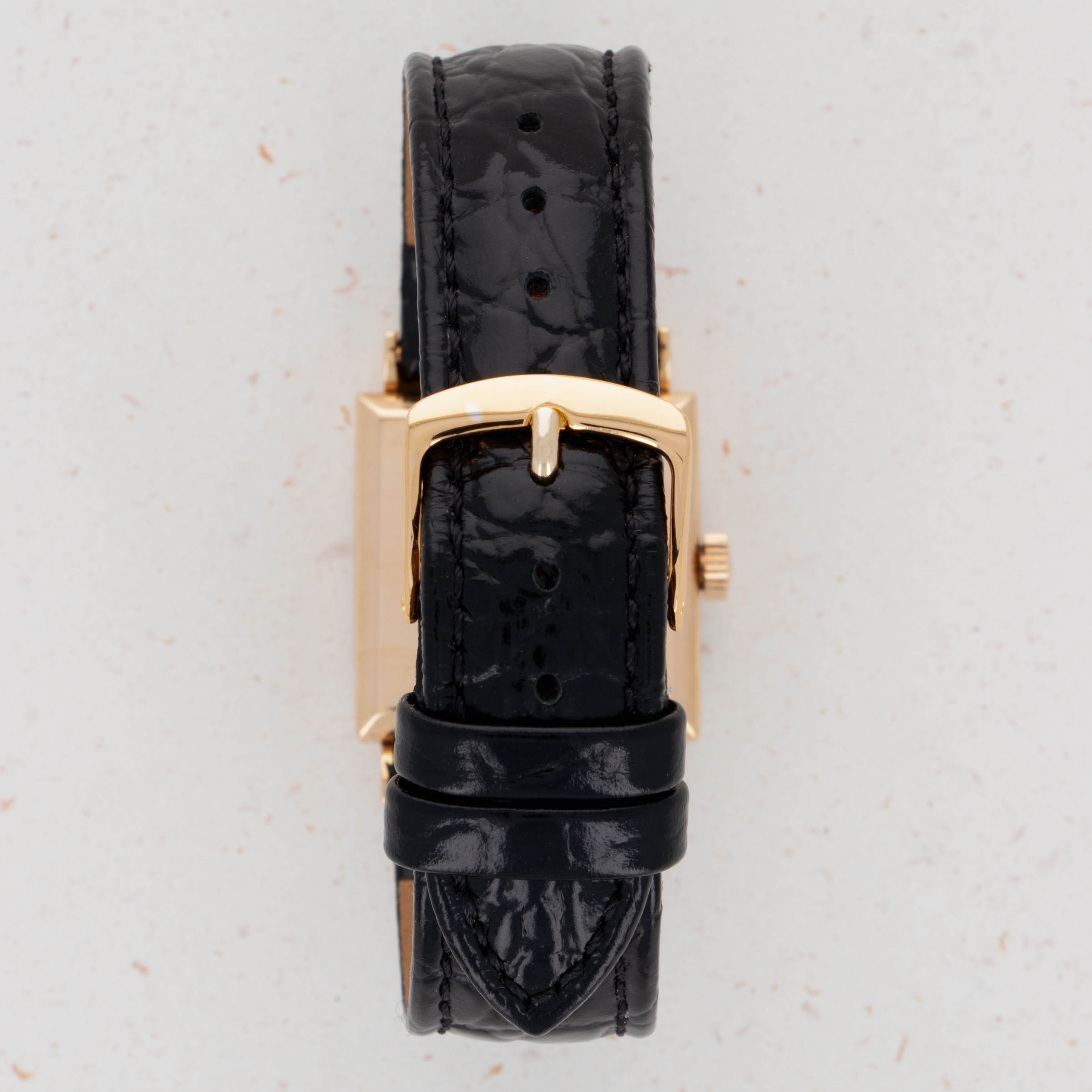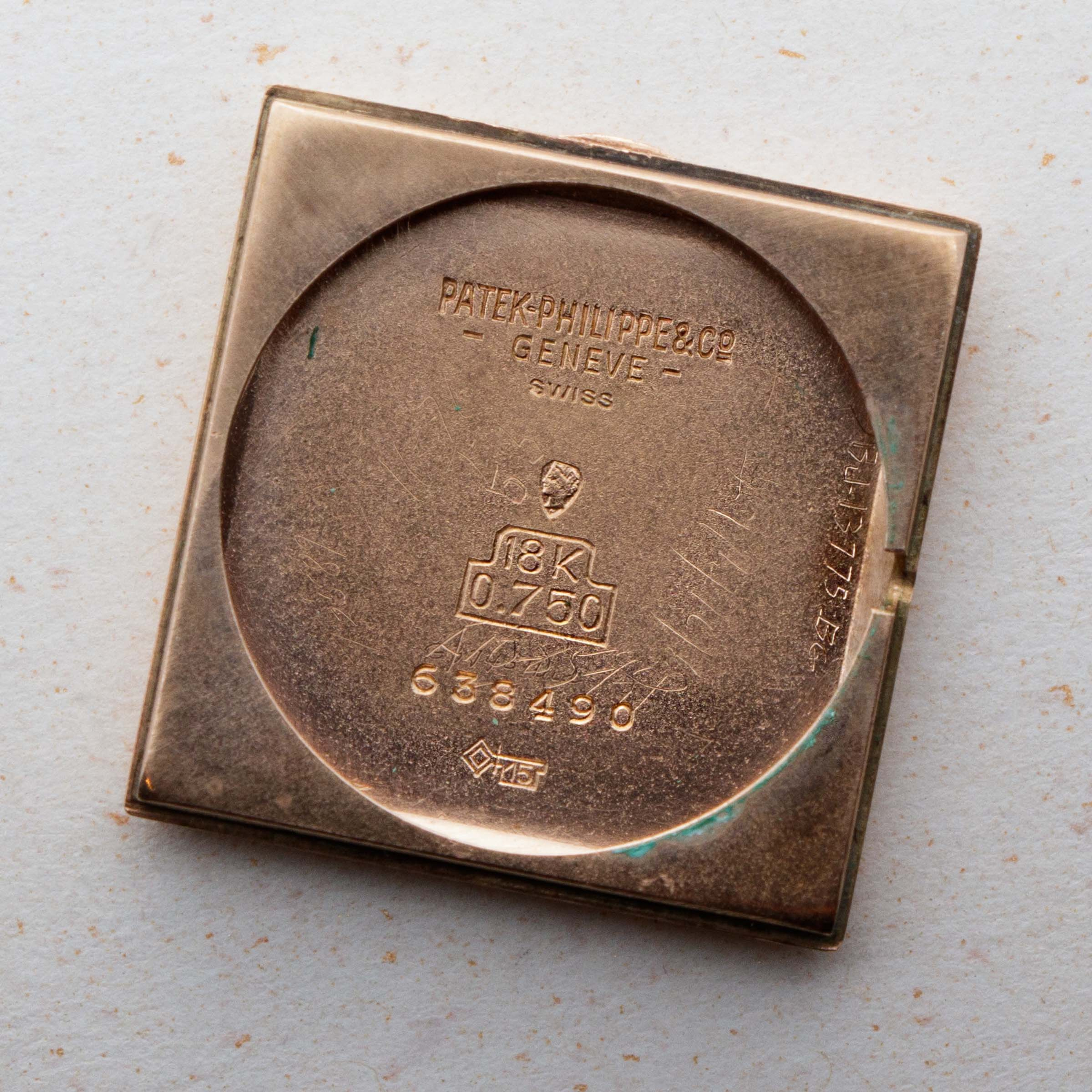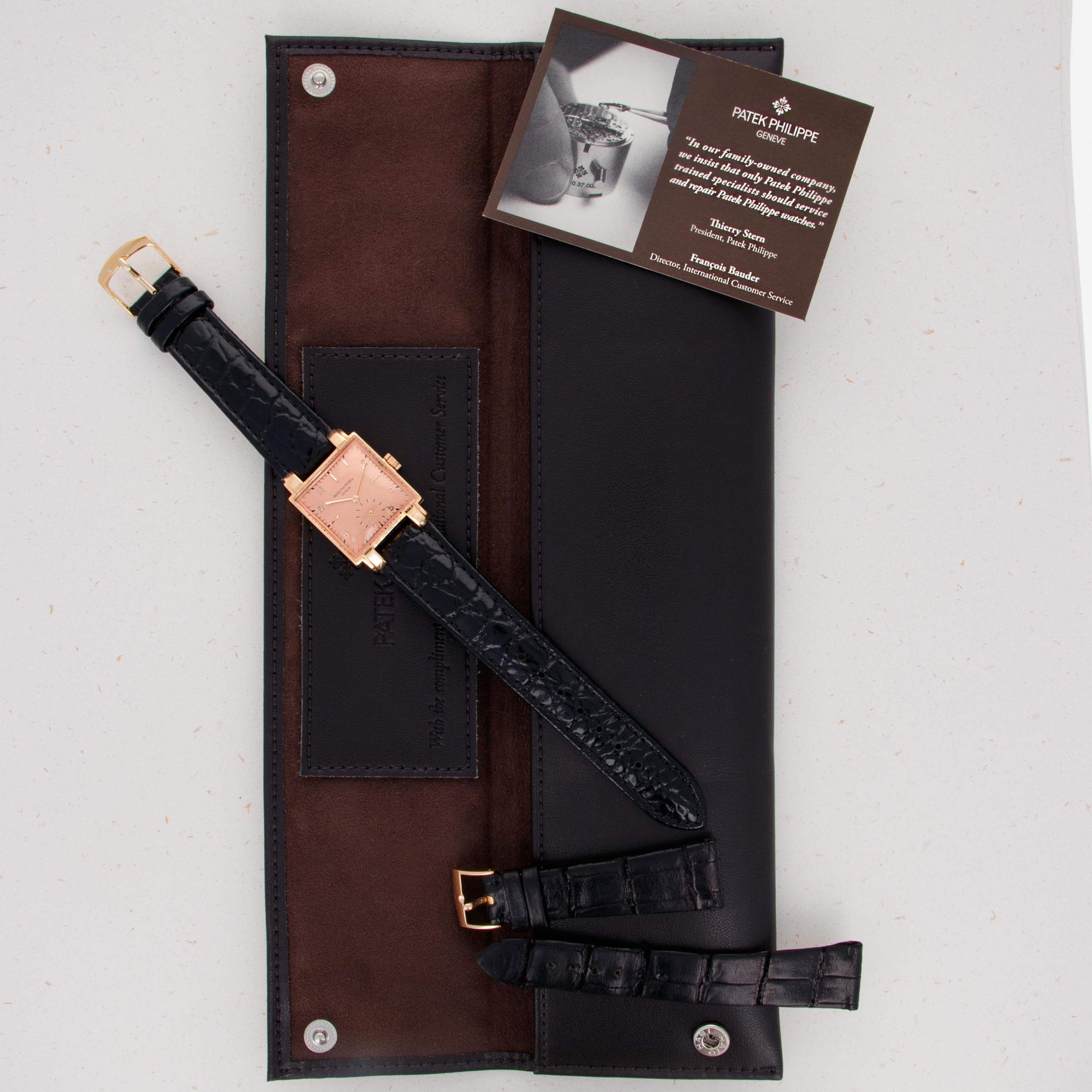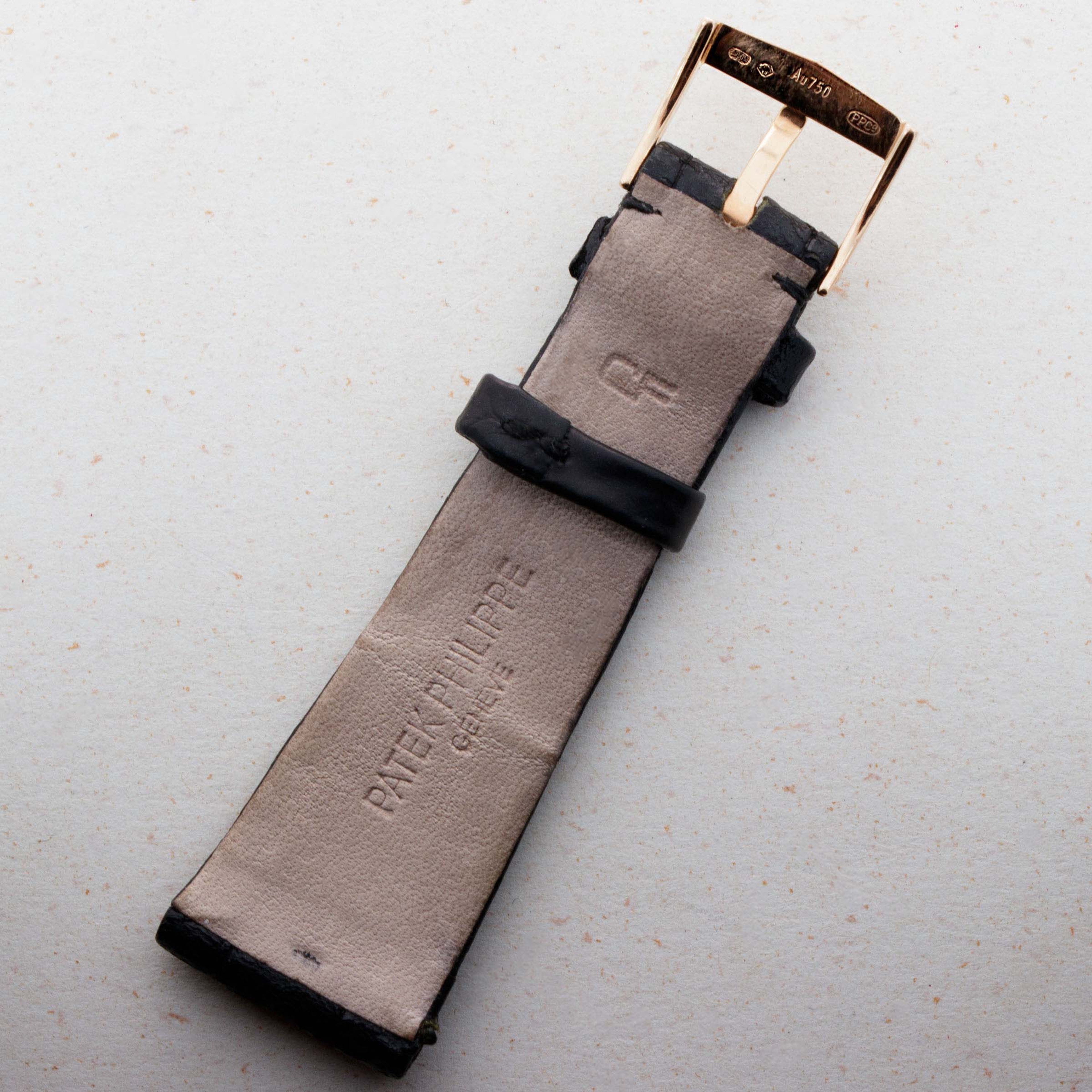 Watch is in very good original condition. There is light wear on the case, primarily visible on the caseback. Hallmark is fully visible on the mid case. Pink tone dial is excellent, showing strong raised printing and light edge wear. Watch is fitted on a generic strap and buckle, but an additional aligator strap with its original Patek buckle are included on the side.