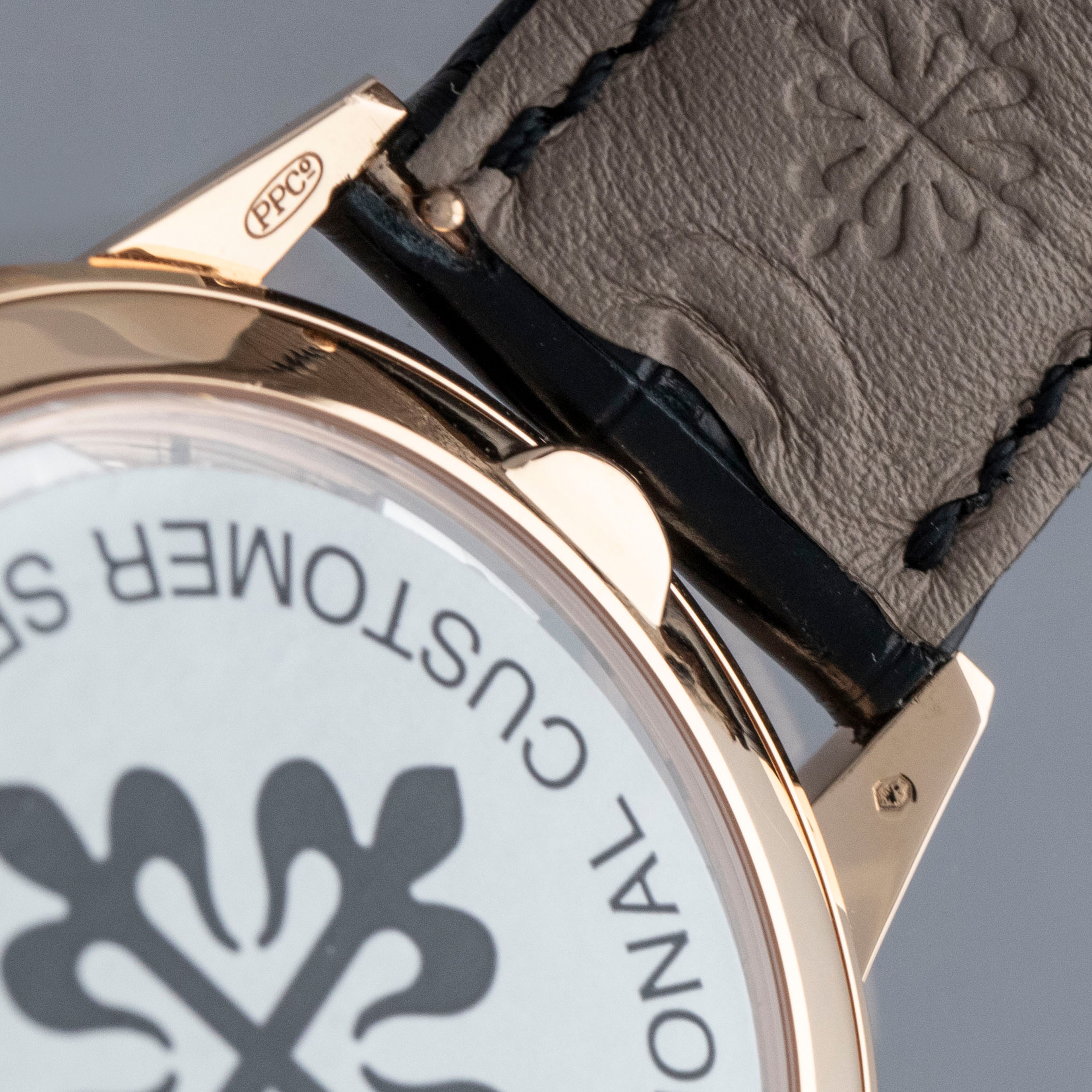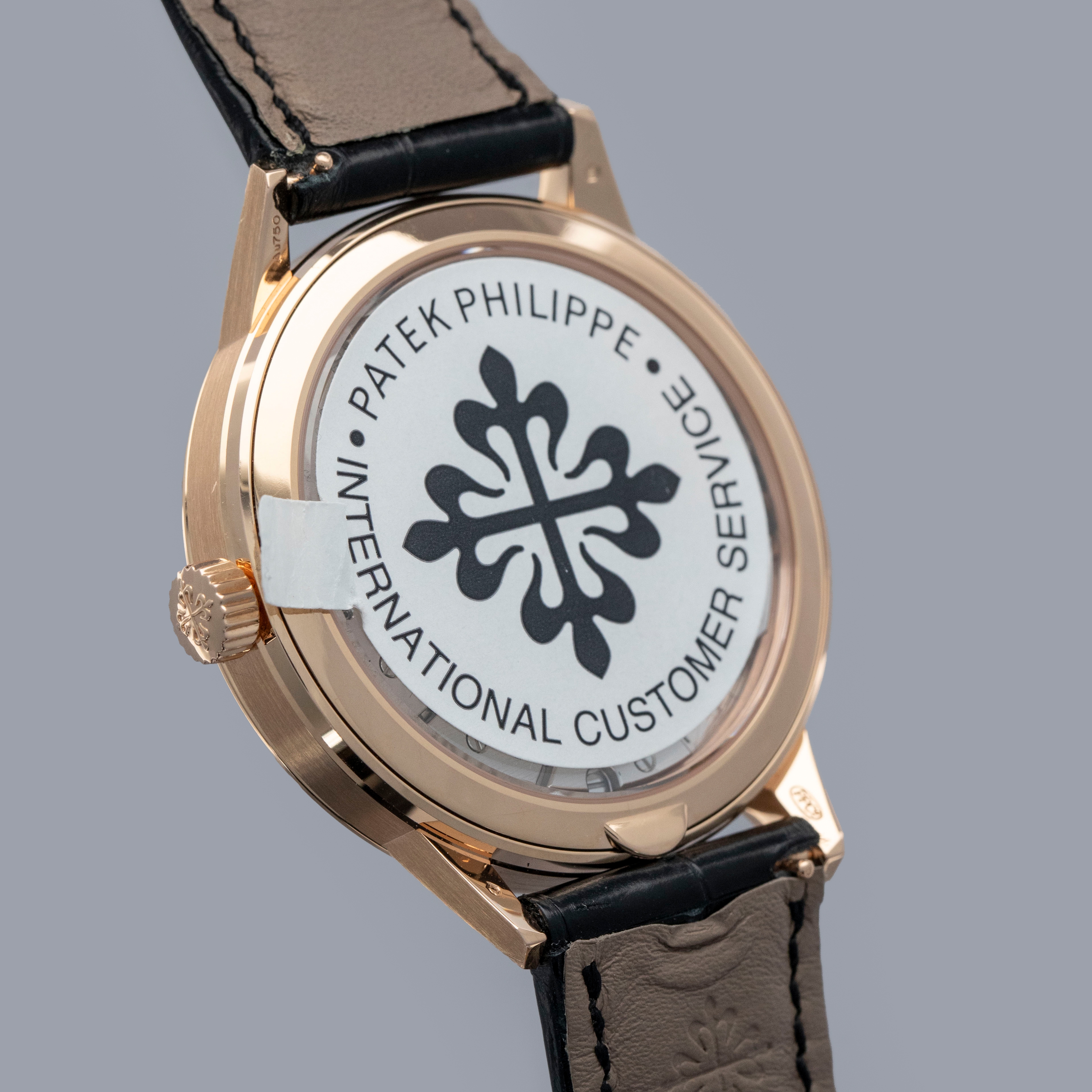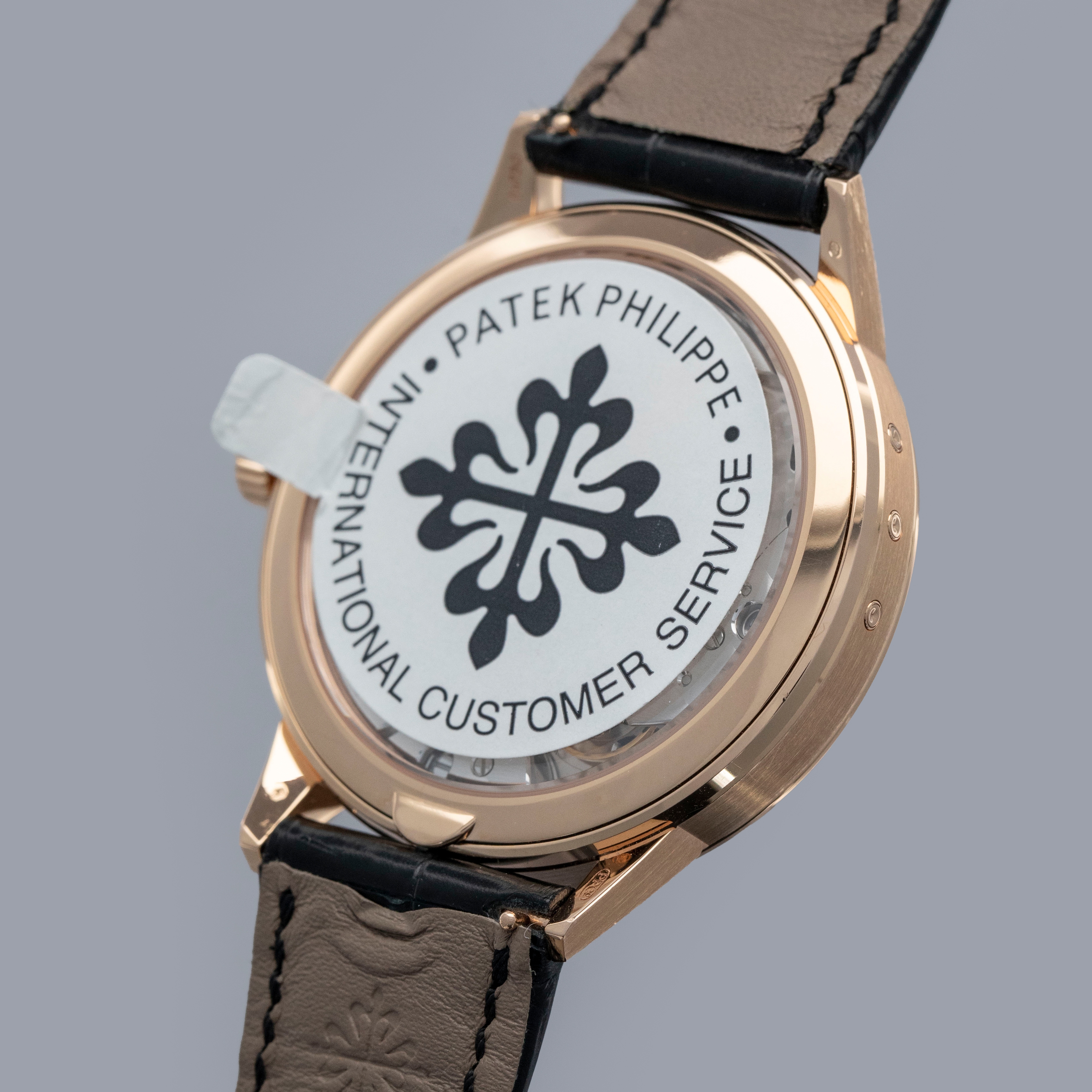 Watch is in overall like-new condition. The case shows only light signs of wear or handling and retains a service sticker on the case back. Comes complete with inner and outer boxes, certificate of origin, booklets, document holder, hangtag, and setting tool. At the request of the previous owner, the watch was sent back to Patek Philippe to be regulated for accuracy, hence the service sticker on the caseback. Original papers have been digitally redacted, the date of purchase was December 2022.