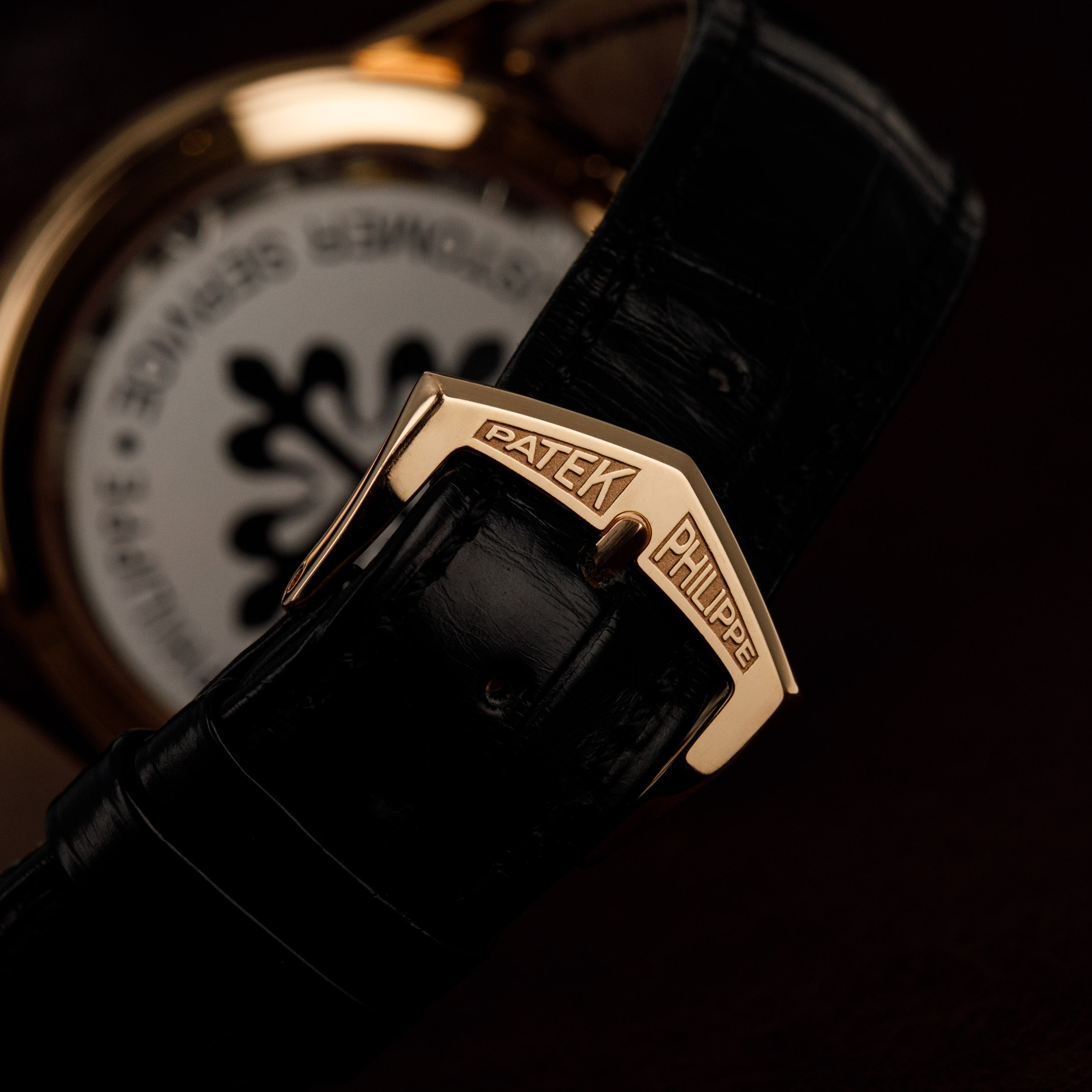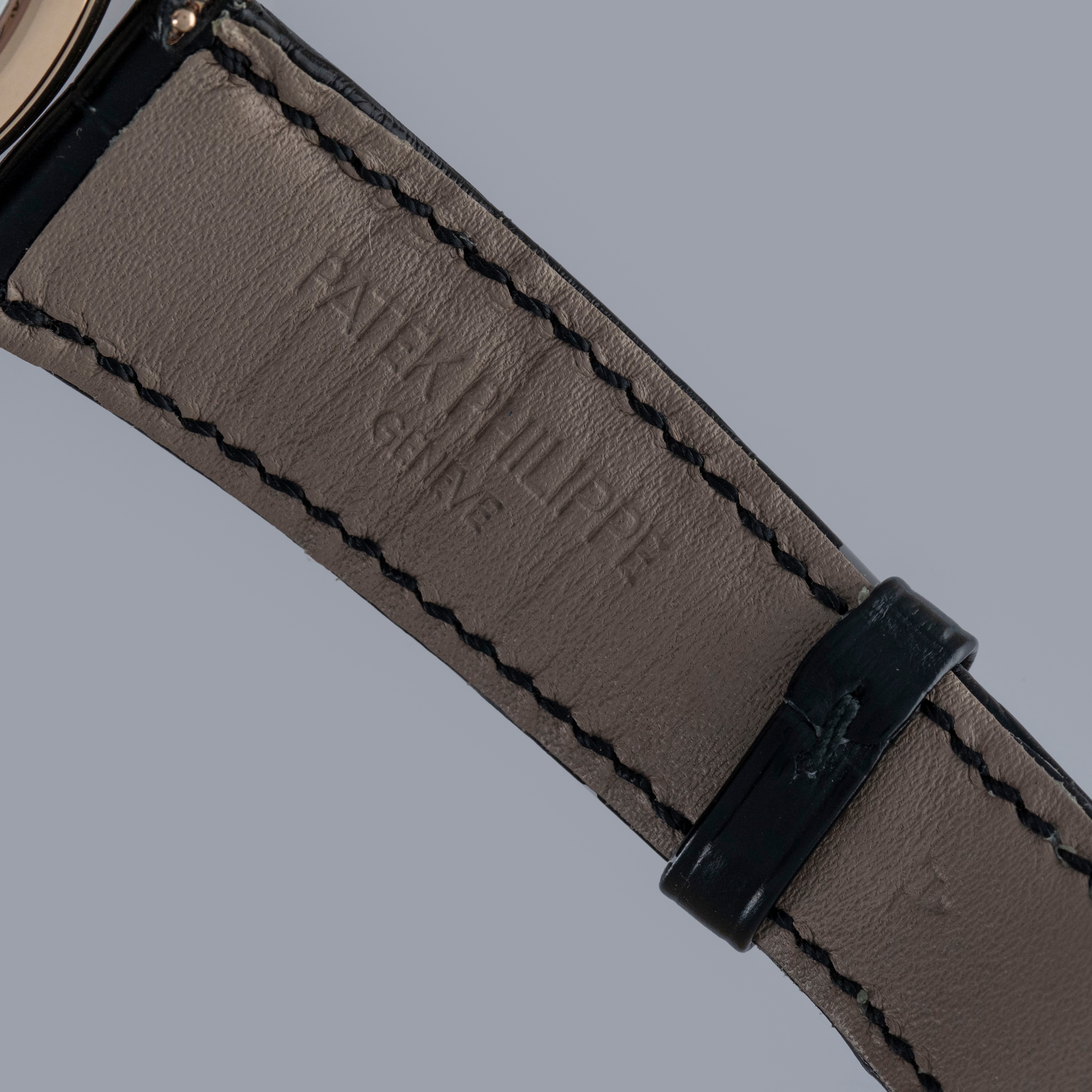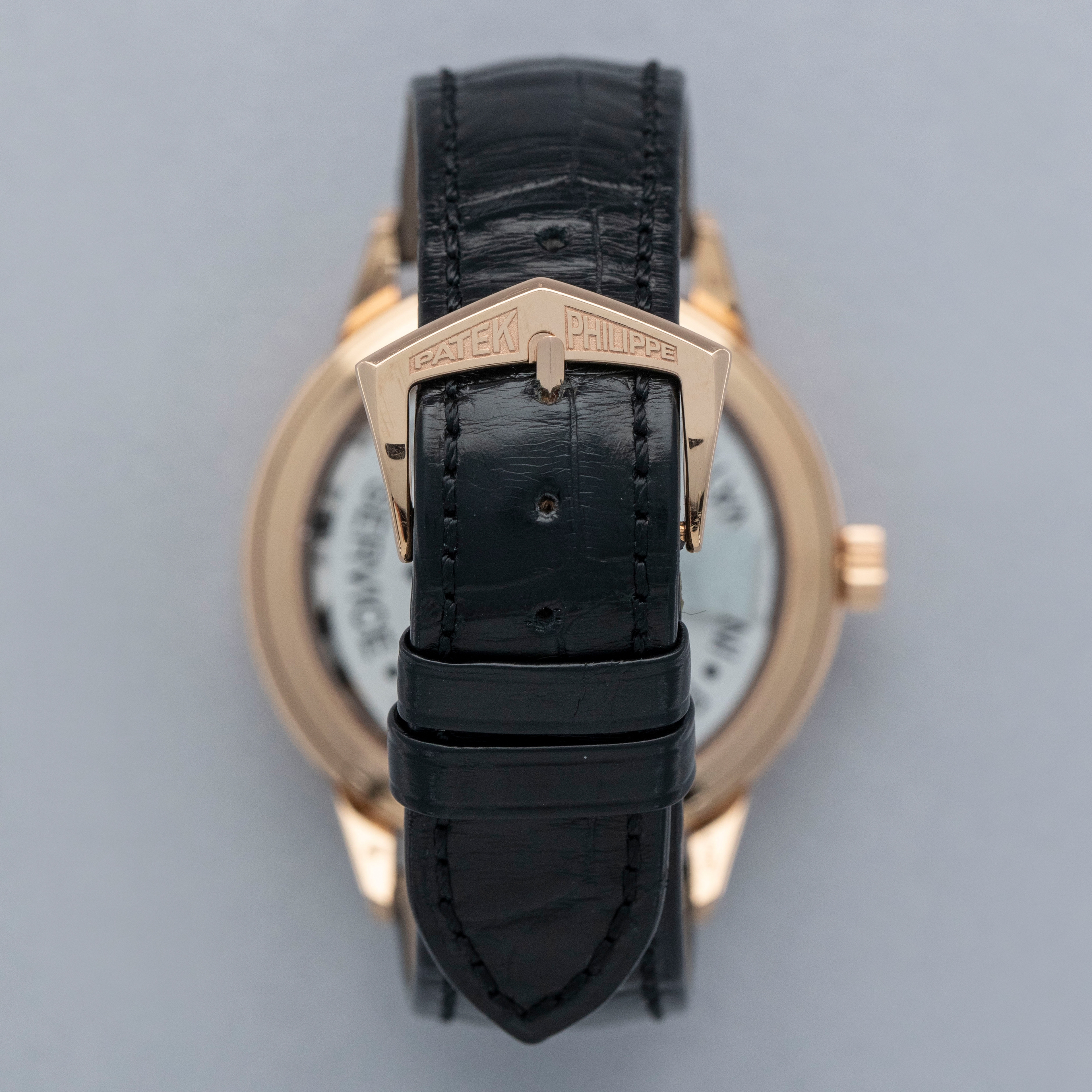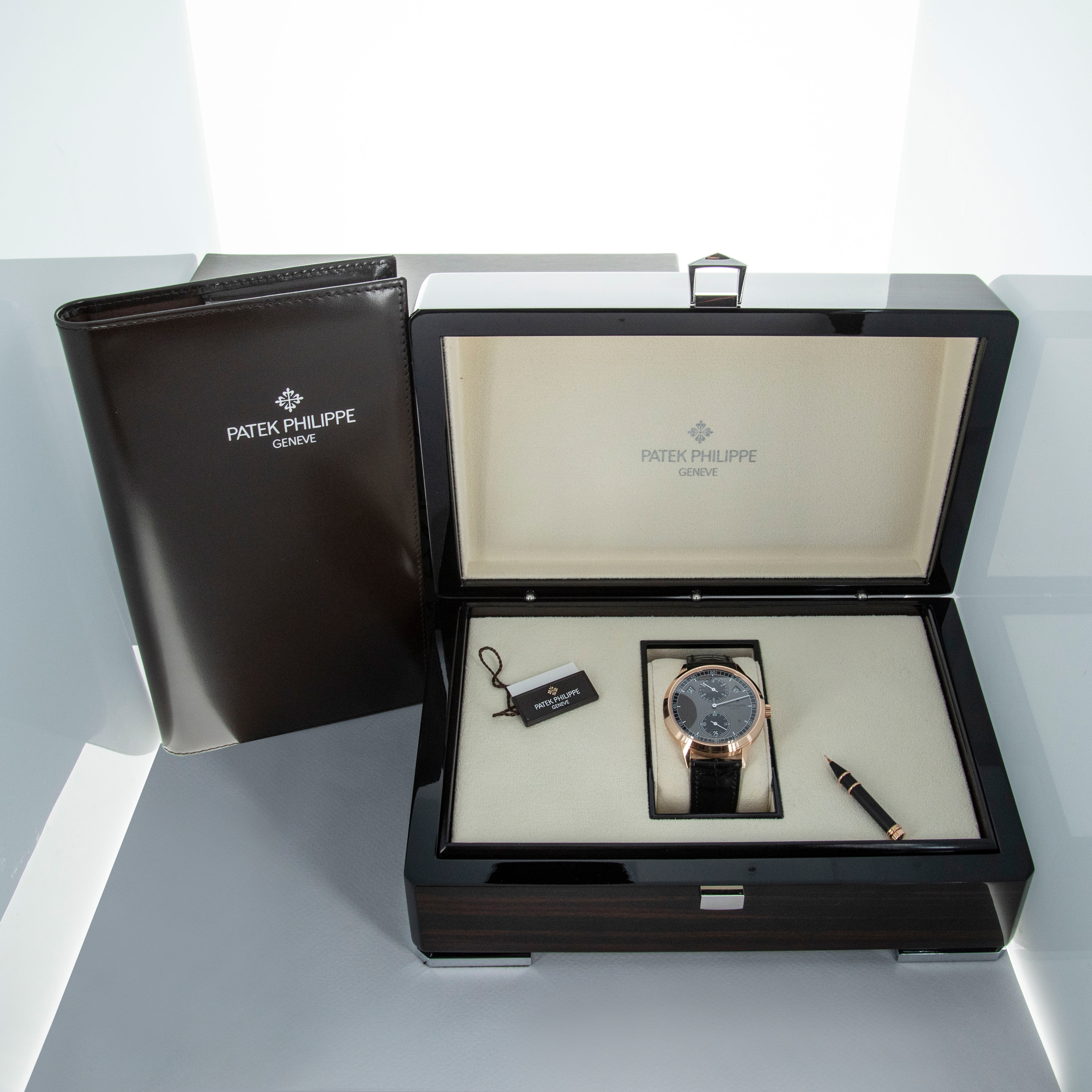 Watch is in overall like-new condition. The case shows only light signs of wear or handling and retains a service sticker on the case back. Comes complete with inner and outer boxes, certificate of origin, booklets, document holder, hangtag, and setting tool. At the request of the previous owner, the watch was sent back to Patek Philippe to be regulated for accuracy, hence the service sticker on the caseback. Original papers have been digitally redacted, the date of purchase was December 2022.