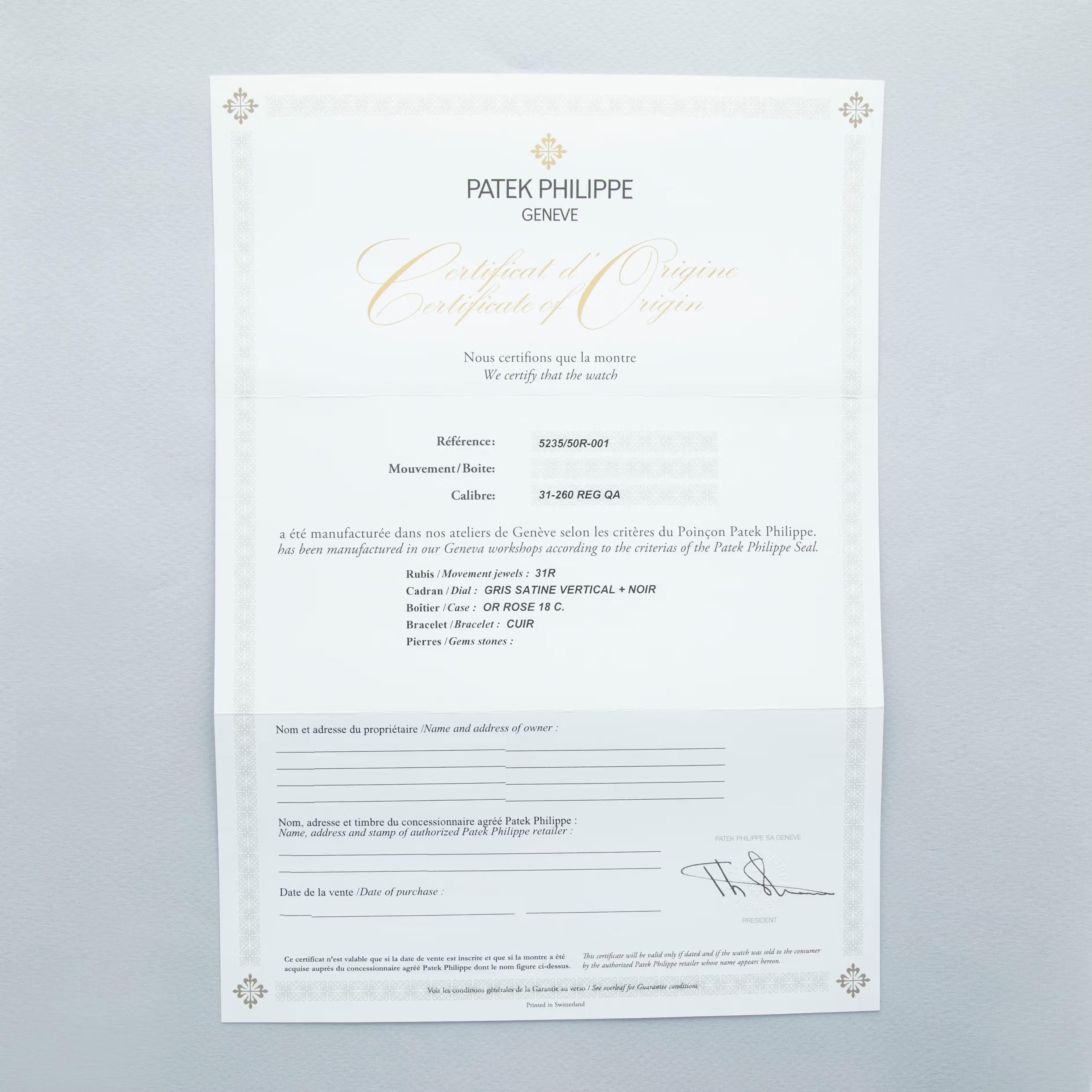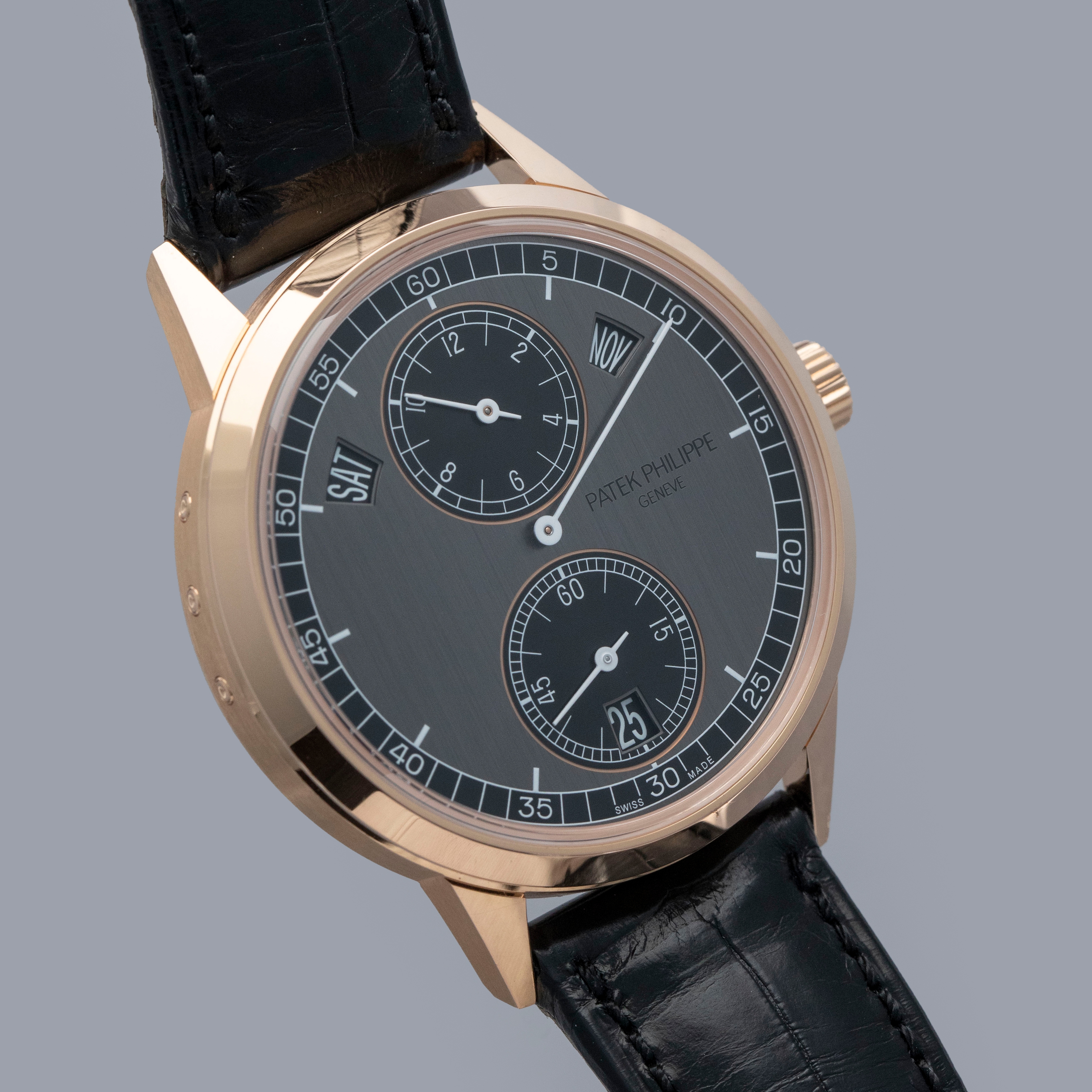 Featuring a two-tone graphite and black regulator display, the ref. 5235R boasts a singular central minutes hand, a subdial at 12 o'clock to display the hours and a subdial at 6 o'clock to display the seconds, with its annual calendar displaying the day, month and date at 10, 2 and 6 o'clock, respectively.
