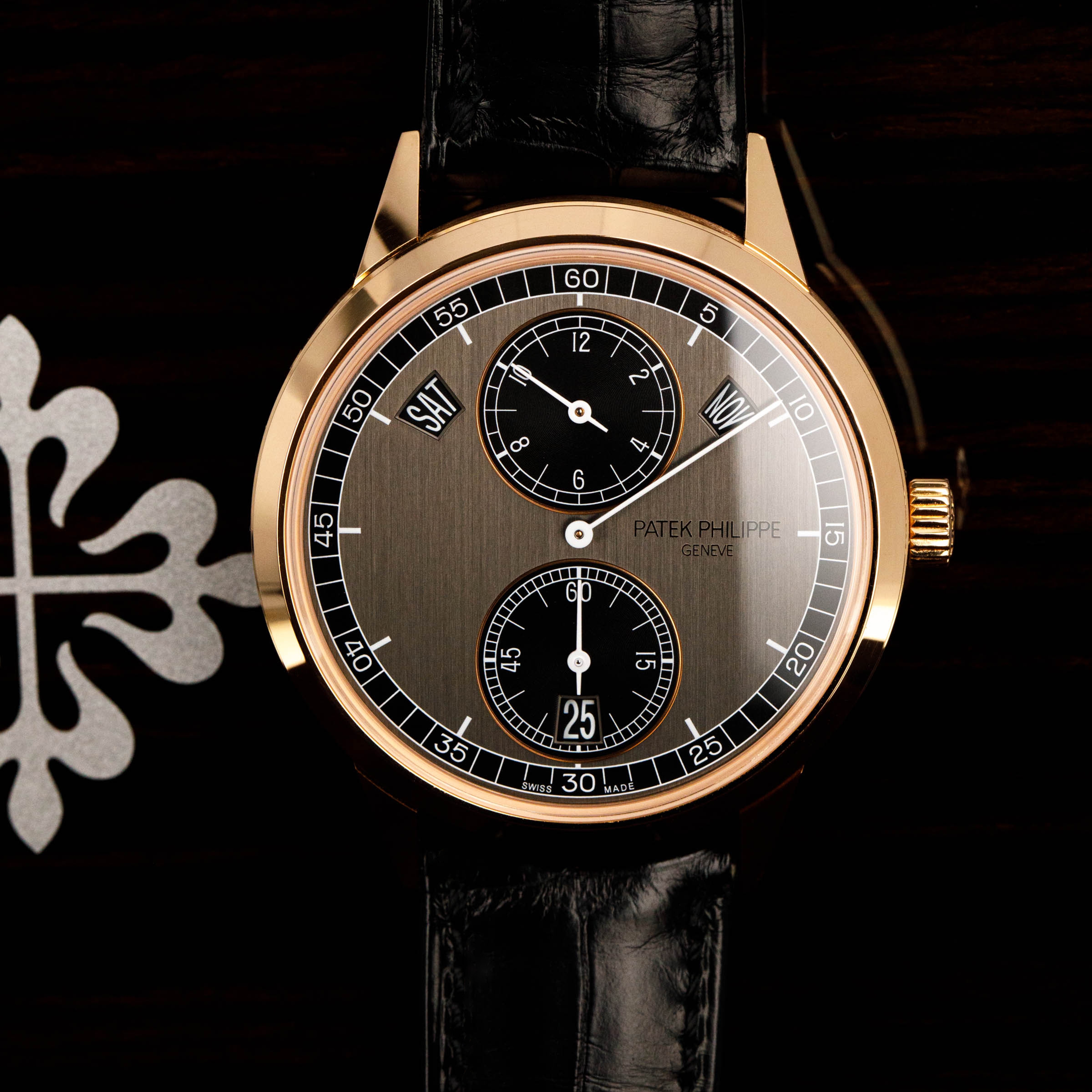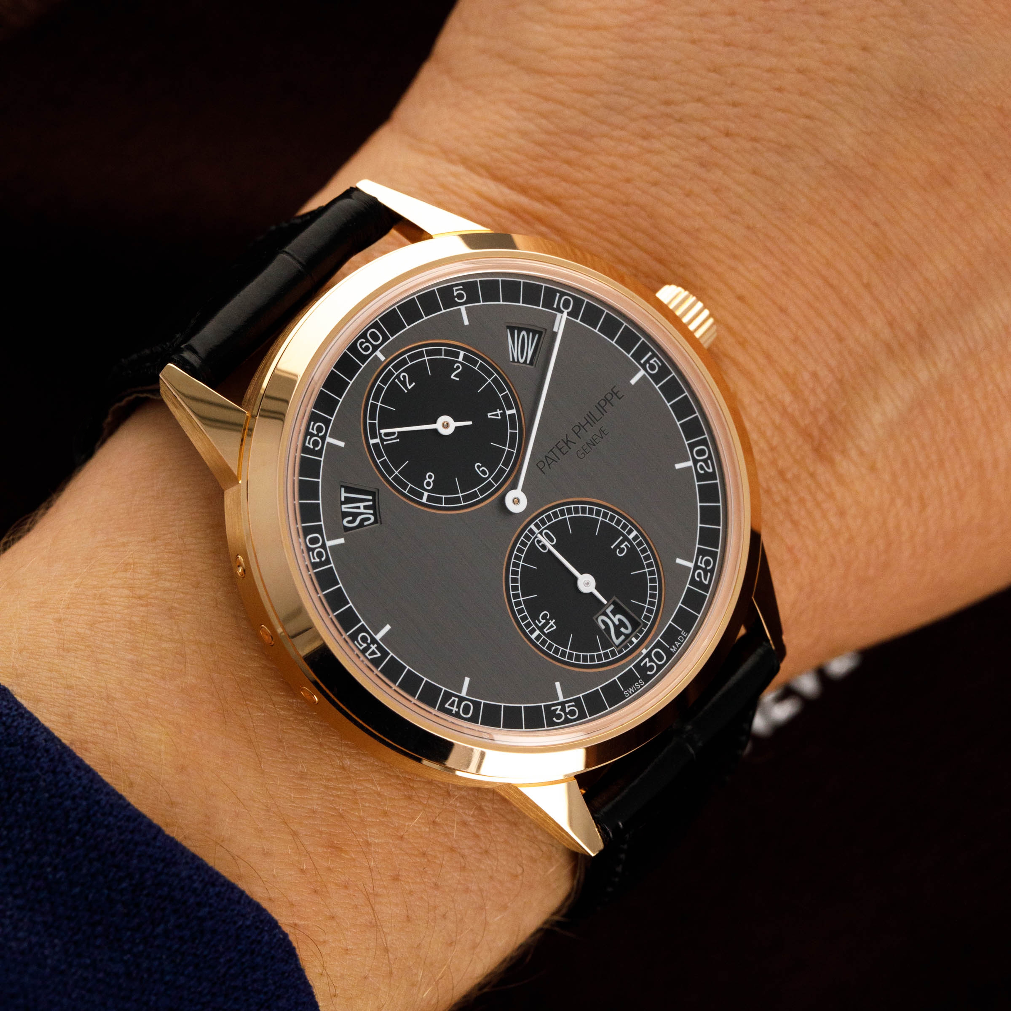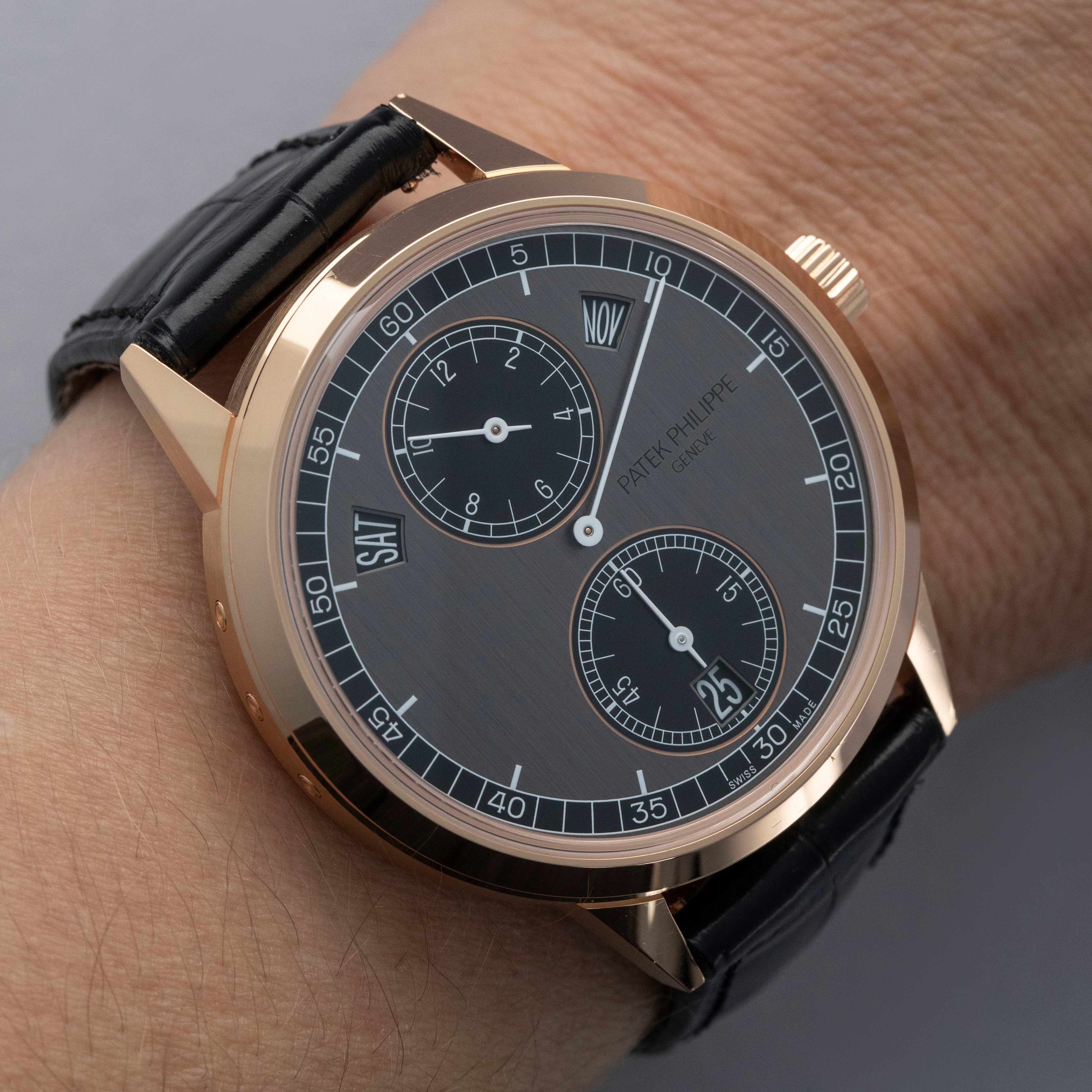 Expanding upon Patek's horological footprint as their first-ever regulator reference, the ref. 5235 is a beautifully executed timepiece that is as stunning as one would expect from Patek with its two-tone graphite and black dial and warm 18kt rose gold case.