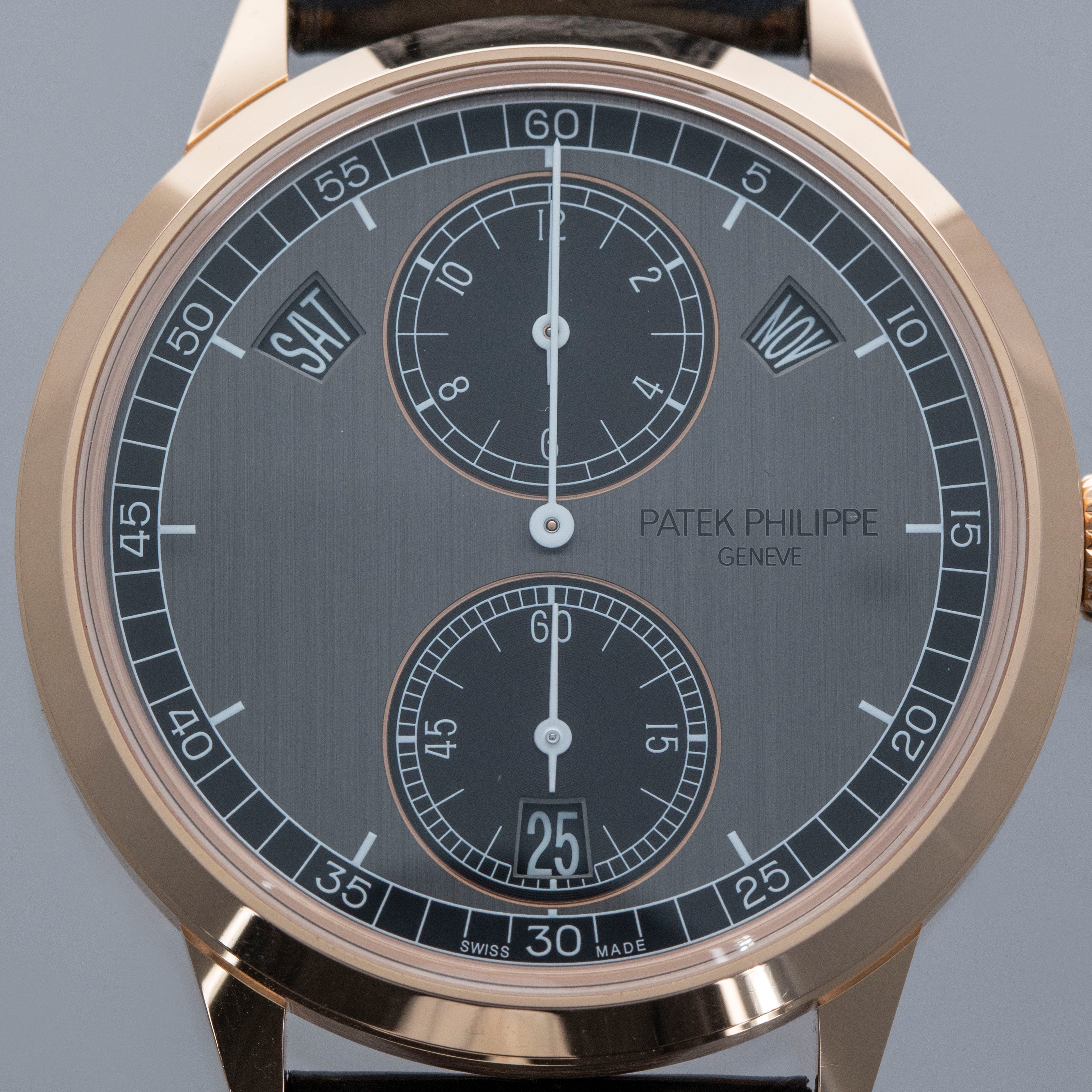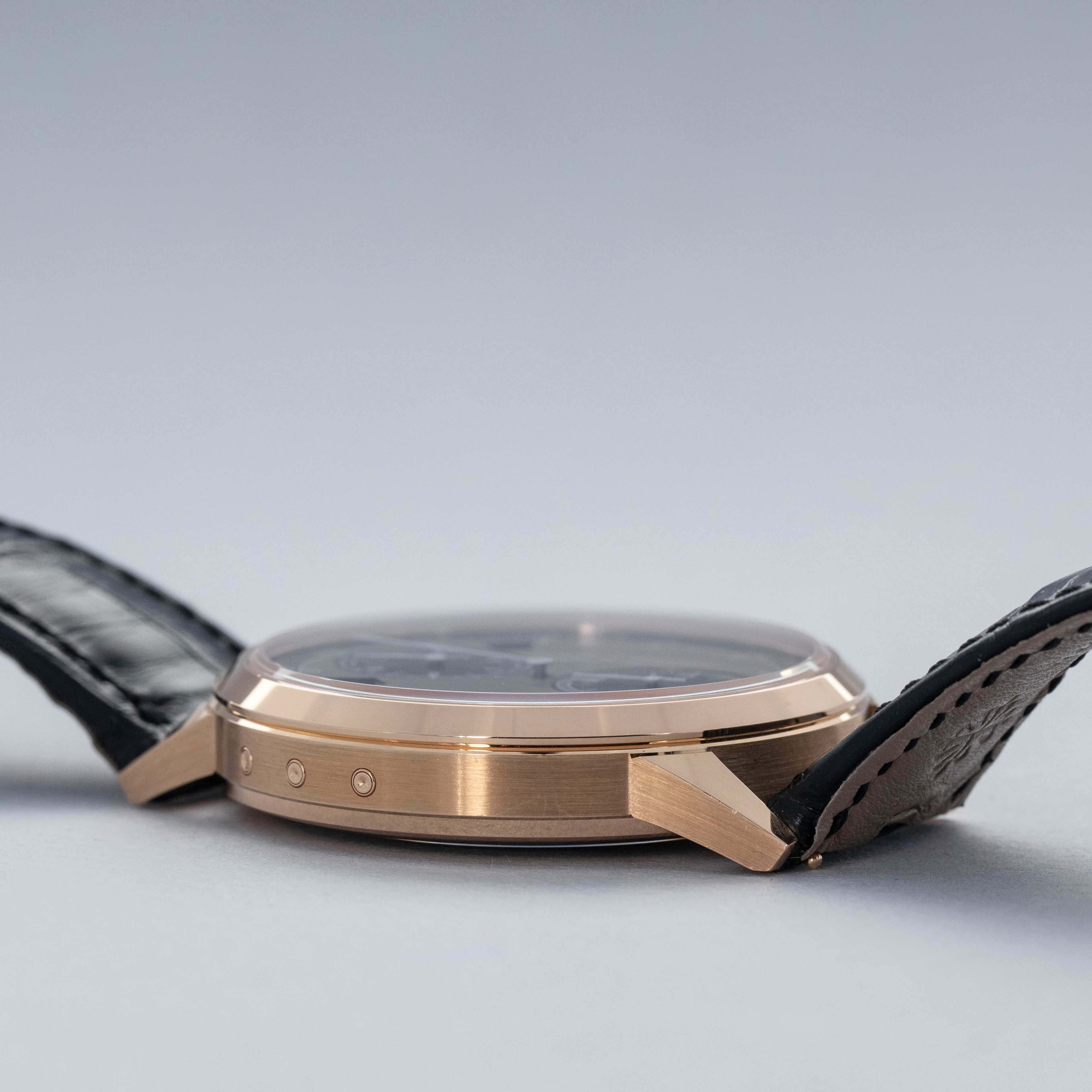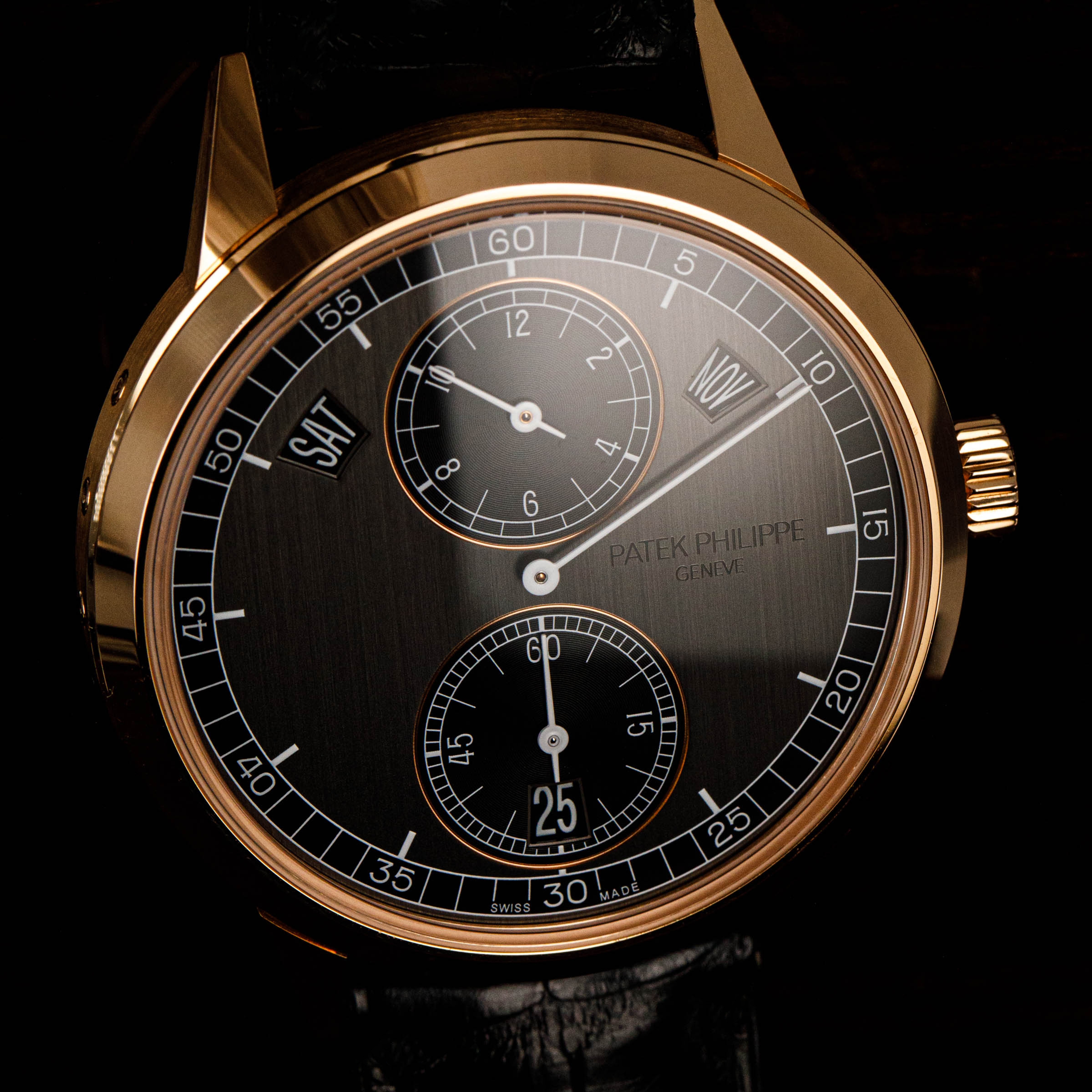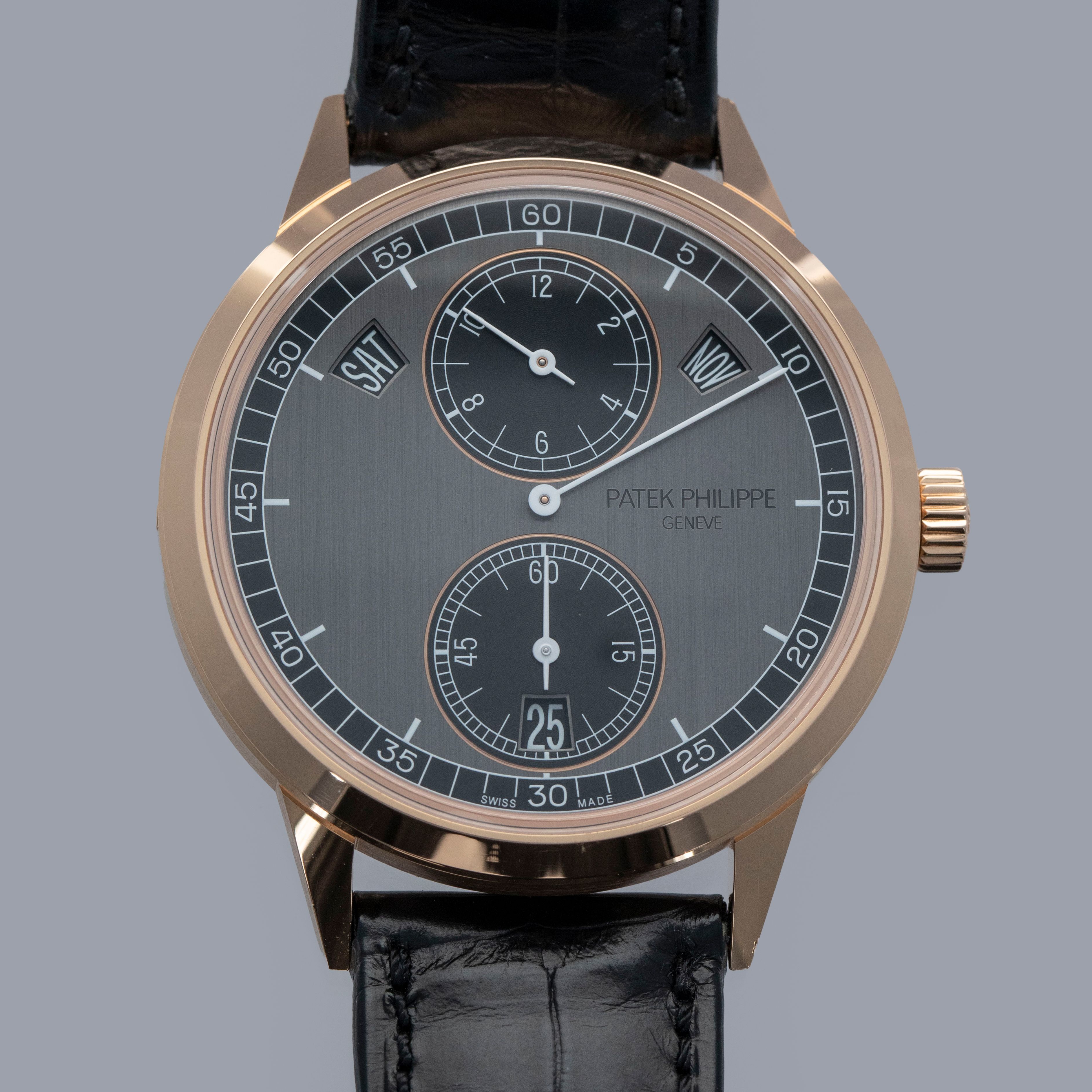 Expanding upon Patek's horological footprint as their first-ever regulator reference, the ref. 5235 is a beautifully executed timepiece that is as stunning as one would expect from Patek with its two-tone graphite and black dial and warm 18kt rose gold case.