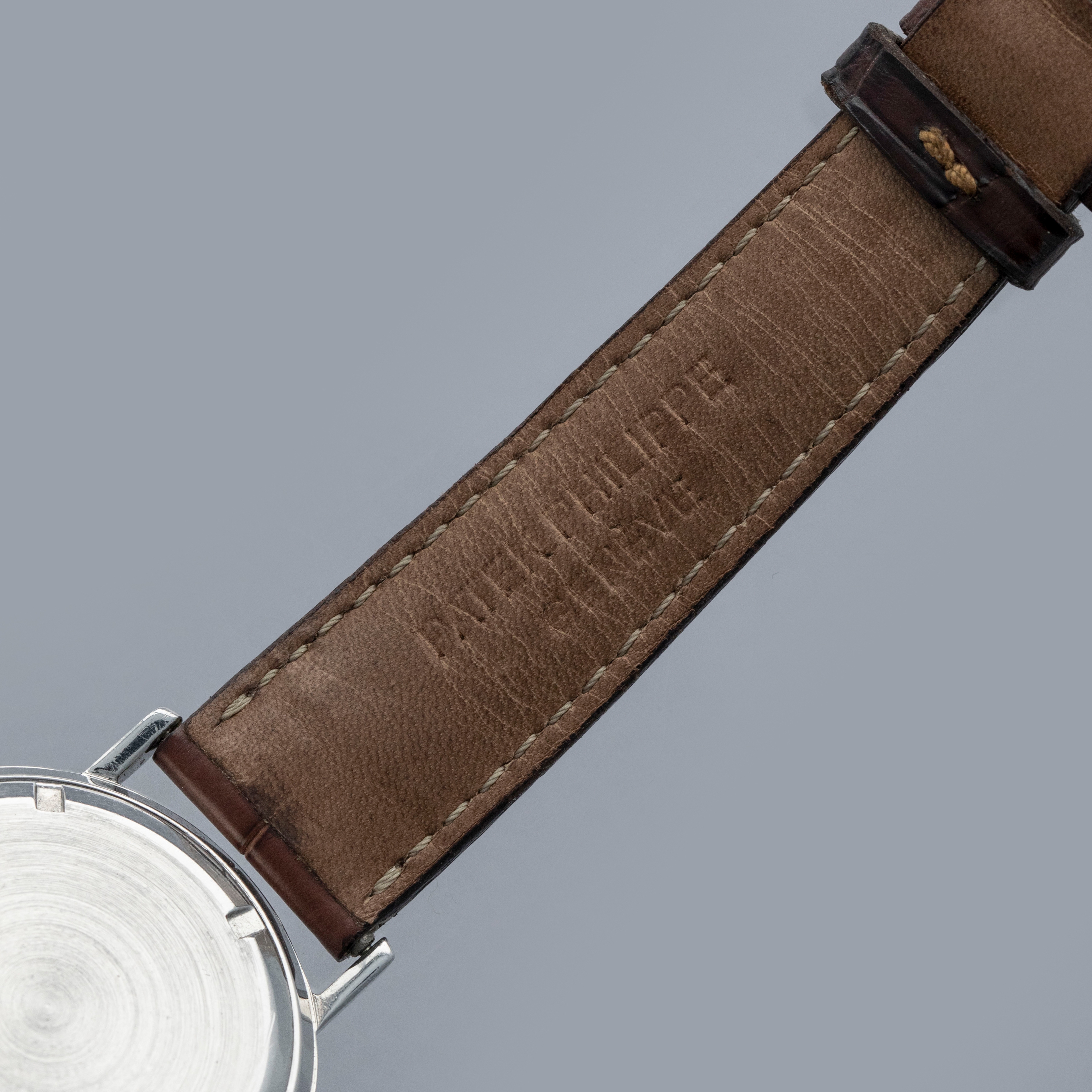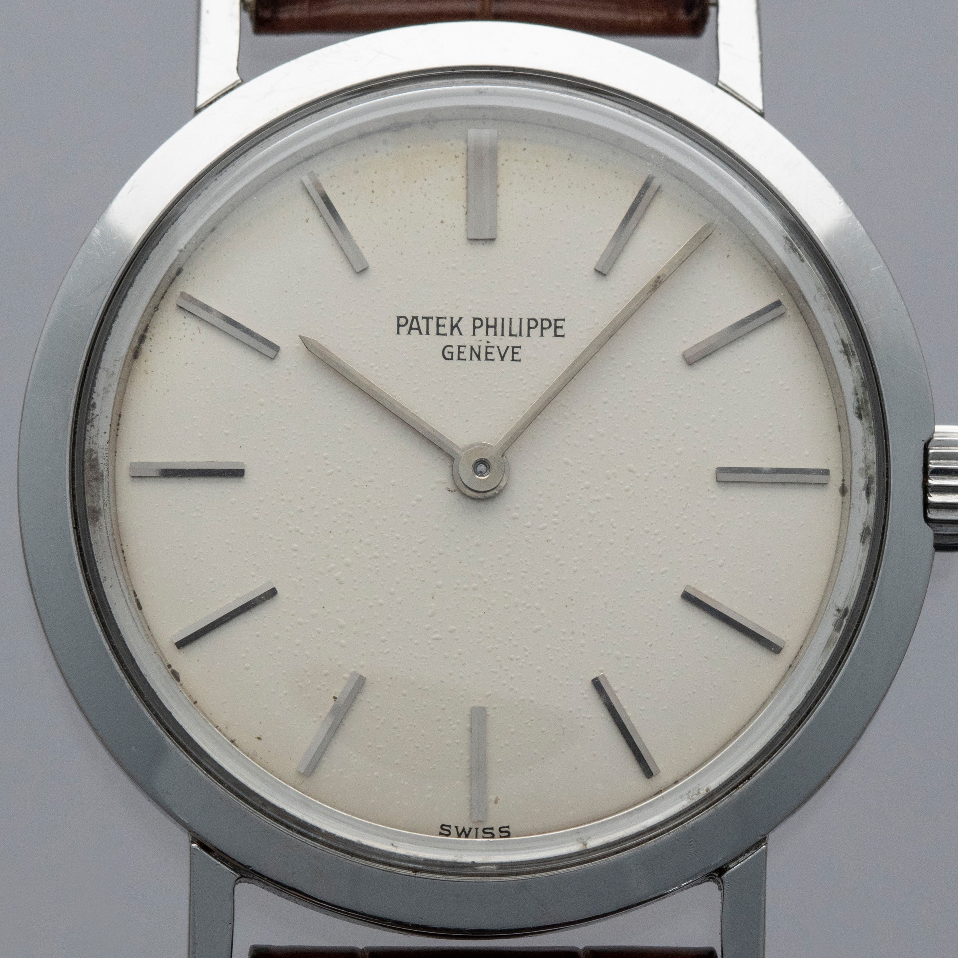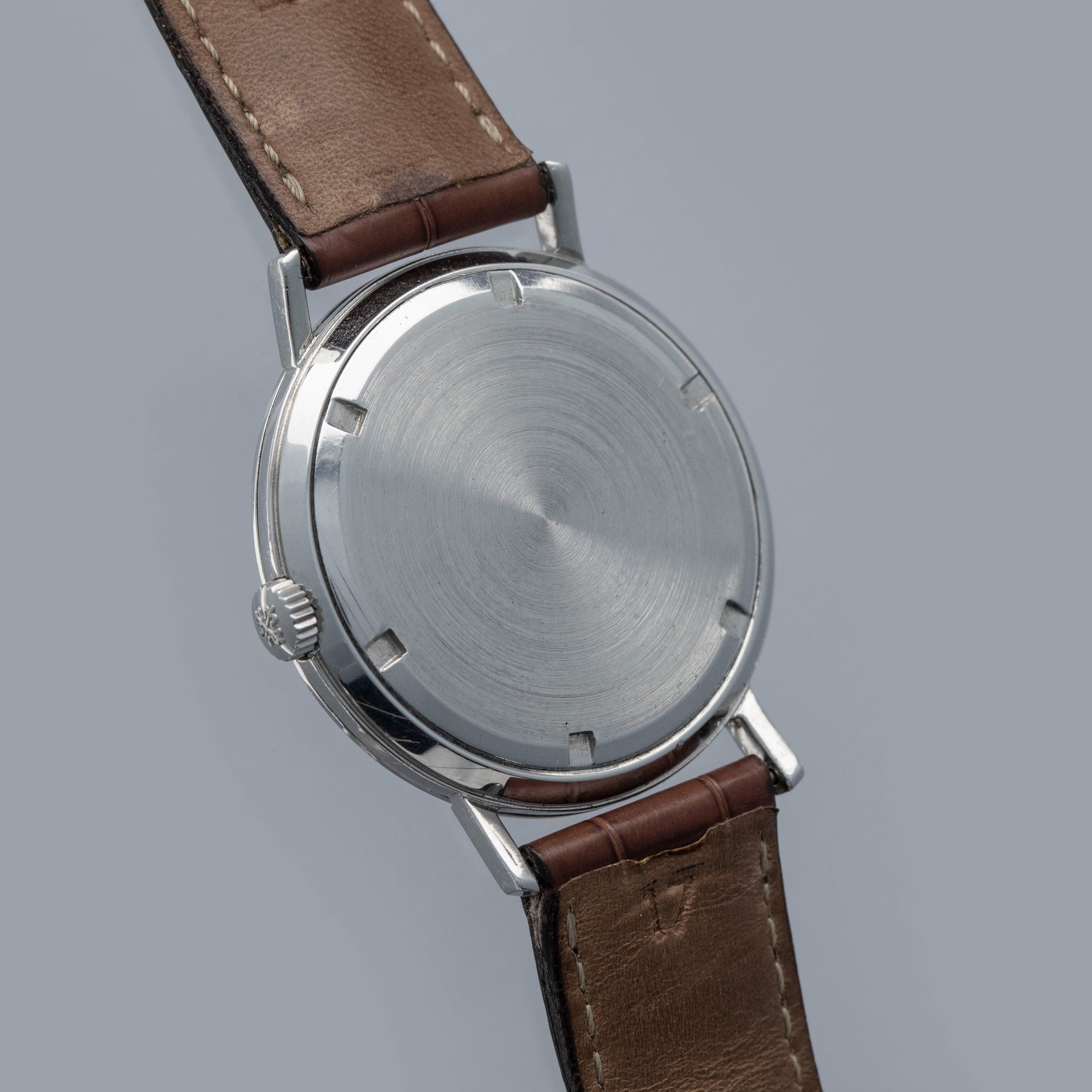 Watch is in overall excellent condition. The steel case shows surface scratches and light scuffs consistent with age, while the case back displays a few small nicks. The dial shows bubbling across the surface along with some chips around the outer edge, while the hands remain clean. There is some light oxidation visible around the rehaut underneath the crystal. It is fitted with a brown Patek alligator strap in excellent condition and a steel Patek pin buckle, also in excellent condition. Comes with Patek Philippe Extract from the Archives and a card box box.