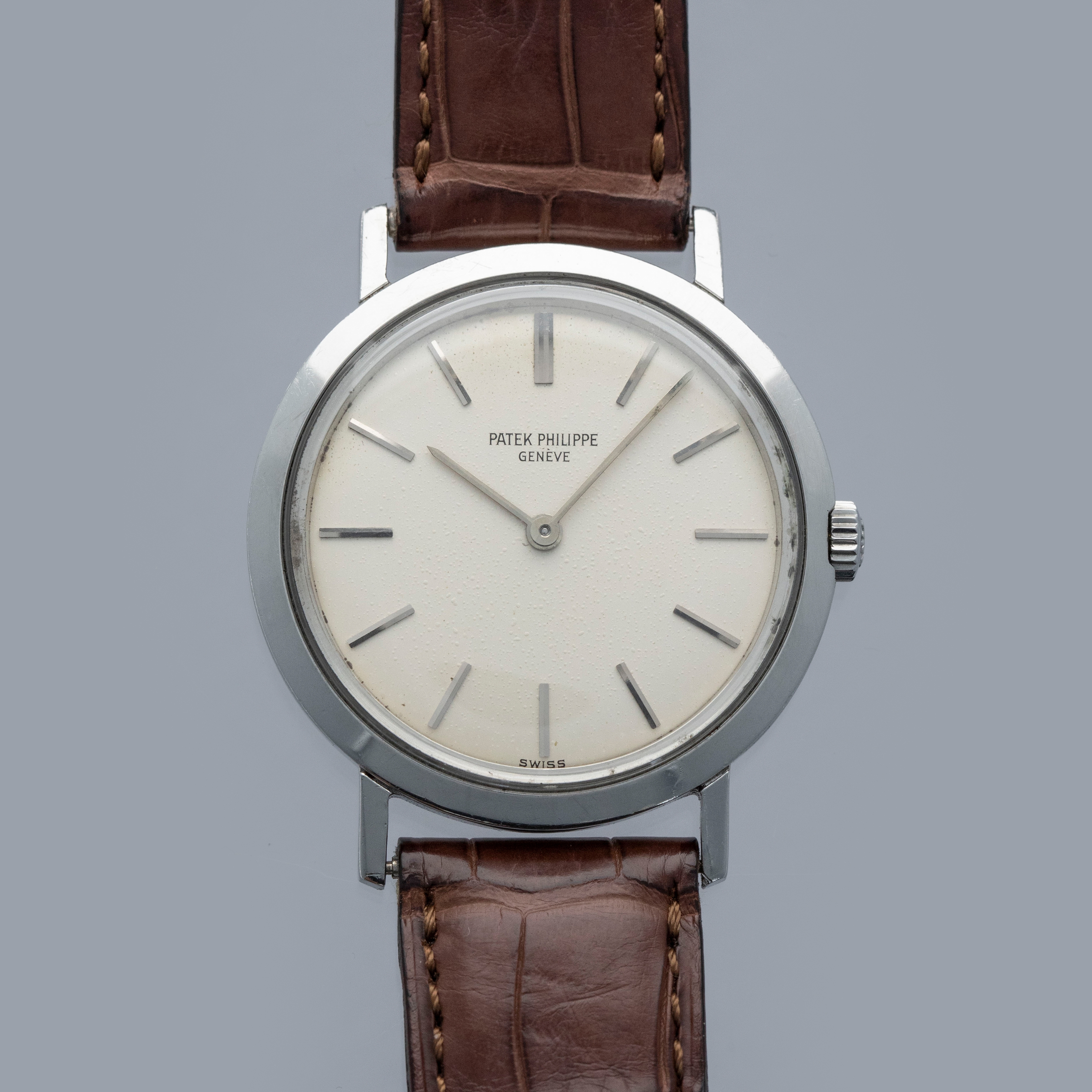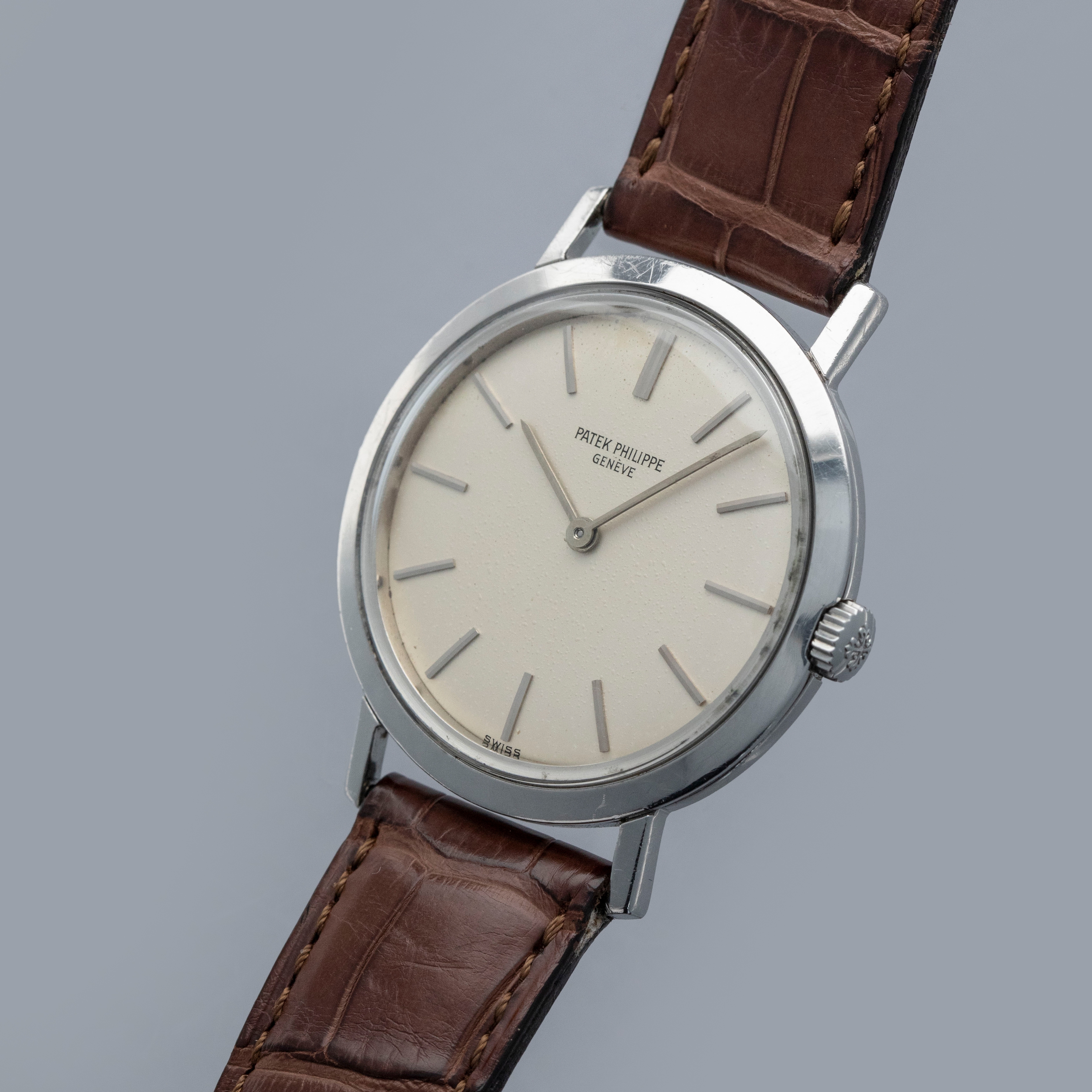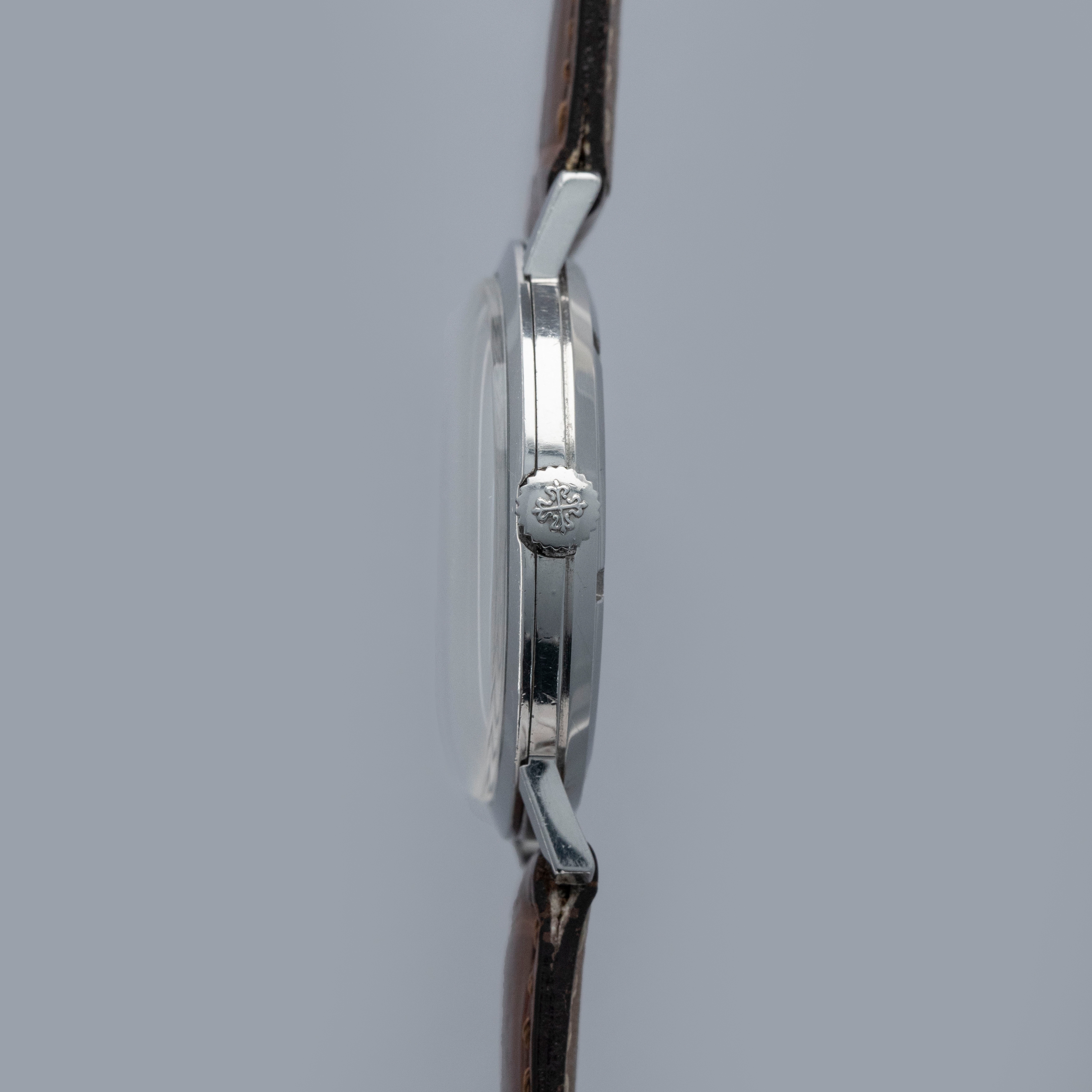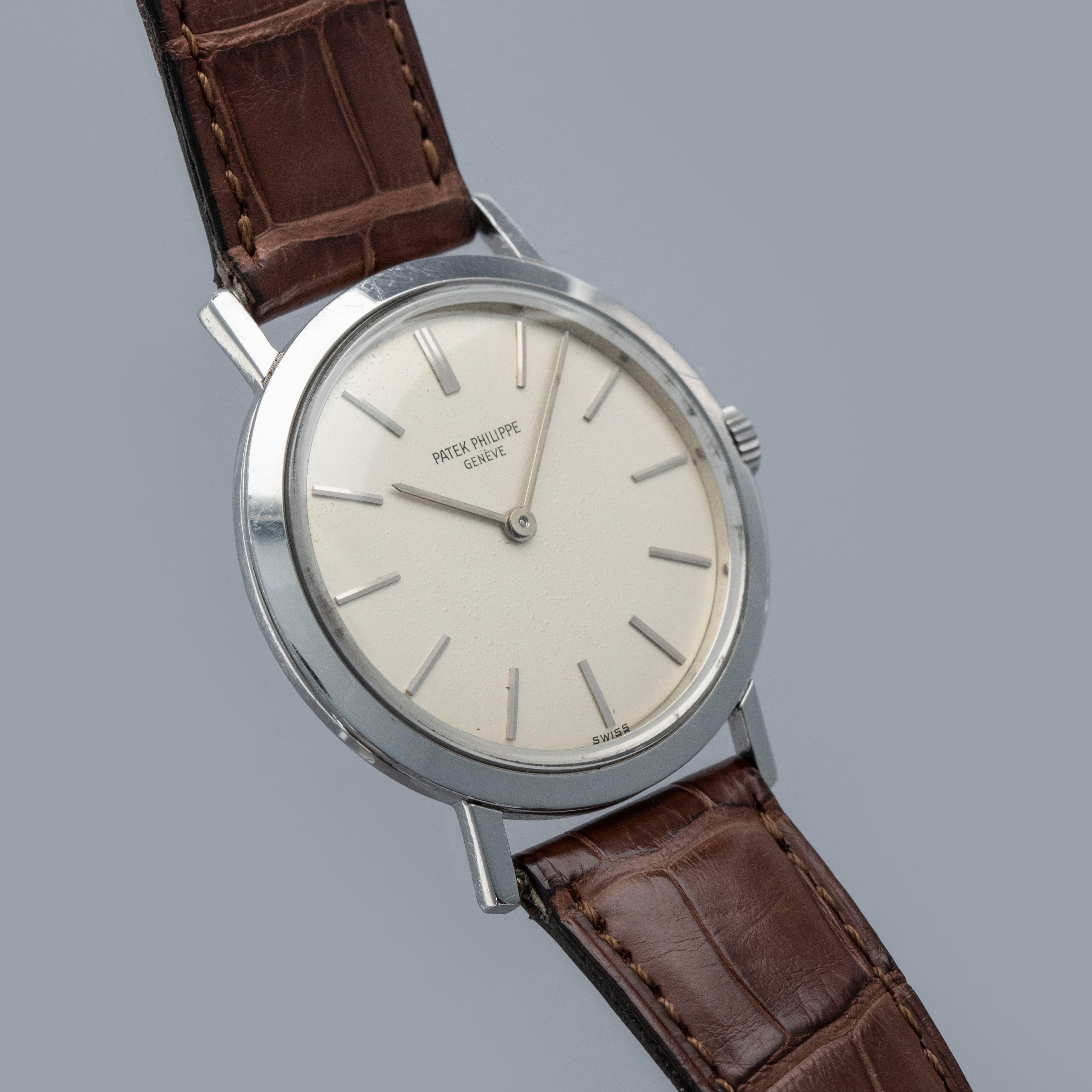 Famed for their luxurious take on horology and all of its facets, Patek Philippe seldom constructs their cases from metals that are not precious, like gold or platinum. As such, stainless steel examples of Patek Philippe’s timepieces are inherently rare, sought-after, and unusual. Offered here, we have one of those very timepieces, the Calatrava ref. 3509 made from stainless steel. Contrasting the Calatrava’s elegant dress watch persona, the ref. 3509 has become legendary due to its position as one of the very few stainless steel vintage Patek Philippe references. Combined with its stainless steel construction, the ref. 3509 is also sought-after due to screw-down caseback, which was an impressive departure from Patek’s more common snap-on casebacks. Featuring a manual-wind movement and a simple silver dial with applied indices and sword-shaped hands, the ref. 3509 seems right at home in today’s horological landscape, with its beautiful classically styled dial serving as a reminder of the time from which it has come.
