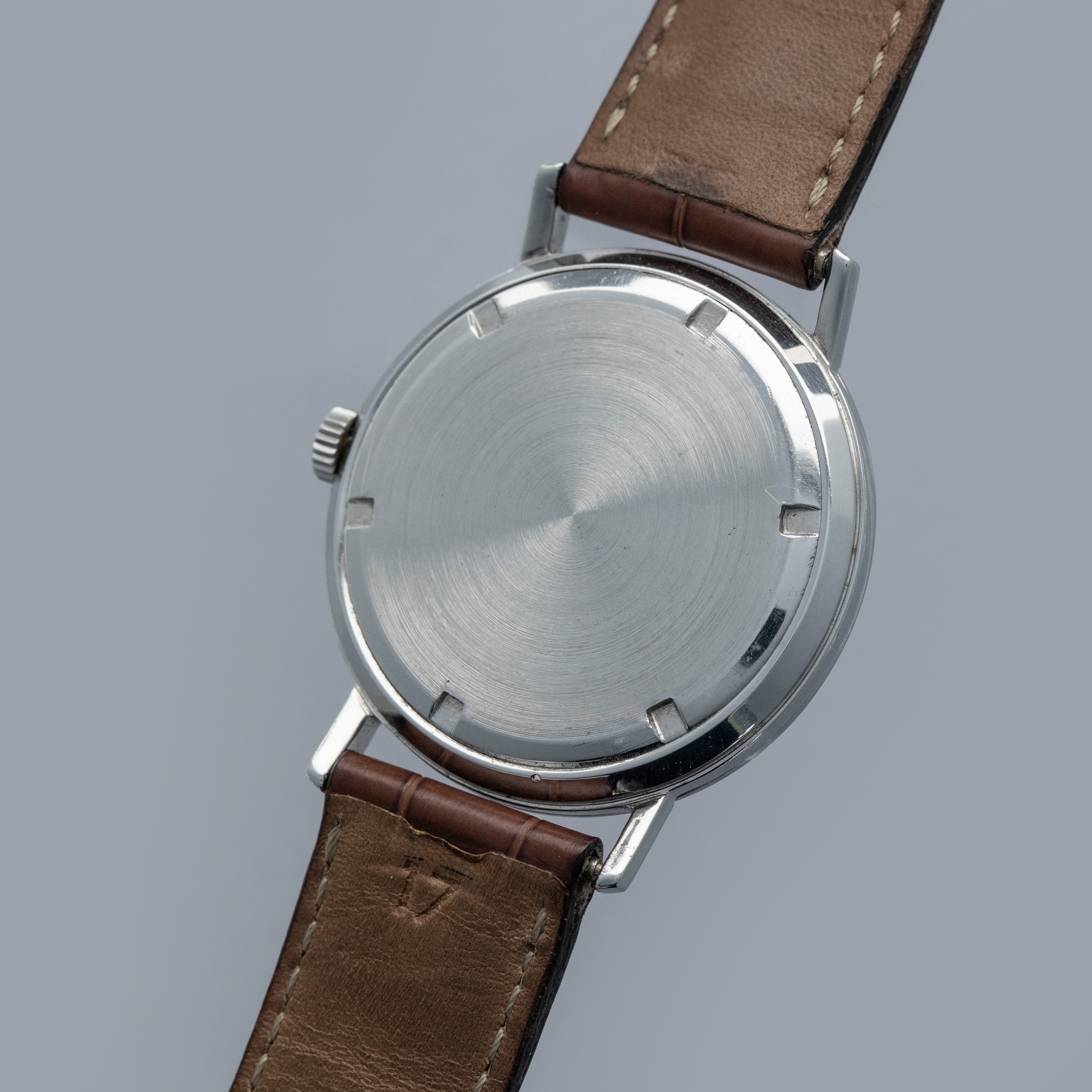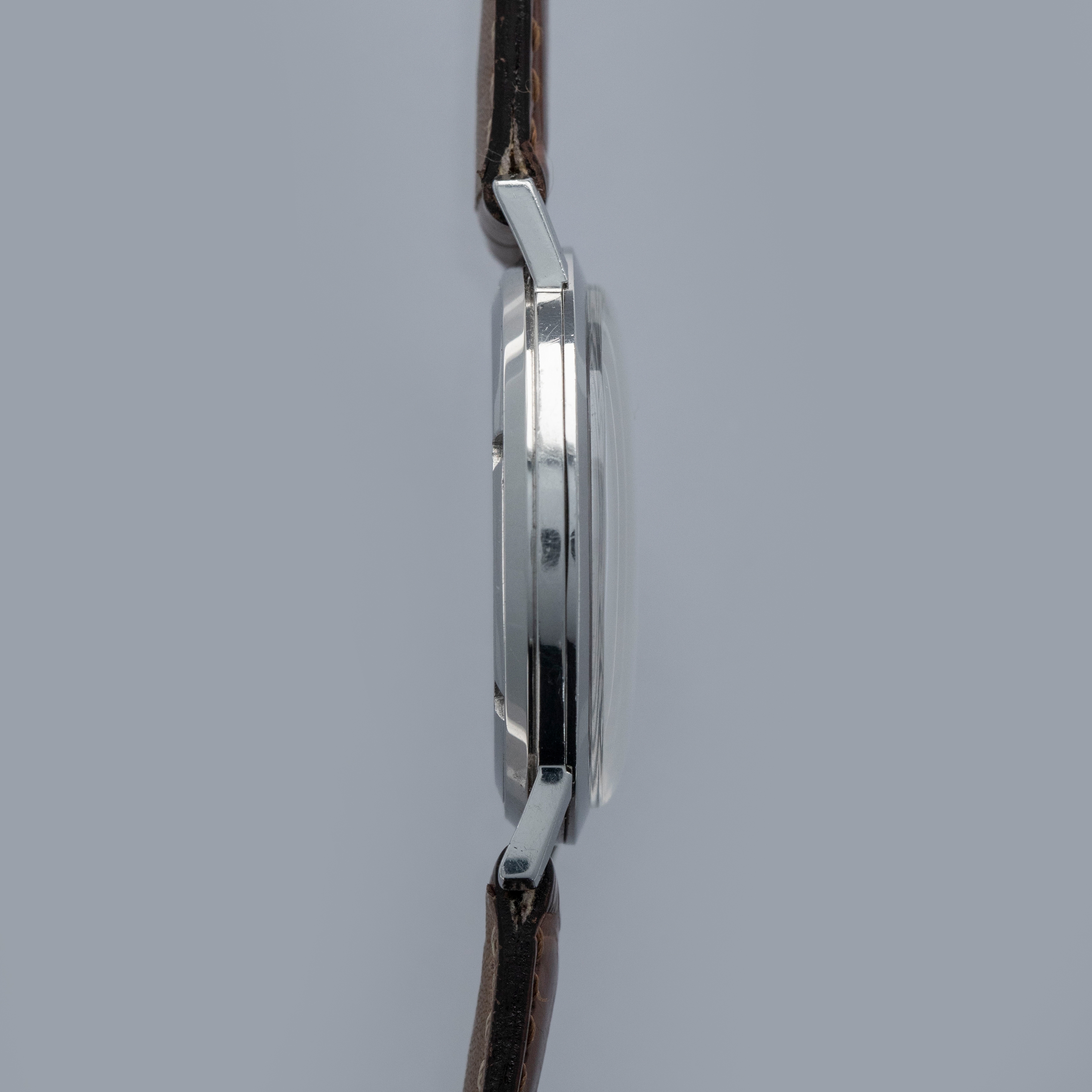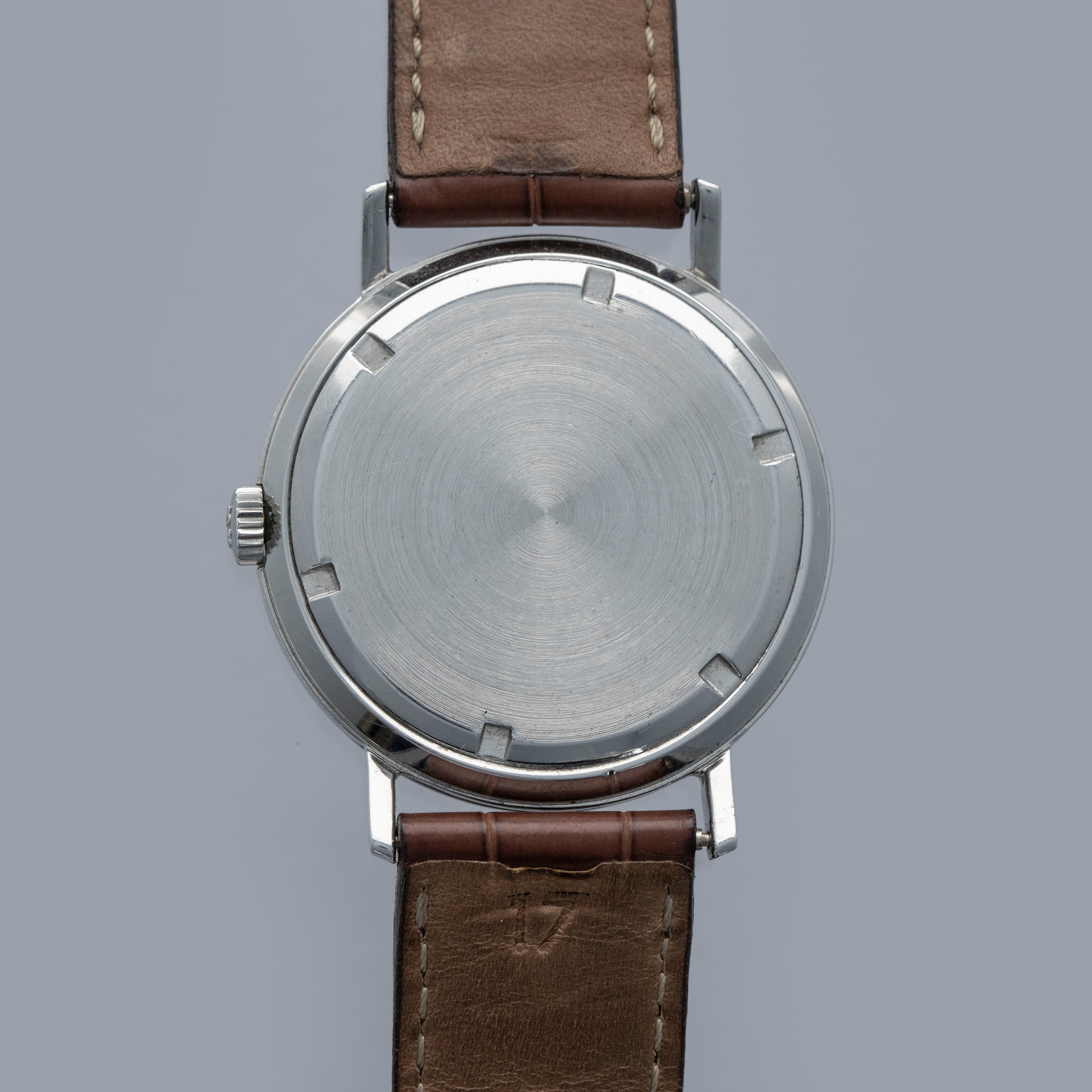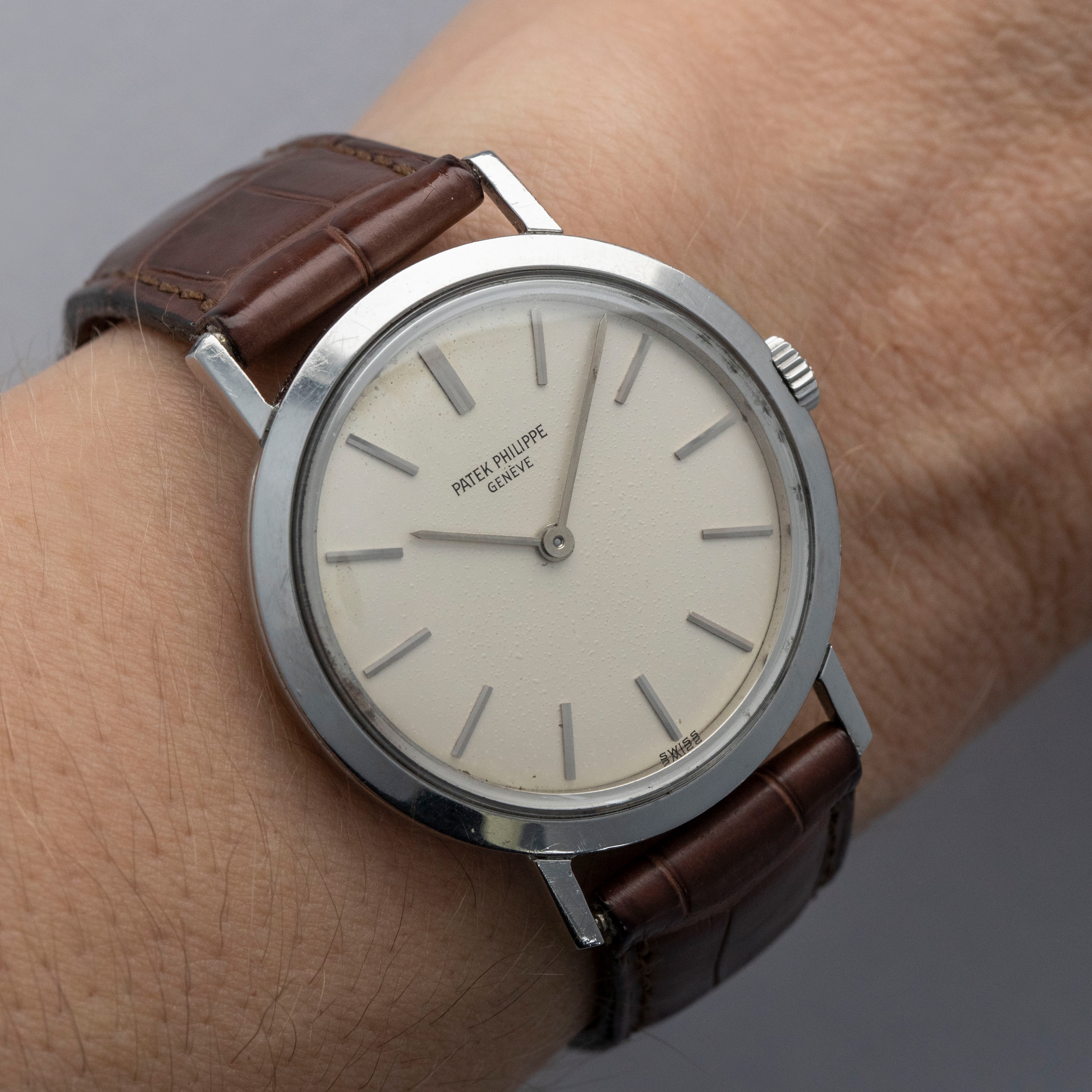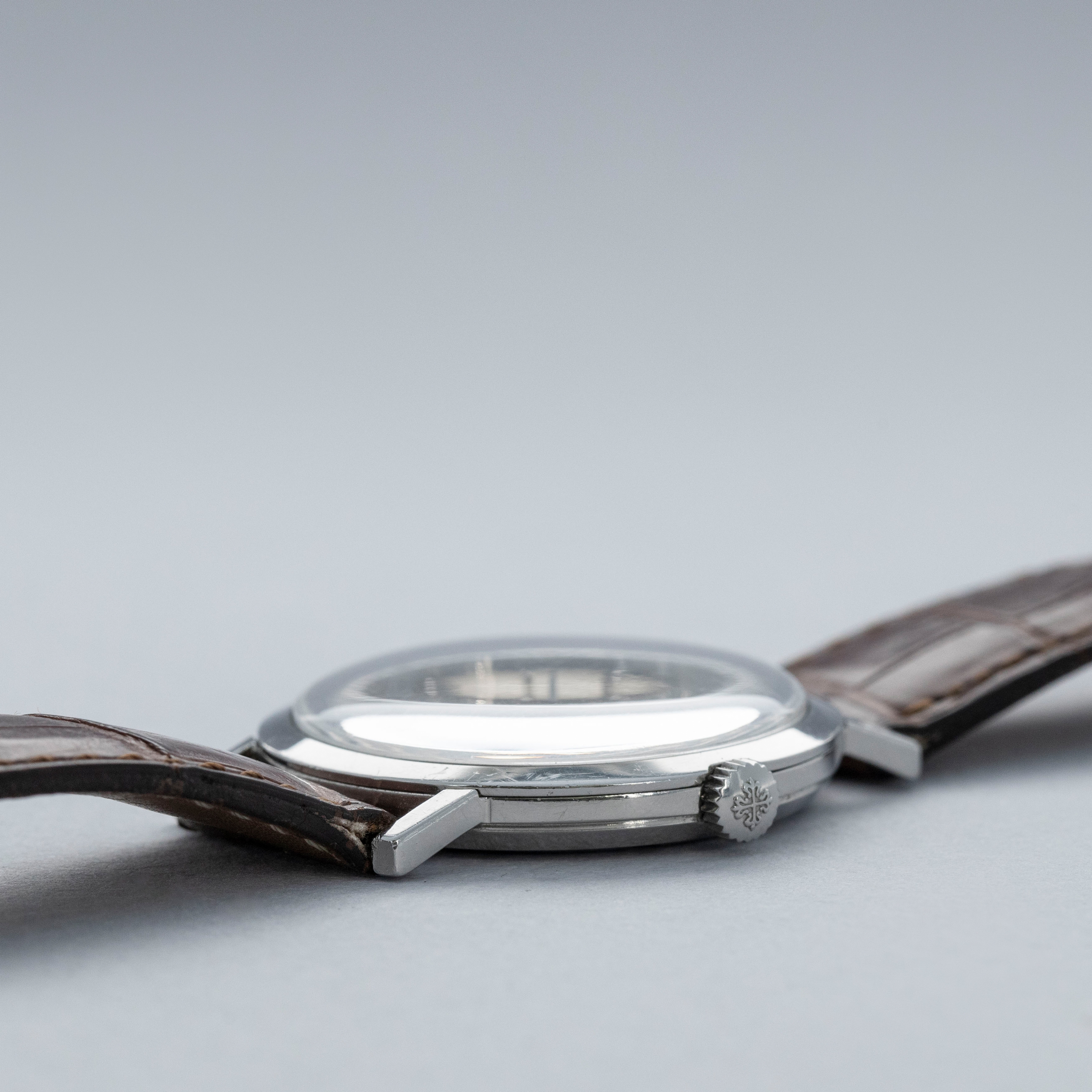 Famed for their luxurious take on horology and all of its facets, Patek Philippe seldom constructs their cases from metals that are not precious, like gold or platinum. As such, stainless steel examples of Patek Philippe’s timepieces are inherently rare, sought-after, and unusual. Offered here, we have one of those very timepieces, the Calatrava ref. 3509 made from stainless steel. Contrasting the Calatrava’s elegant dress watch persona, the ref. 3509 has become legendary due to its position as one of the very few stainless steel vintage Patek Philippe references. Combined with its stainless steel construction, the ref. 3509 is also sought-after due to screw-down caseback, which was an impressive departure from Patek’s more common snap-on casebacks. Featuring a manual-wind movement and a simple silver dial with applied indices and sword-shaped hands, the ref. 3509 seems right at home in today’s horological landscape, with its beautiful classically styled dial serving as a reminder of the time from which it has come.