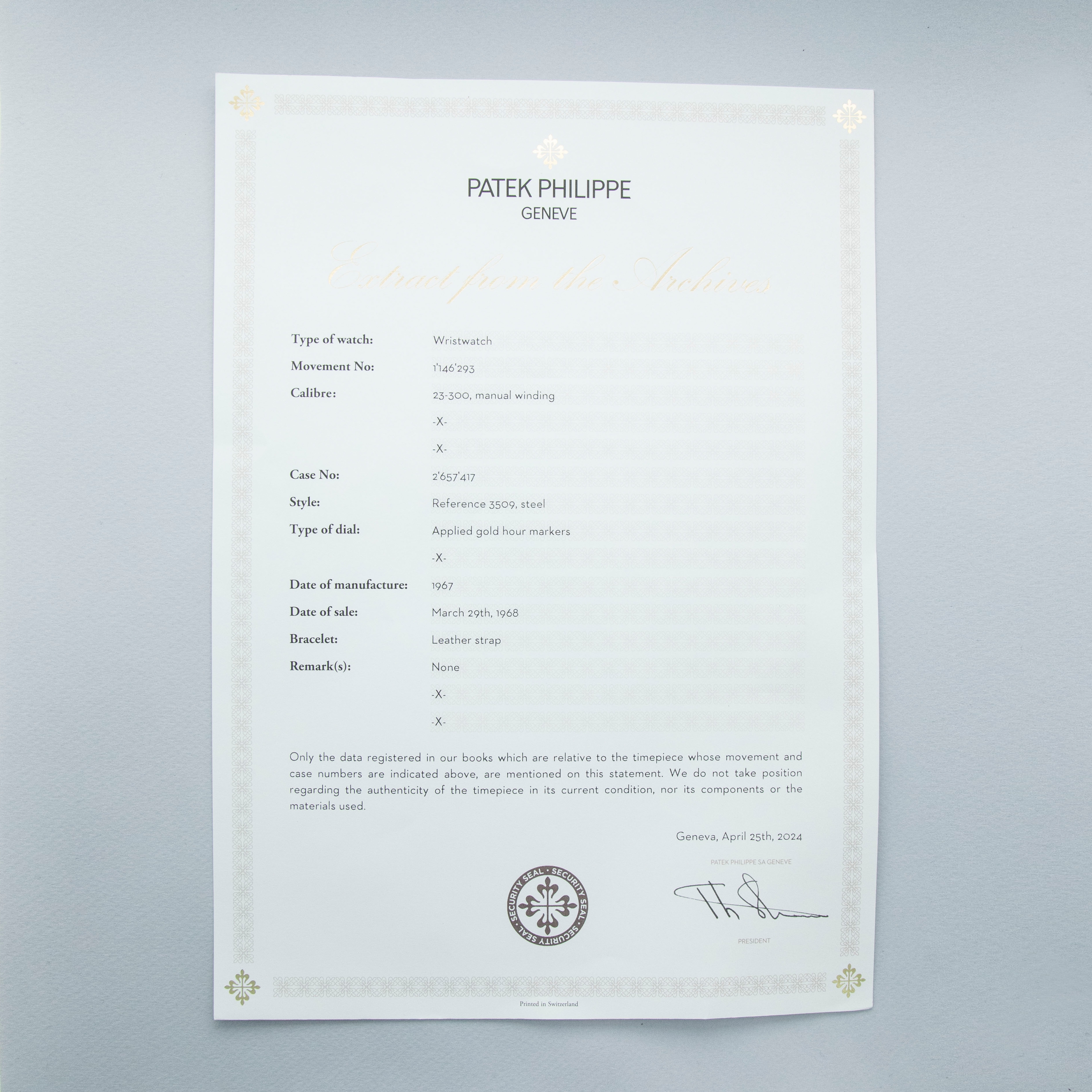 Patek Philippe Screwback Calatrava 3509 with Extract of the Archives