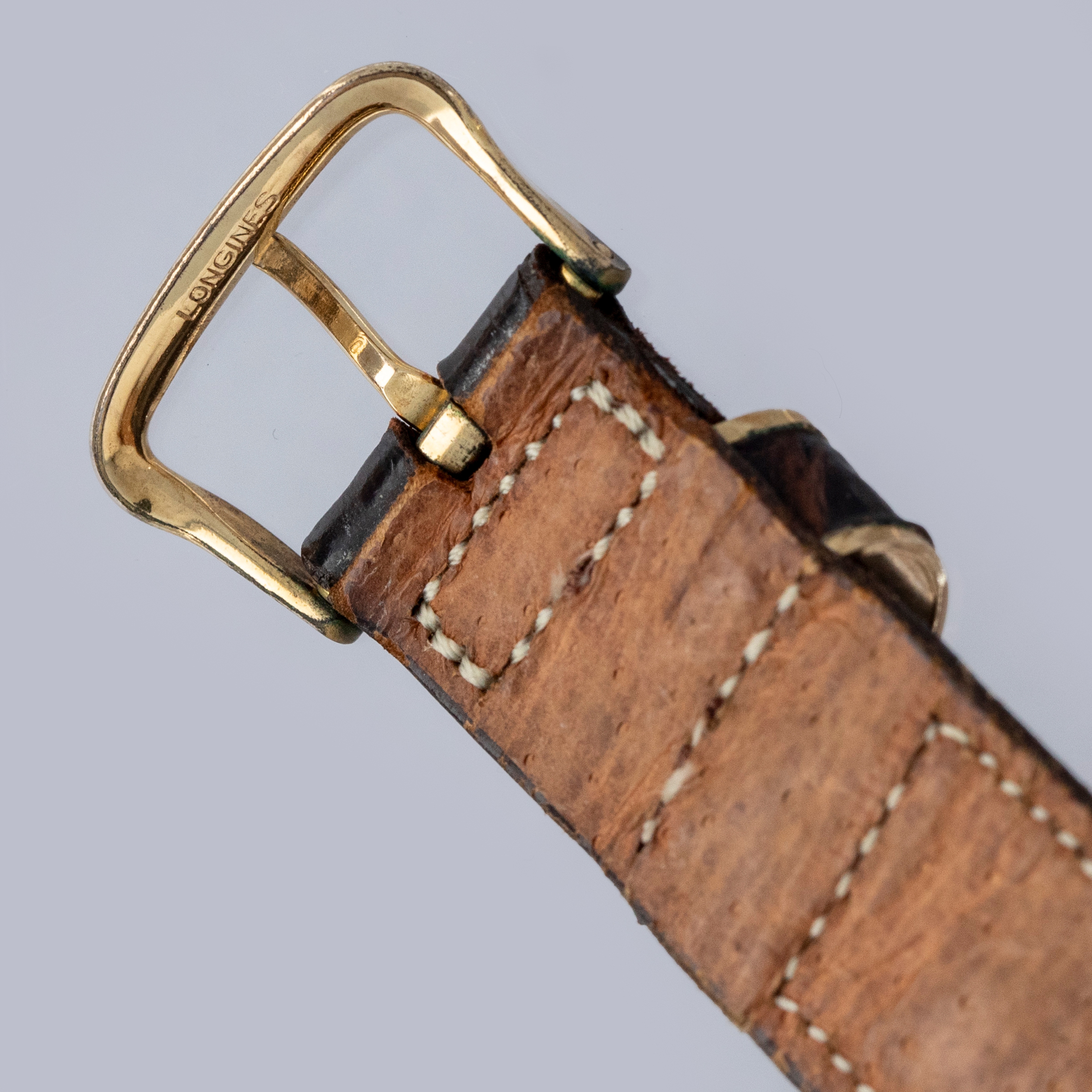 The watch is in very good overall condition. The lugs are soft, but the hallmark on the crown side remains visible. The case shows scratches and small nicks consistent with a watch of this vintage. The original dial is in very good condition, featuring a long Patek Philippe signature and original applied Breguet indexes. The watch is fitted with a brown leather Longines strap and a gold Longines-stamped buckle. Please note that the watch ticks at time of cataloging, but timekeeping is poor and a service is recommended.