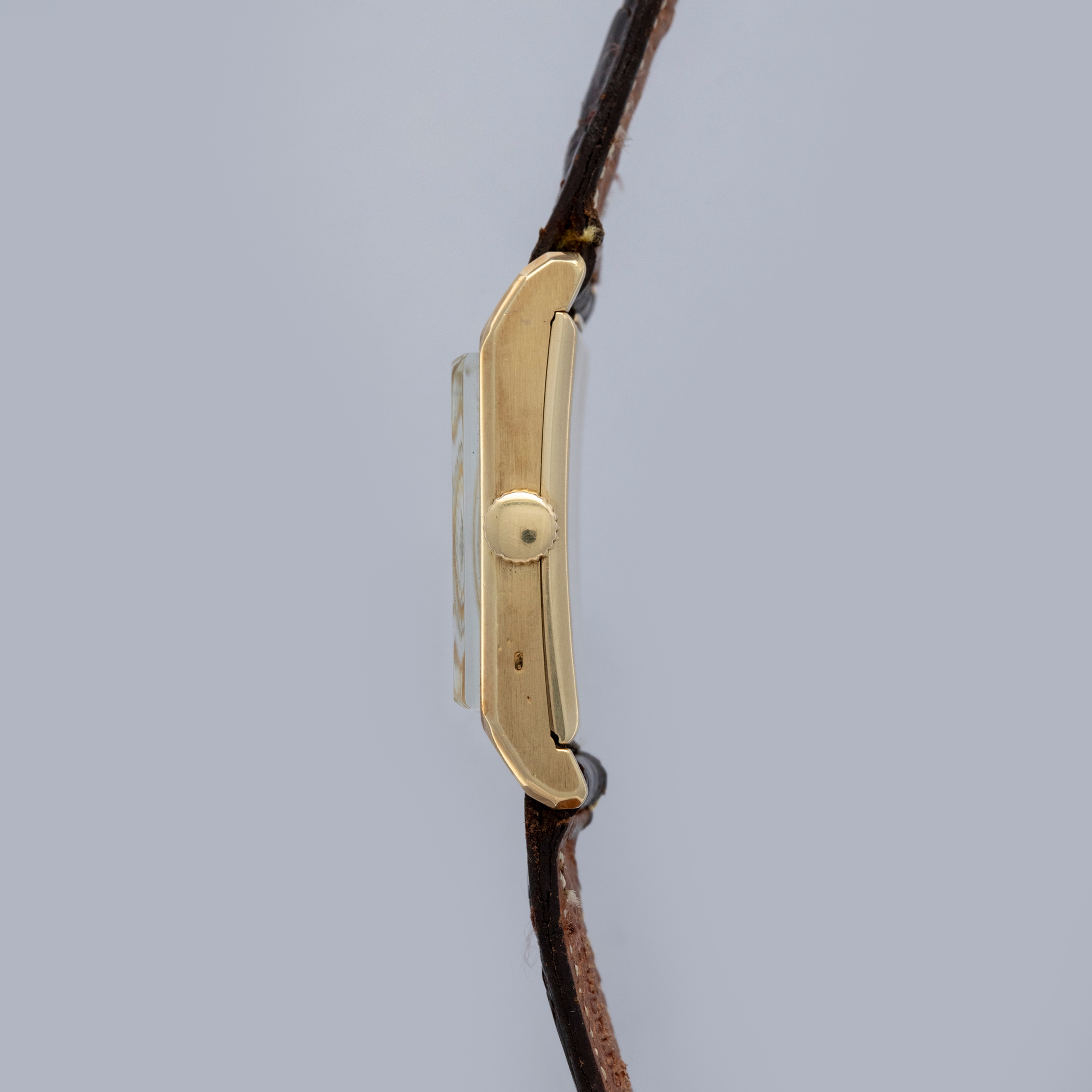 Boasting a silver dial with applied golden Arabic numerals and matching gold leaf hands, this ref. 406's display is and elegant and refined match for its 18kt yellow gold construction.