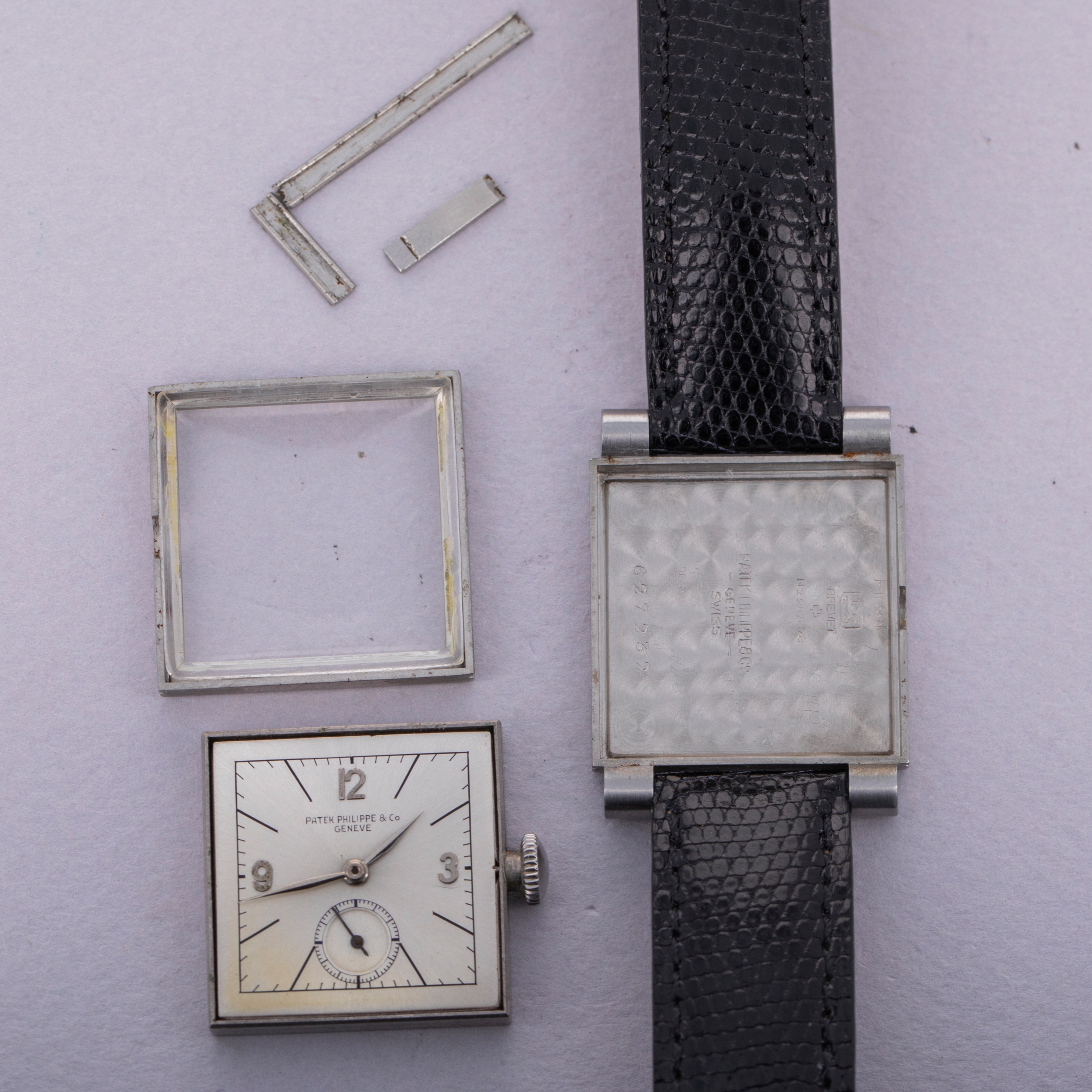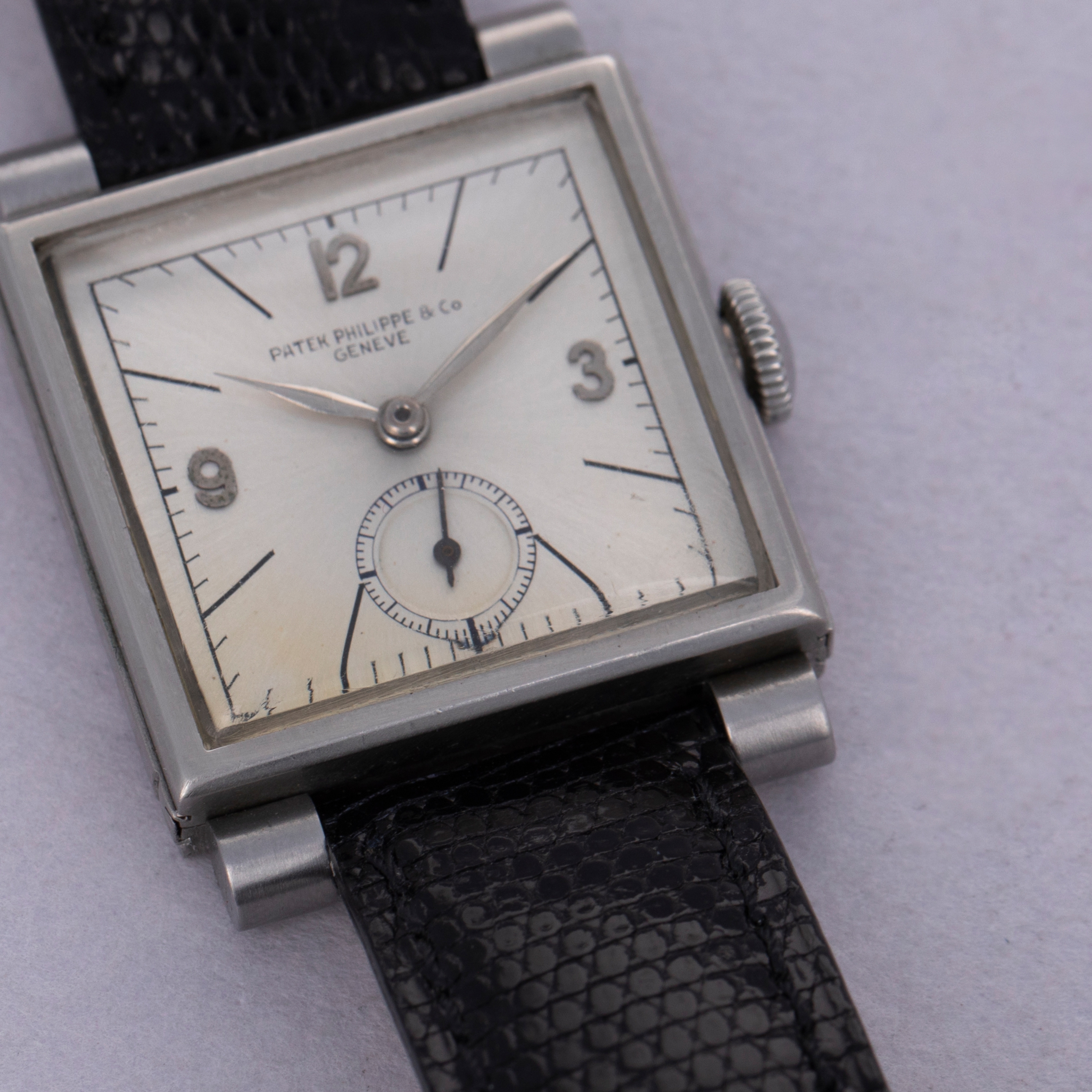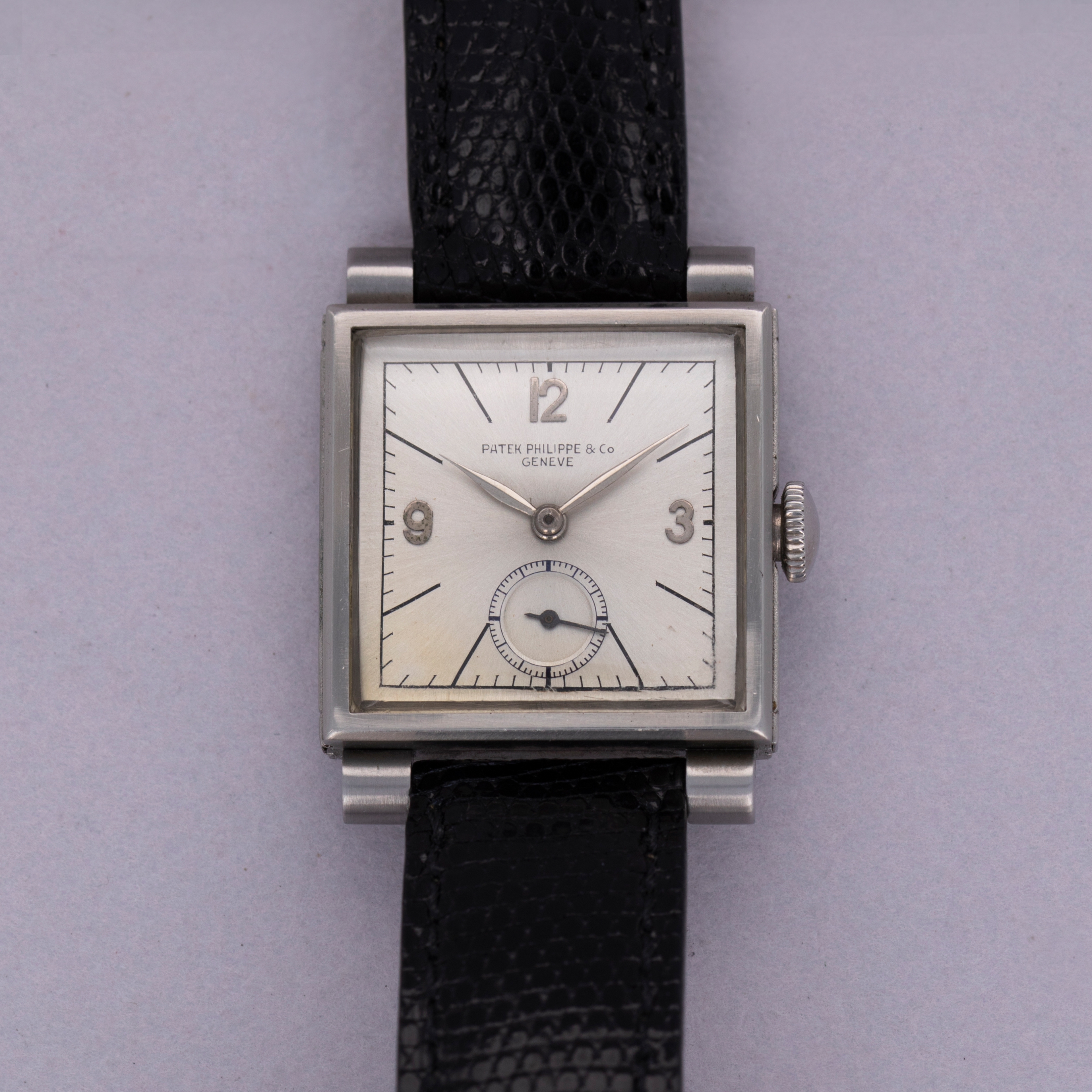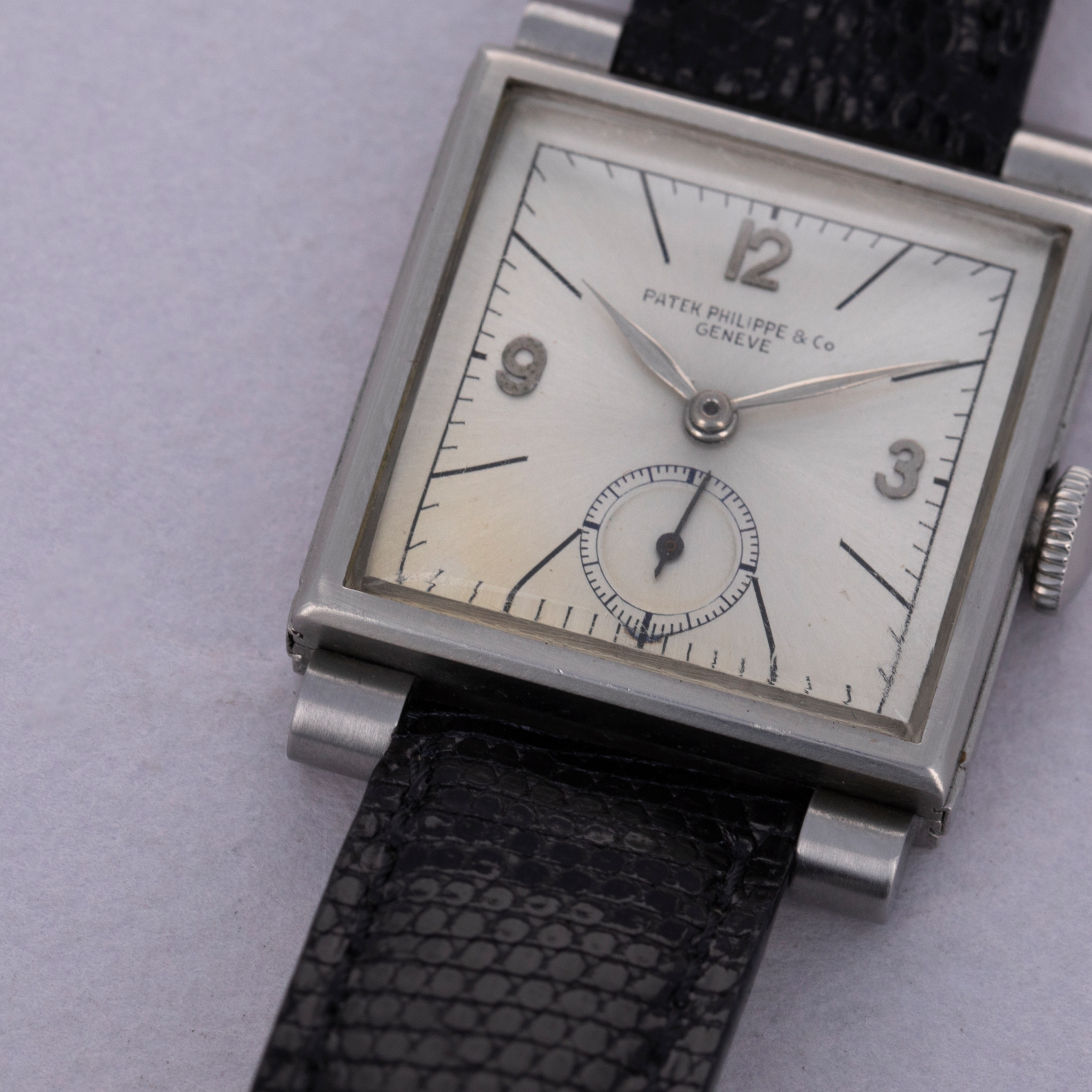 Watch is in very good overall condition. Case shows some wear, with some marks and scratches visible on the case and sliders. The brevet cross is still visible on the sliders, and they have visible scratches along the notched area. The original indelible Patek Philippe & Co. dial is in very good condiiton. It has previously been cleaned, and there are small breaks in the signature visible. Minor oxidation on the applied indexes. Watch comes on a generic strap and buckle. Please note that the watch winds and ticks at time of cataloging, but it is keeping poor time and a service is recommended.
