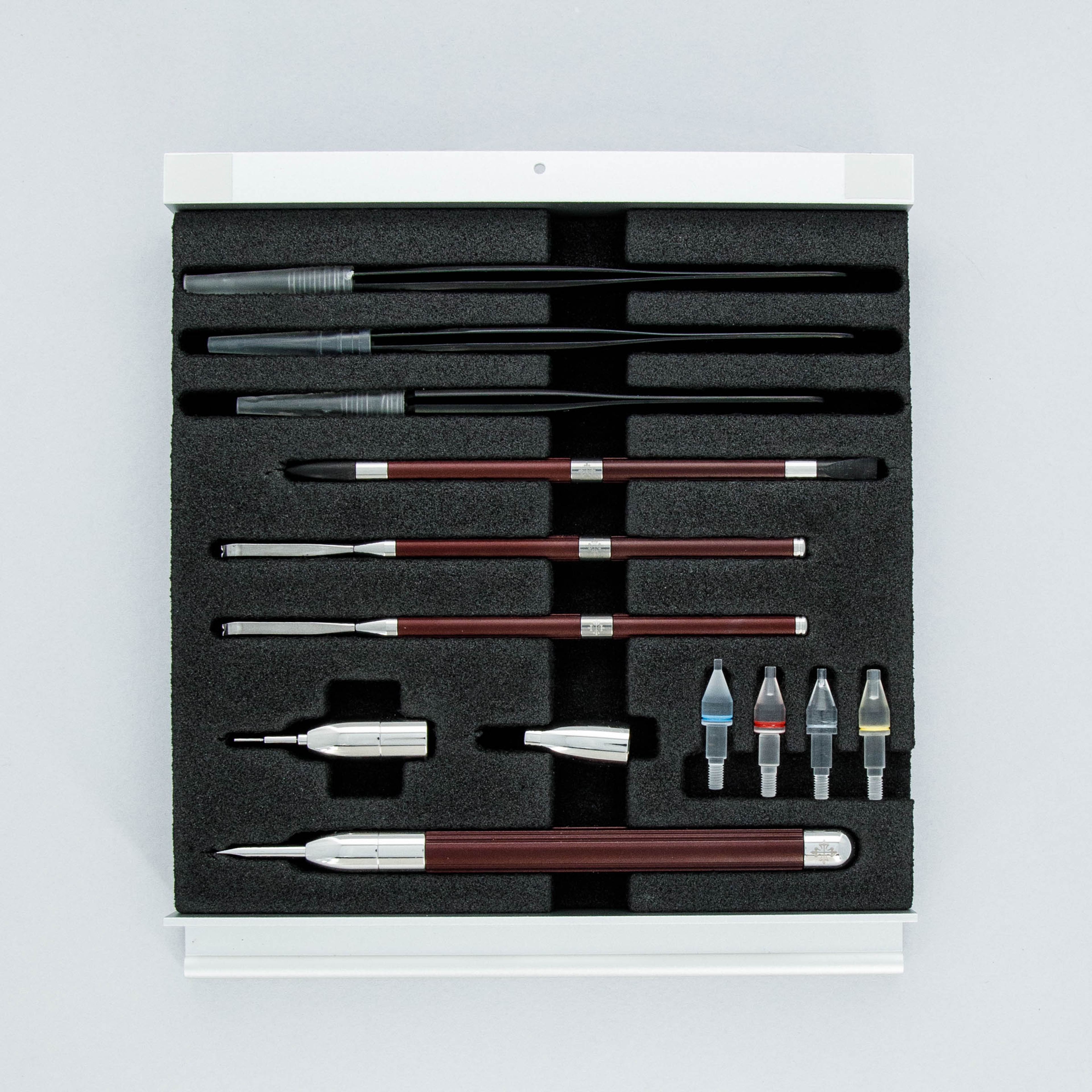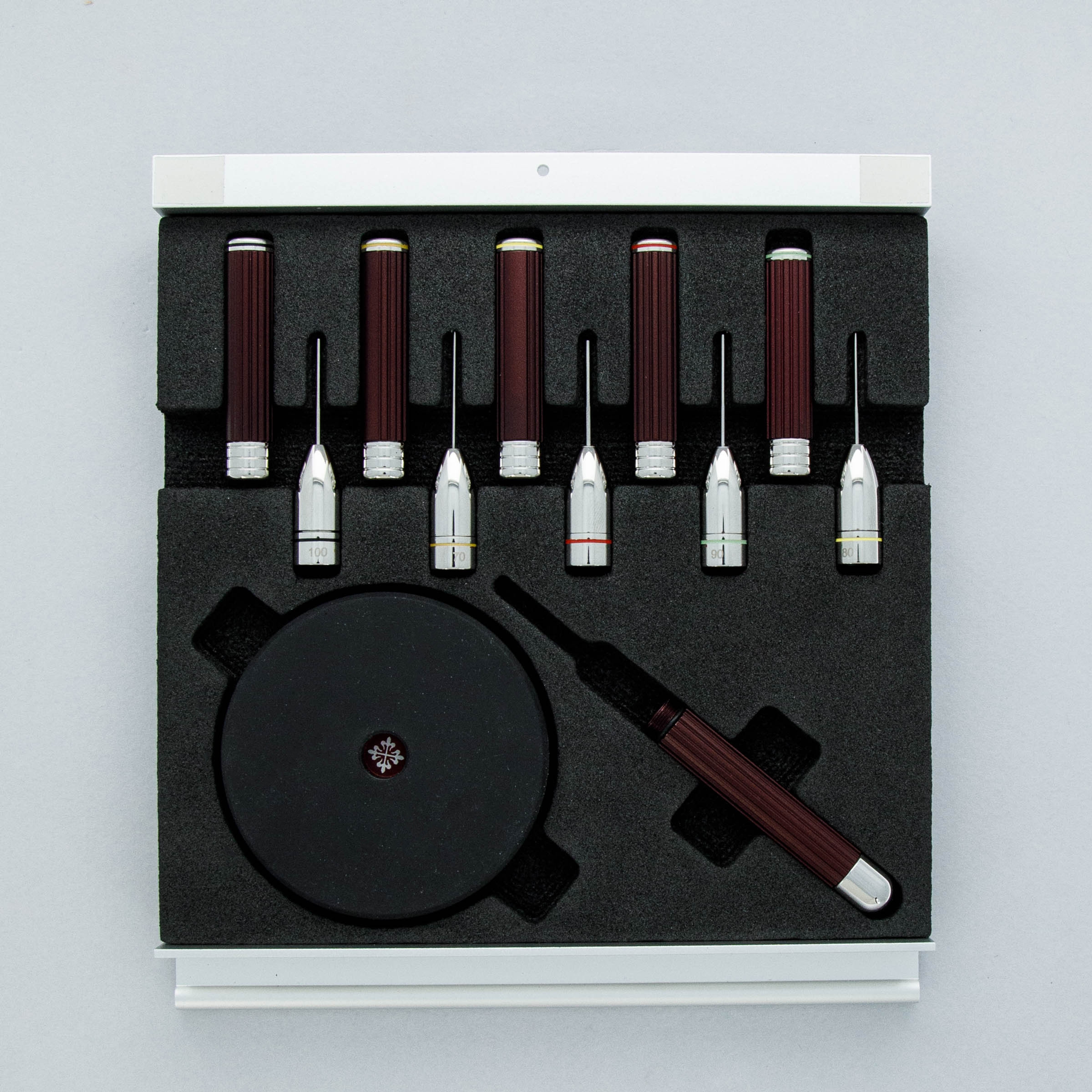 This kit is such a treat — not just a useful set of the highest quality tool you have ever seen - but also a glimpse into Patek Philippe's inner workings. Designed as an award for students as a prize for exceptional watchmaking employed within Patek Philippe, it is a fascinating collectible that you too can put to use. And everything that can have a Patek Philippe logo on it has Patek Philippe logo on it. This is for the true hard core Patek Philippe collector.