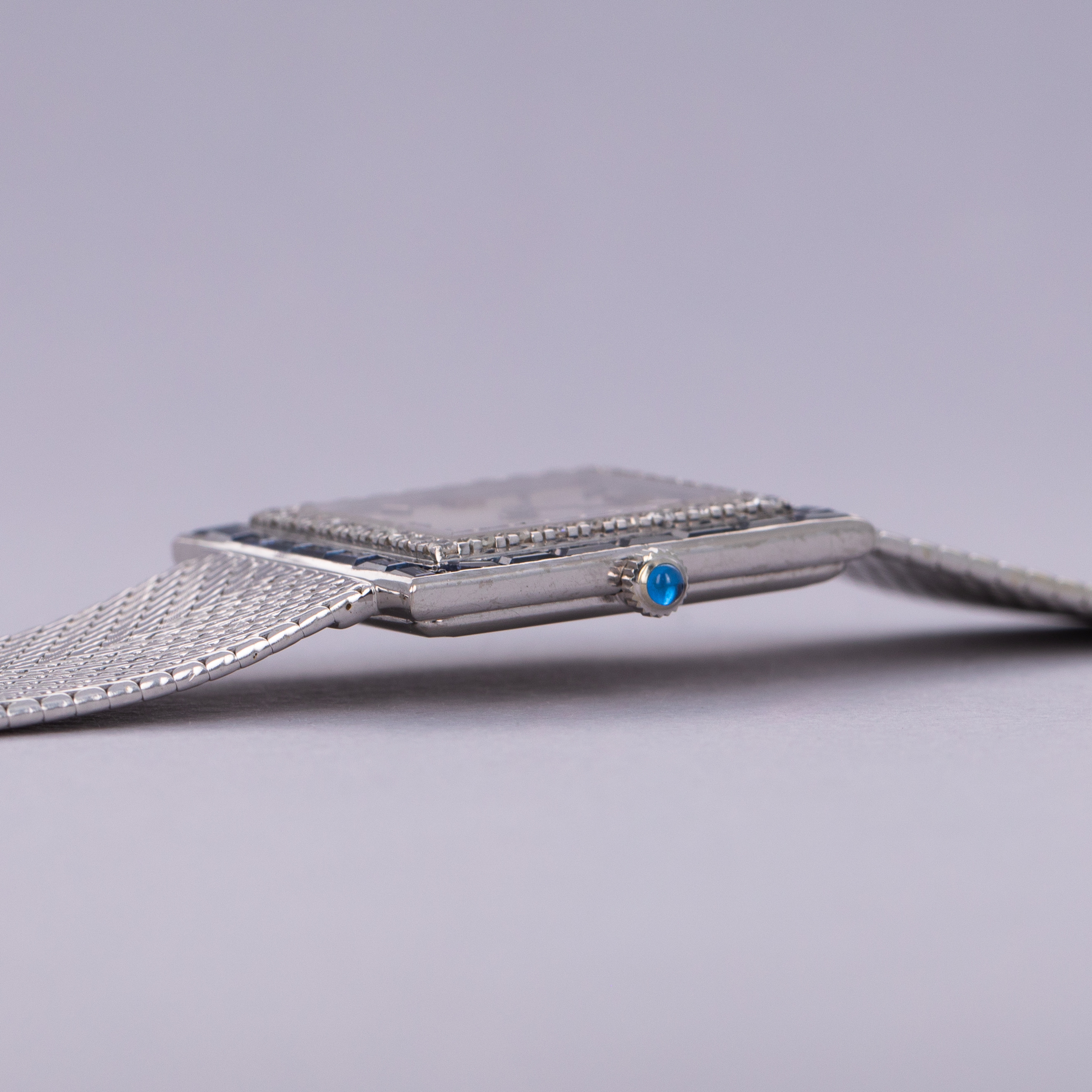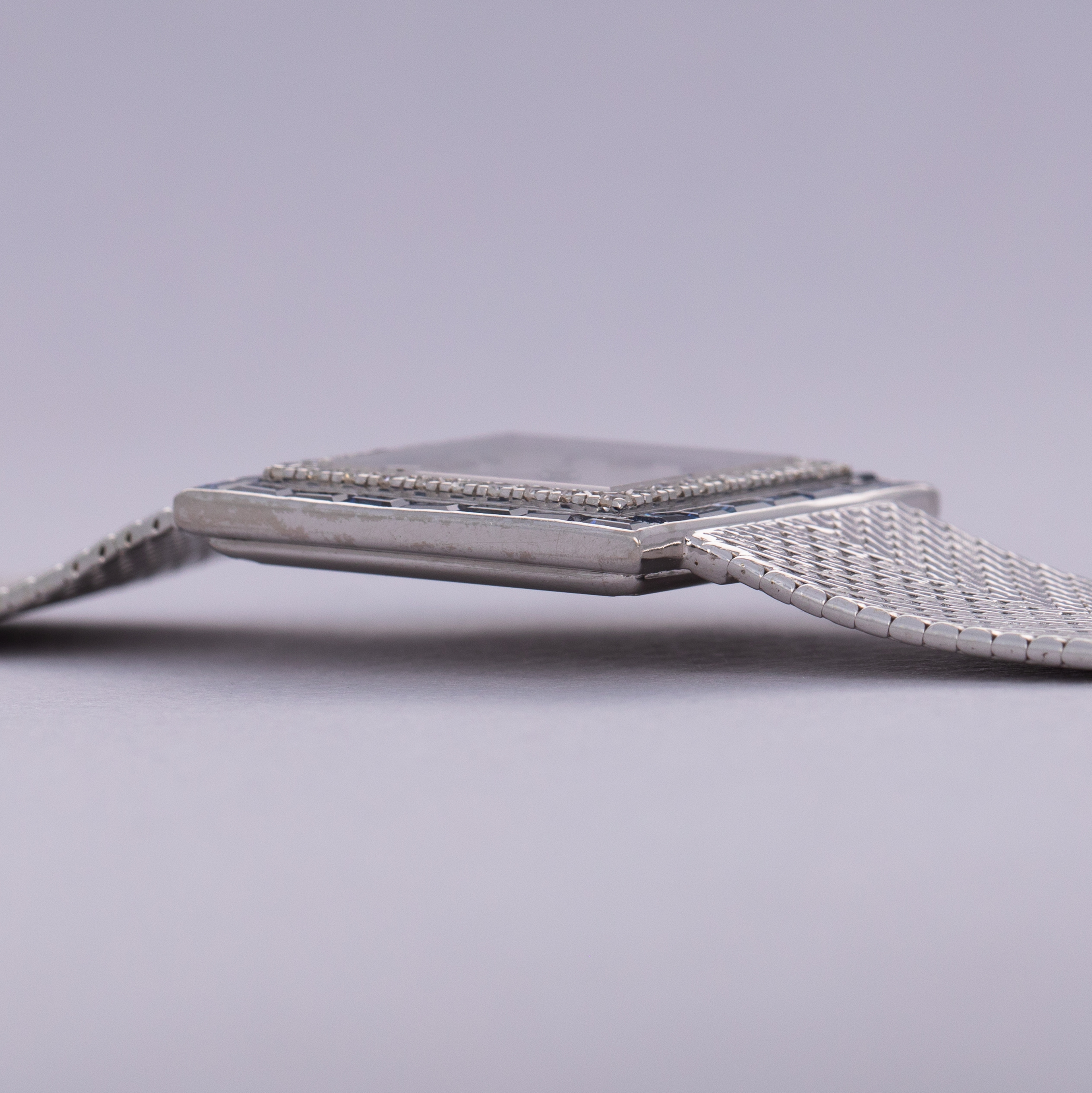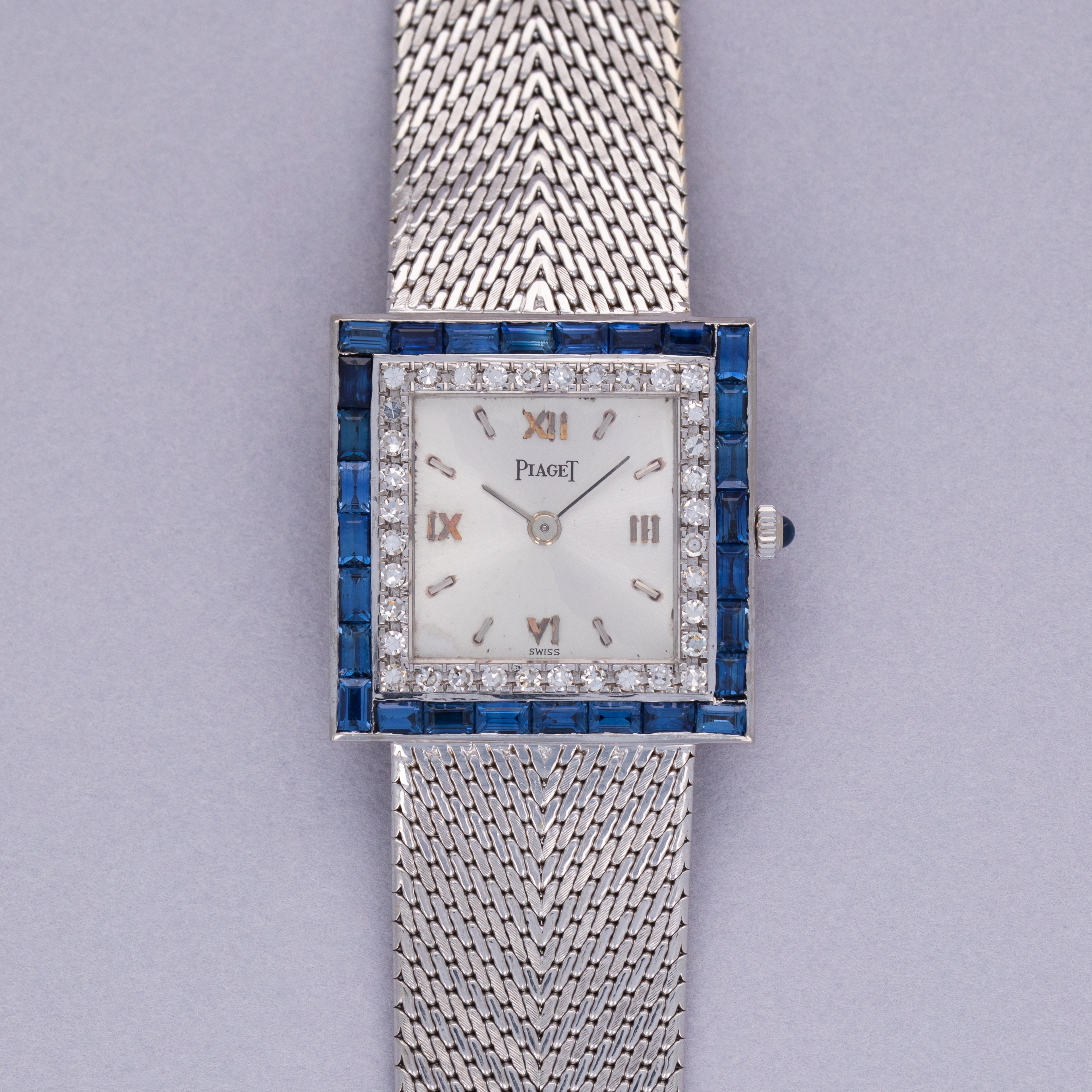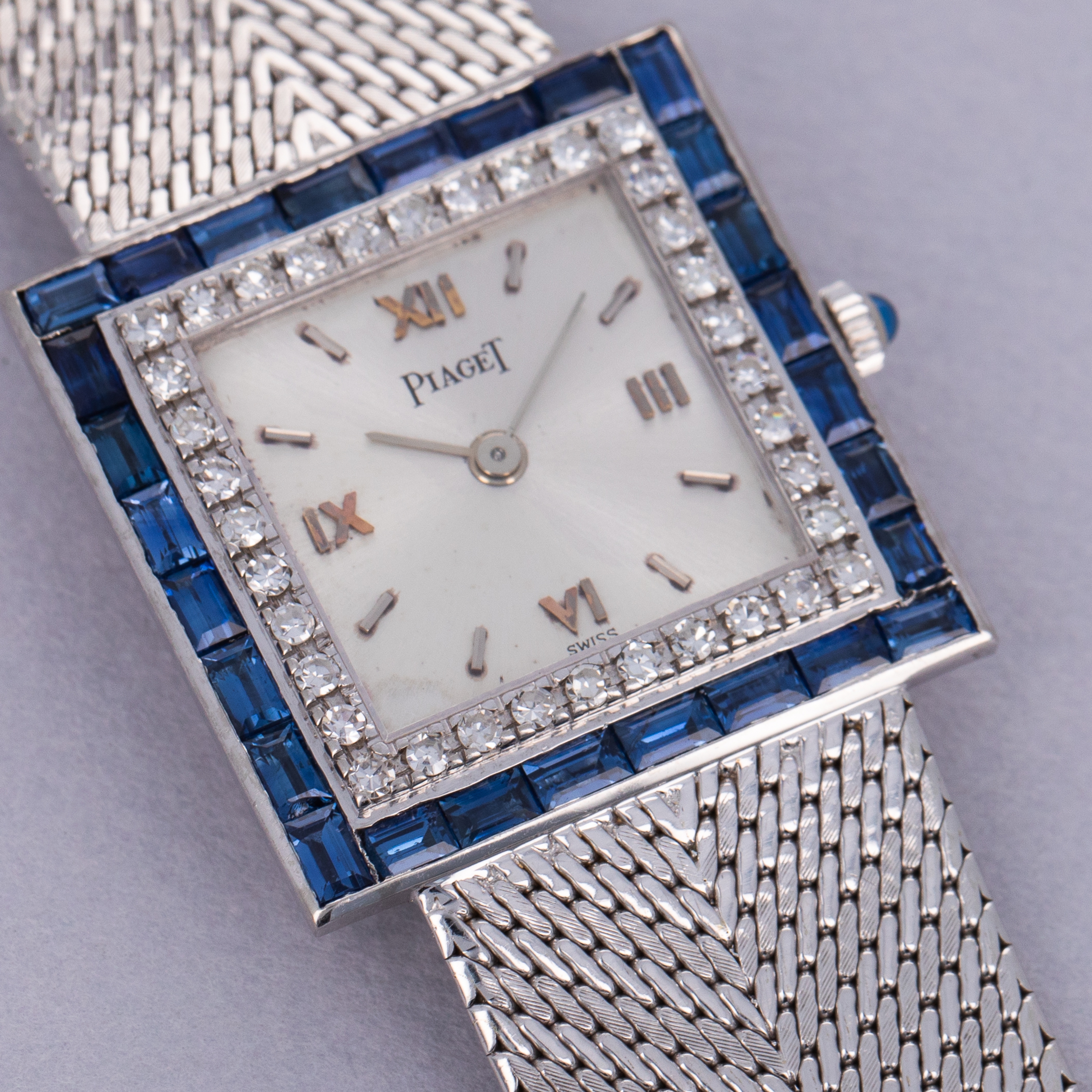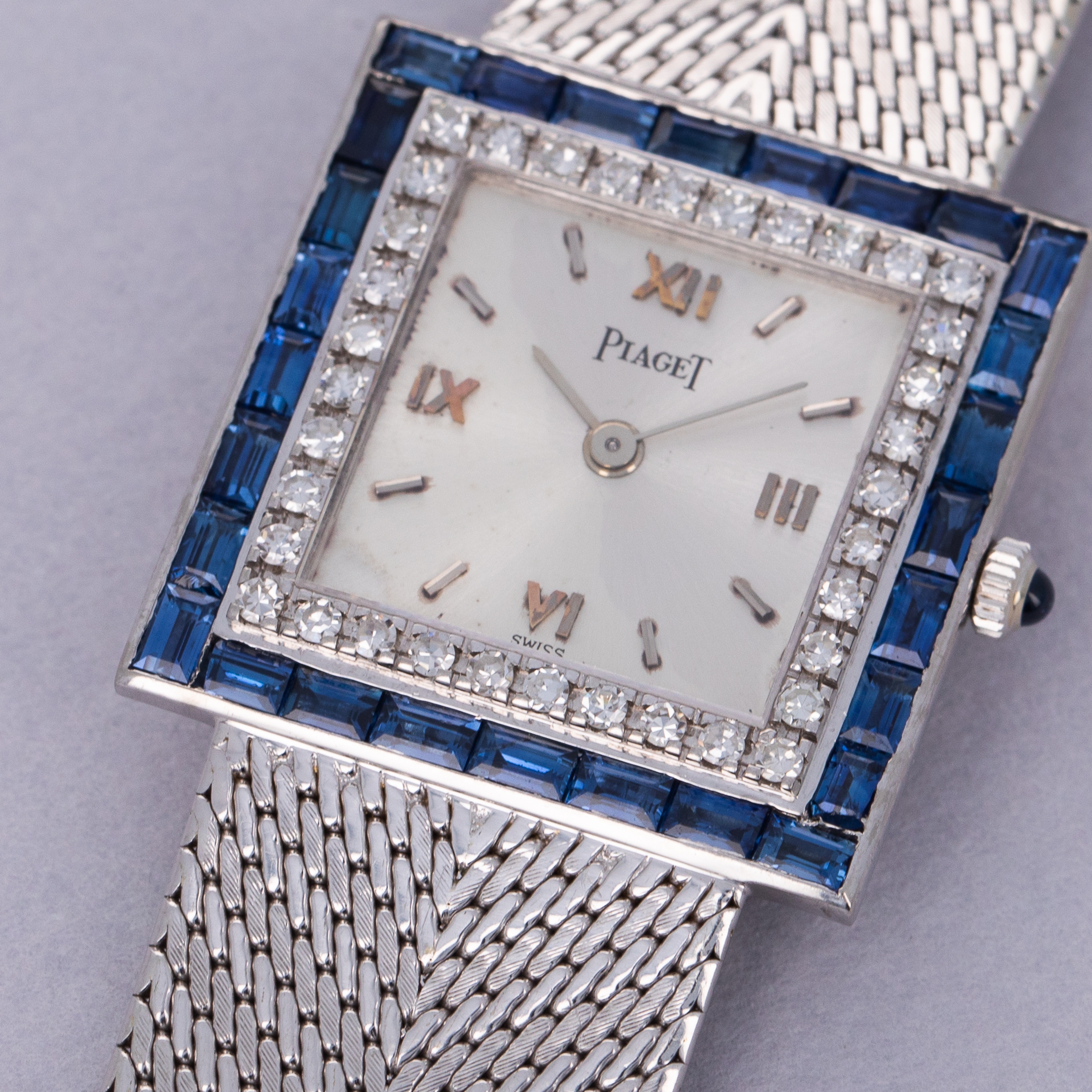 Founded in 1874 by a young 19-year-old in the village of La Côte-aux-Fées, Piaget was originally nothing but a means for Georges Piaget to earn some extra money as he worked on movements and watches during the winter. After decades of producing watches for other brands, it was not until 1943 that the watchmaker would begin to sign their own watches and develop as the famed watchmaker that they are today. From then on, Piaget began to experiment with ultra-thin watches and push both horological and design boundaries, which eventually led to the brand expanding into jewelry in 1959, perhaps the brand’s best-known avenue today. With their impeccable craftsmanship, audacious style, and dedication to the spectacular, Piaget’s timepieces and jewelry began to coalesce, resulting in timepieces much like the ref. 9203 that we have here. Measuring 25mm in diameter and hosting an incredibly intricate 18k white gold construction, this timepiece is a wonderful synthesis of Piaget’s distinctive exclusivity and rich horological aesthetic. Featuring an intricately woven 18kt white gold bracelet attached to its square-shaped 25mm case, this timepiece is extravagance at its very finest. Boasting gem-set bezel with two rows of diamonds and sapphires surrounding its silver dial, this timepiece’s design and execution is a further continuation of Piaget’s distinctive jeweler’s touch with its impeccable gem-setting craftsmanship and overall beauty.
