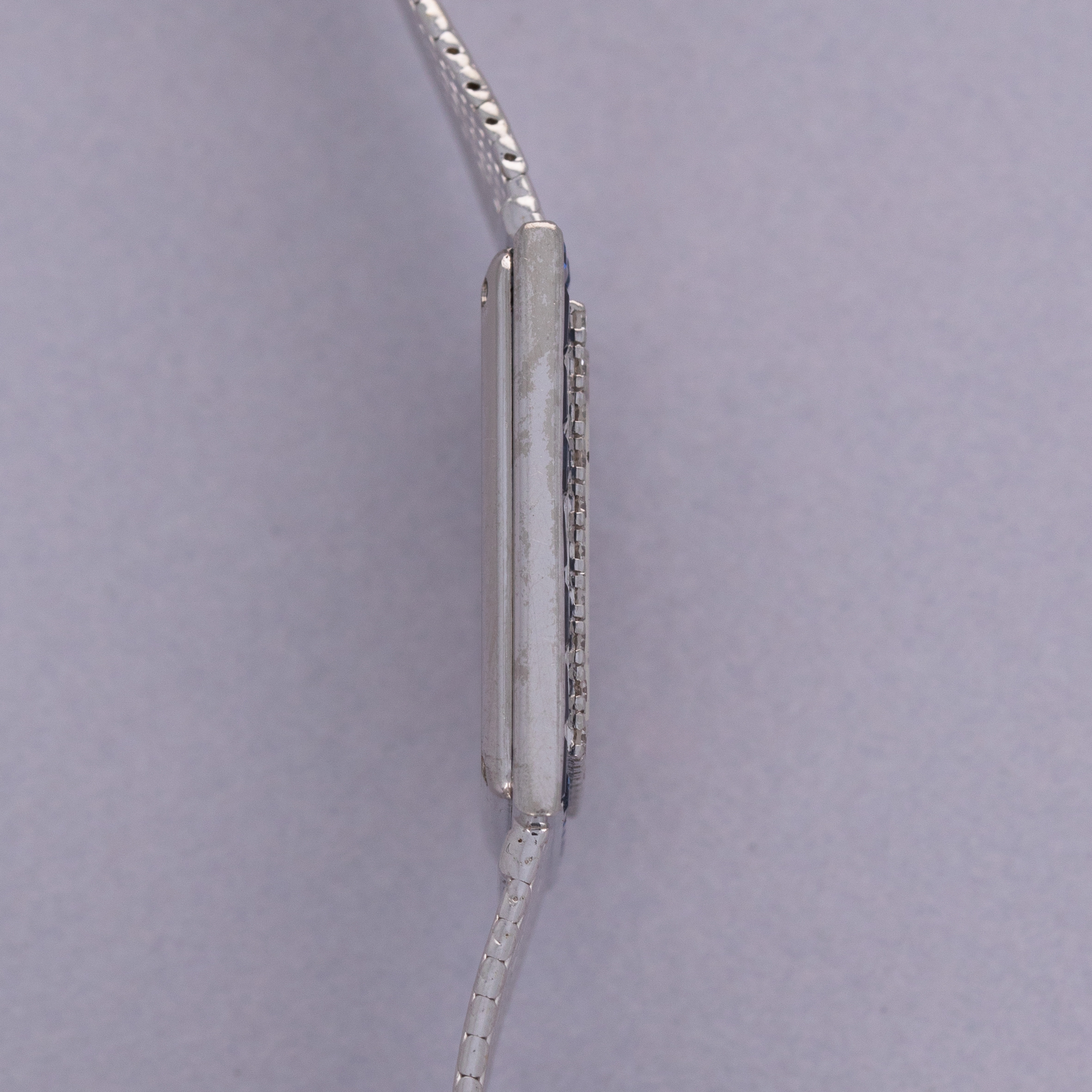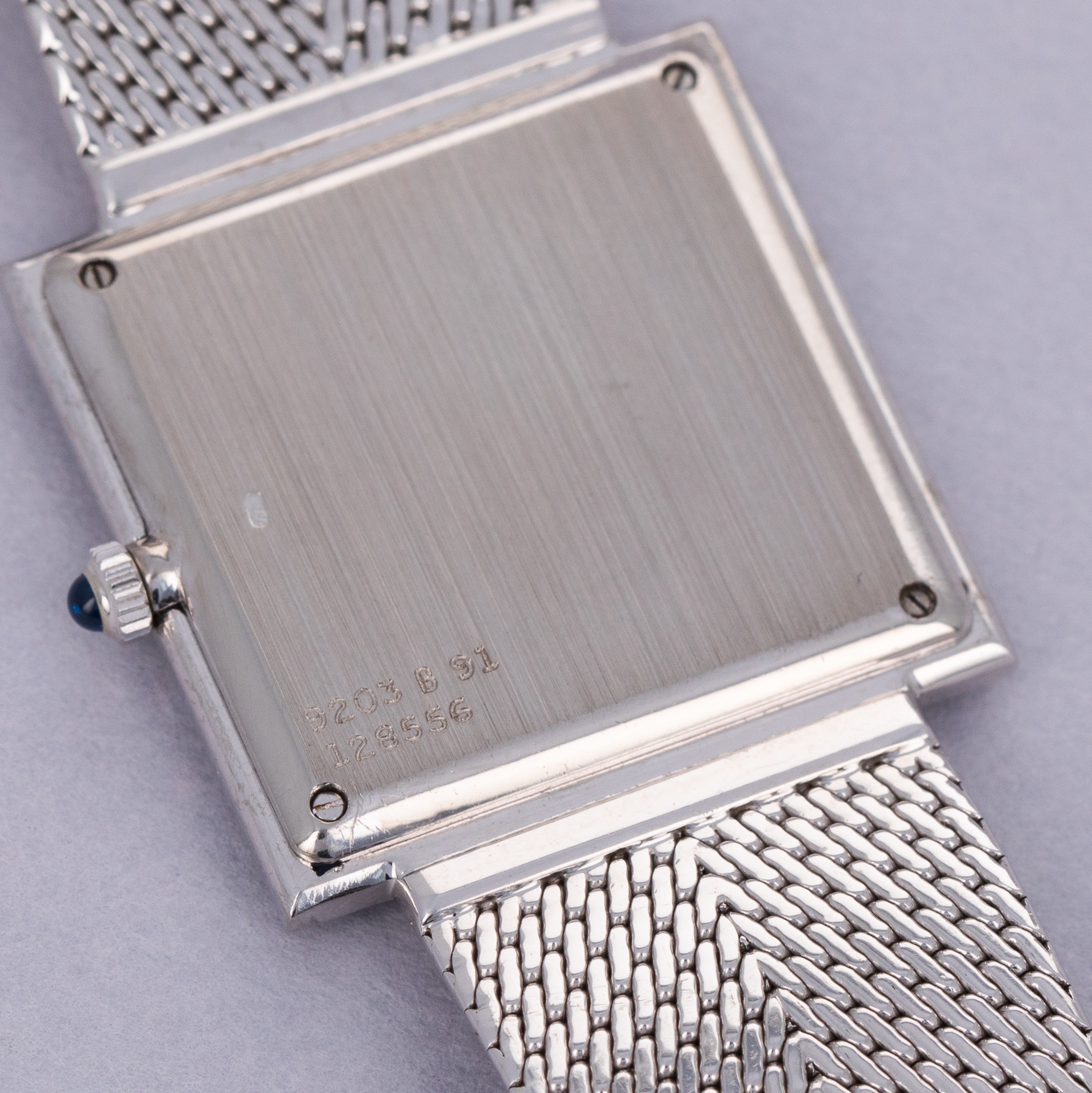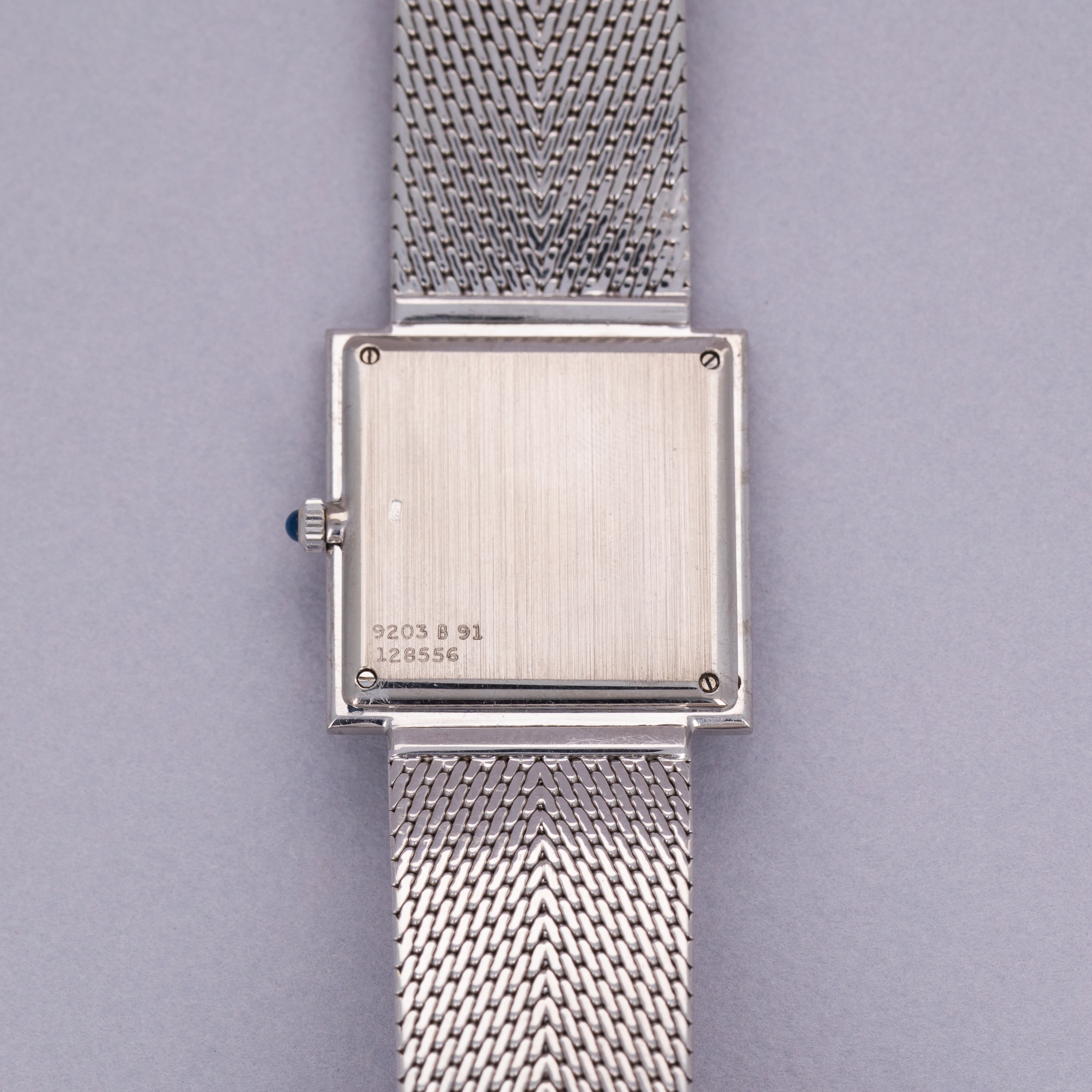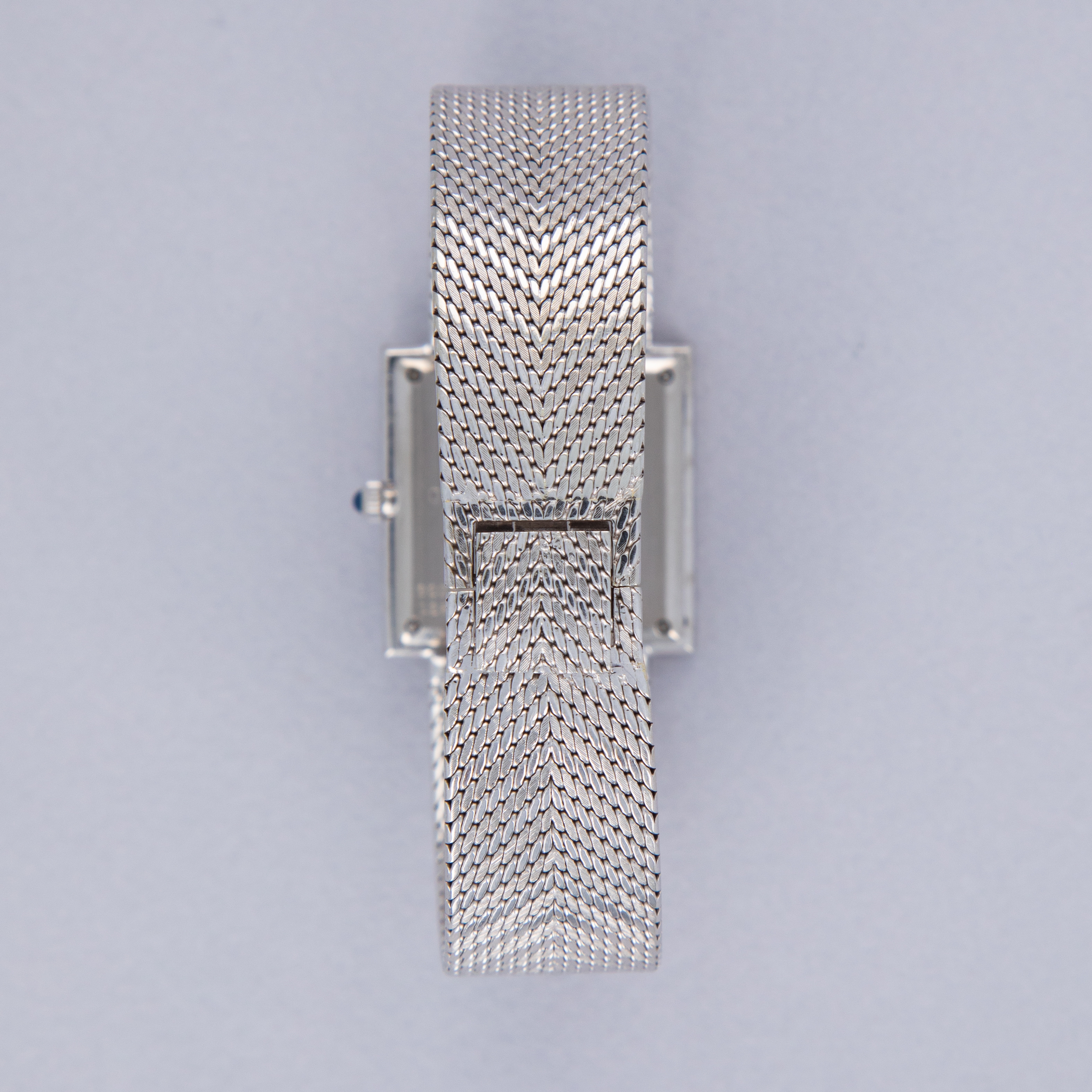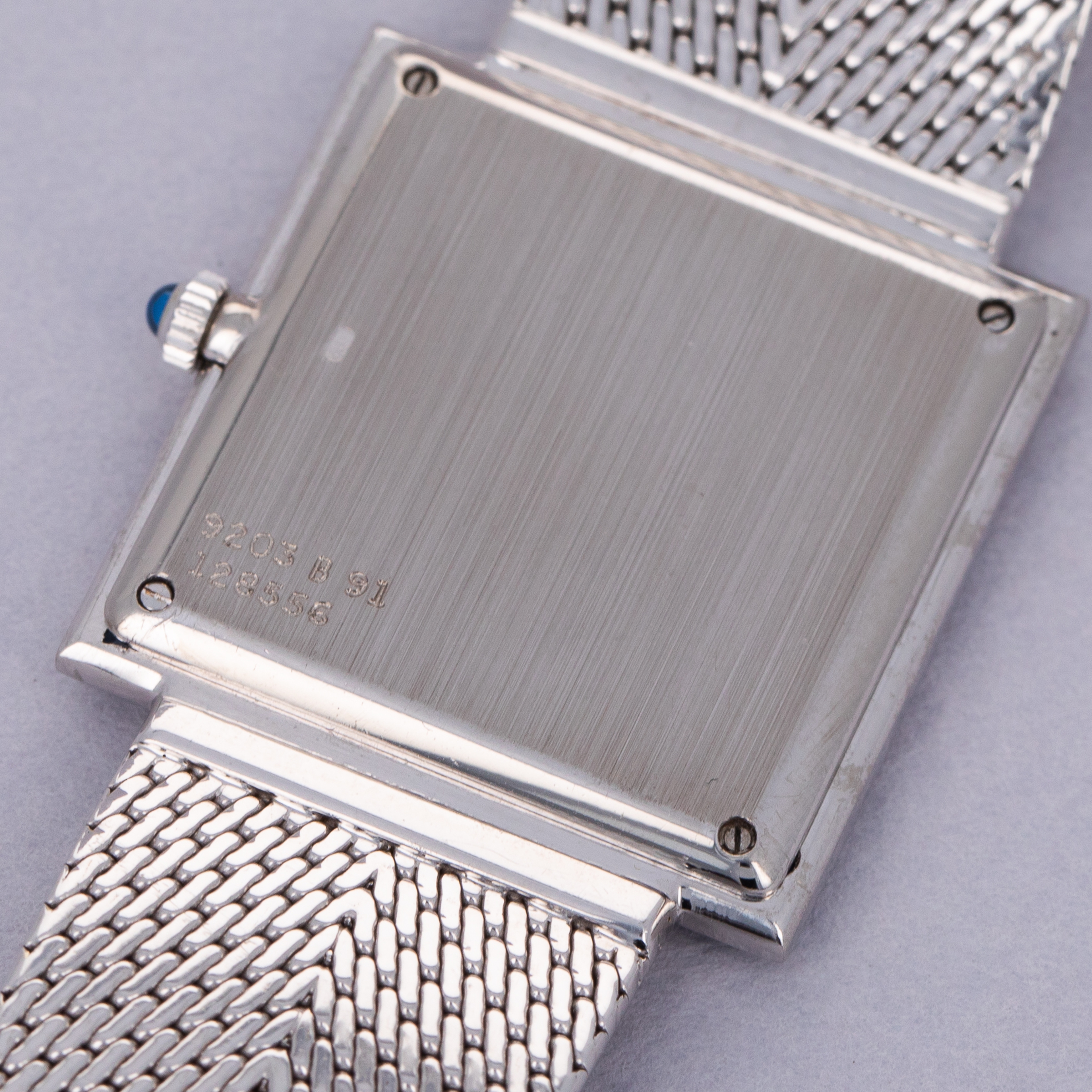 Founded in 1874 by a young 19-year-old in the village of La Côte-aux-Fées, Piaget was originally nothing but a means for Georges Piaget to earn some extra money as he worked on movements and watches during the winter. After decades of producing watches for other brands, it was not until 1943 that the watchmaker would begin to sign their own watches and develop as the famed watchmaker that they are today. From then on, Piaget began to experiment with ultra-thin watches and push both horological and design boundaries, which eventually led to the brand expanding into jewelry in 1959, perhaps the brand’s best-known avenue today. With their impeccable craftsmanship, audacious style, and dedication to the spectacular, Piaget’s timepieces and jewelry began to coalesce, resulting in timepieces much like the ref. 9203 that we have here. Measuring 25mm in diameter and hosting an incredibly intricate 18k white gold construction, this timepiece is a wonderful synthesis of Piaget’s distinctive exclusivity and rich horological aesthetic. Featuring an intricately woven 18kt white gold bracelet attached to its square-shaped 25mm case, this timepiece is extravagance at its very finest. Boasting gem-set bezel with two rows of diamonds and sapphires surrounding its silver dial, this timepiece’s design and execution is a further continuation of Piaget’s distinctive jeweler’s touch with its impeccable gem-setting craftsmanship and overall beauty.