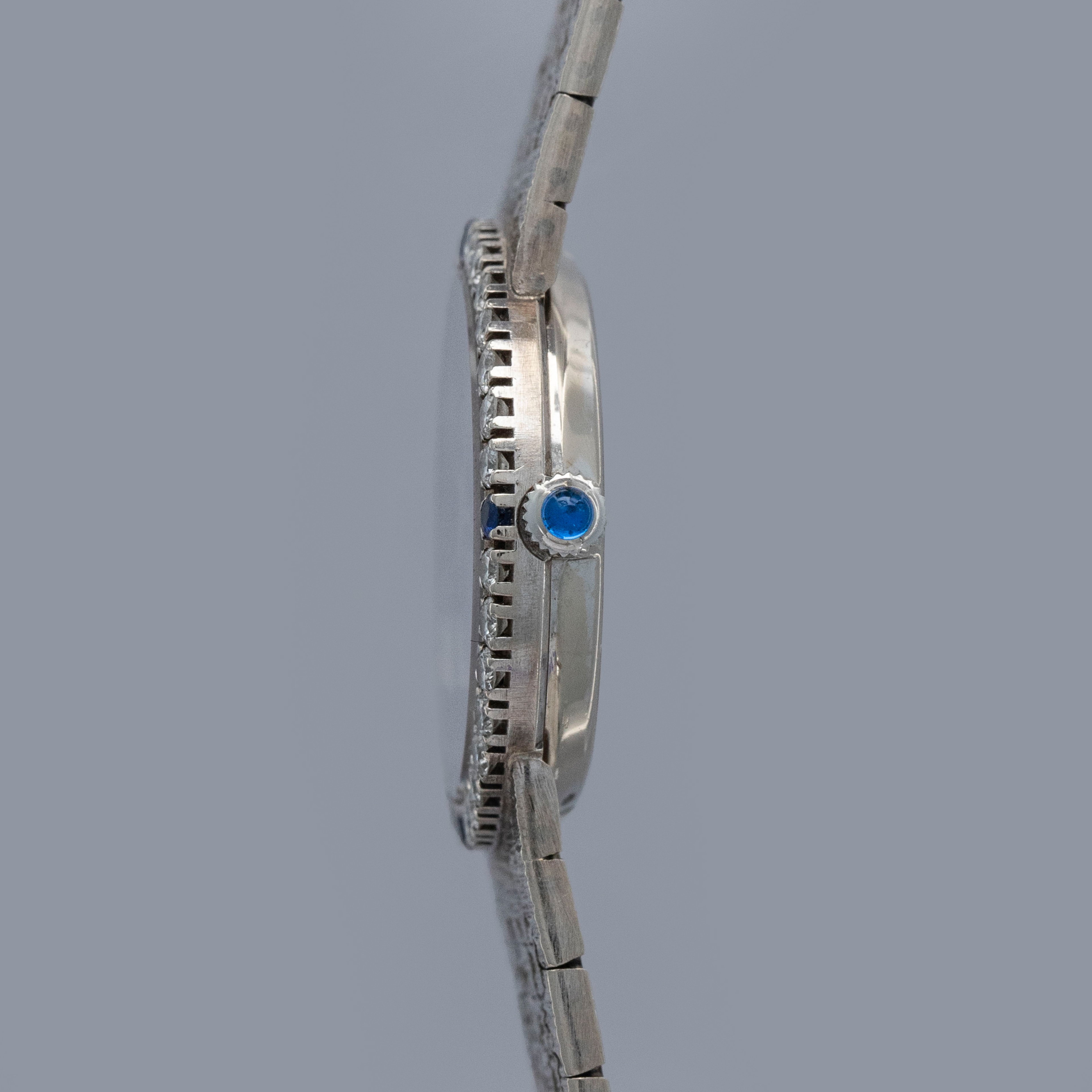 Working to contrast the 18kt white gold case that it is set within and match the blue sapphires set in its bezel, the ref. 9706's blue lapis lazuli stone dial produces a colorful aesthetic that is perfectly complemented by the diamonds that surround its bezel.