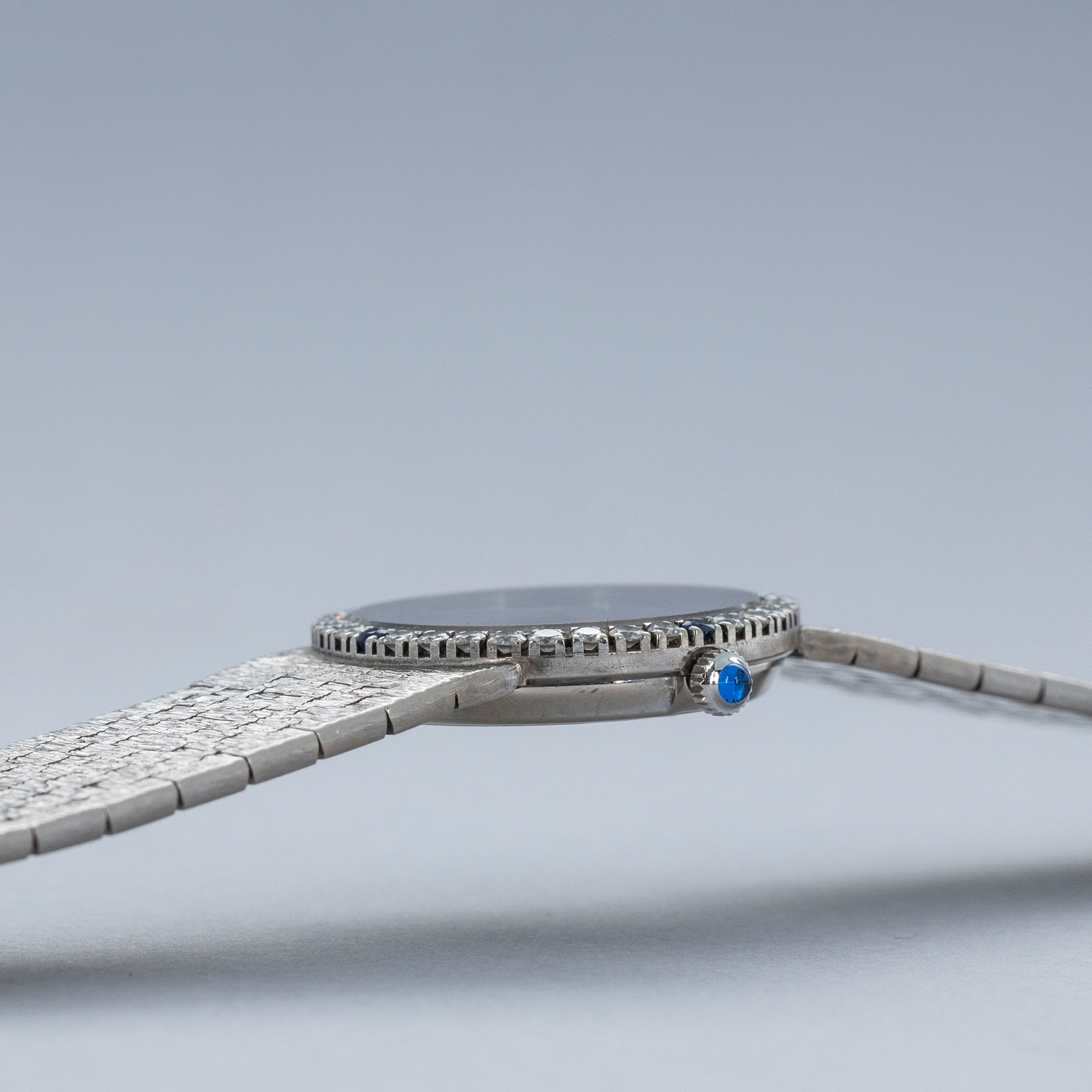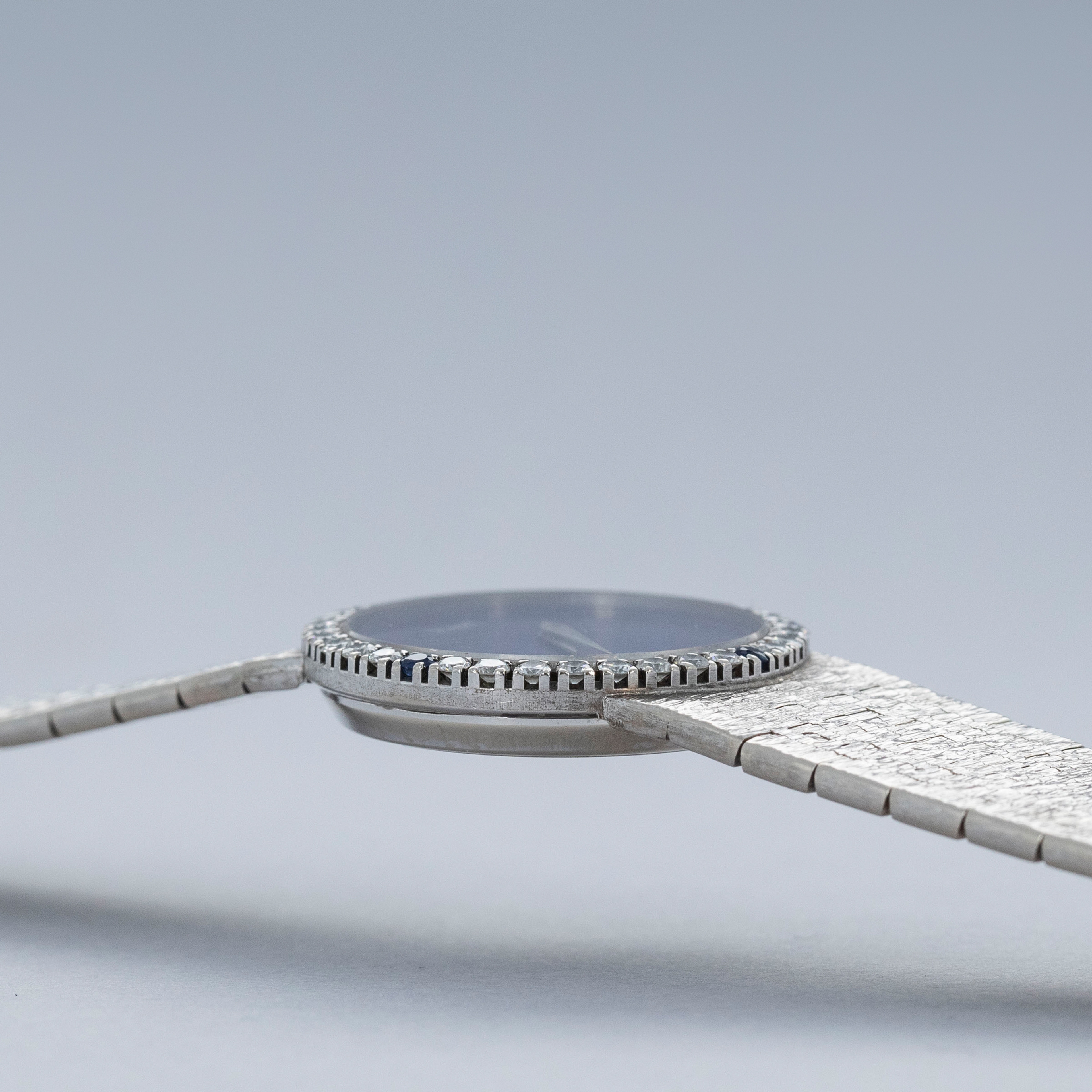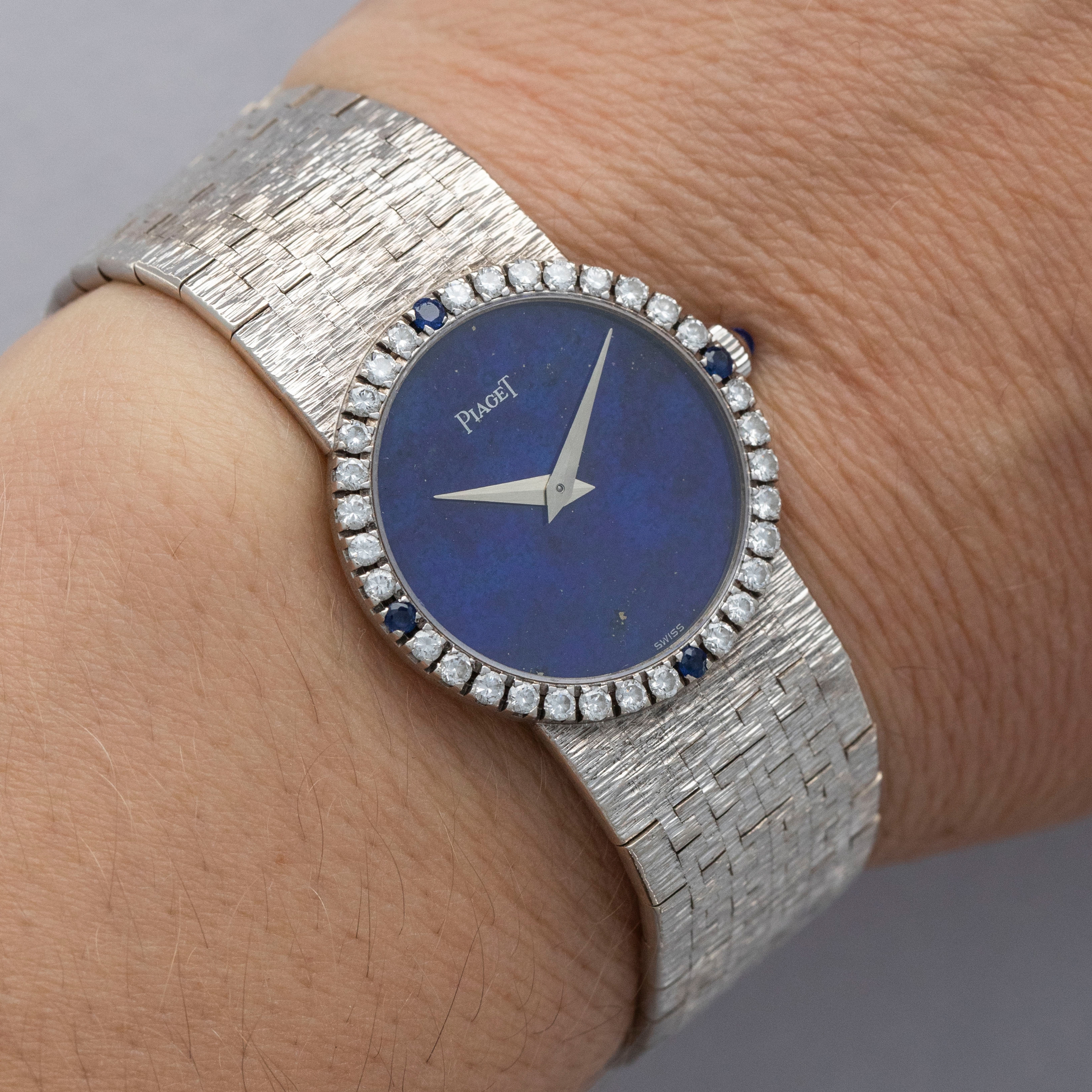 The watch is in overall excellent condition. The white gold case is well defined, with some scratches and nicks as expected for a watch of this vintage. The bezel is set with diamonds and sapphires, all of which are in excellent condition along with their settings. The case back has light scratches and features very crisp engravings and a clear hallmark. The lapis dial is excellent, with no cracks, and the hands are very clean. The integrated bracelet shows light marks and is fitted with a Piaget-signed clasp. The bracelet has 26 links and fits an approximately 5½” wrist.