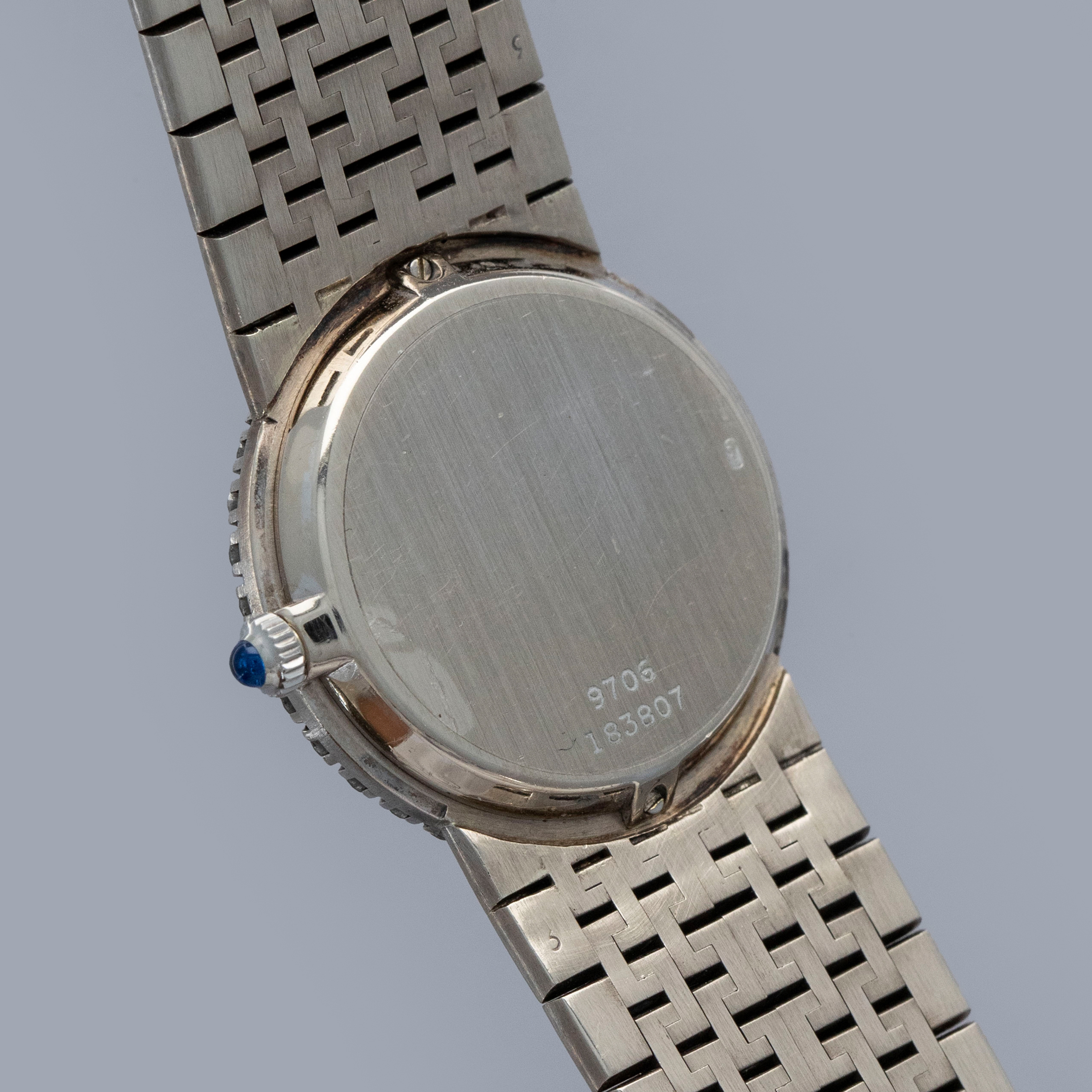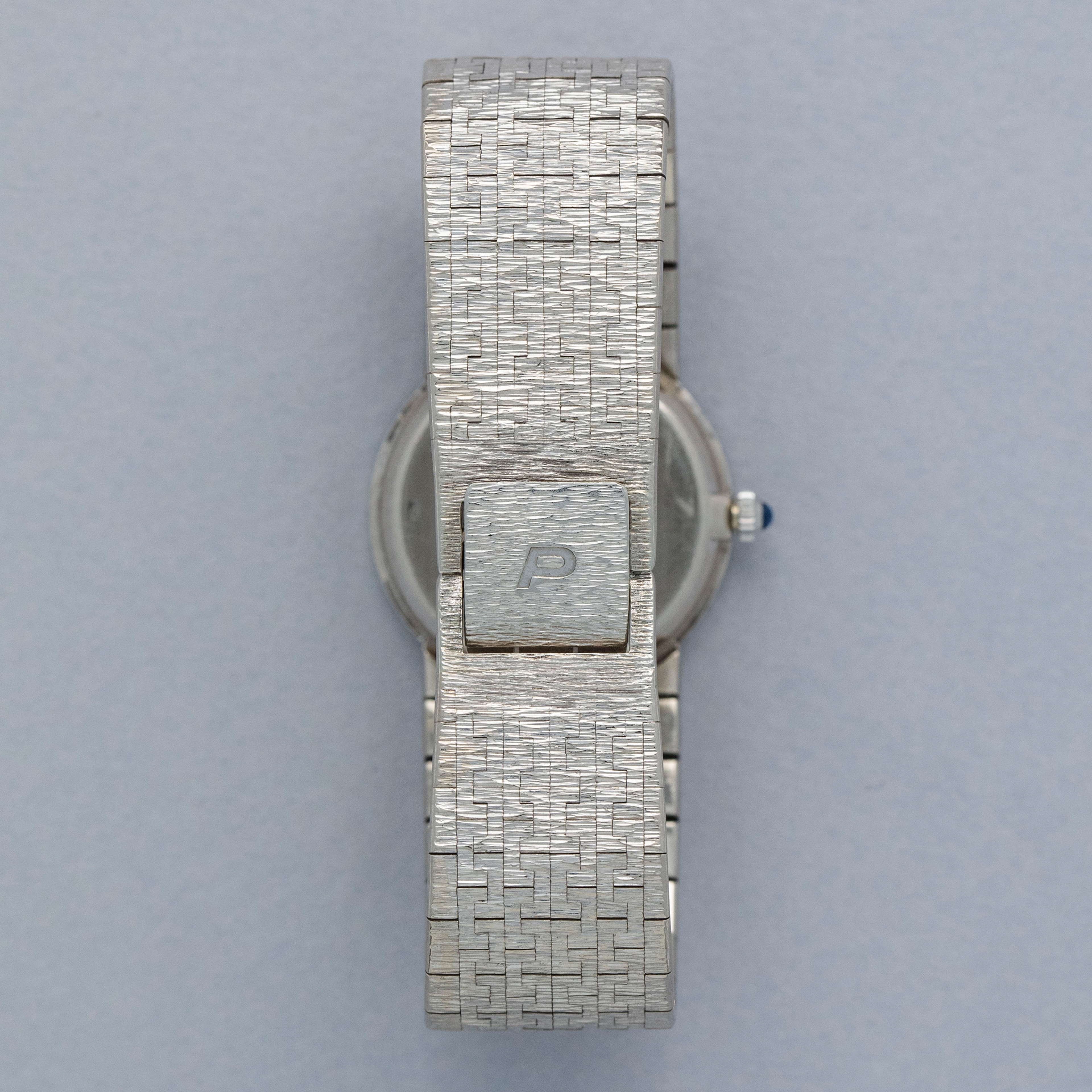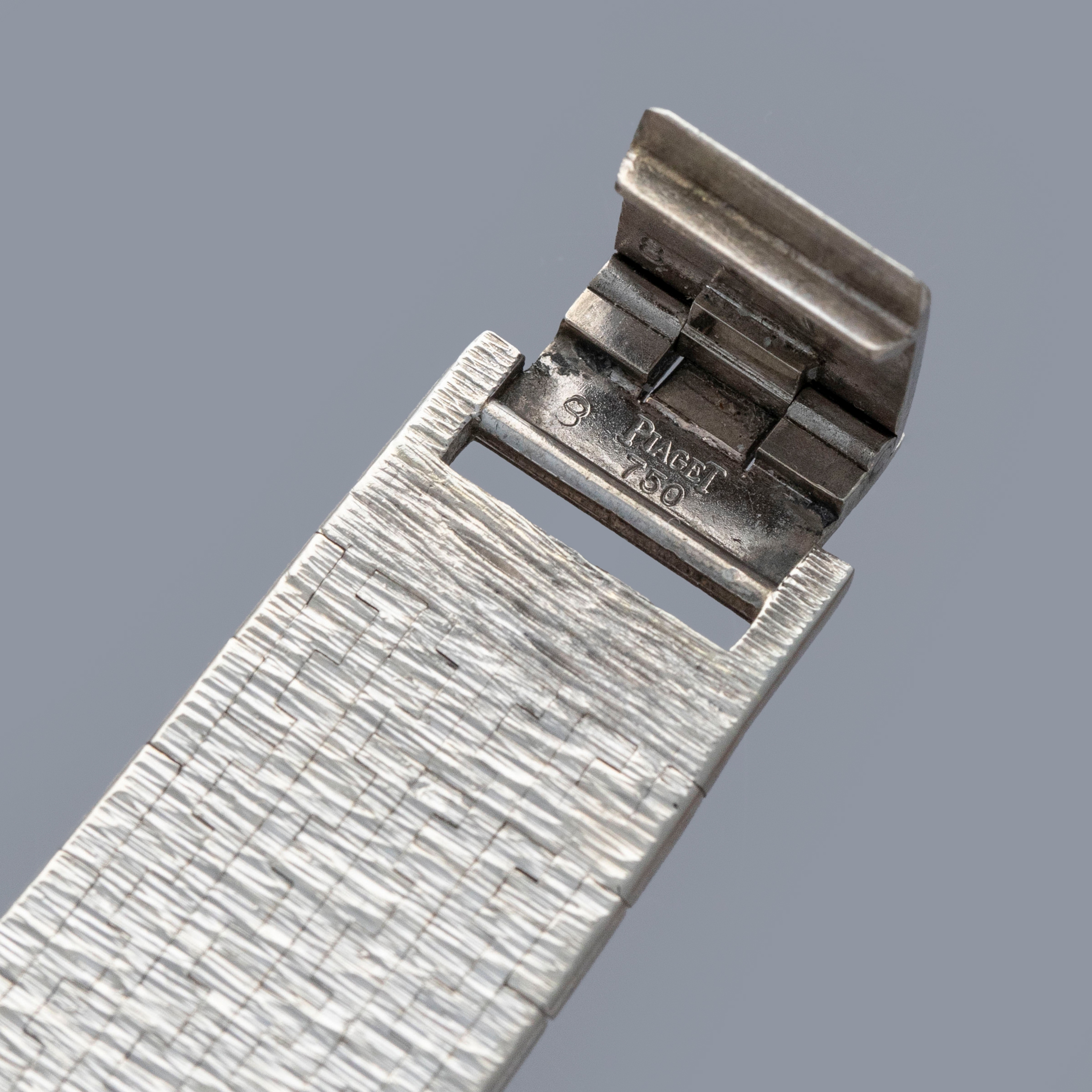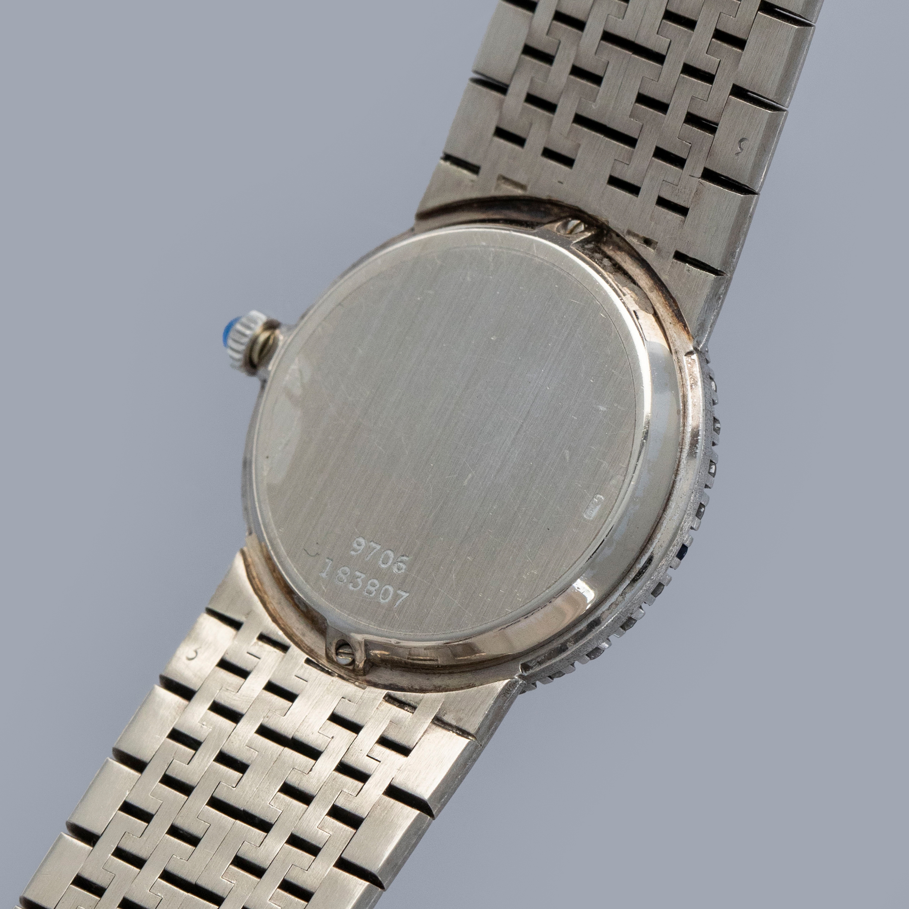 The watch is in overall excellent condition. The white gold case is well defined, with some scratches and nicks as expected for a watch of this vintage. The bezel is set with diamonds and sapphires, all of which are in excellent condition along with their settings. The case back has light scratches and features very crisp engravings and a clear hallmark. The lapis dial is excellent, with no cracks, and the hands are very clean. The integrated bracelet shows light marks and is fitted with a Piaget-signed clasp. The bracelet has 26 links and fits an approximately 5½” wrist.