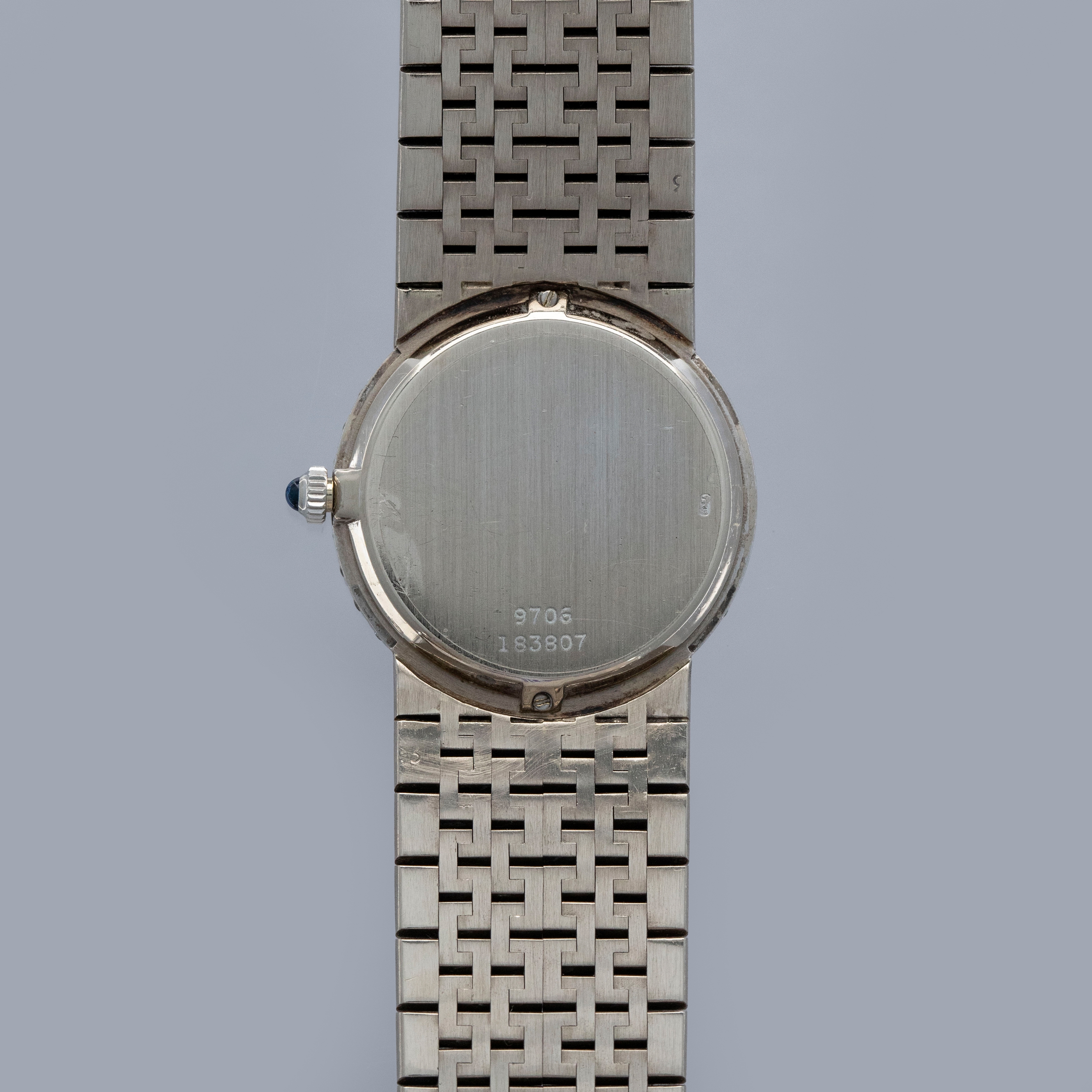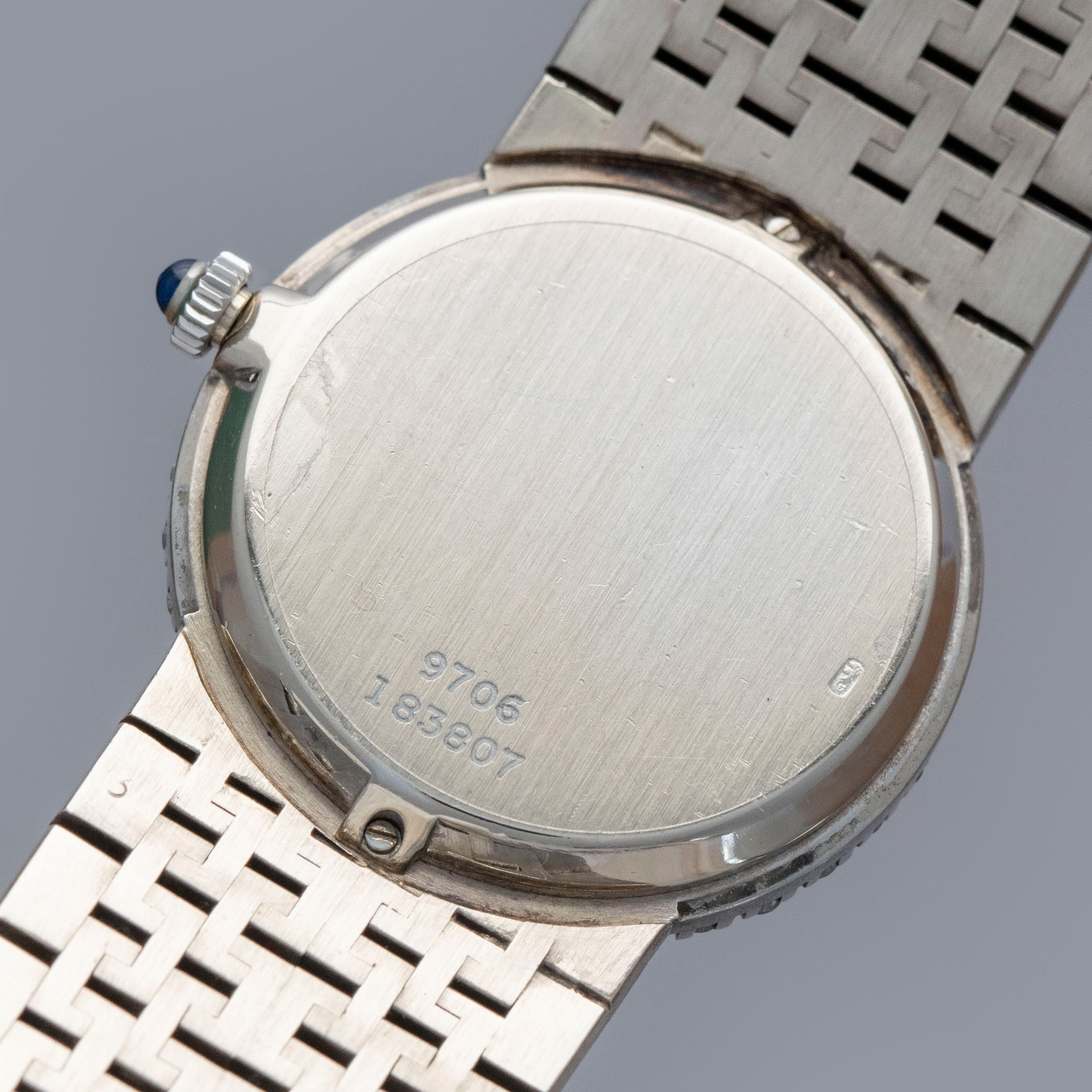 Founded in 1874 by a young 19-year-old in the village of La Côte-aux-Fées, Piaget was originally nothing but a means for Georges Piaget to earn some extra money as he worked on movements and watches during the winter. After decades of producing watches for other brands, it was not until 1943 that the watchmaker would begin to sign their own watches and develop as the famed watchmaker that they are today. From then on, Piaget began to experiment with ultra-thin watches and push both horological and design boundaries, which eventually led to the brand expanding into jewelry in 1959, perhaps the brand’s best-known avenue today. With their impeccable craftsmanship, audacious style, and dedication to the spectacular, Piaget’s timepieces and jewelry began to coalesce, resulting in timepieces much like the ref. 9706 that we have here. Measuring 30mm wide and 24mm tall and hosting an incredibly intricate 18k white gold construction and diamond-set case, this timepiece is a wonderful synthesis of Piaget’s distinctive exclusivity and rich horological aesthetic. Featuring an 18kt white gold brick bracelet attached to its oval-shaped case, this timepiece is extravagance at its very finest, especially with its diamond and sapphire-set bezel. Boasting a wonderful bark texture design across its bracelet and a stunning blue lapis lazuli dial, this timepiece is a further continuation of Piaget’s distinctive jeweler’s touch with its impeccable craftsmanship and overall beauty.