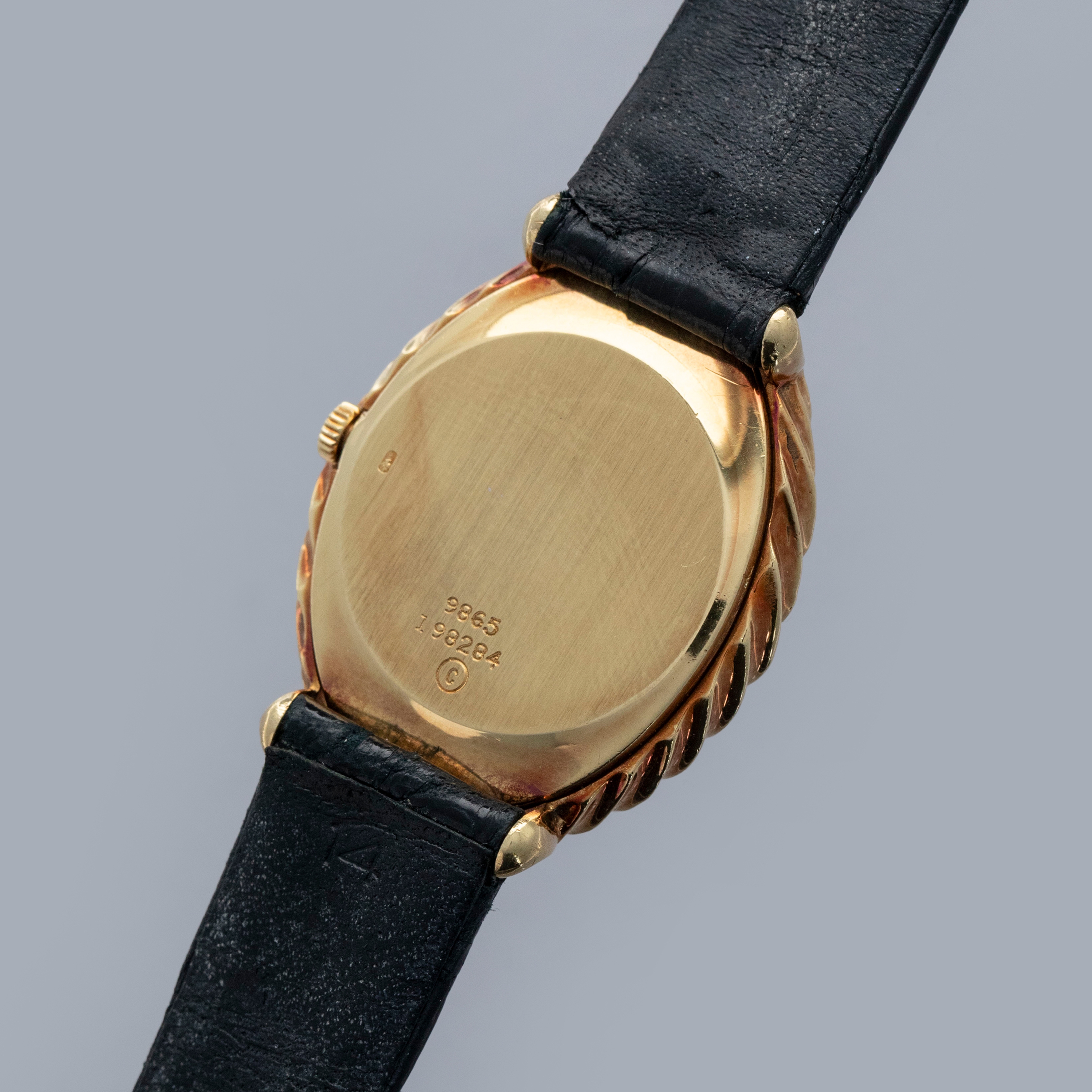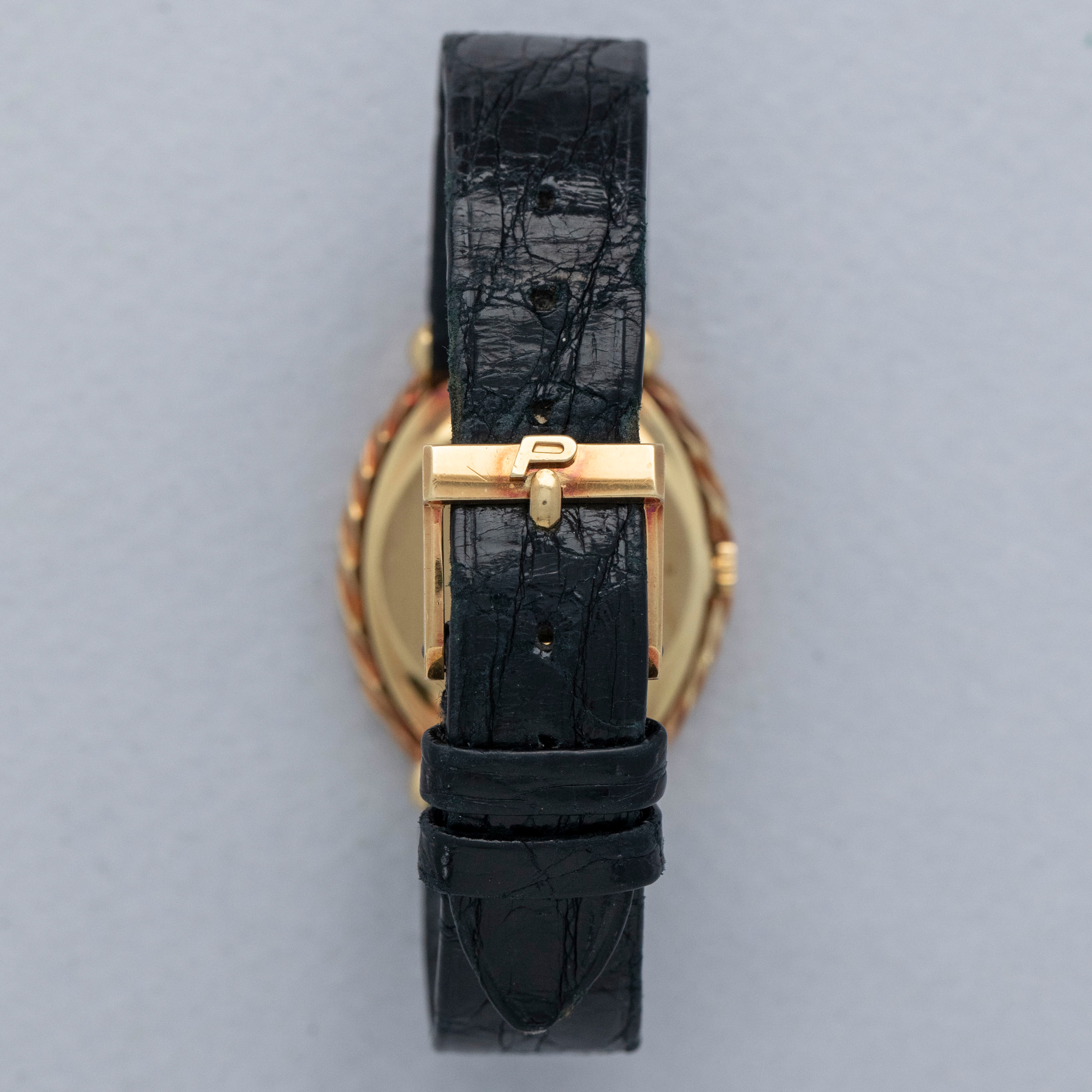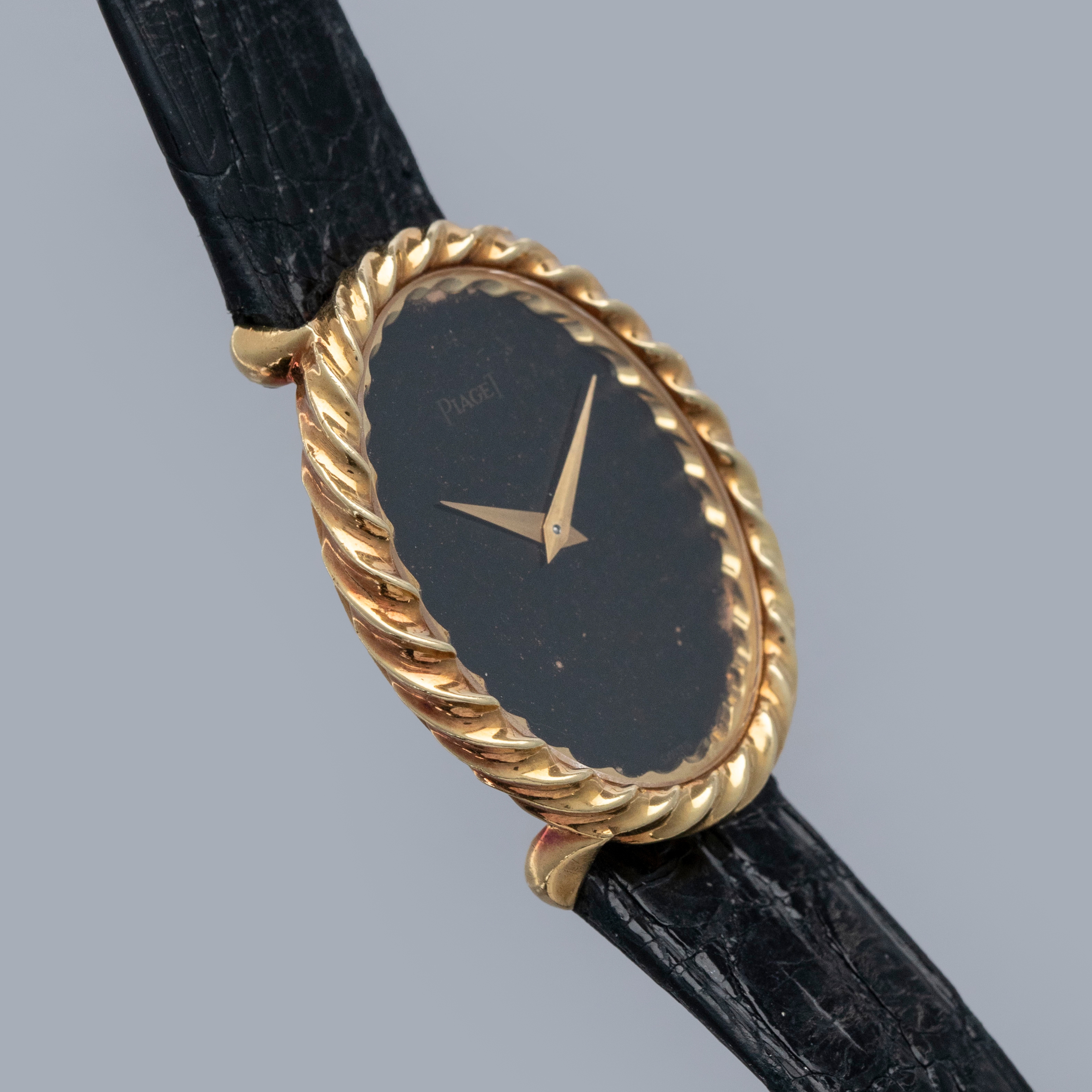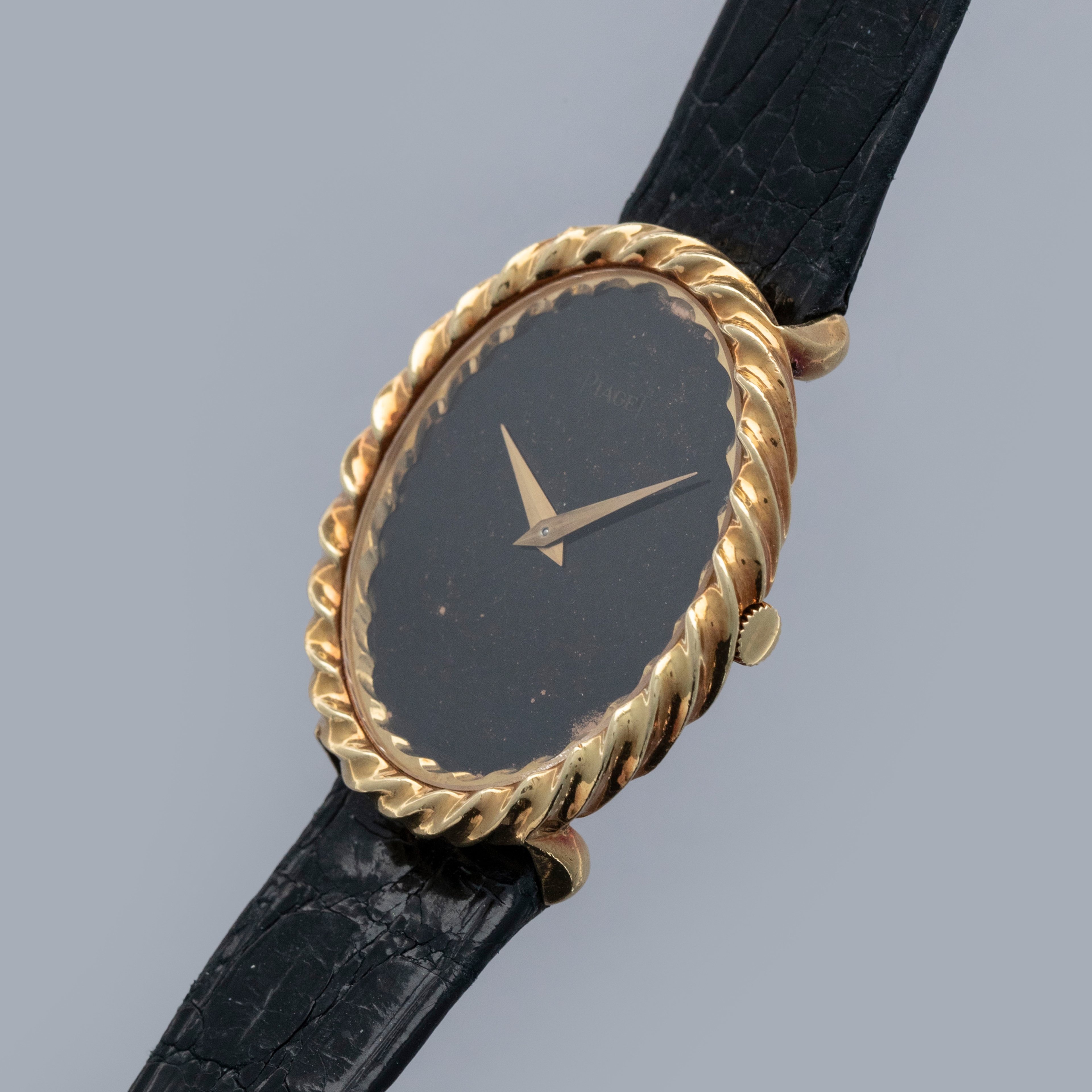 The watch is in overall very good condition. The yellow gold case remains well defined, with light scratches and marks consistent with a watch of this vintage. The case back retains its vertical brushed finish and features crisp engravings and a clear hallmark. The black onyx dial shows some delamination in places, and the PIAGET signature has faded over time. The watch is fitted with a black alligator strap and a Piaget-signed yellow gold buckle, both in excellent condition.