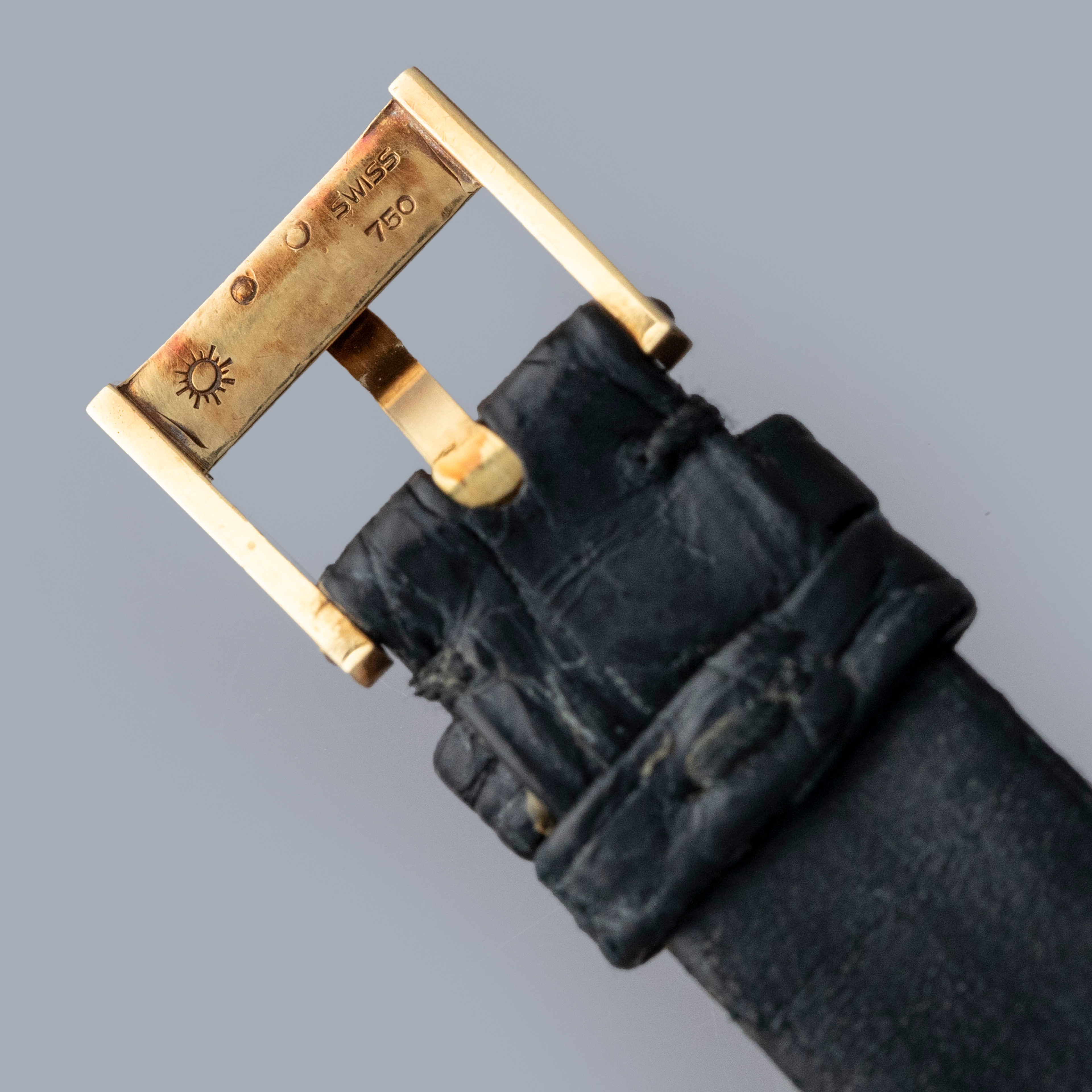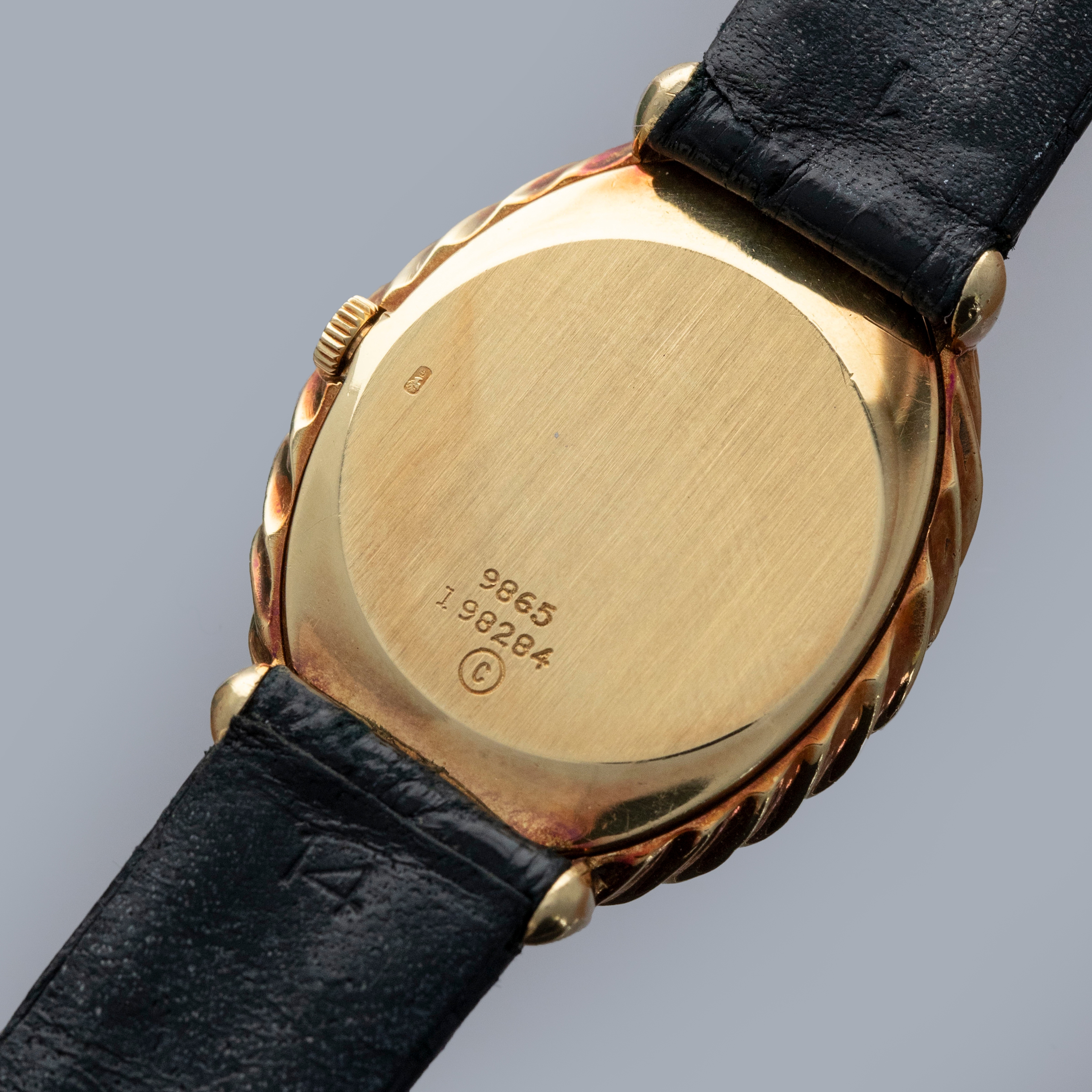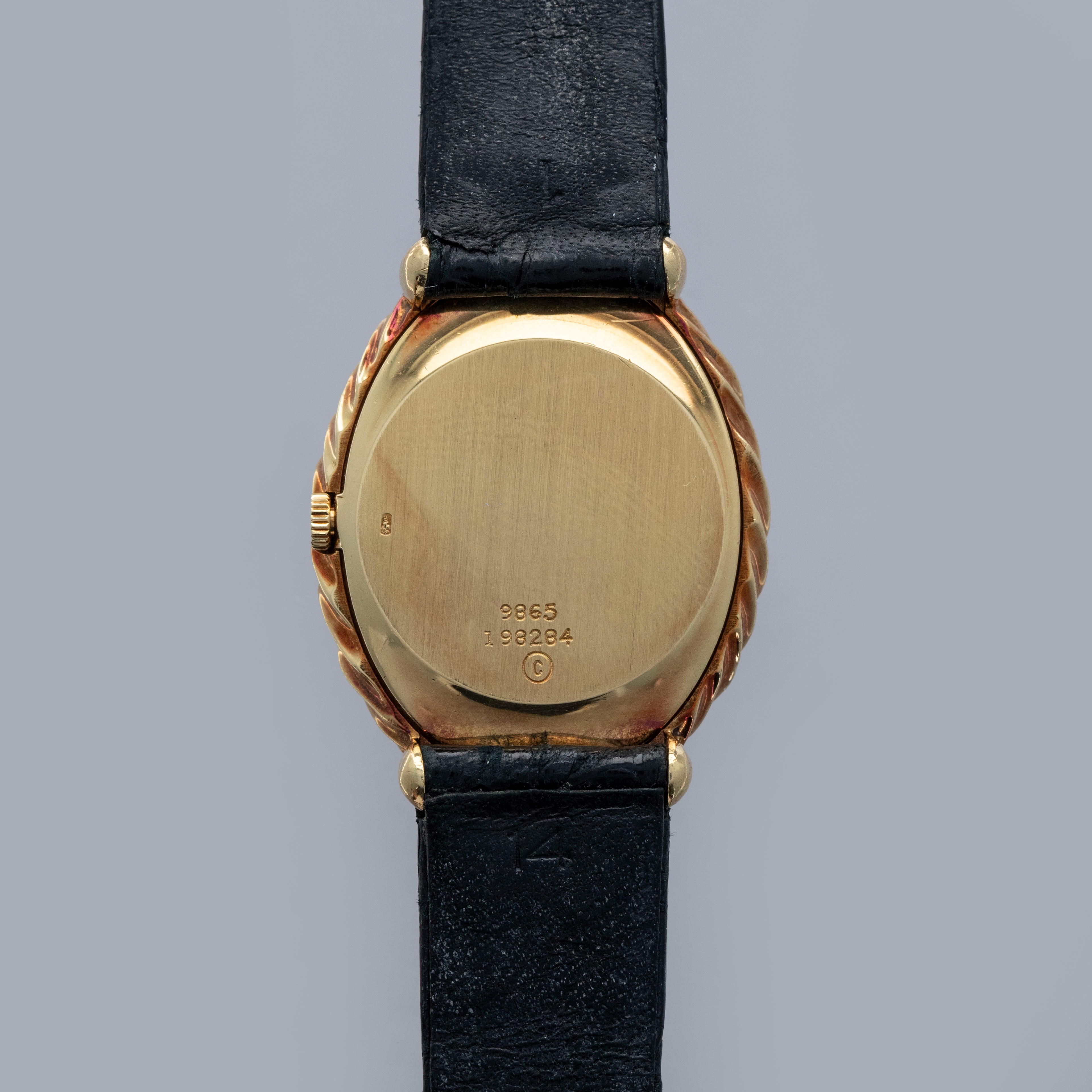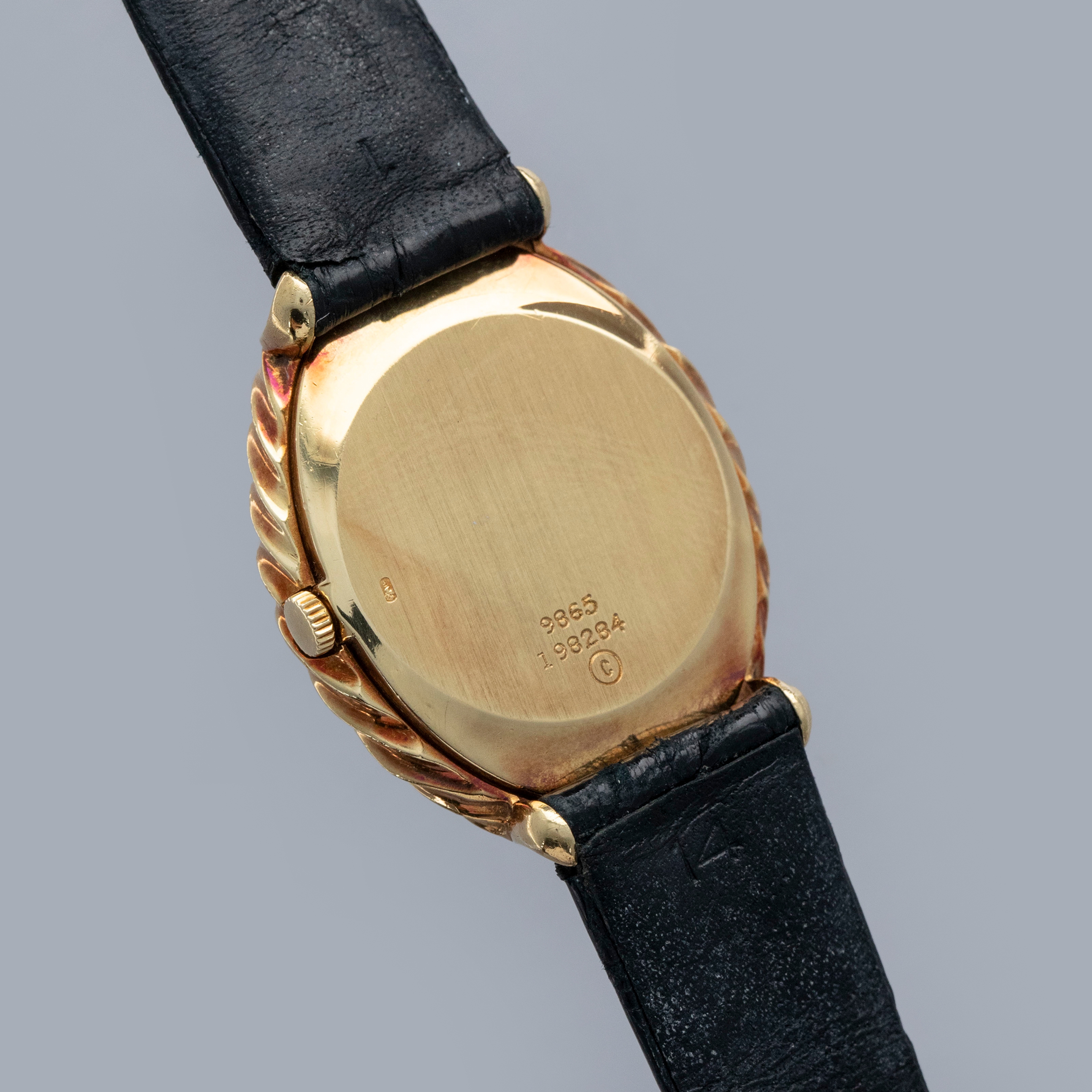 The watch is in overall very good condition. The yellow gold case remains well defined, with light scratches and marks consistent with a watch of this vintage. The case back retains its vertical brushed finish and features crisp engravings and a clear hallmark. The black onyx dial shows some delamination in places, and the PIAGET signature has faded over time. The watch is fitted with a black alligator strap and a Piaget-signed yellow gold buckle, both in excellent condition.