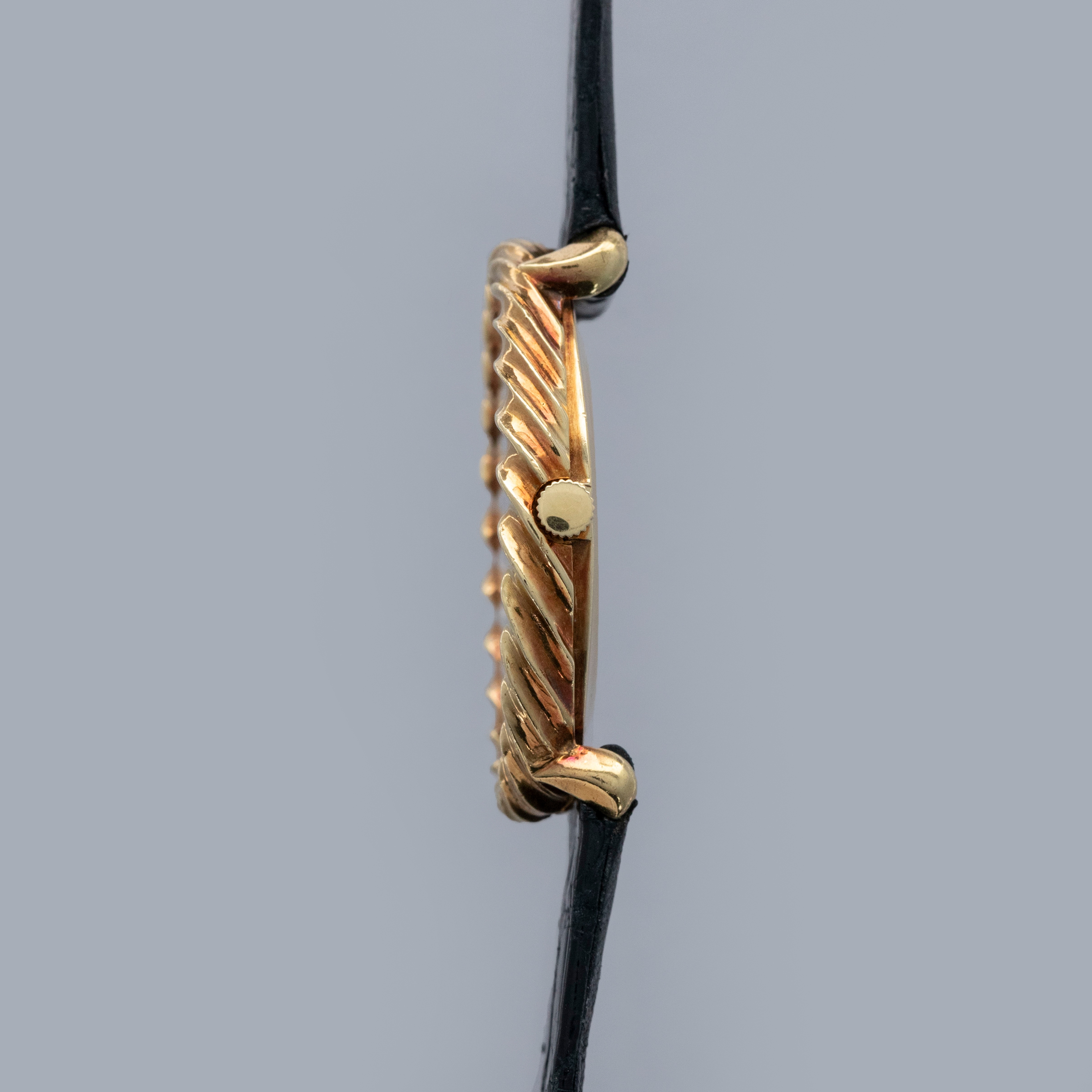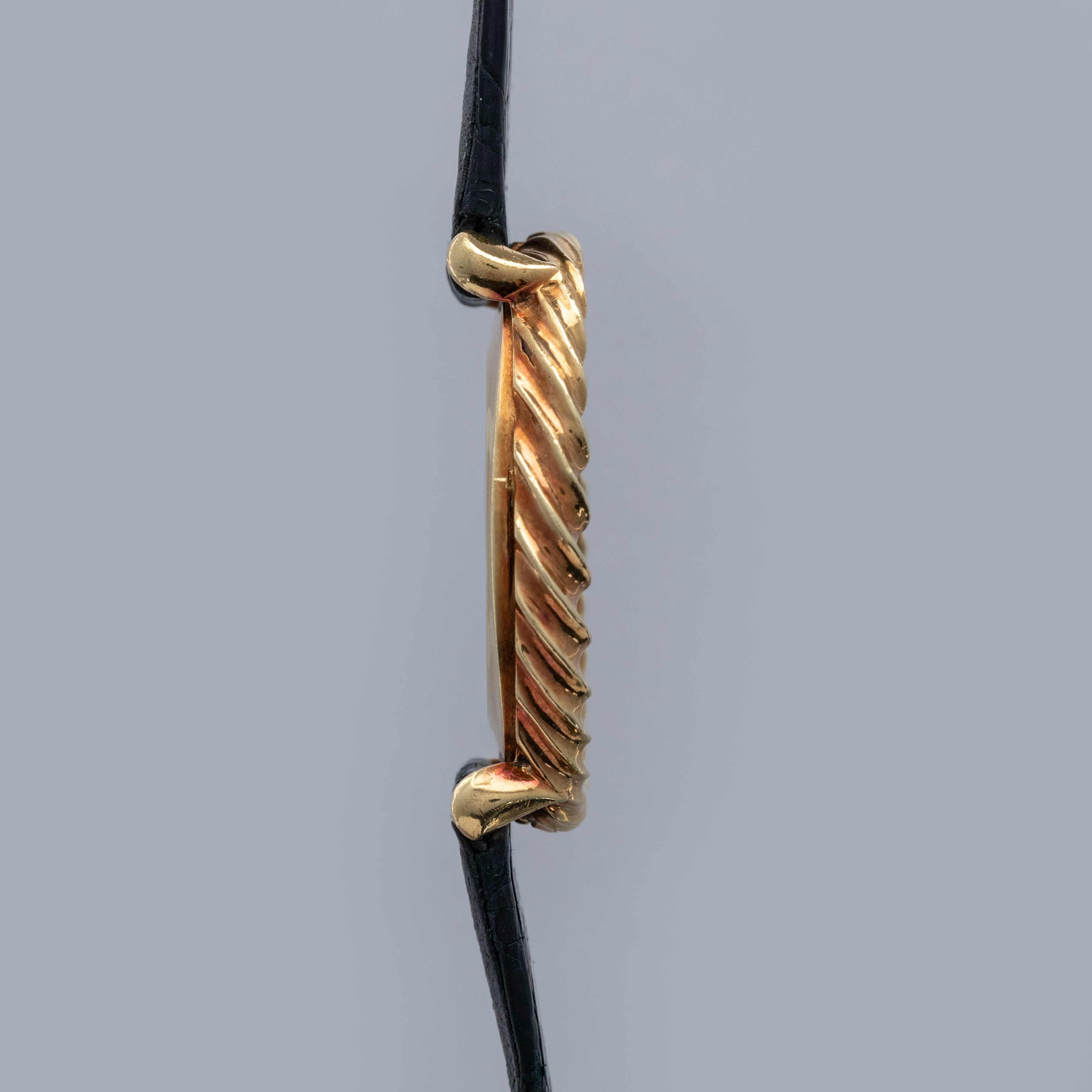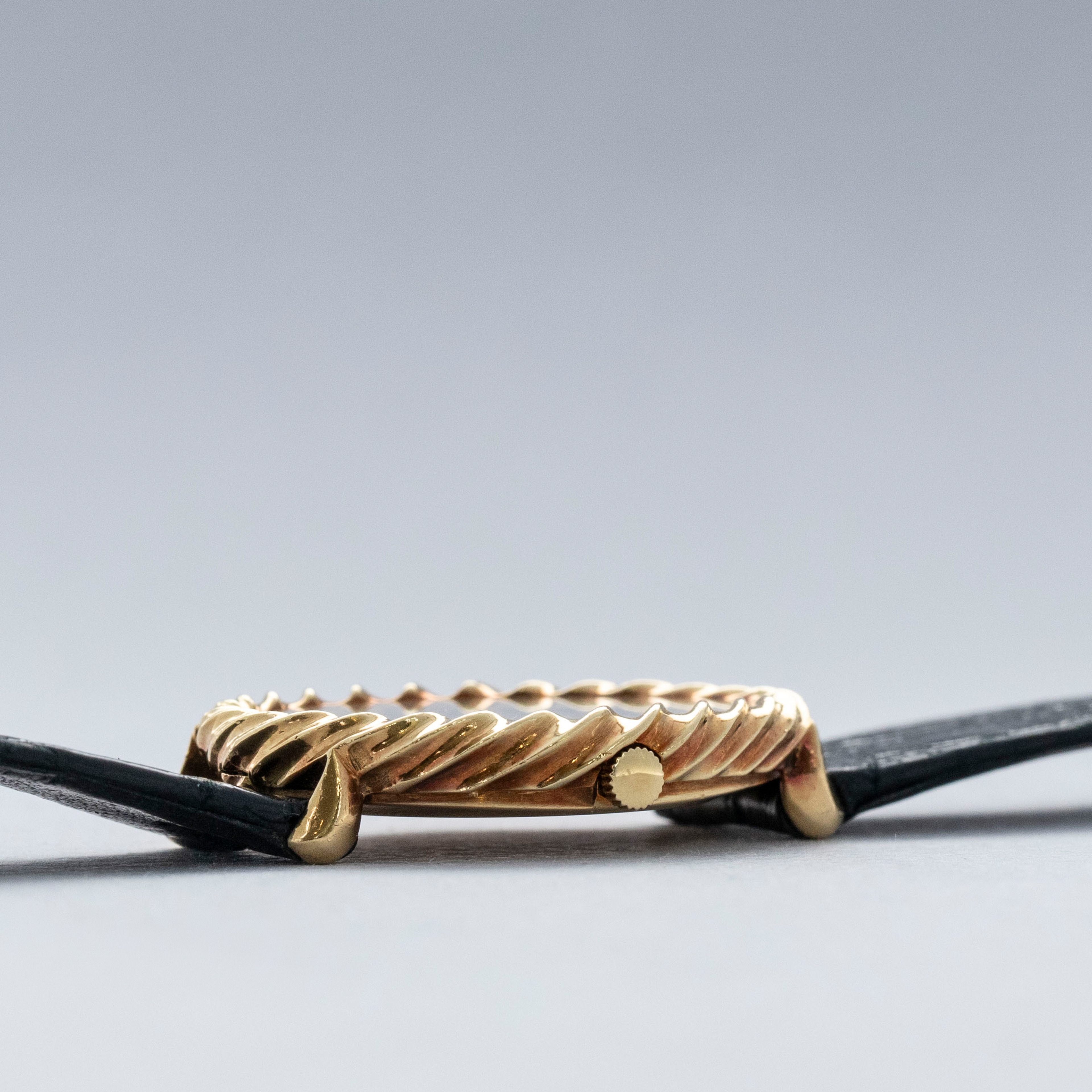 A lesson in classy extravagance, the ref. 9865's 18kt yellow gold case features a twisted rope-like bezel that wonderfully complements its unique black onyx stone dial.