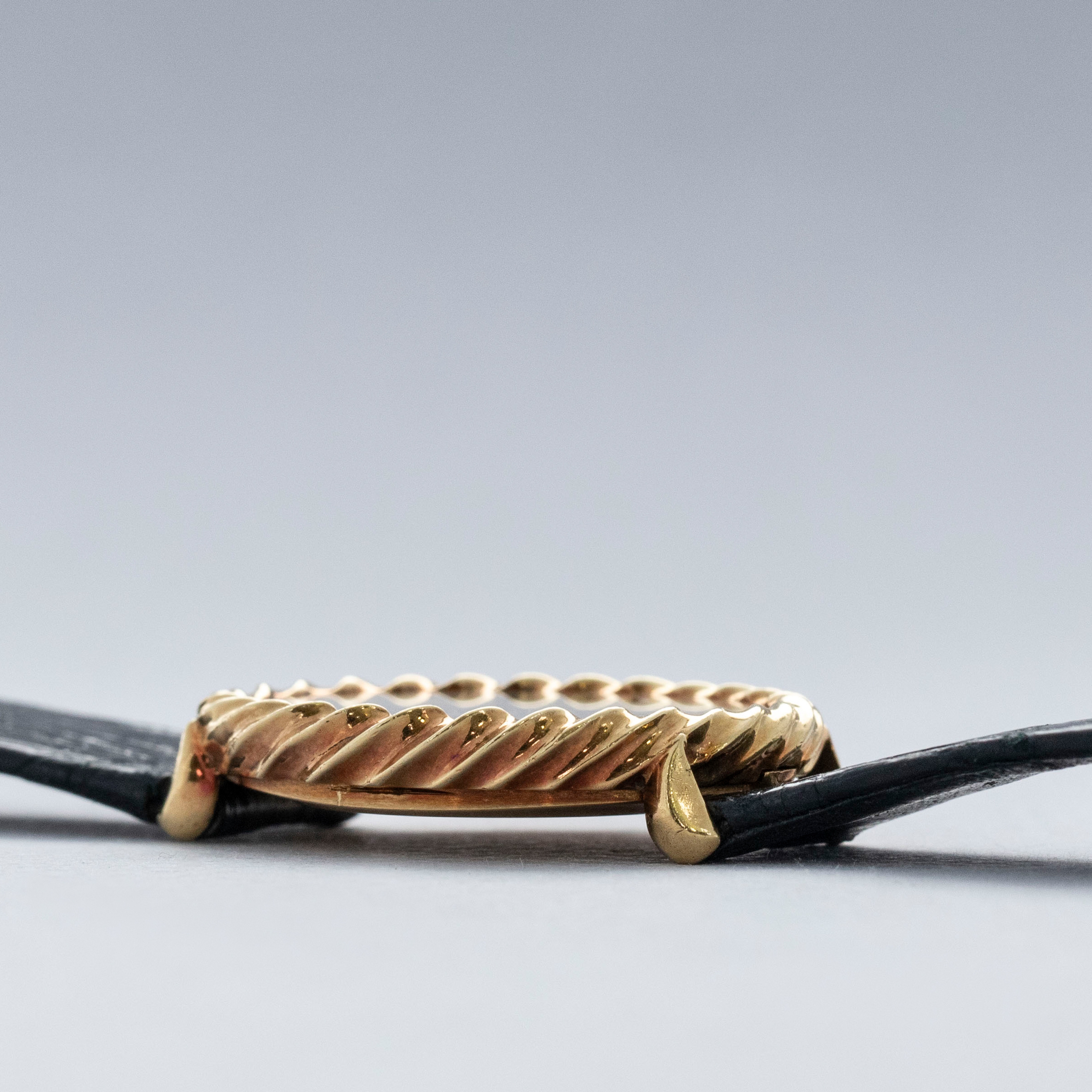 Founded in 1874 by a young 19-year-old in the village of La Côte-aux-Fées, Piaget was originally nothing but a means for Georges Piaget to earn some extra money as he worked on movements and watches during the winter. After decades of producing watches for other brands, it was not until 1943 that the watchmaker would begin to sign their own watches and develop as the famed watchmaker that they are today. From then on, Piaget began to experiment with ultra-thin watches and push both horological and design boundaries, which eventually led to the brand expanding into jewelry in 1959, perhaps the brand’s best-known avenue today. With their impeccable craftsmanship, audacious style, and dedication to the spectacular, Piaget’s timepieces and jewelry began to coalesce, resulting in timepieces much like the ref. 9865 that we have here. Measuring 26mm wide and 32mm tall and hosting an incredibly intricate 18kt yellow gold construction, this timepiece is a wonderful synthesis of Piaget’s distinctive exclusivity and rich horological aesthetic. Boasting a braided rope-like bezel atop its case and an understated black onyx stone dial, this timepiece is a further continuation of Piaget’s distinctive jeweler’s touch with its impeccable craftsmanship and overall beauty.