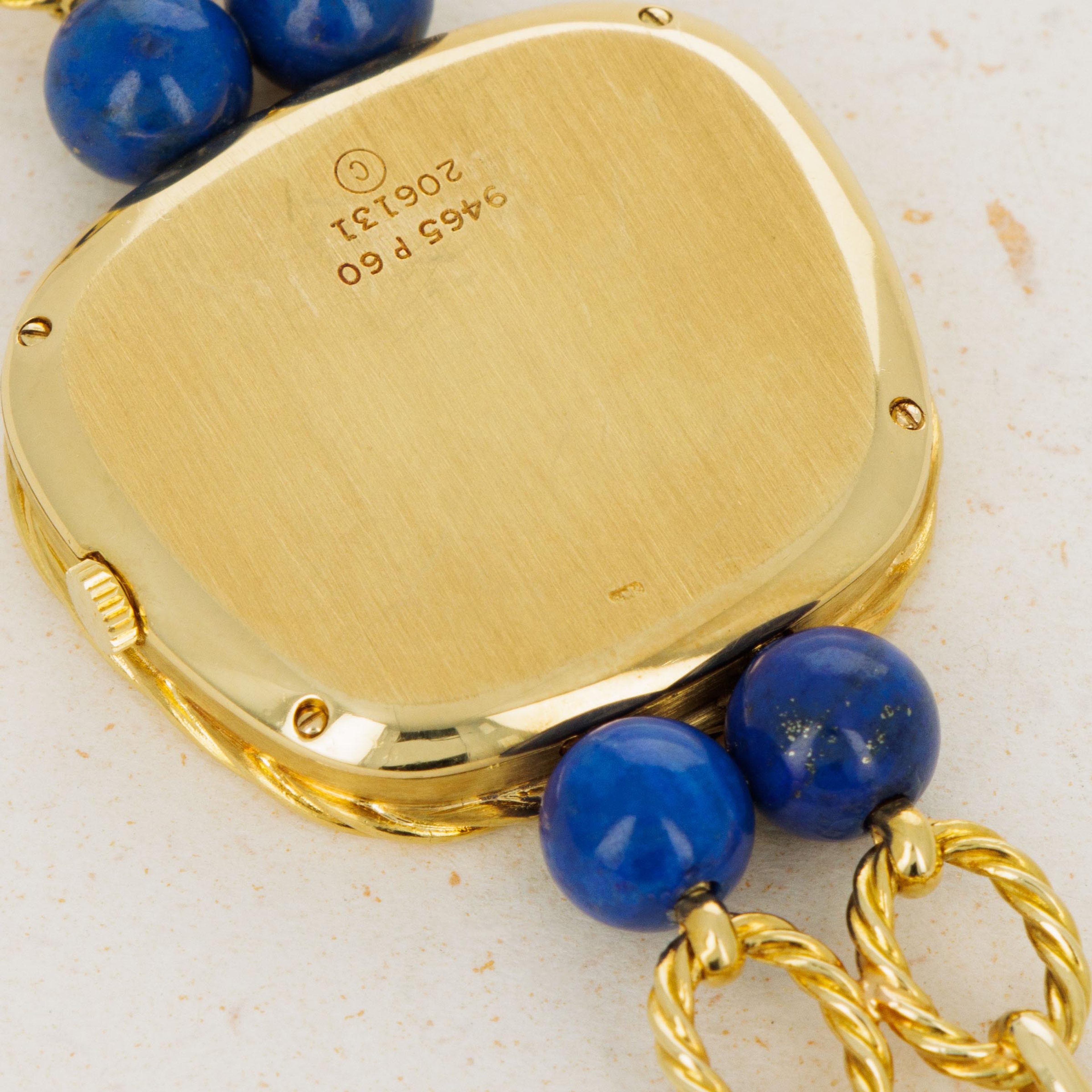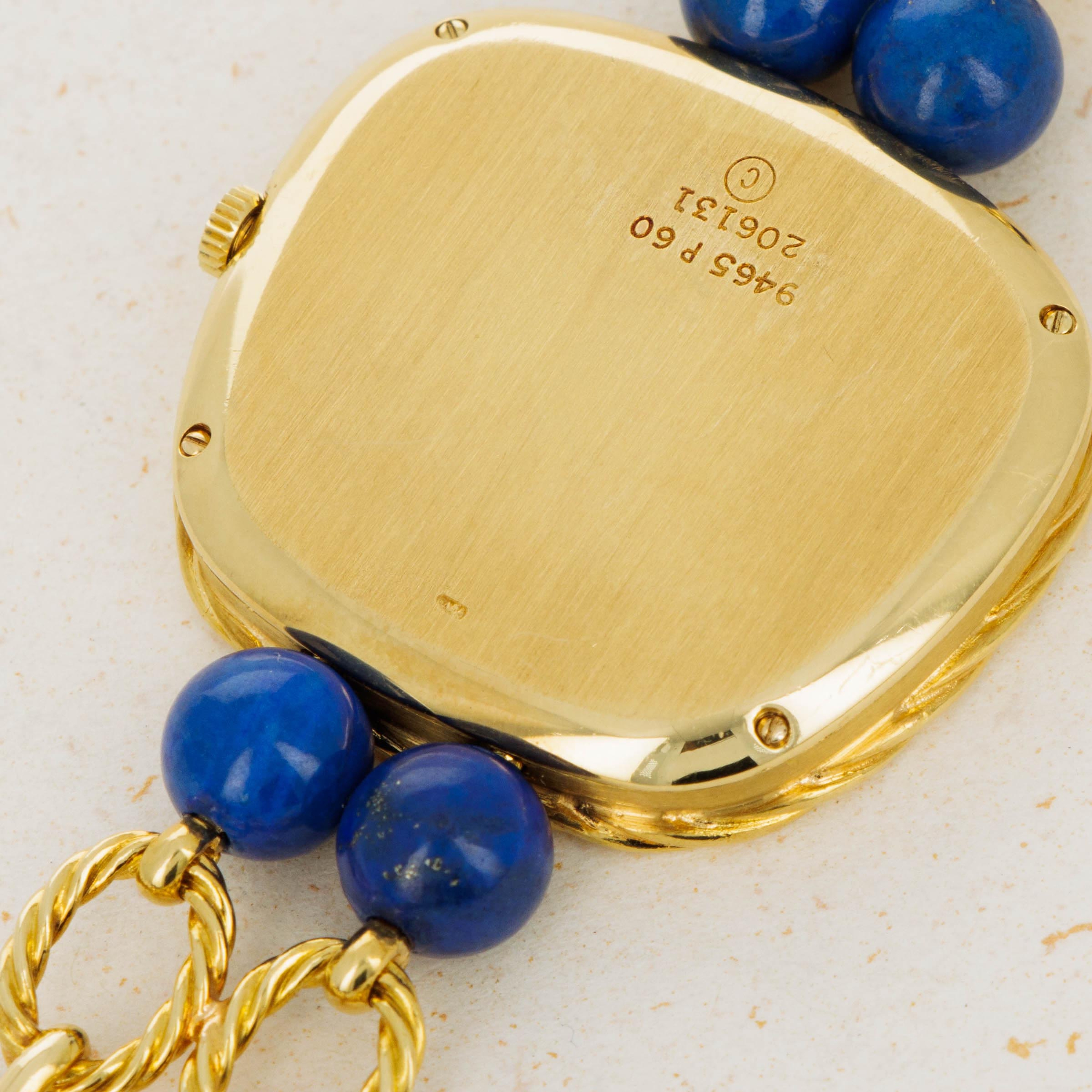 Piaget, renowned as the jeweler of watchmaking, once proclaimed, "There is only one thing as breathtaking as a Piaget watch. A Piaget Pendant." In the vibrant and playful era of the 1970s, Piaget was the brand of choice for chic and sophisticated jet-setters. With their expertise in crafting ultra-thin mechanical movements, Piaget possessed a unique skill set that allowed them to integrate precious hard stones into their creations while maintaining the timepieces' slim and well-proportioned profiles. This was the time when iconic figures like Dalí, Warhol, Arman, Hans Erni, Liz Taylor, Jackie Kennedy, Marisa Berenson, and Ursula Andress proudly adorned themselves with Piaget masterpieces. The Piaget Pendant Watch ref. 9465P60 stands as a remarkable embodiment of Piaget's extravagance. This pendant watch, showcasing a bright blue Lapis Lazuli dial, offers a versatile elegance. With one exquisite piece of jewelry providing a unique and unforgettable way of being enjoyed, it effortlessly captures the allure of the jet-set era while possessing a timeless appeal destined to captivate generations to come. Adorned with an 18k yellow gold chain embellished with Lapis Lazuli beads that match its captivating Lapis Lazuli dial, the Piaget 9465P60 is a testament to craftsmanship, artistry, enduring beauty and Piaget’s ability to combine their talents as a watchmaker and jeweler to create something truly special.
