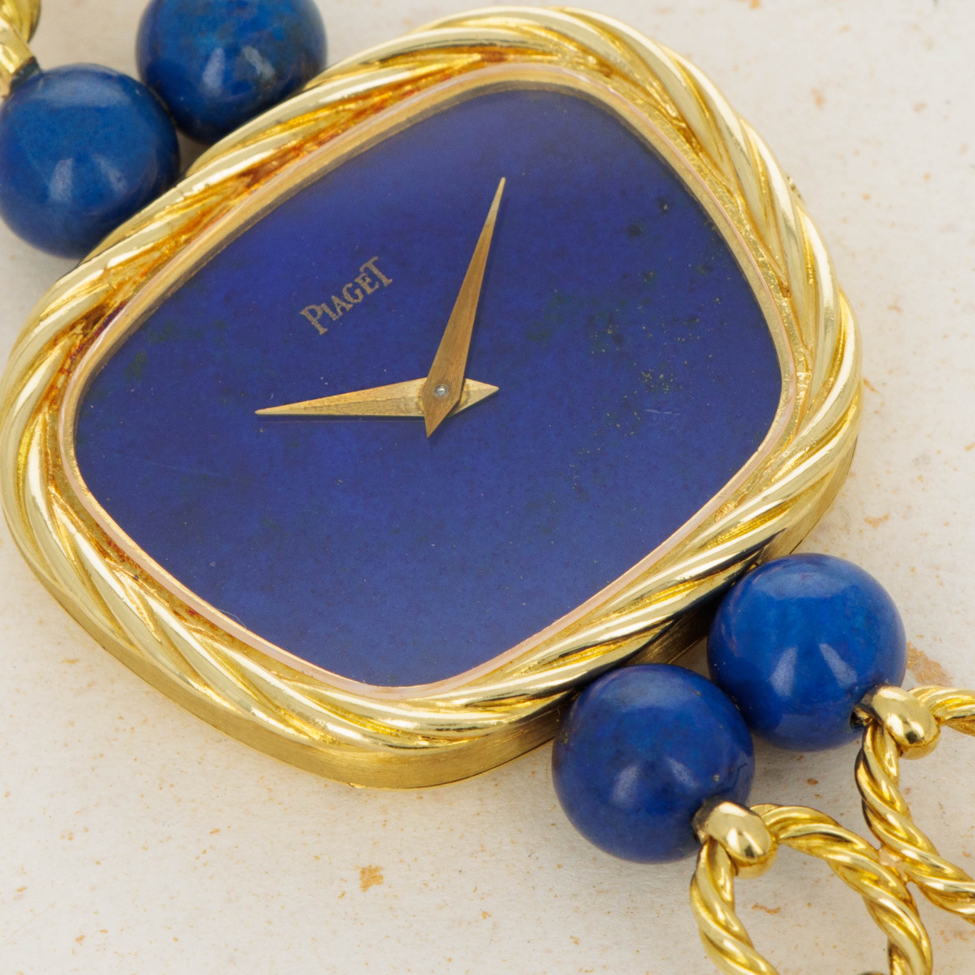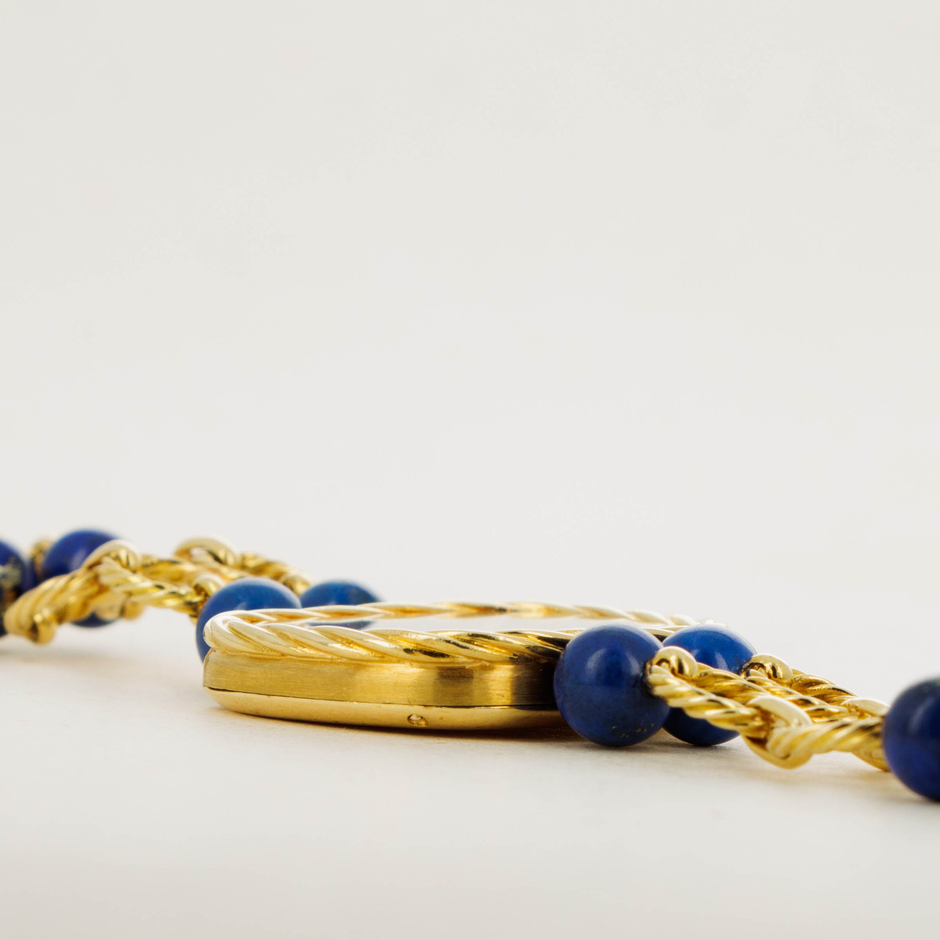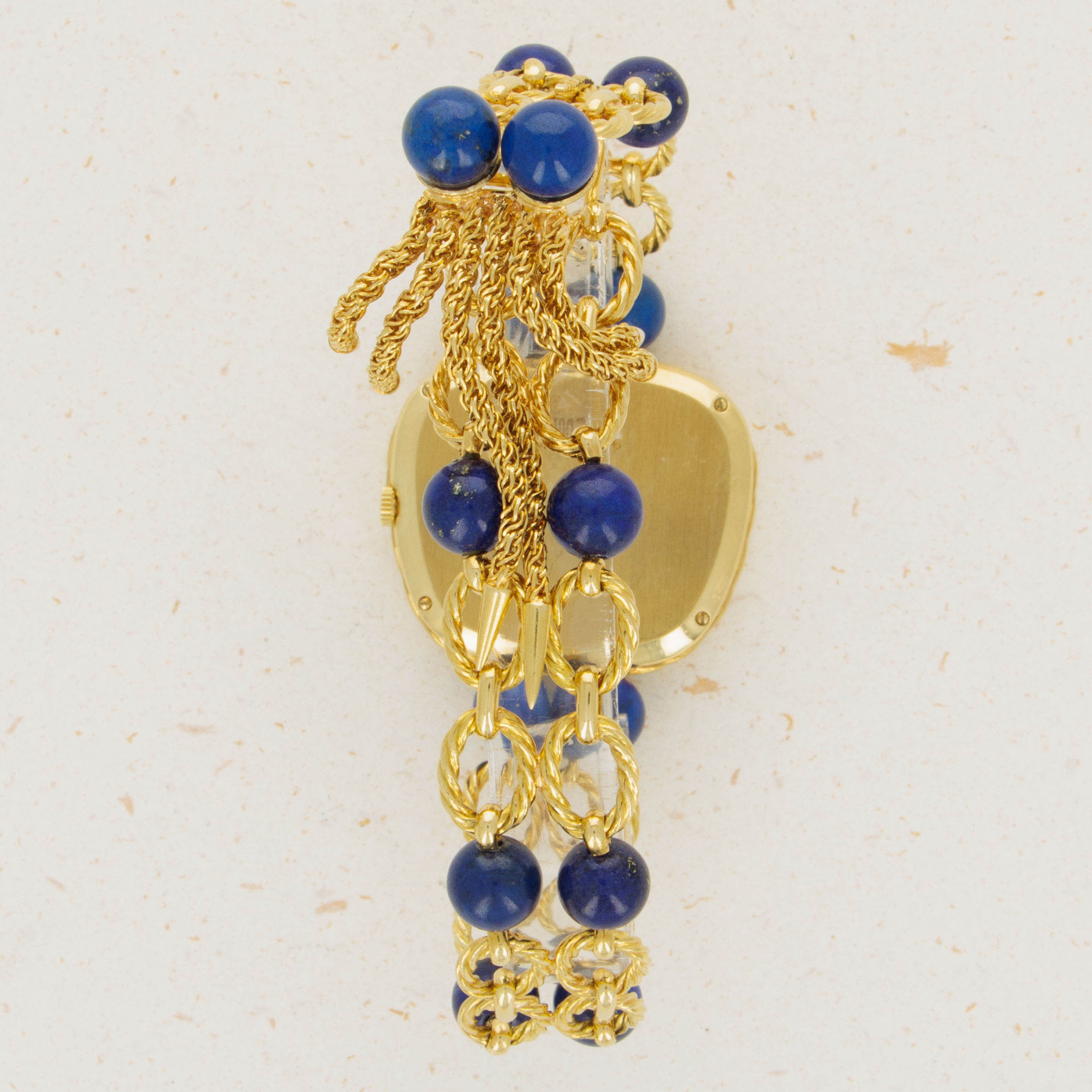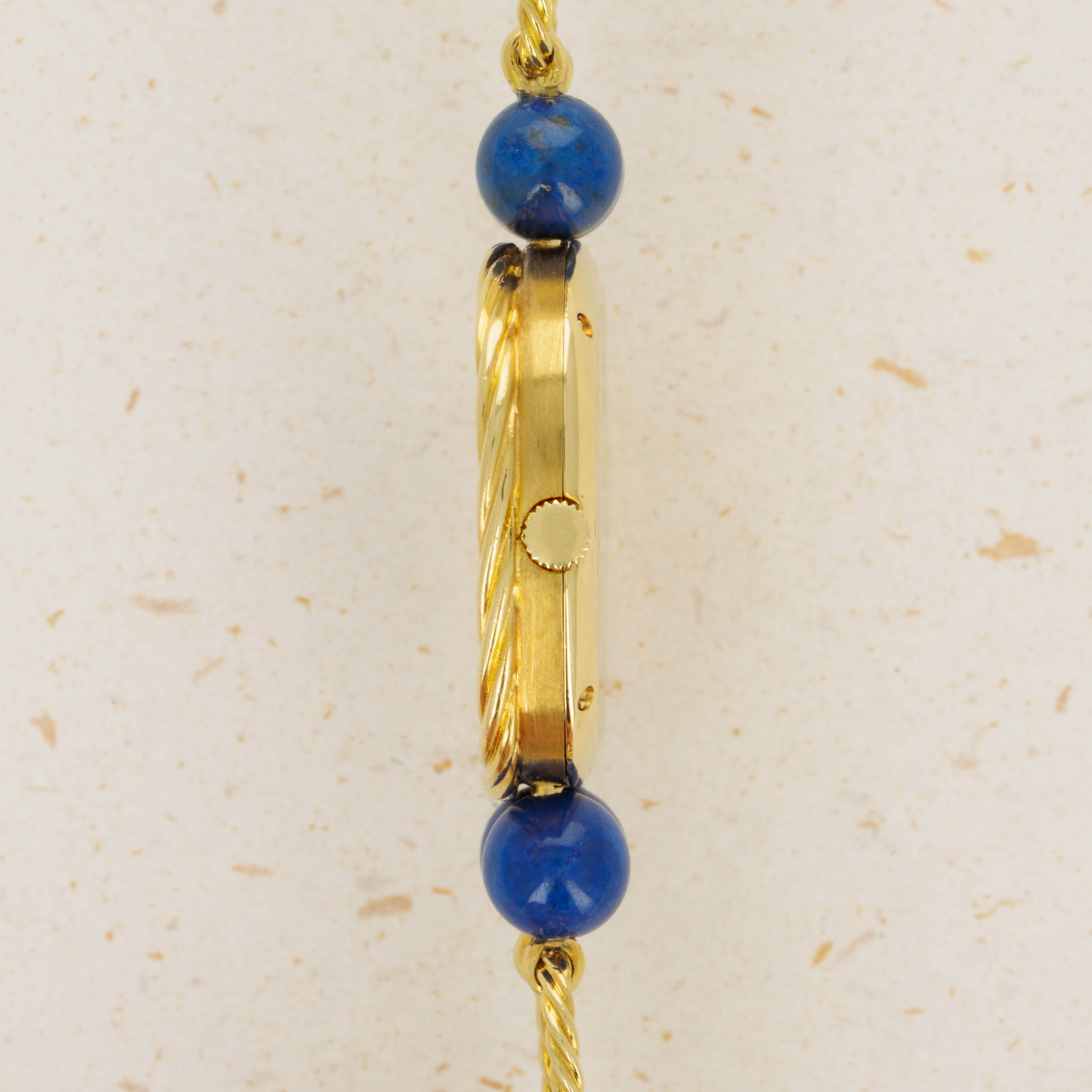 Watch is in excellent overall condition. Case has minor signs of wear, including some oxidation around the edge of the braided bezel. The lapis dial is in near-mint condition There are no visible cracks in the dial, only the natural pattern and veining of the stone. Bracelet is .approx 6.5" in length and features graded 18k yg and lapis lazuli "balls".