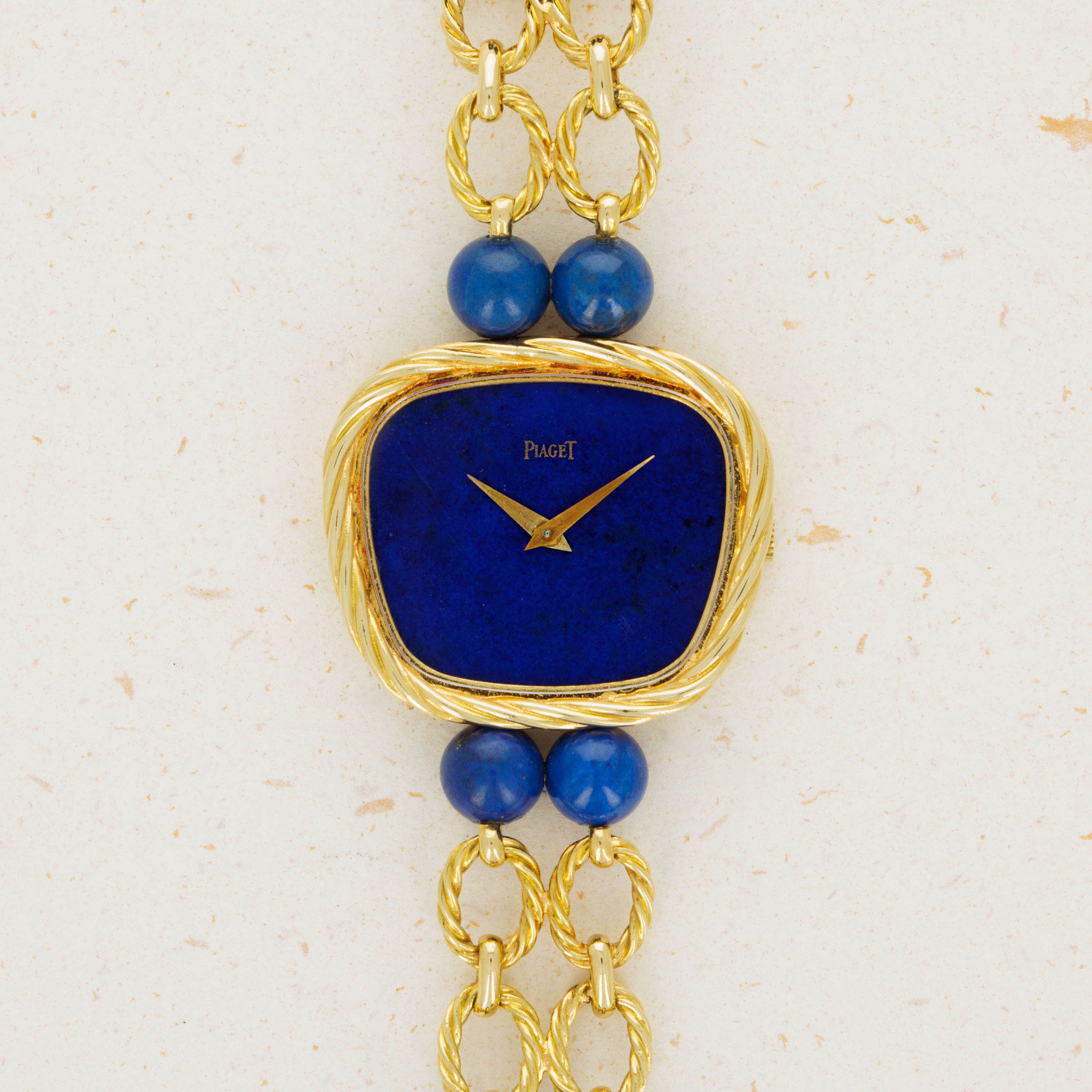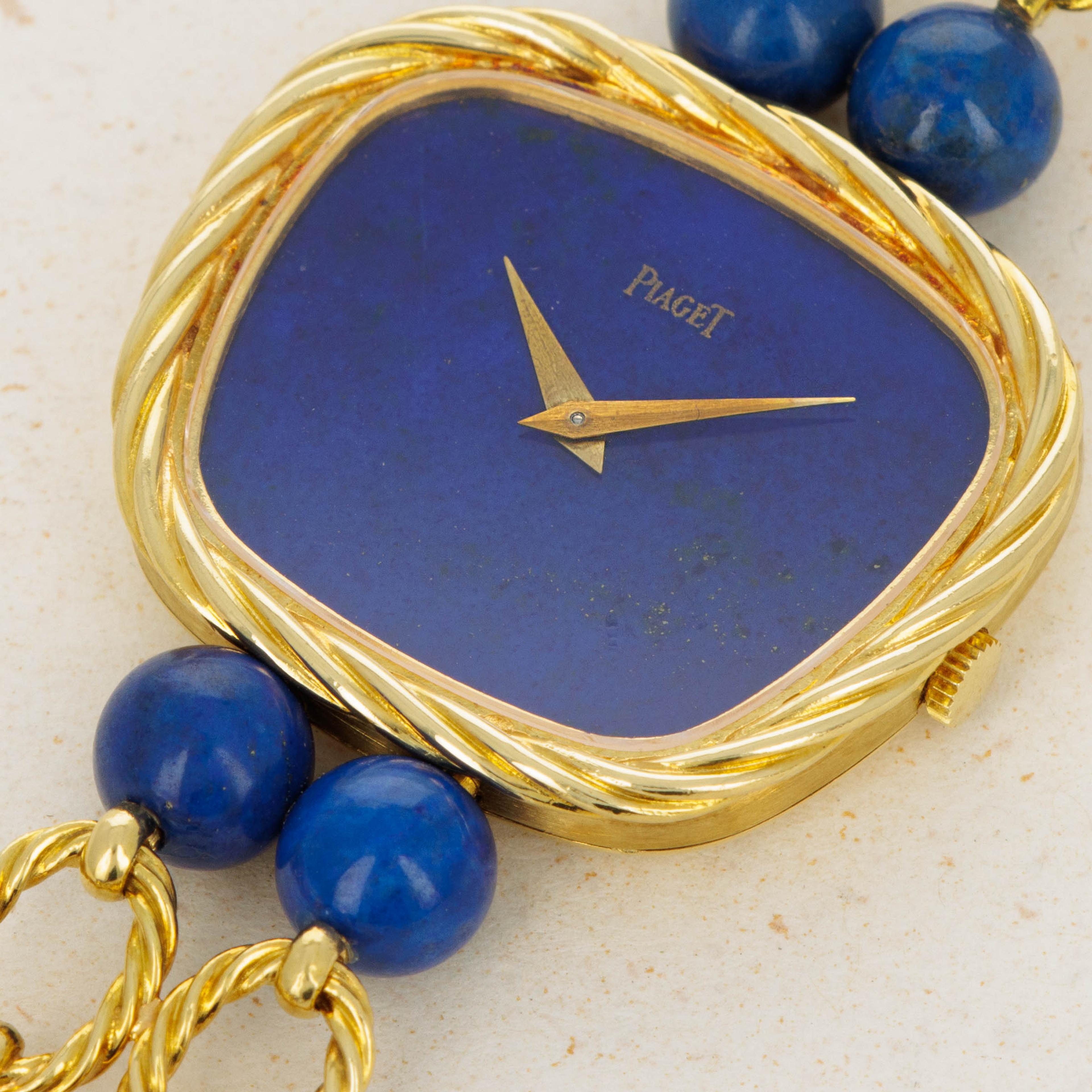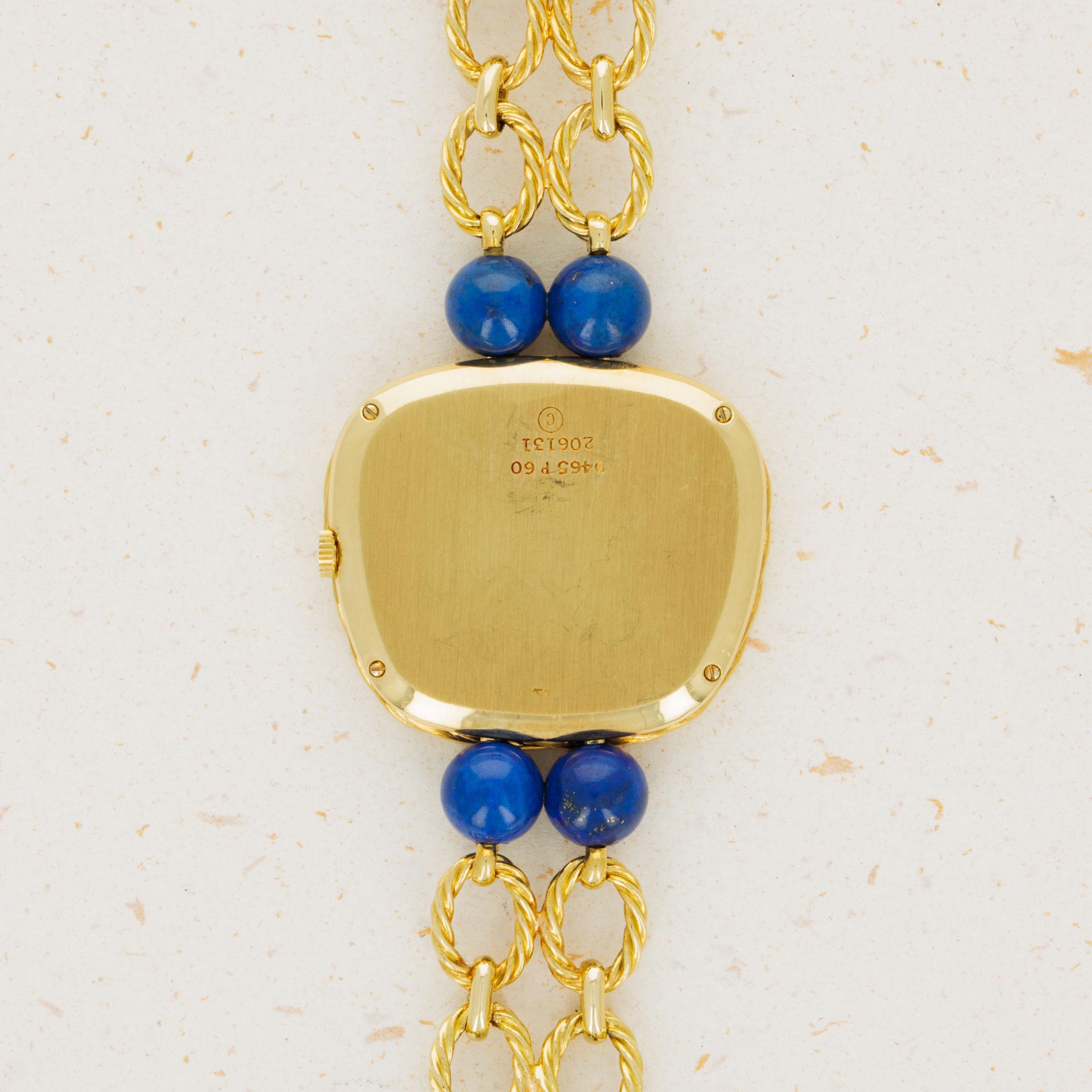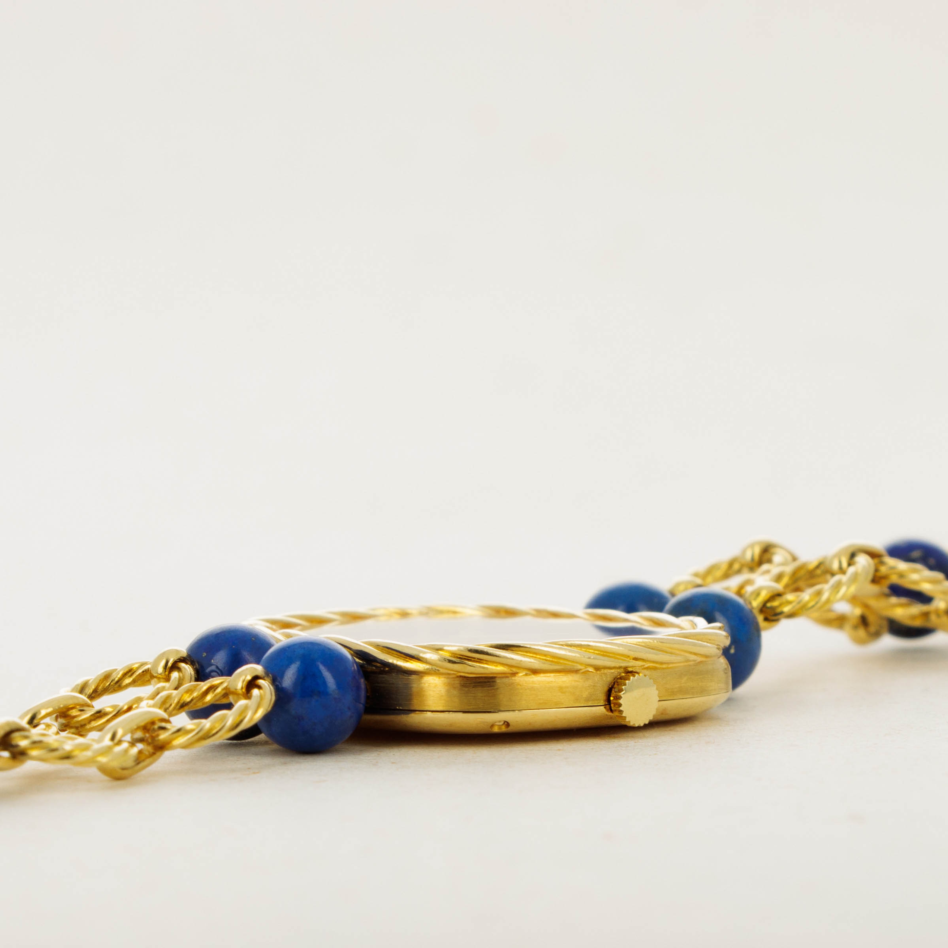 Watch is in excellent overall condition. Case has minor signs of wear, including some oxidation around the edge of the braided bezel. The lapis dial is in near-mint condition There are no visible cracks in the dial, only the natural pattern and veining of the stone. Bracelet is .approx 6.5" in length and features graded 18k yg and lapis lazuli "balls".