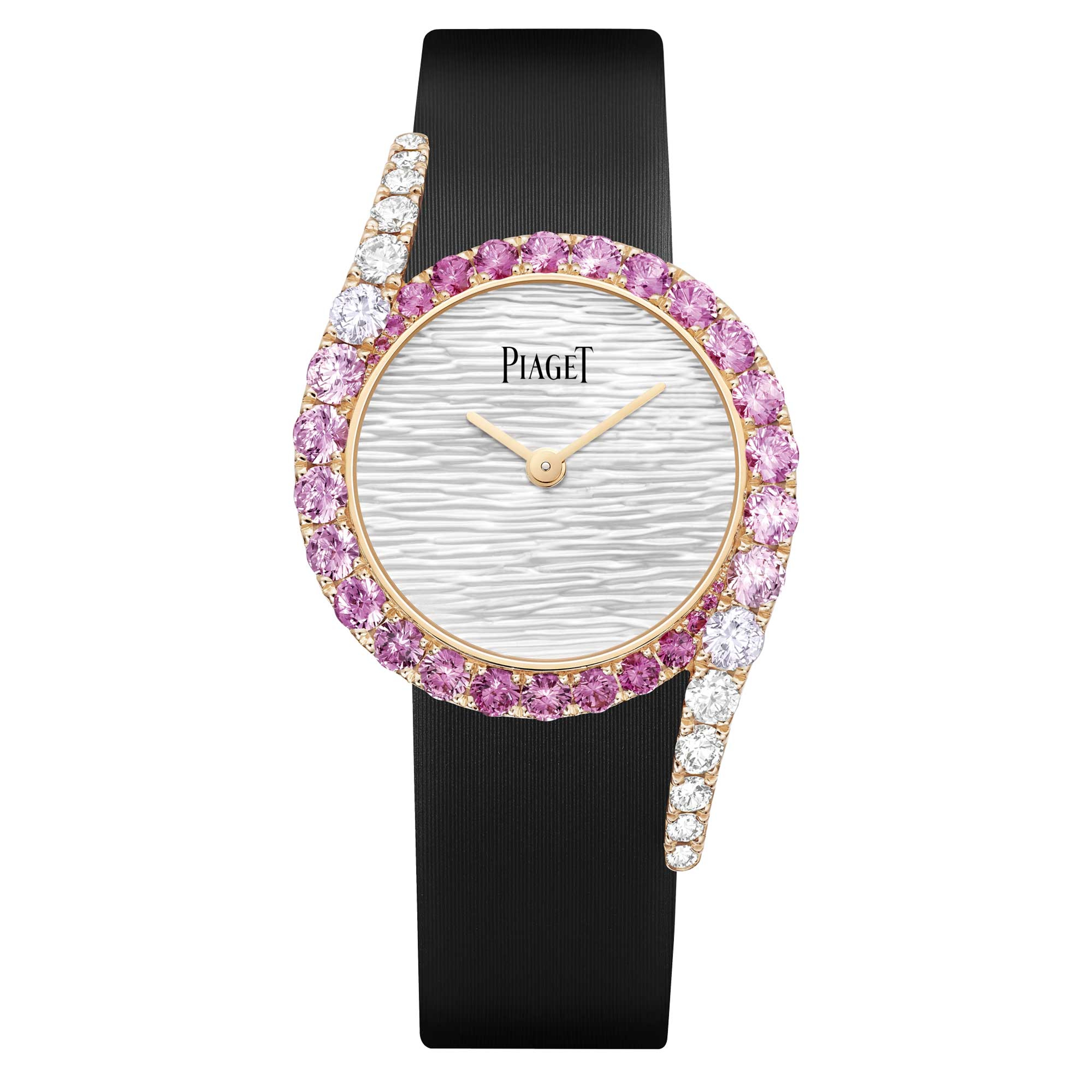 Limelight Gala watch, 32 mm. Case in 18K rose gold set with 10 brilliant-cut diamonds (approx. 0.90 ct) and 32 pink sapphires (approx. 4.70 cts). White mother-of-pearl dial. Buckle set with 15 brilliant-cut diamonds (approx. 0.06 ct). Sapphire crystal case back. Manufacture Piaget 501P1 self-winding mechanical movement. Unique Piece. The Limelight Gala is rethought as a 32mm automatic rose gold sapphire diamond watch. With an elegant round case sublimated by two asymmetrical extended lugs, this unique piece showcases the signature feature of the original. Its voluptuous silhouette is accentuated by radiant brilliant-cut diamonds and sapphires that form a pink gradient on the bezel. With its black satin strap expertly paired with the white mother-of-pearl dial, this luxury watch for women embodies a distinguished aura of femininity.