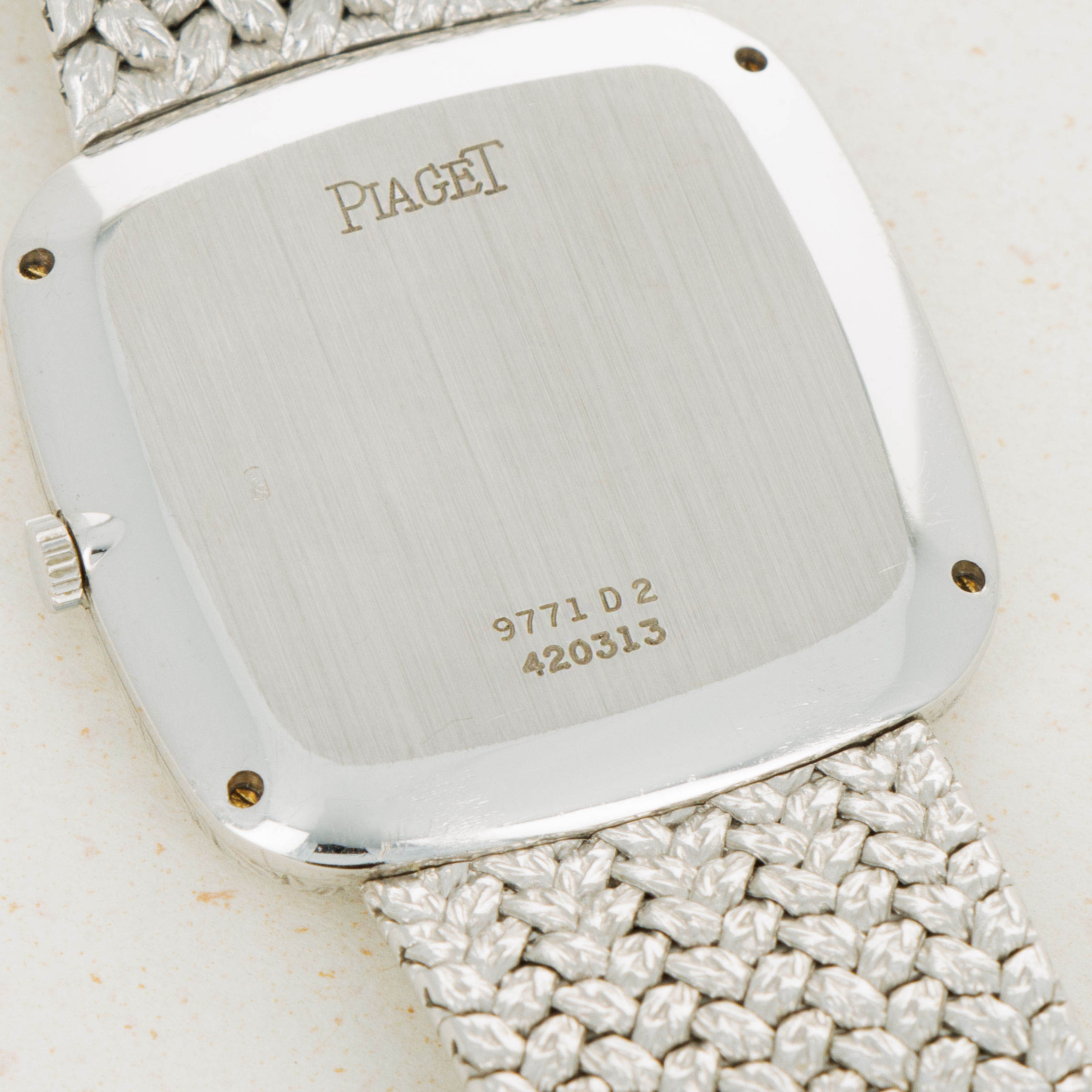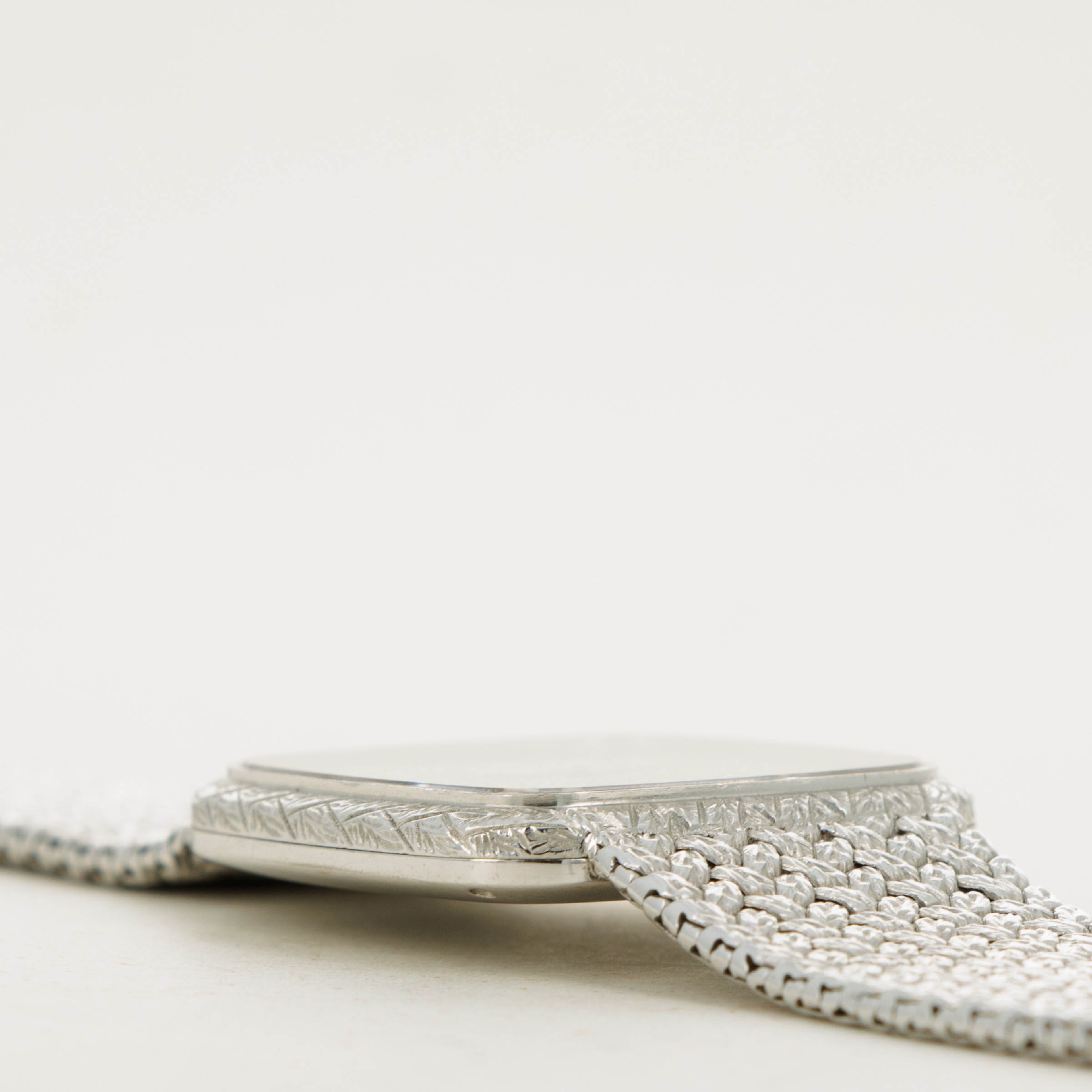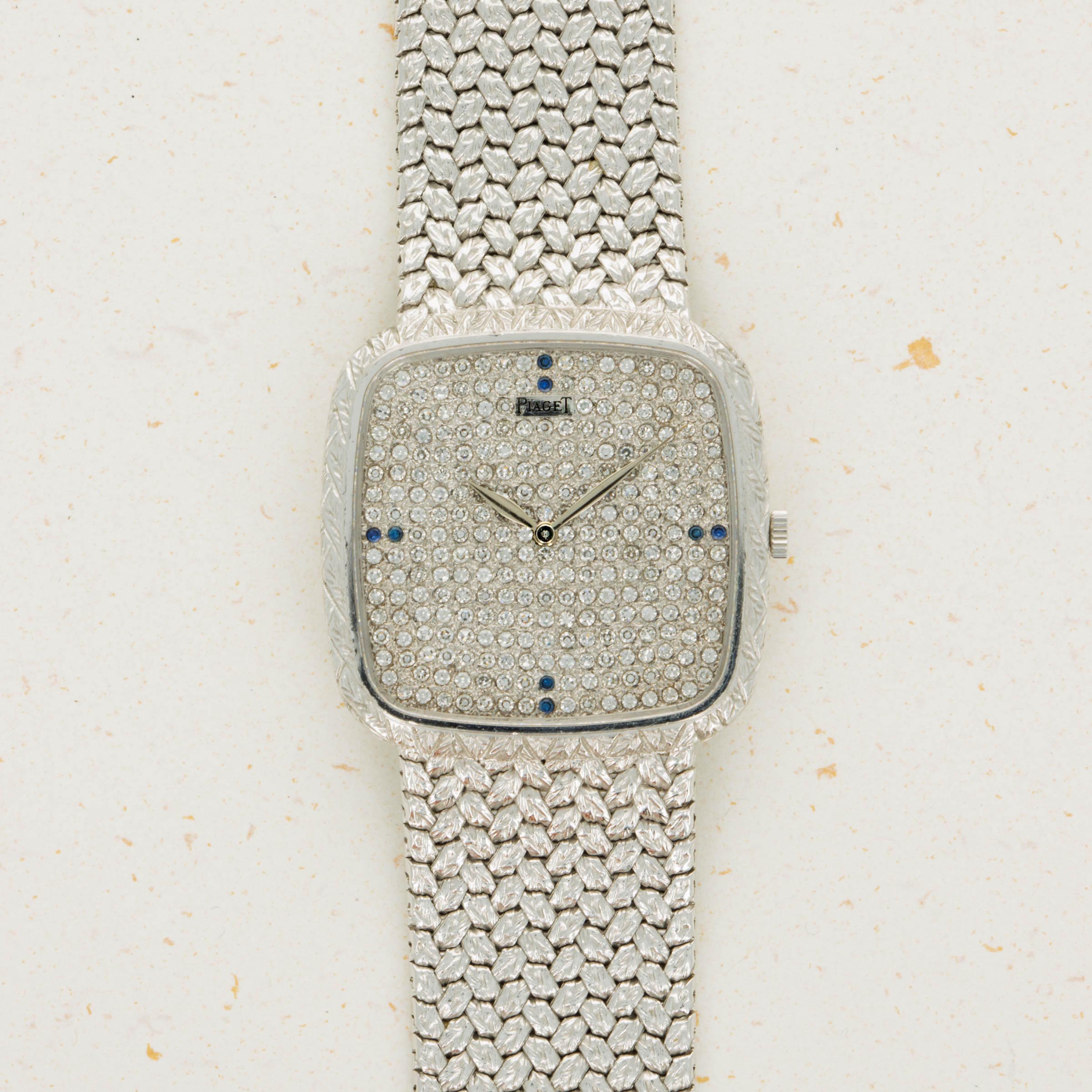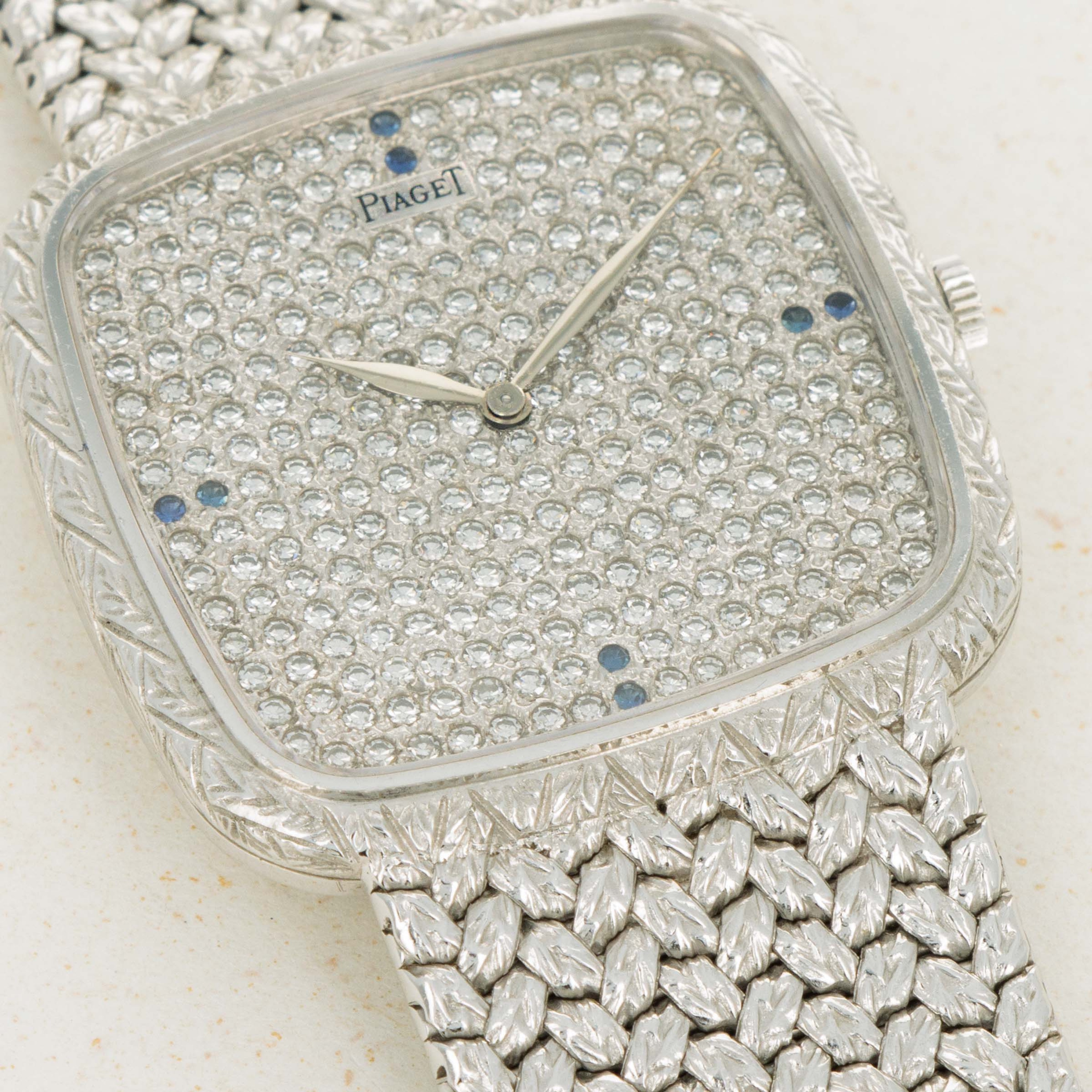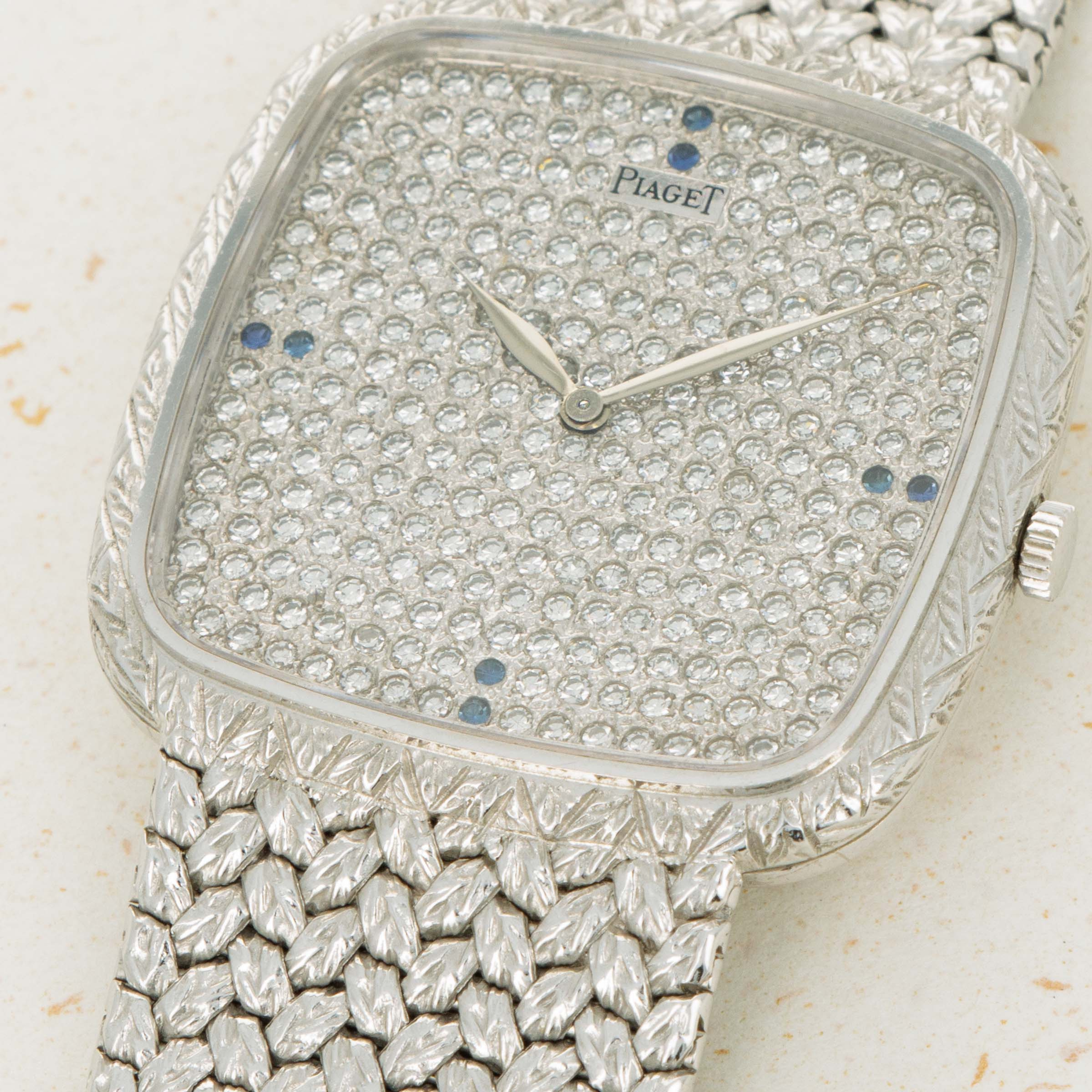 Founded in 1874 by a young 19-year-old in the village of La Côte-aux-Fées, Piaget was originally nothing but a means for Georges Piaget to earn some extra money as he worked on movements and watches during the winter. After decades of producing watches for other brands, it was not until 1943 that the watchmaker would begin to sign their own watches and develop as the famed watchmaker that they are today. From then on, Piaget began to experiment with ultra-thin watches and push both horological and design boundaries, which eventually led to the brand expanding into jewelry in 1959, perhaps the brand’s best-known avenue today. With their impeccable craftsmanship, audacious style, and dedication to the spectacular, Piaget’s timepieces and jewelry began to coalesce, resulting in timepieces much like the ref. 9771 that we have here. Measuring 30mm in diameter and hosting an incredibly intricate 18k white gold construction, this timepiece is a wonderful synthesis of Piaget’s distinctive exclusivity and rich horological aesthetic. Featuring an 18kt white gold bracelet attached to its cushion-shaped case, this timepiece is extravagance at its very finest. Boasting a textured bezel atop its case and a diamond pave dial surrounded, this timepiece’s display is a further continuation of Piaget’s distinctive jeweler’s touch with its impeccable gem-setting craftsmanship and overall beauty.