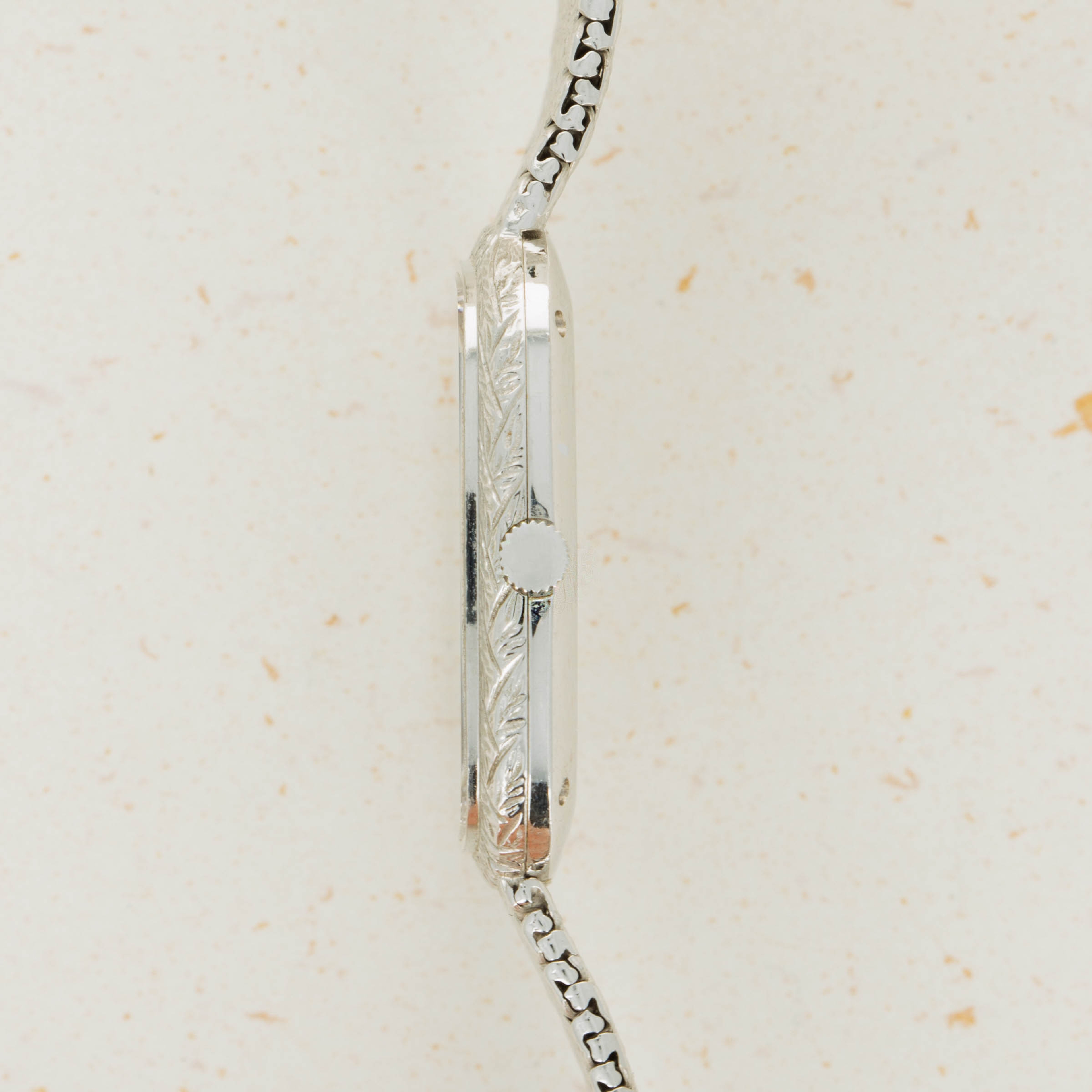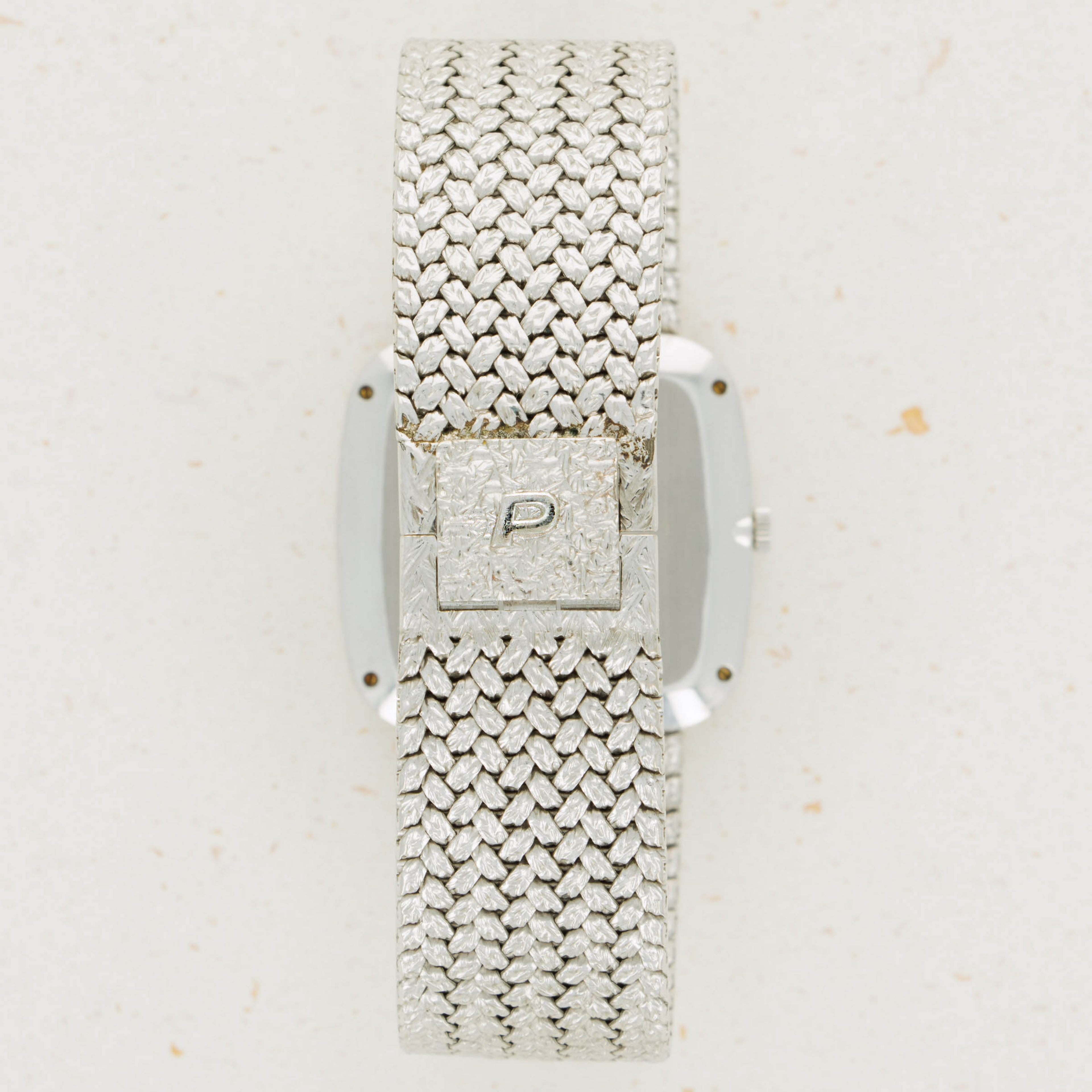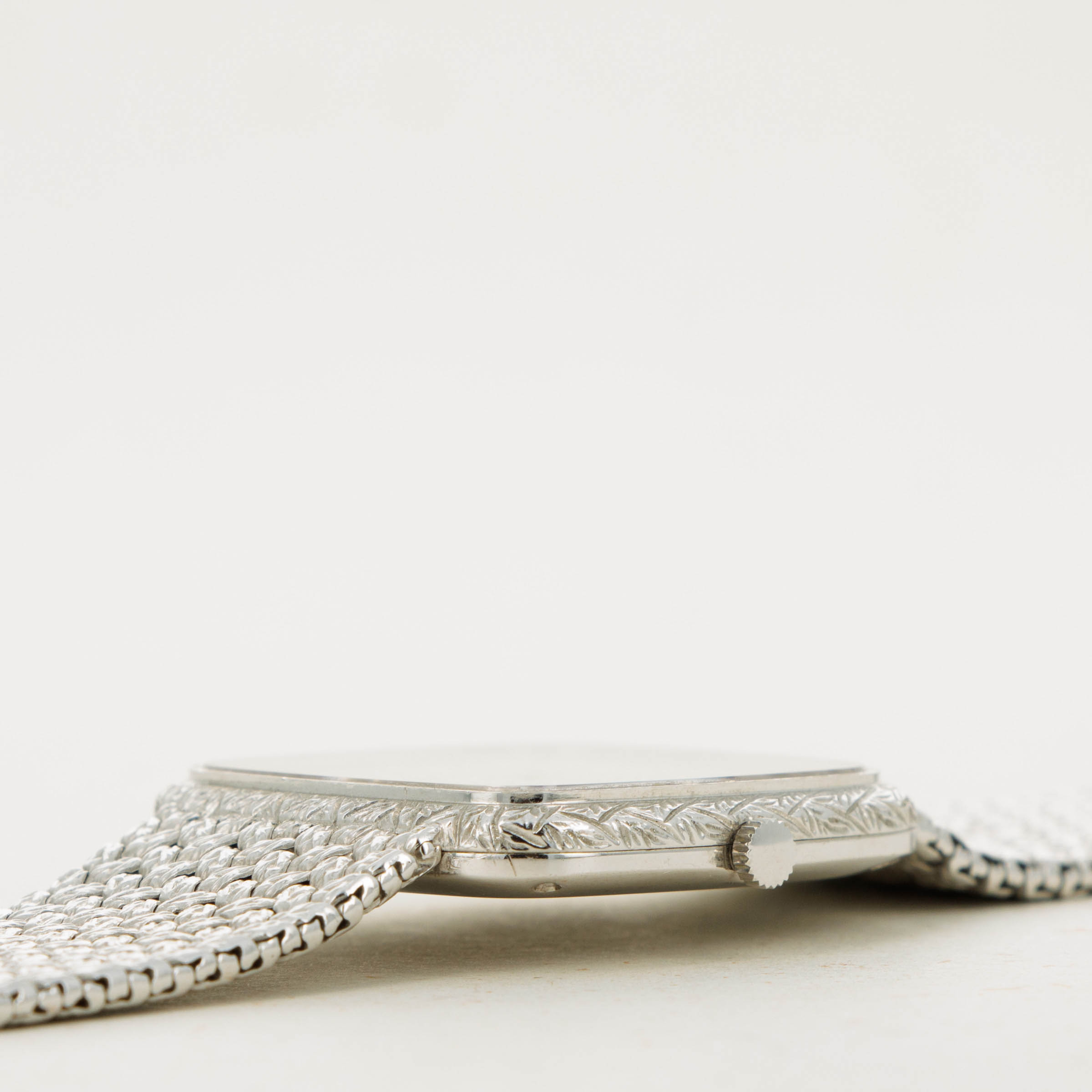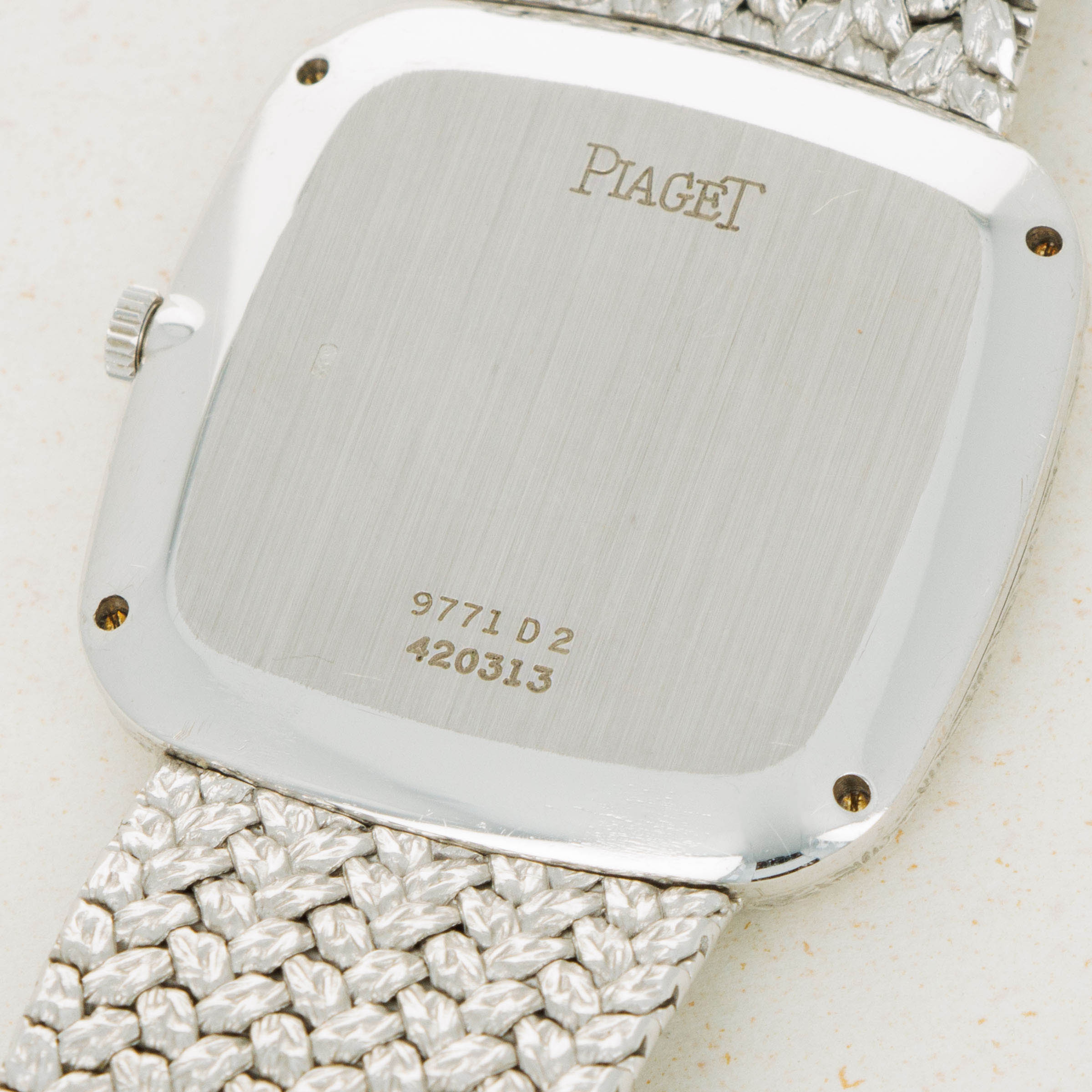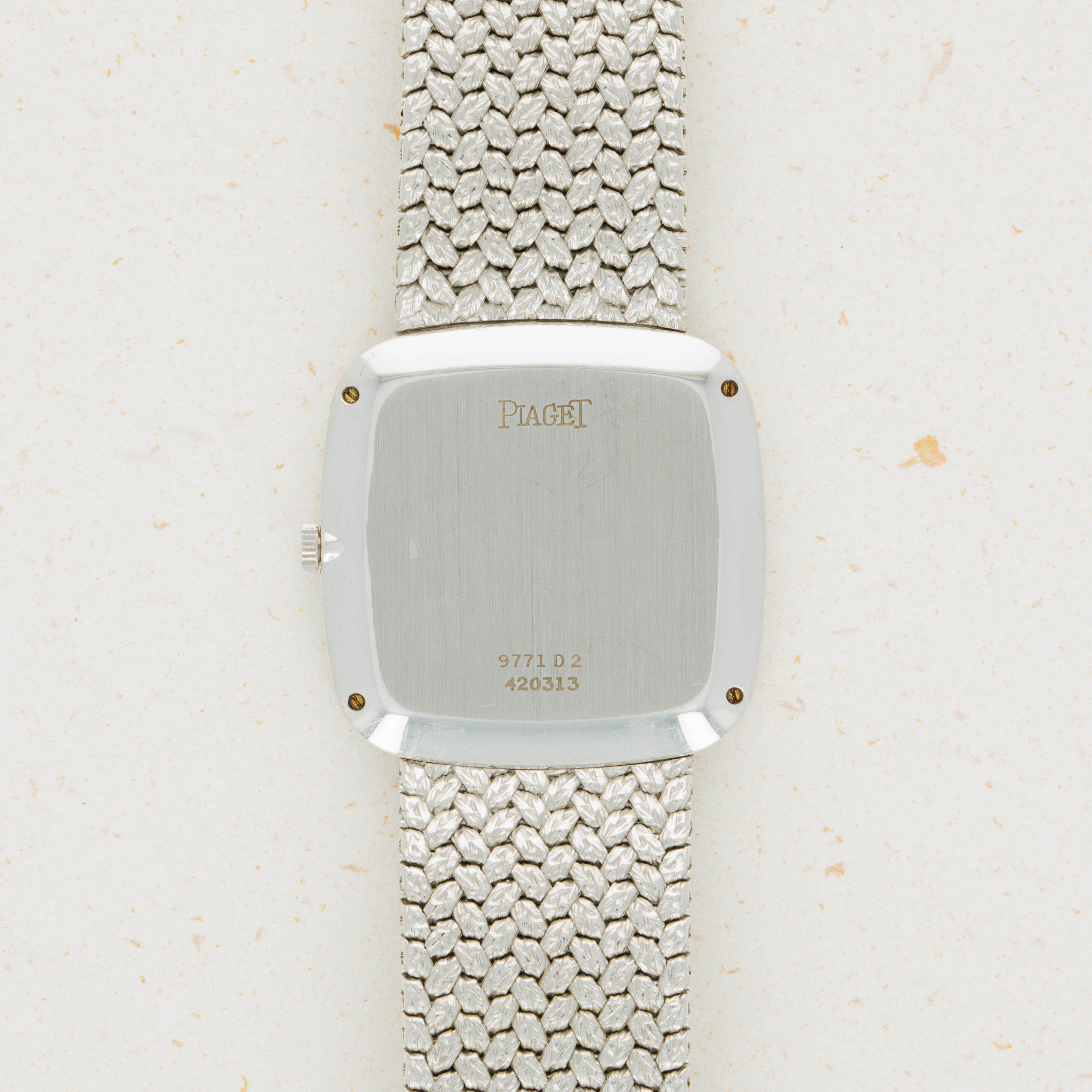 Founded in 1874 by a young 19-year-old in the village of La Côte-aux-Fées, Piaget was originally nothing but a means for Georges Piaget to earn some extra money as he worked on movements and watches during the winter. After decades of producing watches for other brands, it was not until 1943 that the watchmaker would begin to sign their own watches and develop as the famed watchmaker that they are today. From then on, Piaget began to experiment with ultra-thin watches and push both horological and design boundaries, which eventually led to the brand expanding into jewelry in 1959, perhaps the brand’s best-known avenue today. With their impeccable craftsmanship, audacious style, and dedication to the spectacular, Piaget’s timepieces and jewelry began to coalesce, resulting in timepieces much like the ref. 9771 that we have here. Measuring 30mm in diameter and hosting an incredibly intricate 18k white gold construction, this timepiece is a wonderful synthesis of Piaget’s distinctive exclusivity and rich horological aesthetic. Featuring an 18kt white gold bracelet attached to its cushion-shaped case, this timepiece is extravagance at its very finest. Boasting a textured bezel atop its case and a diamond pave dial surrounded, this timepiece’s display is a further continuation of Piaget’s distinctive jeweler’s touch with its impeccable gem-setting craftsmanship and overall beauty.