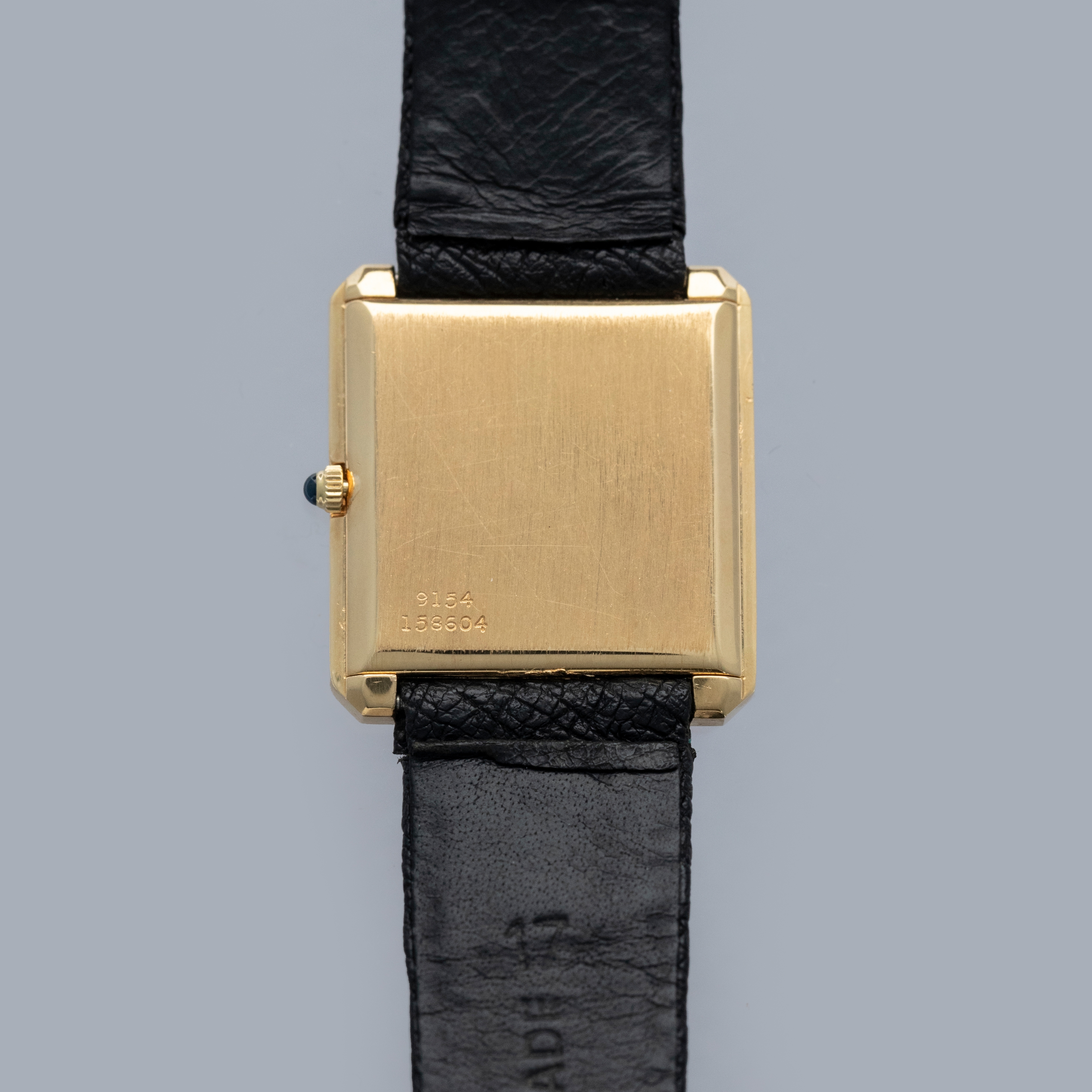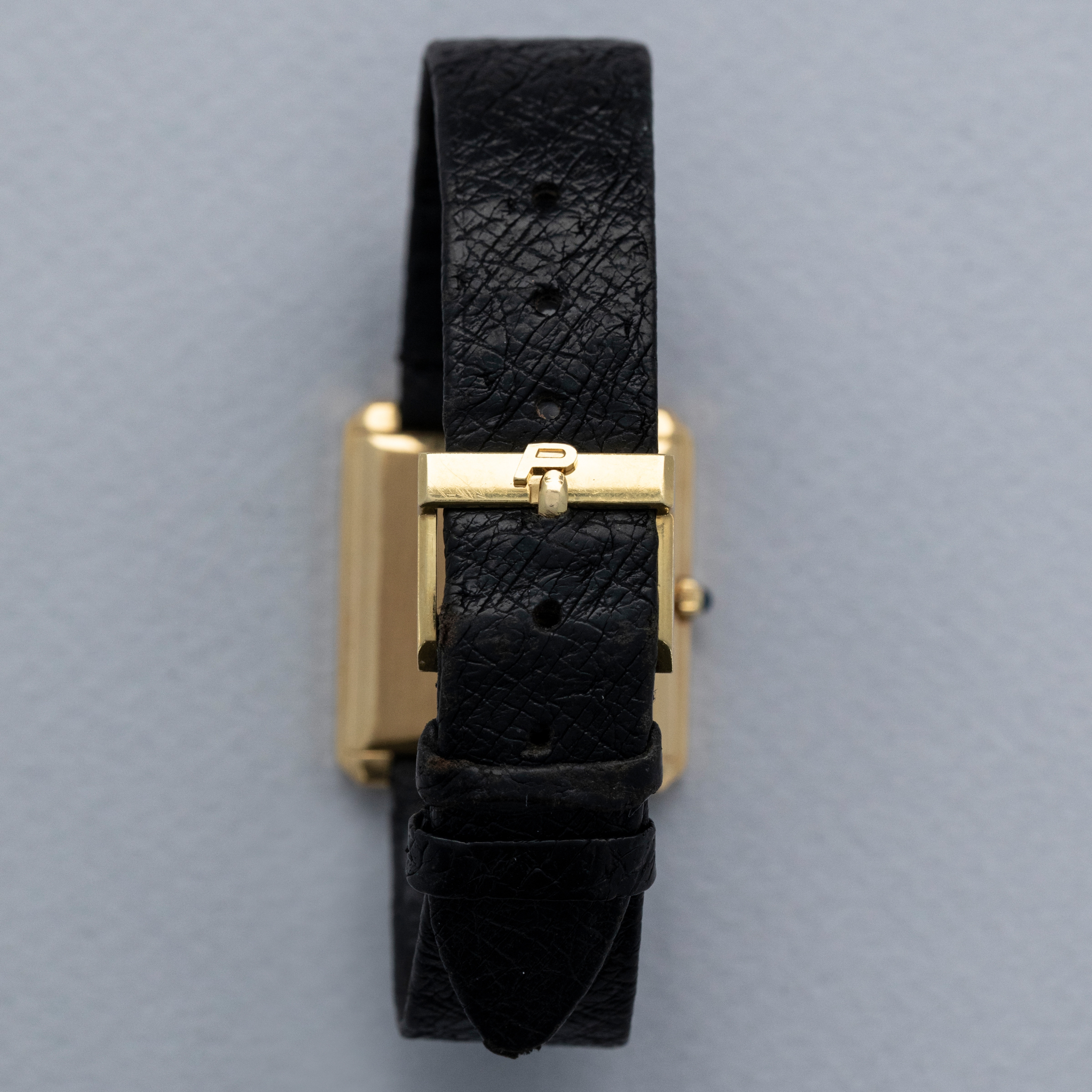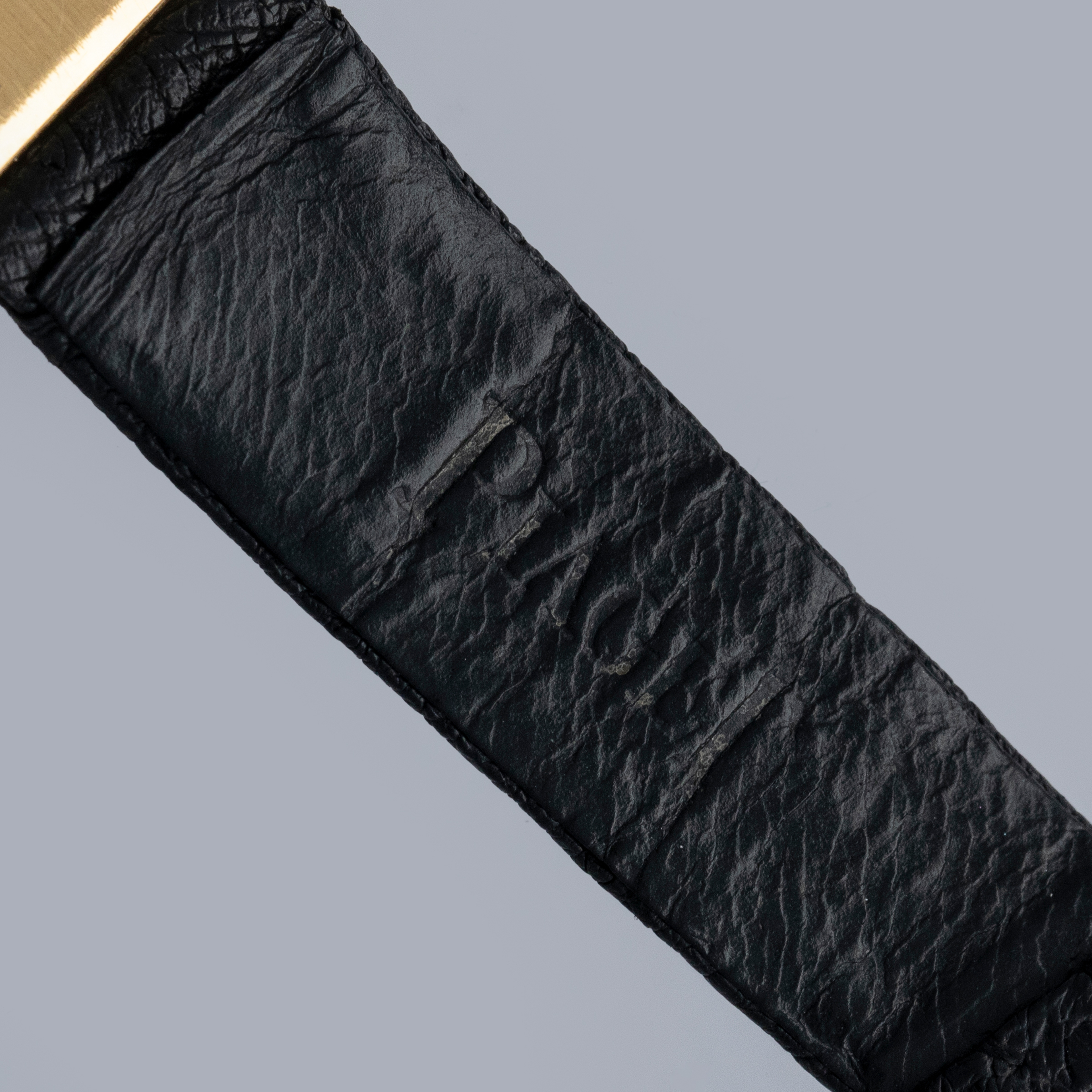 Watch is in very good overall condition. The yellow gold case shows some surface marks and a couple of nicks on the case sides. The vertical ribbed front of the case remains well-defined, with some age-related tarnishing visible. The case back has some surface scratches with the model and serial numbers are still crisp. The gold winding crown has a blue cabochon in excellent condition. The black onyx dial has been refinished at some point and shows only minor surface wear. The watch is fitted with a black leather strap and the original 'P' logo buckle, which is in good condition.