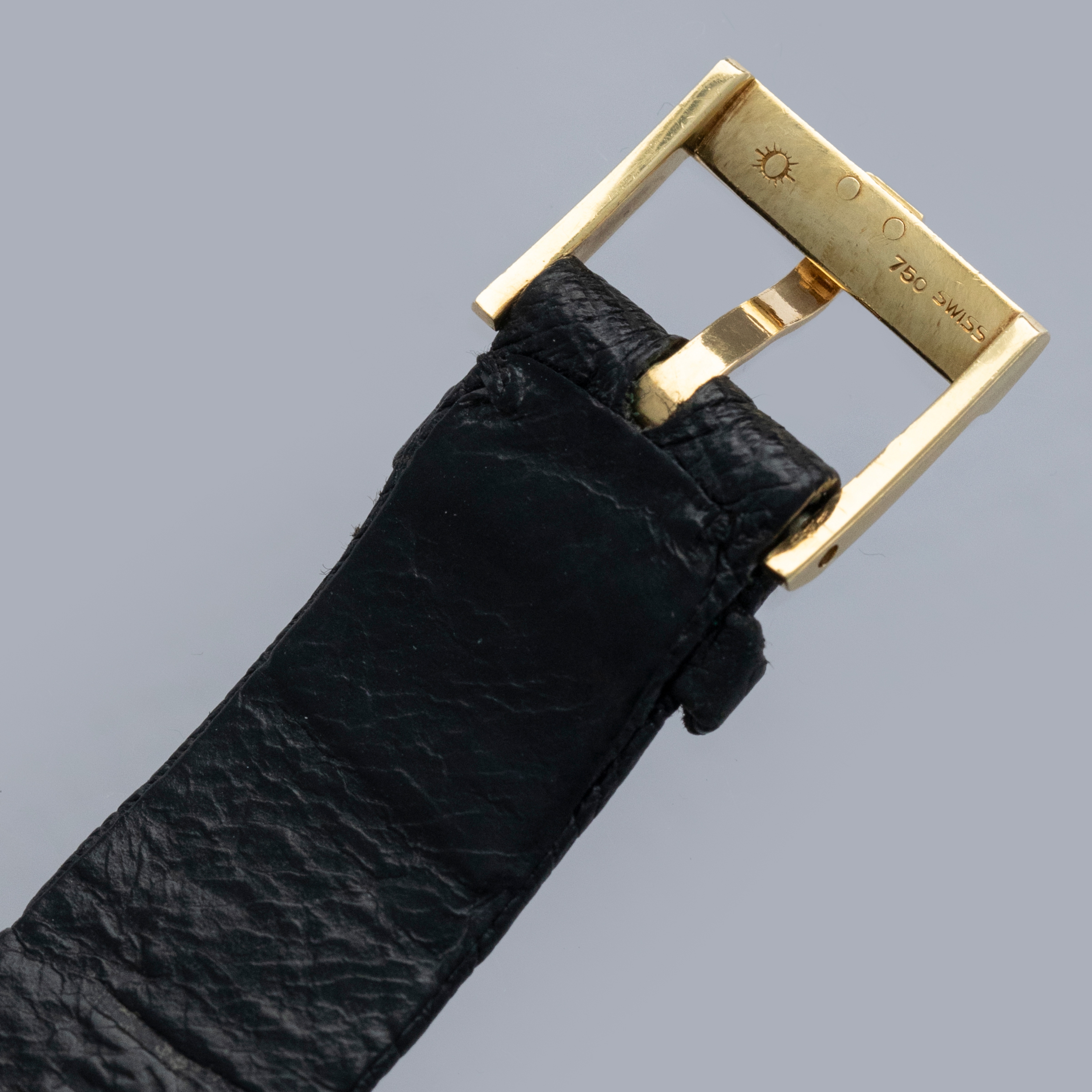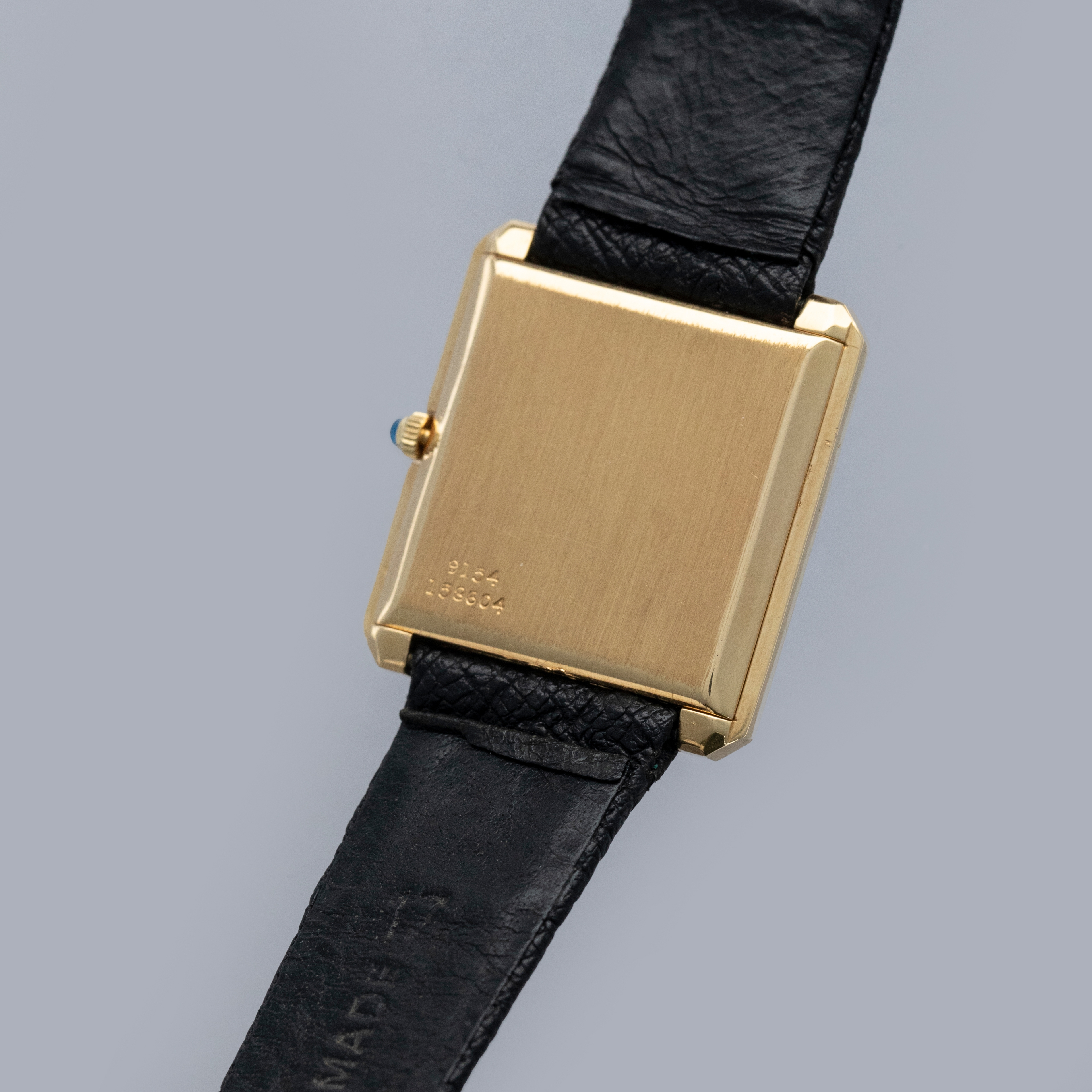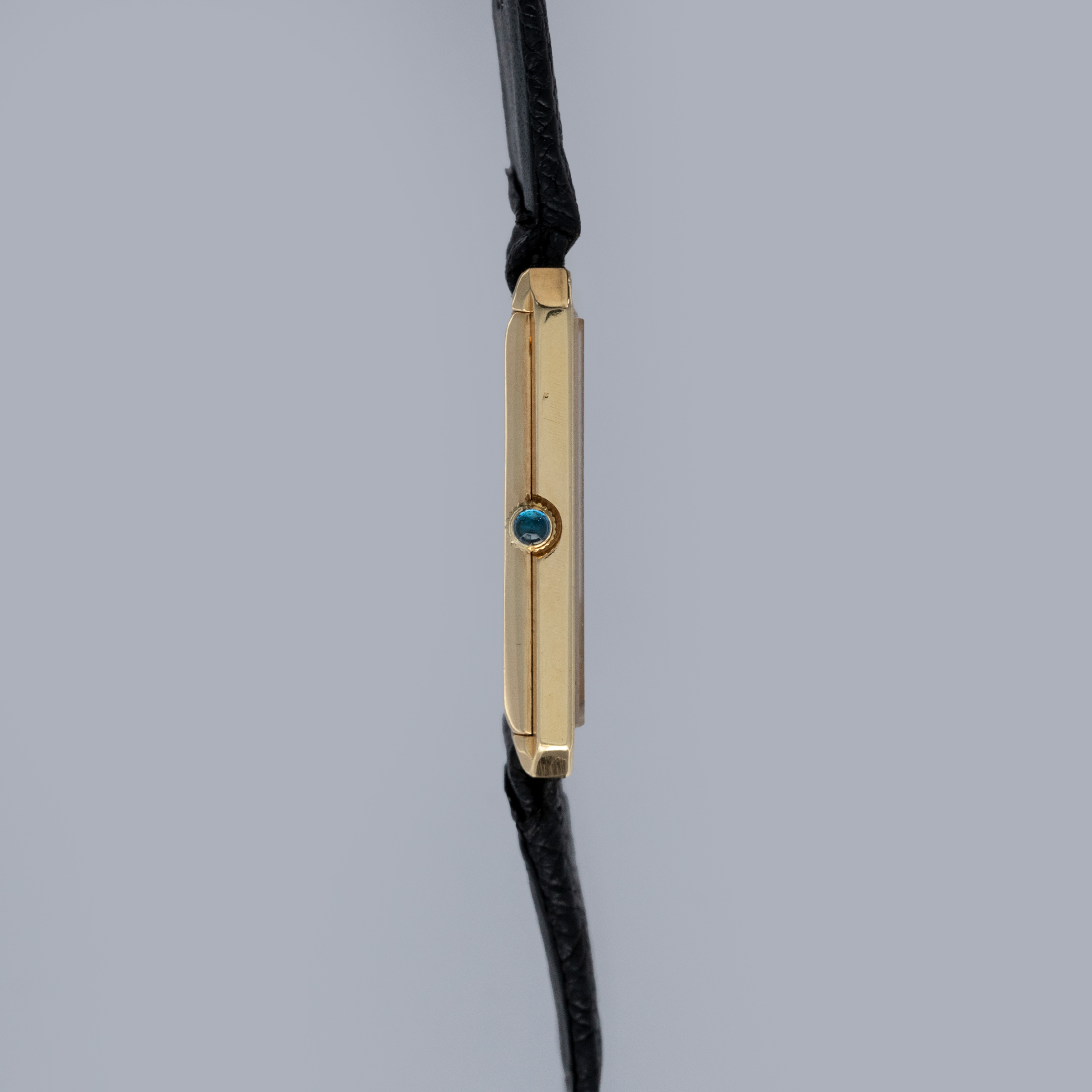 Watch is in very good overall condition. The yellow gold case shows some surface marks and a couple of nicks on the case sides. The vertical ribbed front of the case remains well-defined, with some age-related tarnishing visible. The case back has some surface scratches with the model and serial numbers are still crisp. The gold winding crown has a blue cabochon in excellent condition. The black onyx dial has been refinished at some point and shows only minor surface wear. The watch is fitted with a black leather strap and the original 'P' logo buckle, which is in good condition.