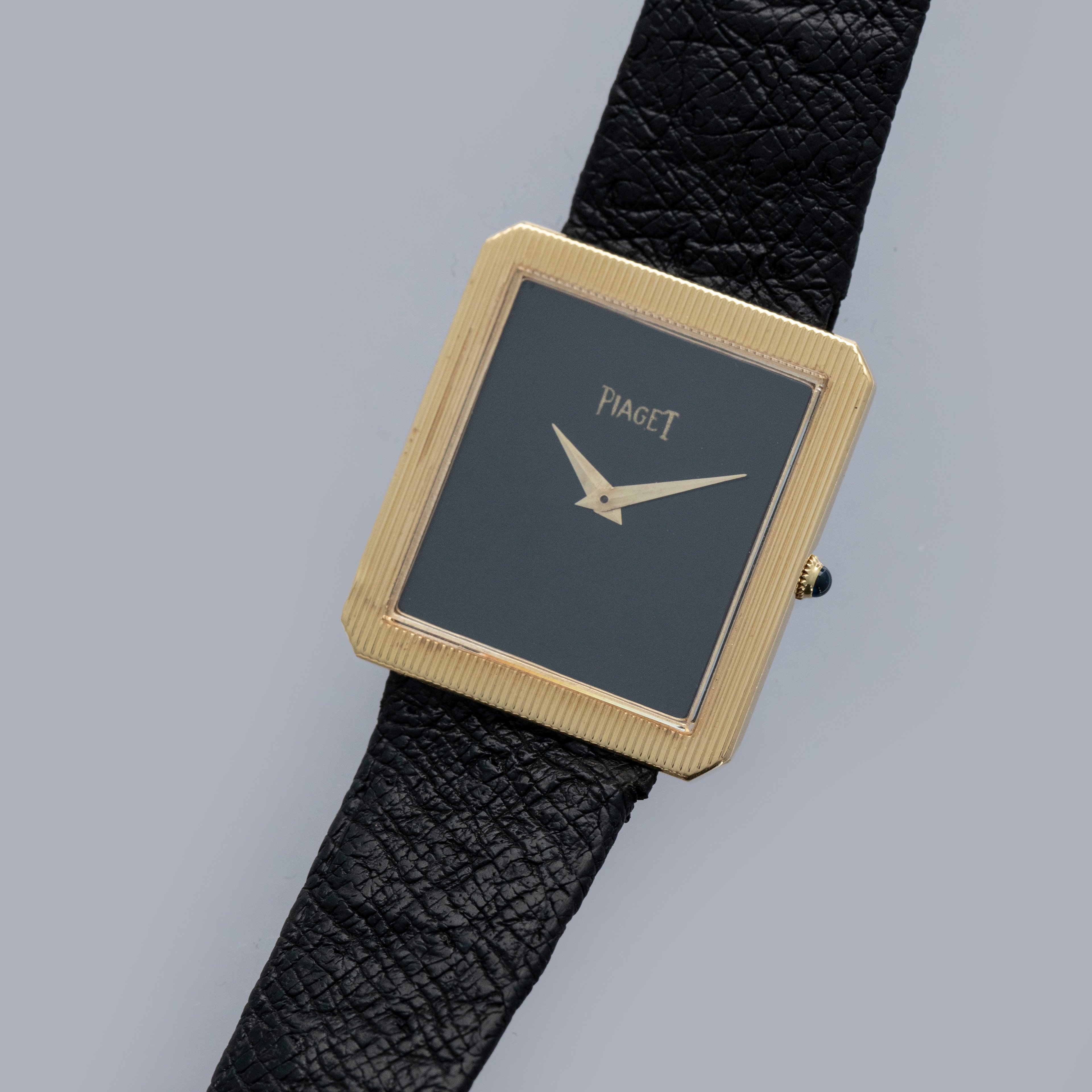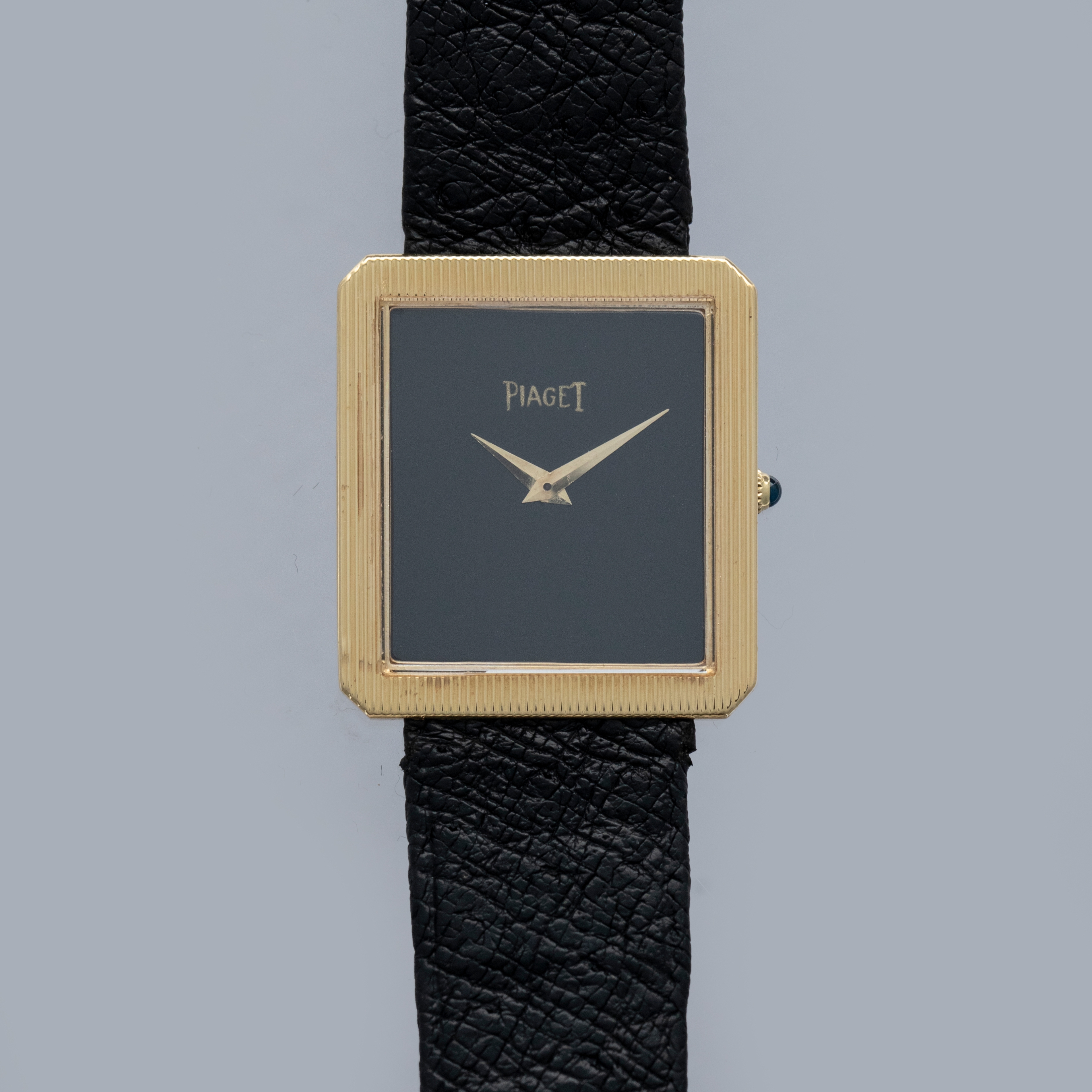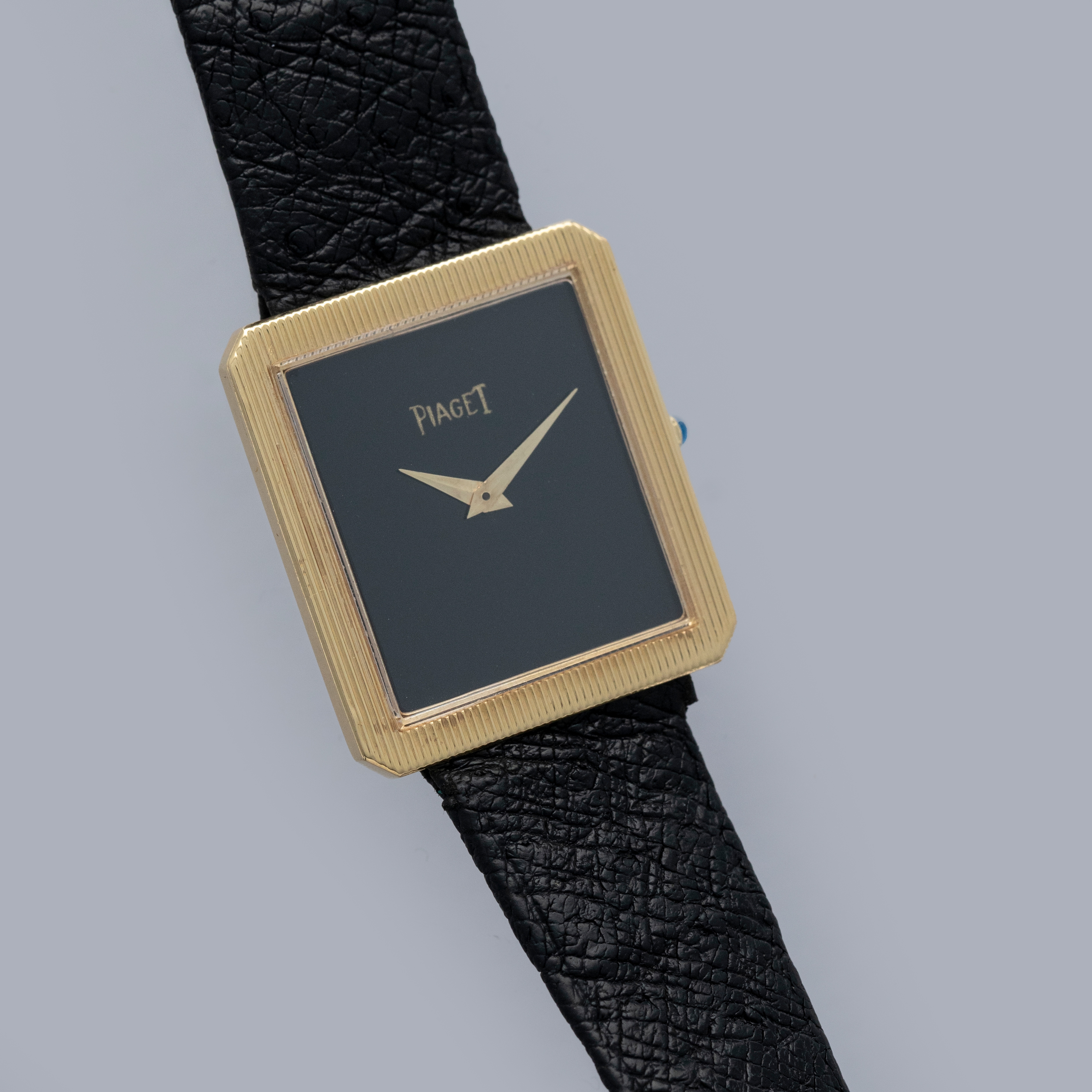 Founded in 1874 by a young 19-year-old in the village of La Côte-aux-Fées, Piaget was originally nothing but a means for Georges Piaget to earn some extra money as he worked on movements and watches during the winter. After decades of producing watches for other brands, it was not until 1943 that the watchmaker would begin to sign their own watches and develop as the famed watchmaker that they are today. From then on, Piaget began to experiment with ultra-thin watches and push both horological and design boundaries, which eventually led to the brand expanding into jewelry in 1959, perhaps the brand’s best-known avenue today. With their impeccable craftsmanship, audacious style, and dedication to the spectacular, Piaget’s timepieces and jewelry began to coalesce, resulting in timepieces much like the Protocole ref. 5194 that we have here, which became a signature offering from within Piaget’s catalog. Boasting an 18kt yellow gold rectangular case measuring 25mm wide and 28mm tall with a lug-free design and an interesting vertical ‘tapestry’ pattern engraved down its entire front, the Protocole is an iconic piece of Piaget design. However, while the ref. 5194’s case is unique, this example’s jet-black onyx stone dial is what truly sets it apart. A stunning result of Piaget’s incredible work with stone dials, this timepiece likely resulted from Piaget’s Style Selector program where clients could pick from a variety of dials, bracelet options, case finishes, materials, and more for their watch. These stone dial Piaget offerings have become increasingly sought-after, and this onyx dial Protocole ref. 5194 is a perfect reminder of why collectors have flocked to them in recent times.
