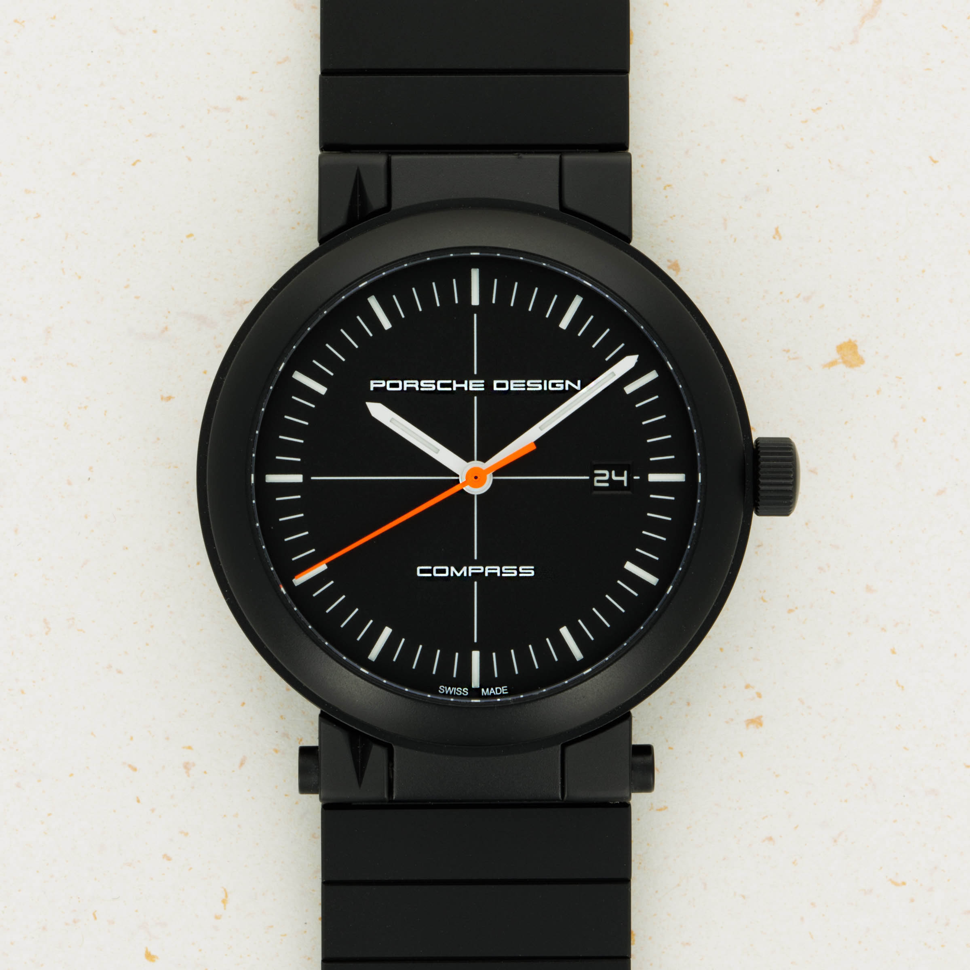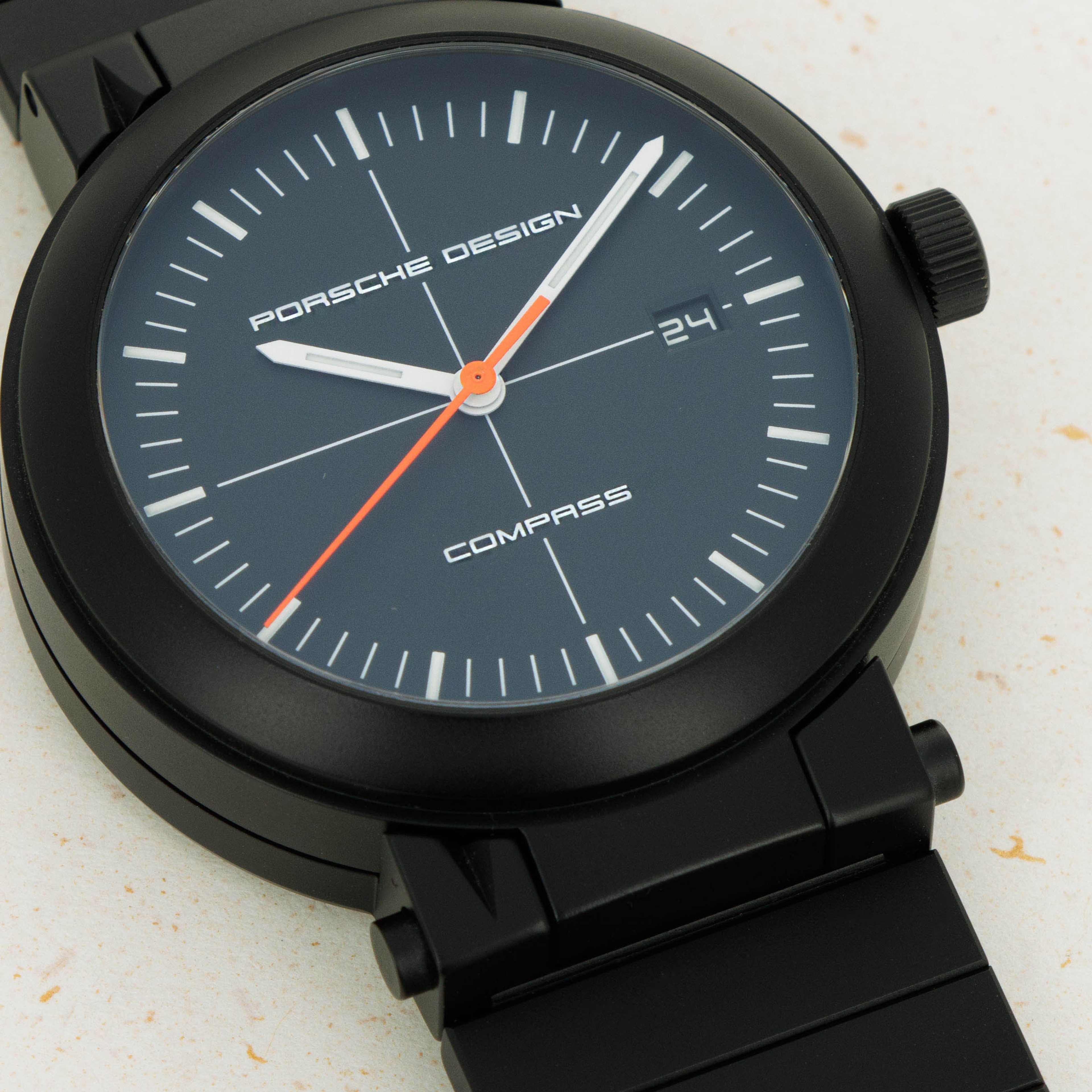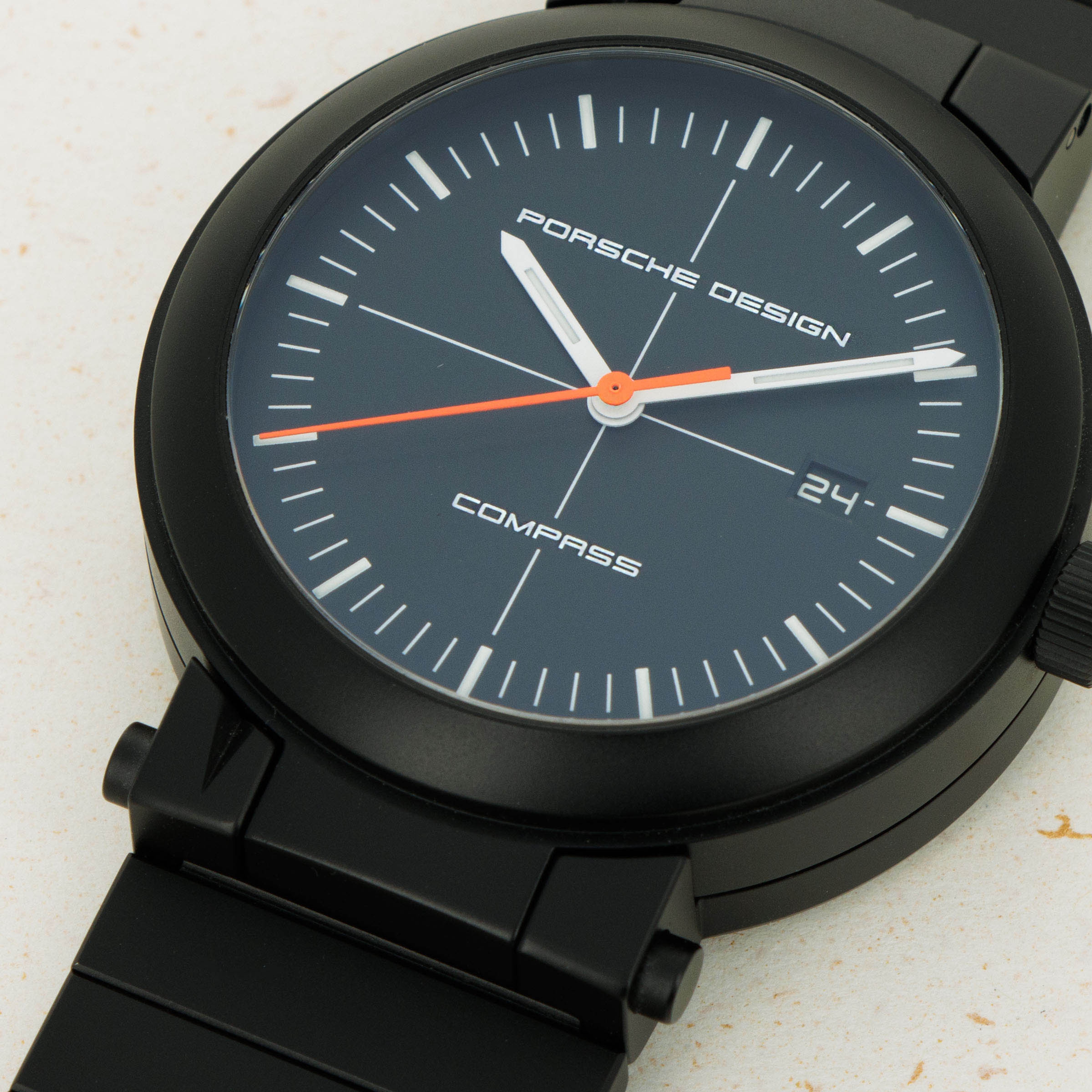 Featuring a black sector dial the Porsche Design Compass' bright orange seconds hand adds a burst of color to its otherwise blacked-out aesthetic.
