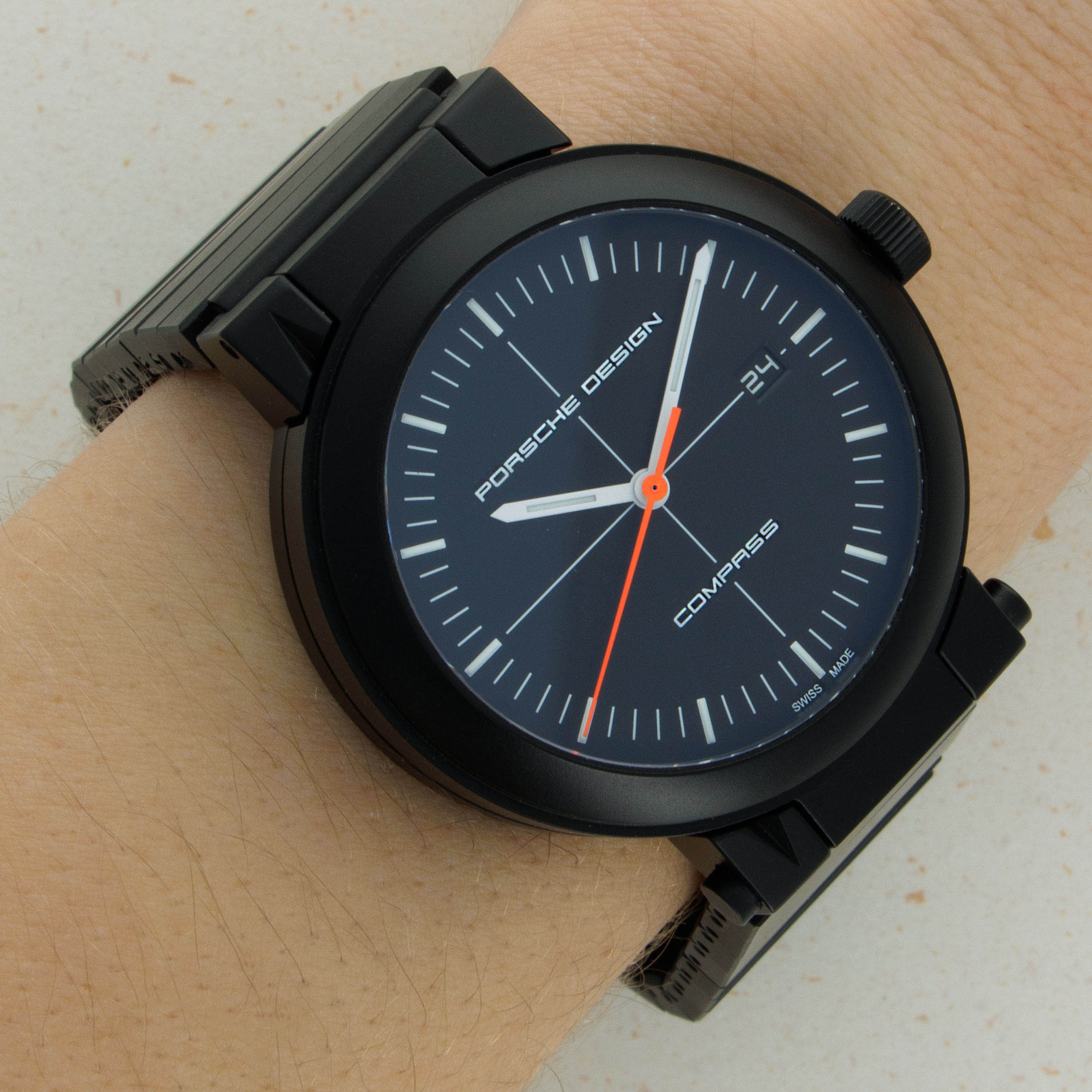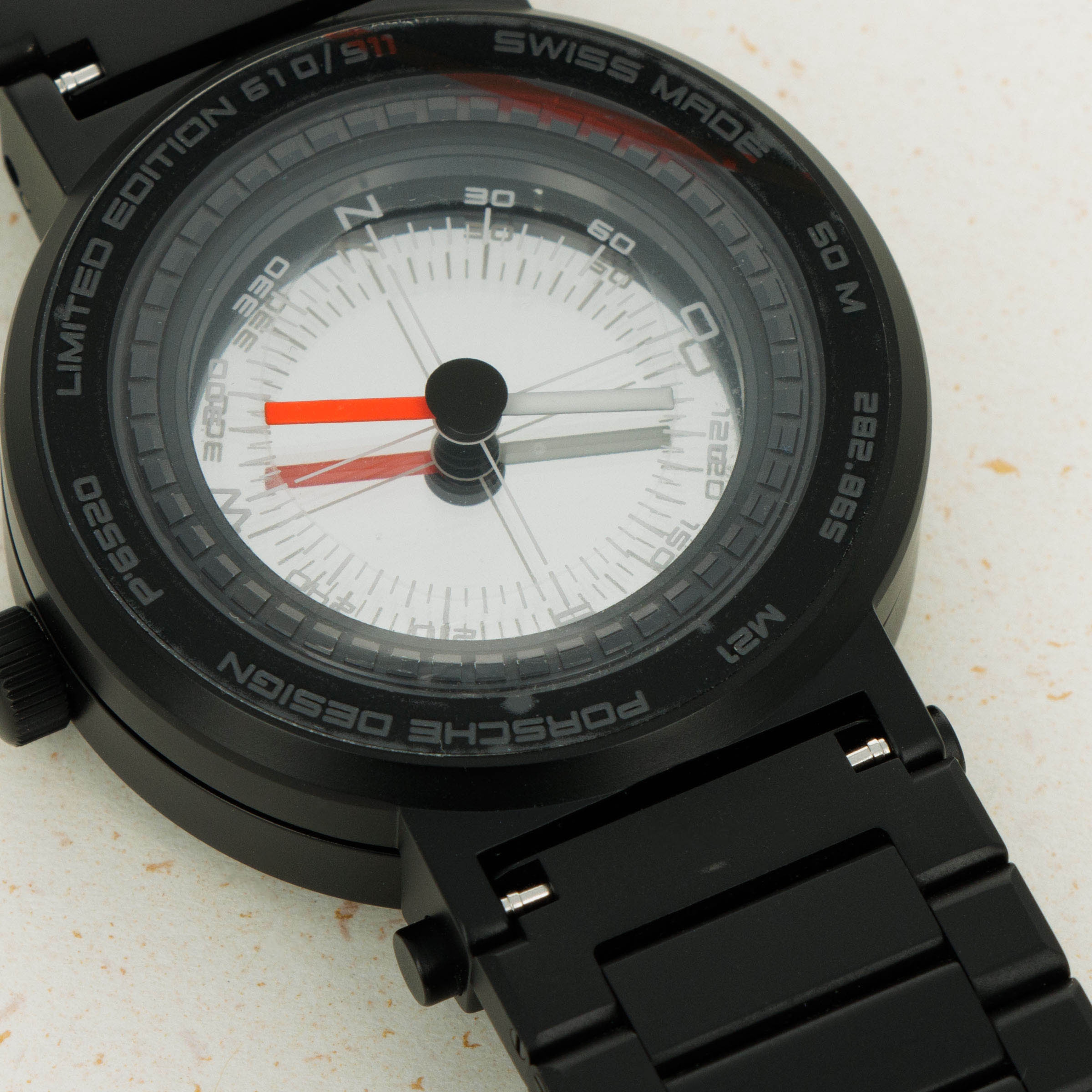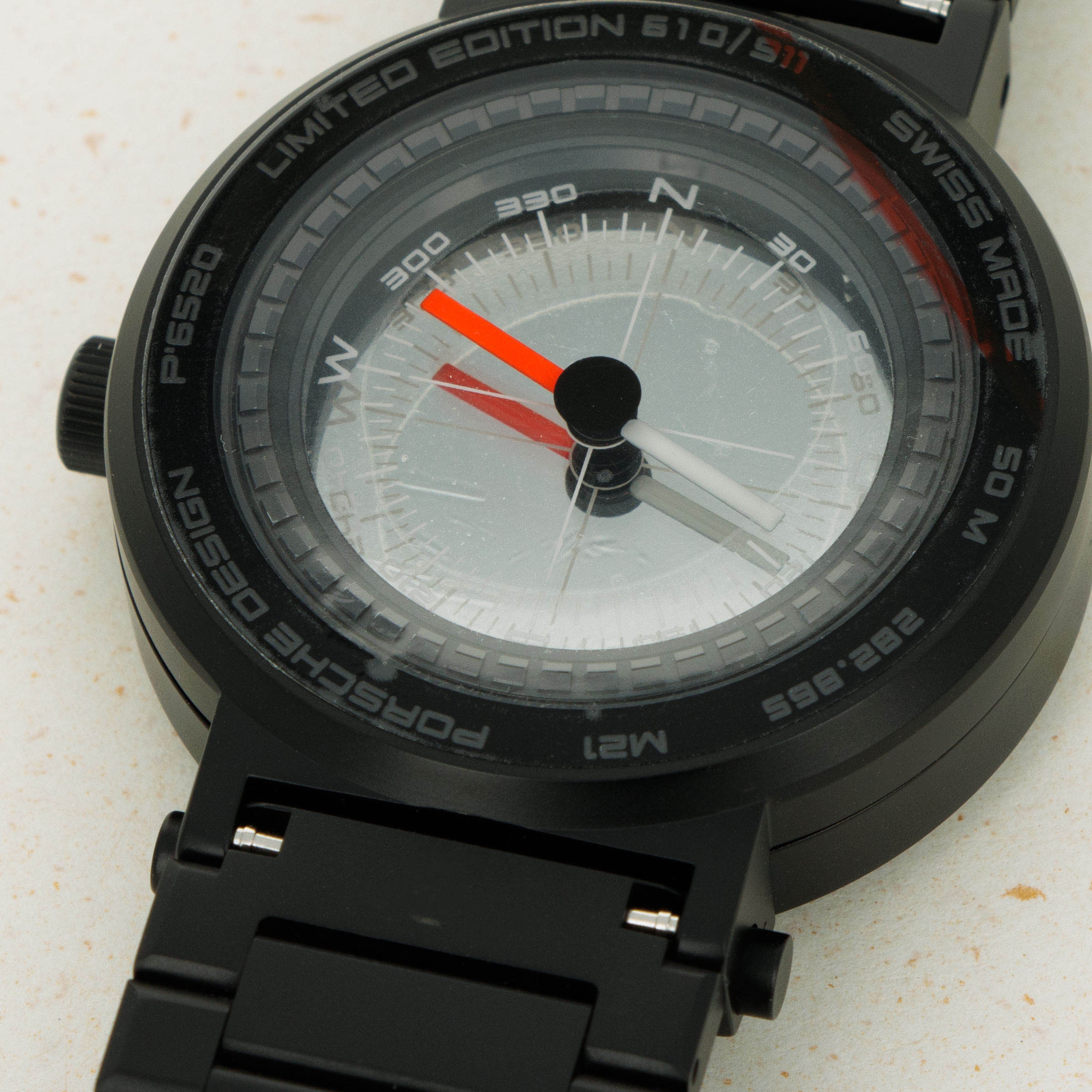 Featuring a black sector dial the Porsche Design Compass' bright orange seconds hand adds a burst of color to its otherwise blacked-out aesthetic.