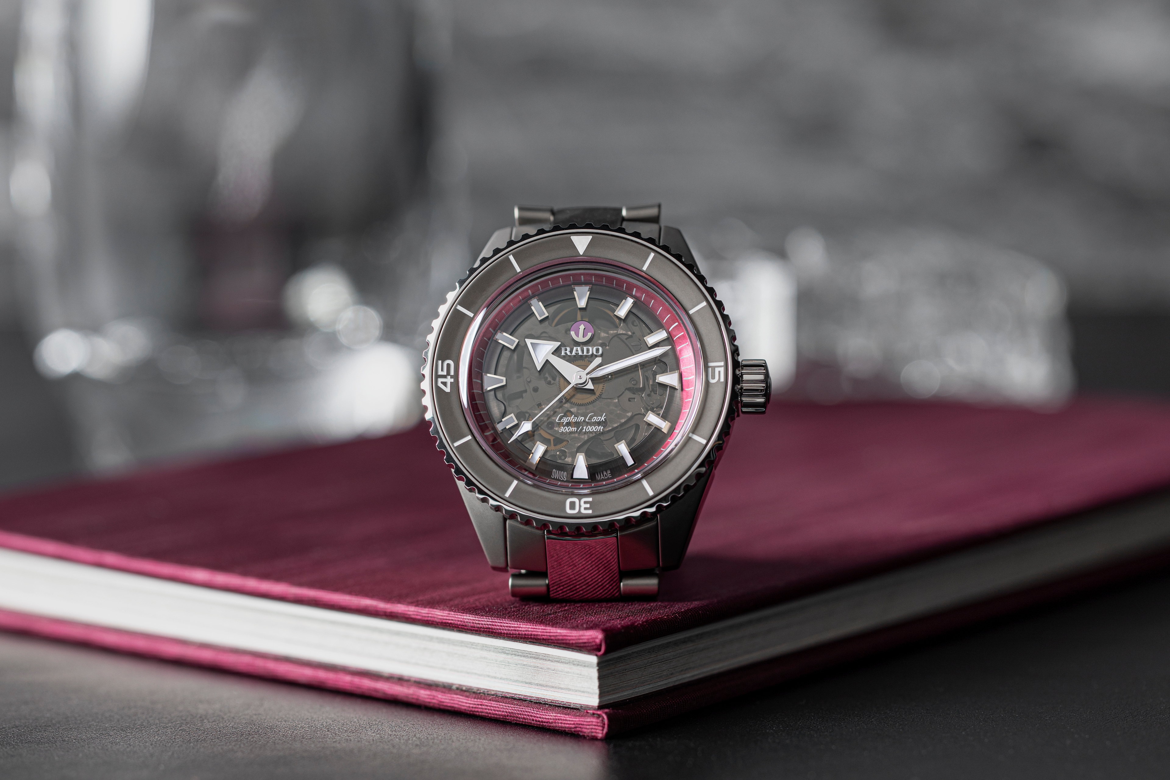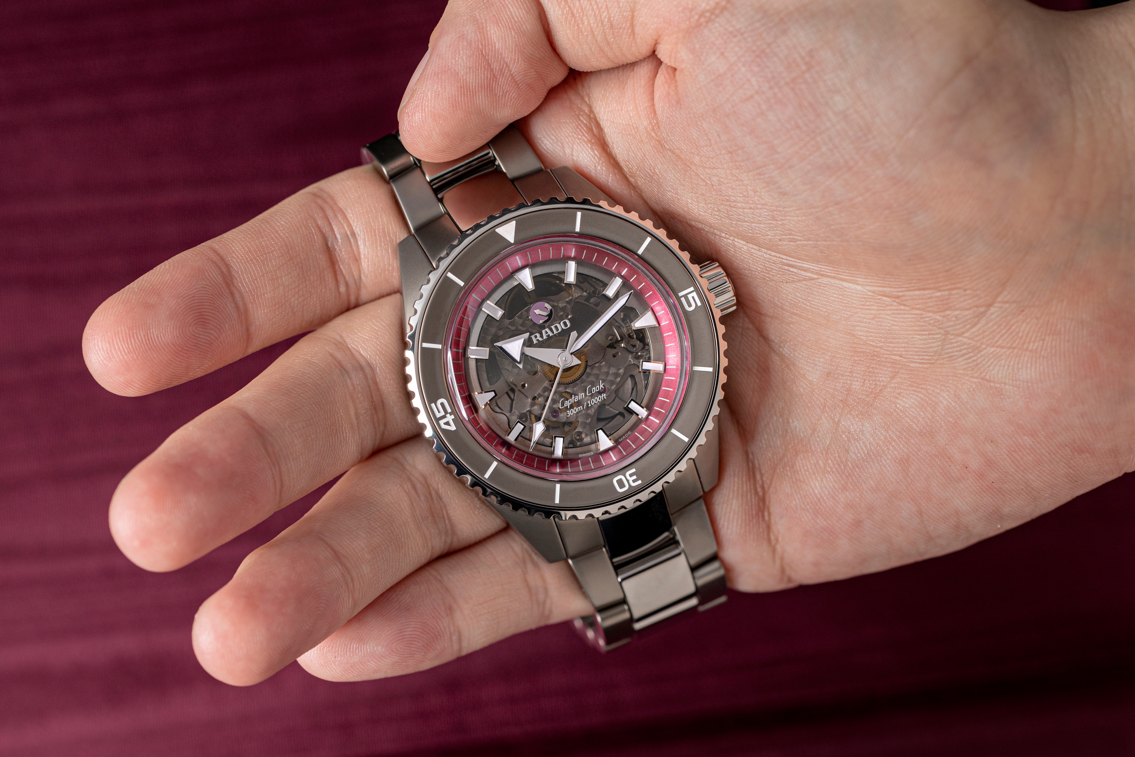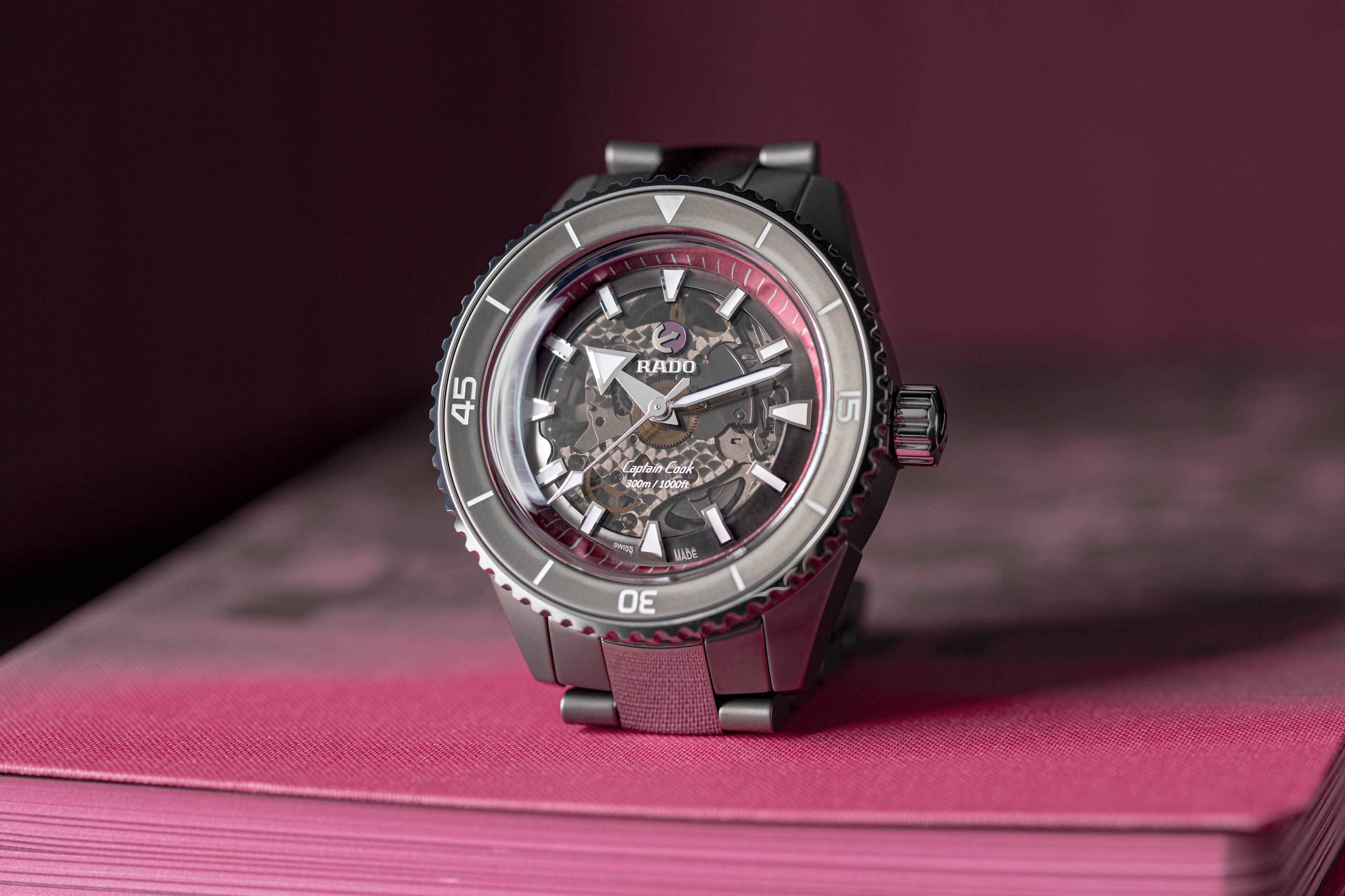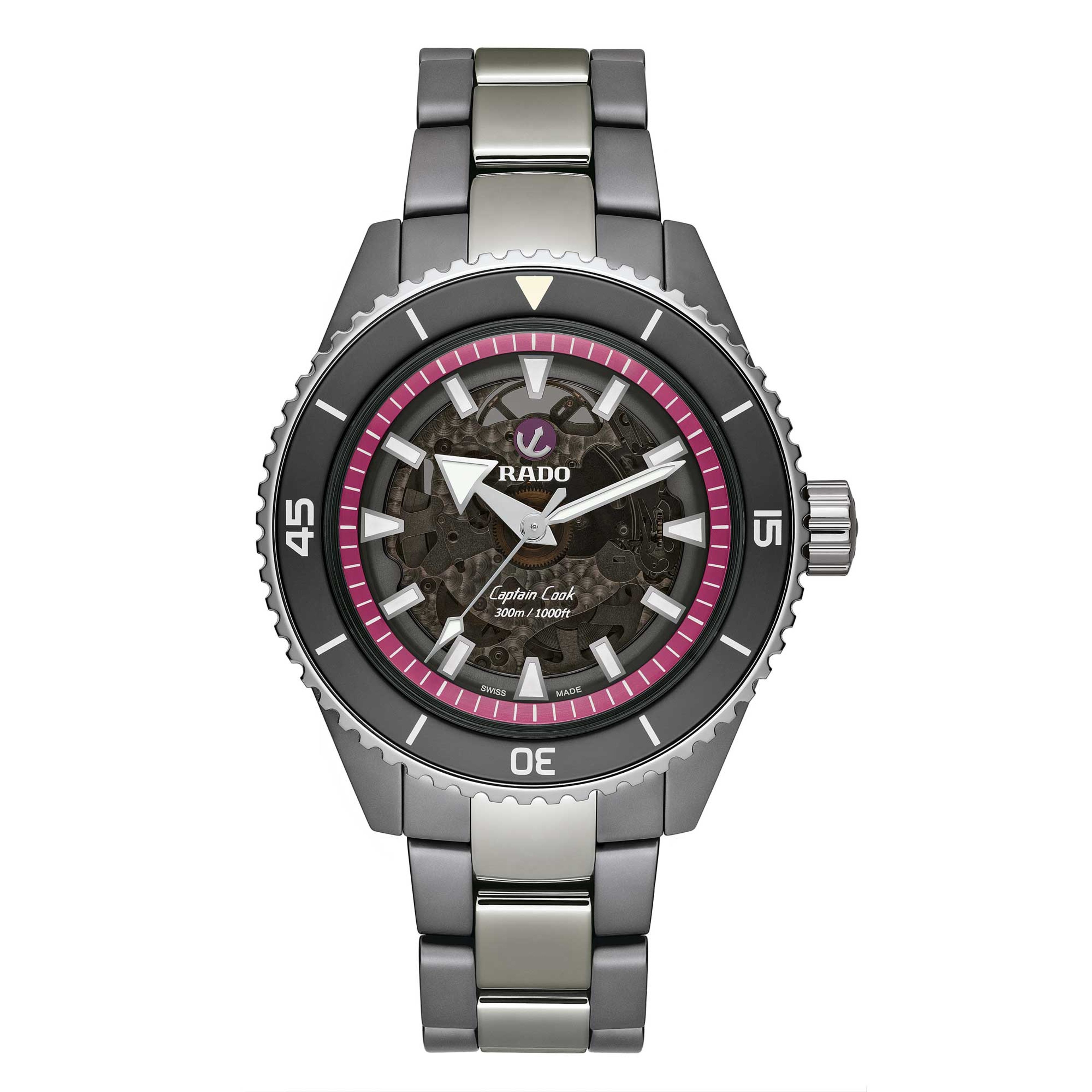 Dark grey, black tinted sapphire crystal Appliquéd indices with white Super-LumiNova® treatment Rhodium-colored moving-anchor symbol with ruby backplate Pink flange, to underline the event “The Pink Dial Project” White printed Rado and Captain Cook logos