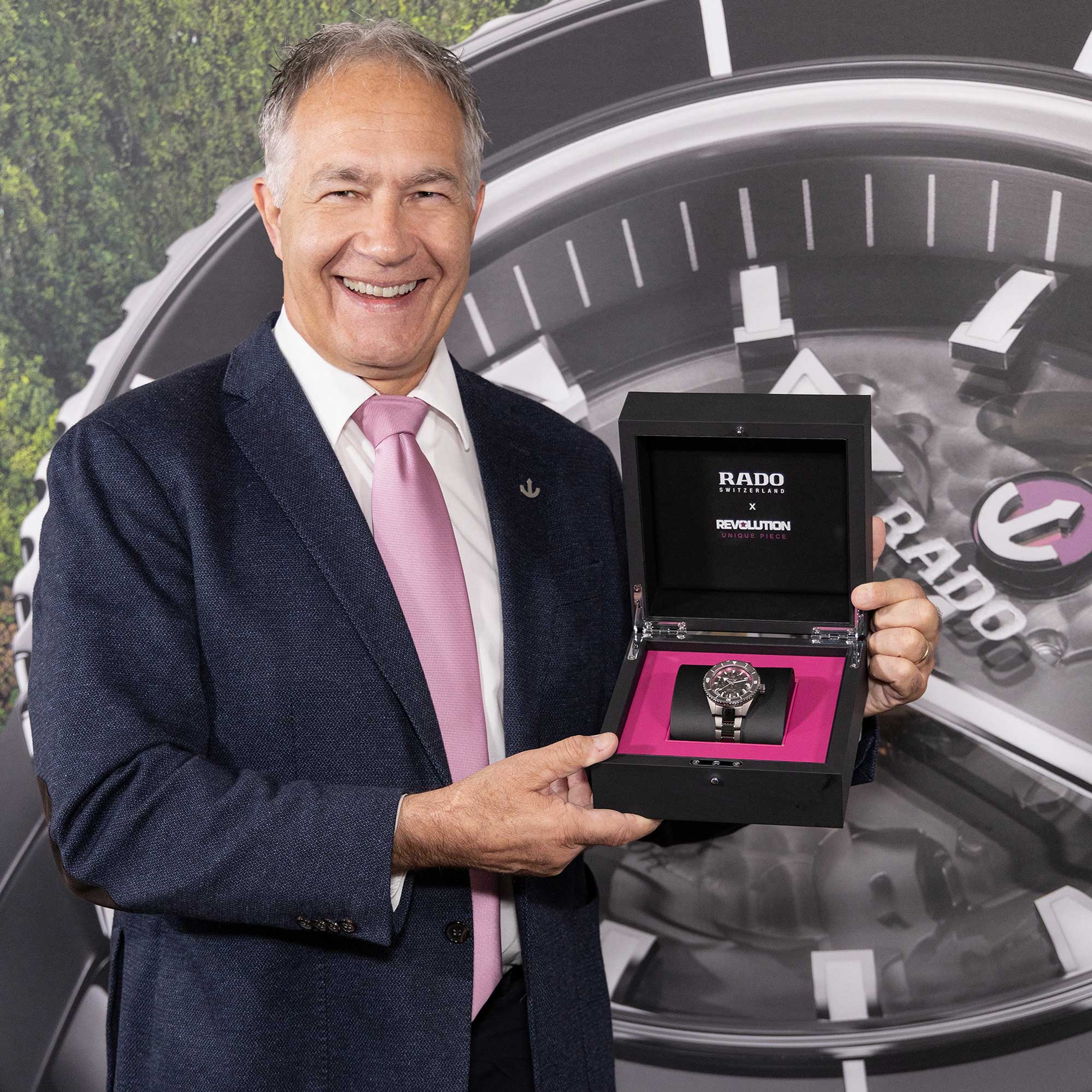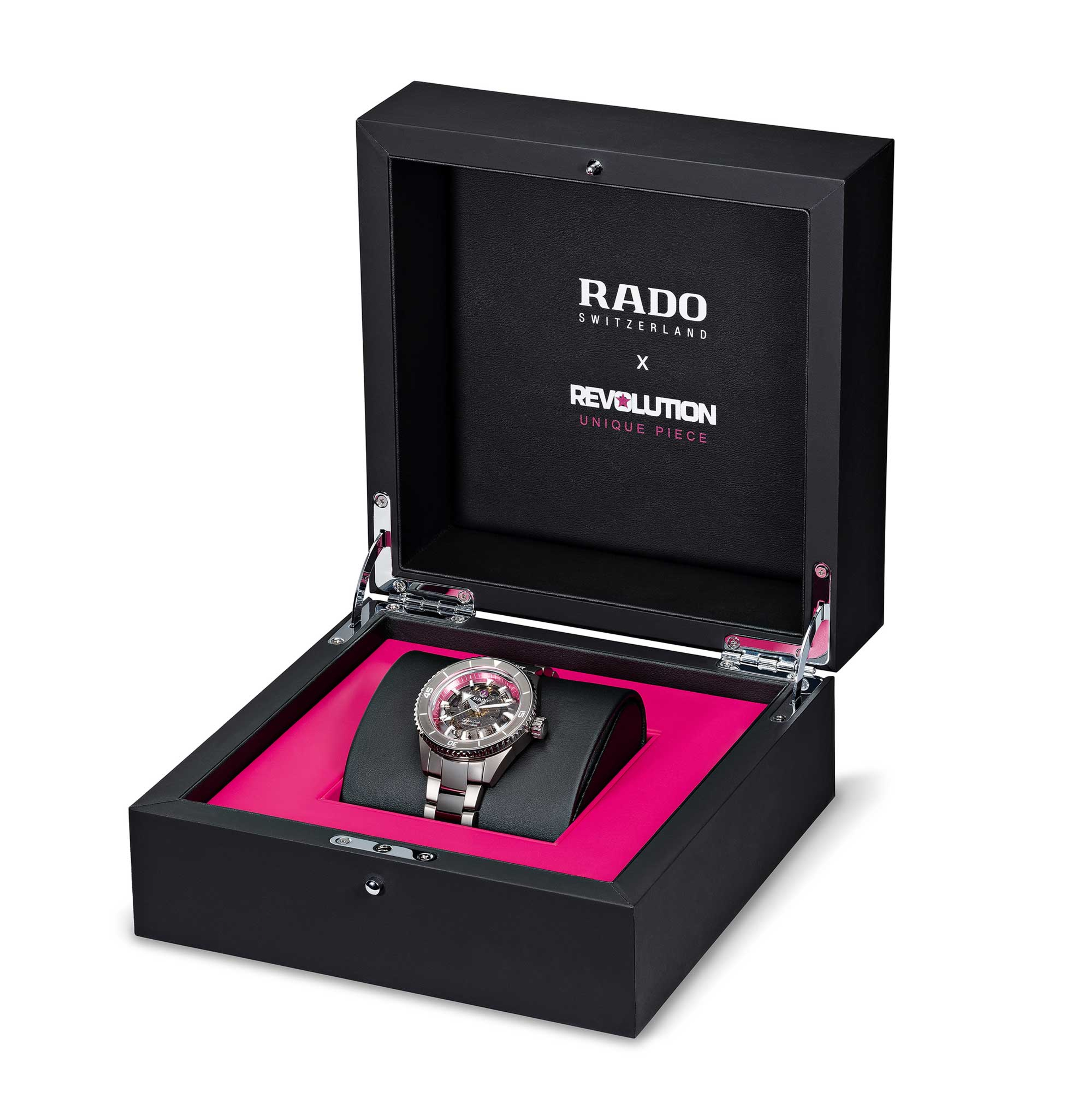 The Captain Cook model is one of Rado’s most iconic timepieces. Bold and expressive in design, it is also built using the most cutting-edge technologies: a matte plasma high-tech ceramic case with monobloc construction, an R734 automatic movement with an 80-hour power reserve and Nivachron™ antimagnetic hairspring, as well as a contrasting matt/polished plasma ceramic-link bracelet and a titanium triple-fold clasp with Ceramos™ release. For the the Pink Dial Project, this one-off timepiece to be auctioned features, inside the stainless steel bezel with matt plasma ceramic insert, a stunning pink flange to honour the colour internationally associated with breast cancer. Neatly, the colour complements the ruby backplate and rhodium tone of the moving-anchor symbol beautifully. Its caseback also carries an engraved, special decoration with the “REVOLUTION” logo and the mention “UNIQUE PIECE” to ensure that the event and charitable cause will long be remembered.