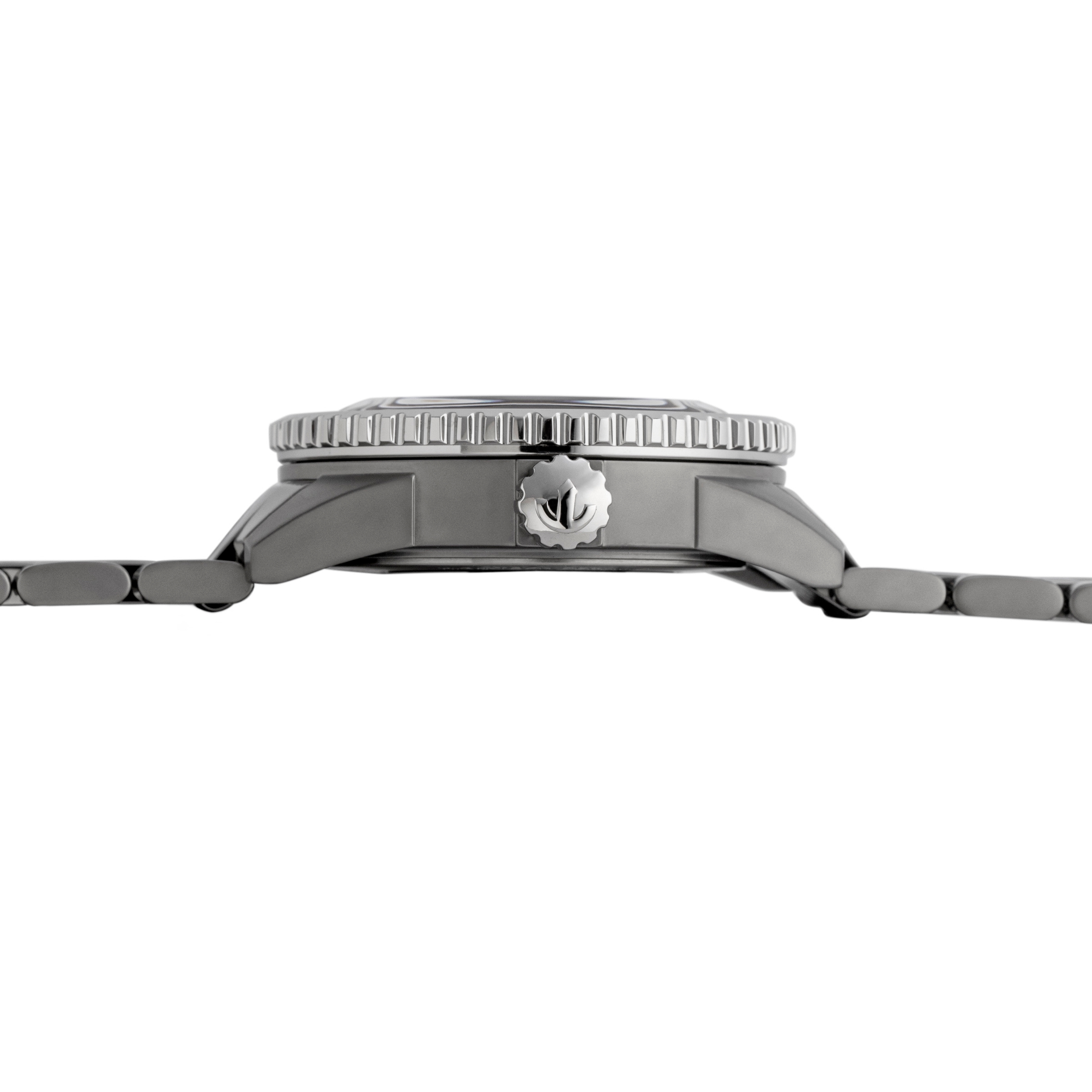 Matte plasma high-tech ceramic outer links, with polished plasma high-tech ceramic middle links, titanium triple-fold clasp with Ceramos™ release
