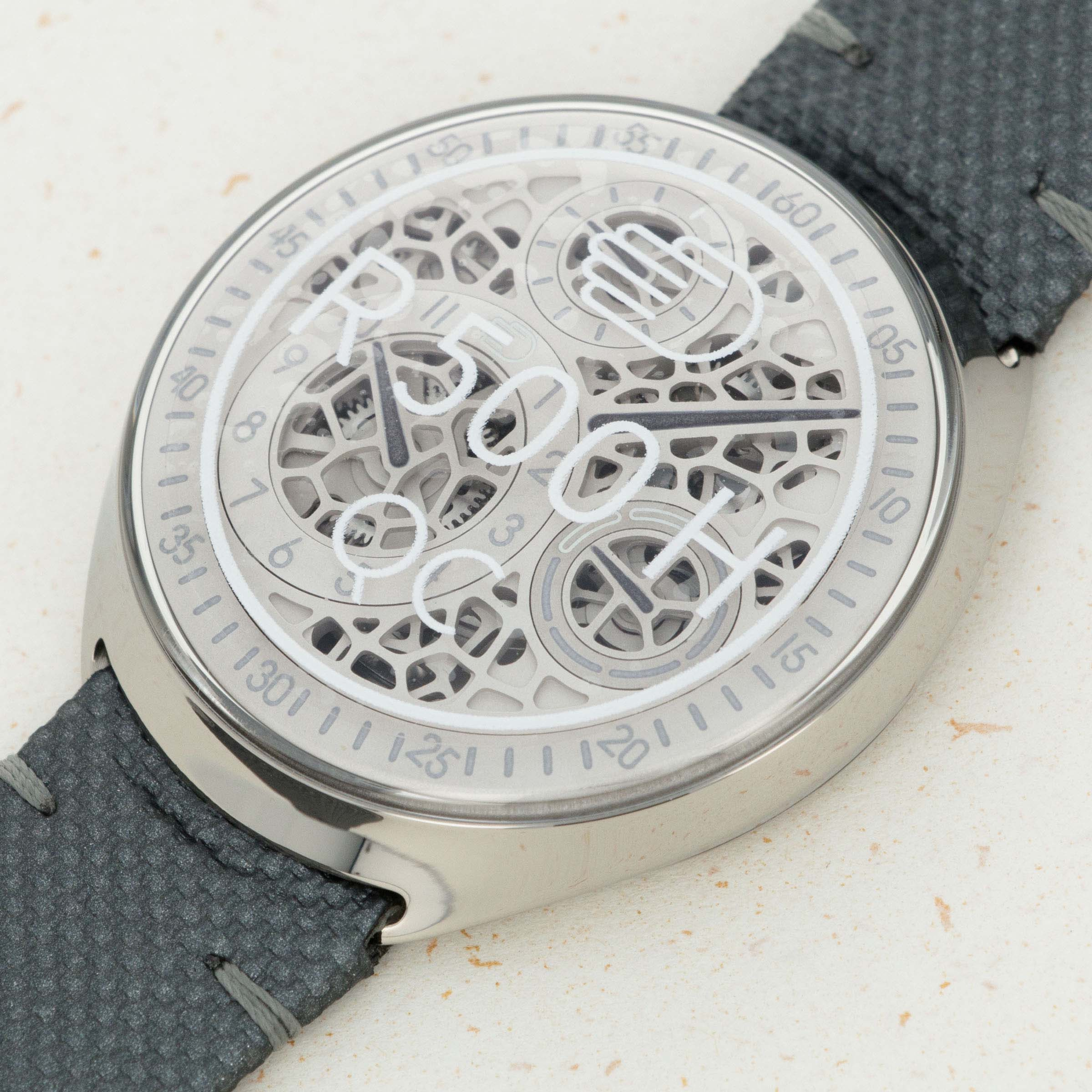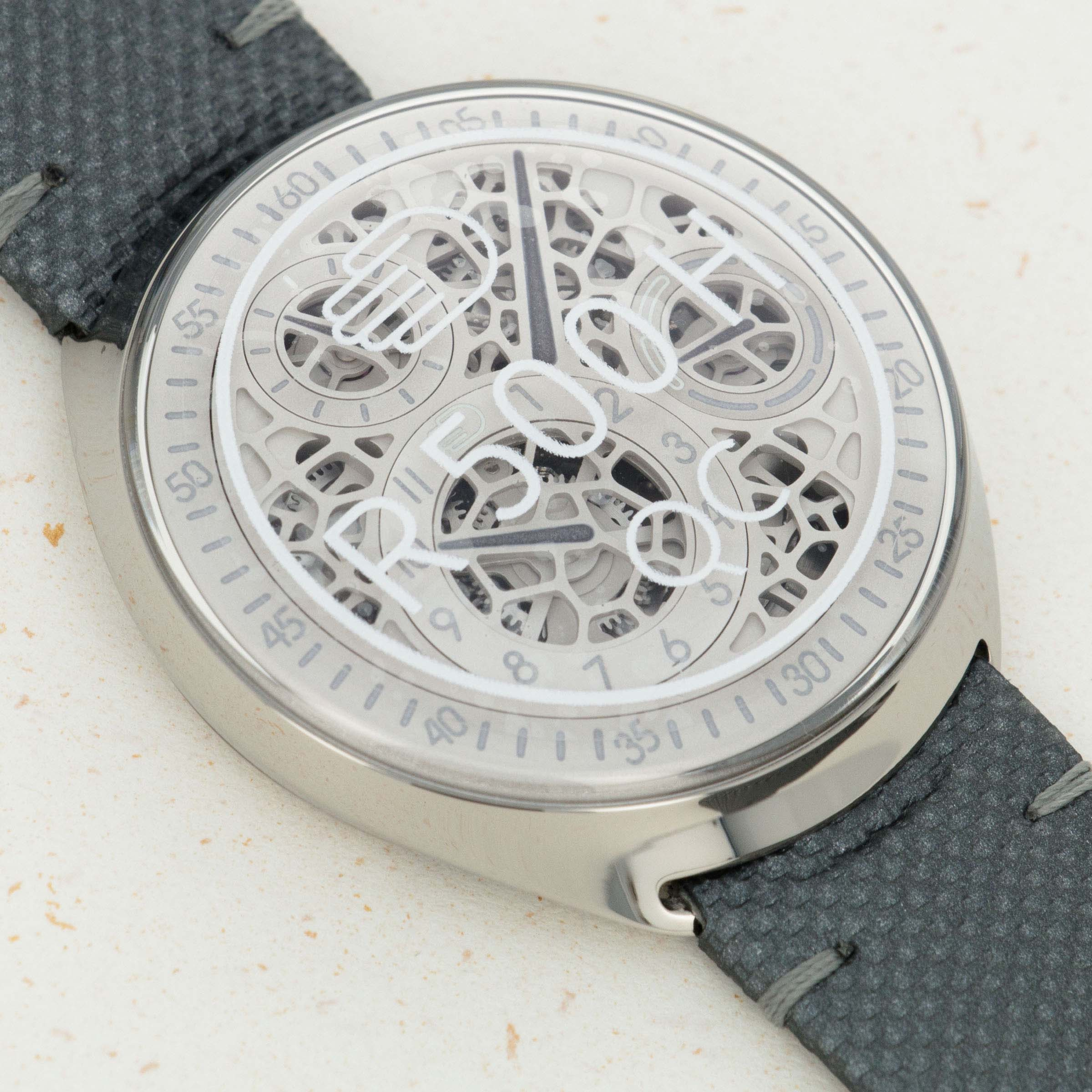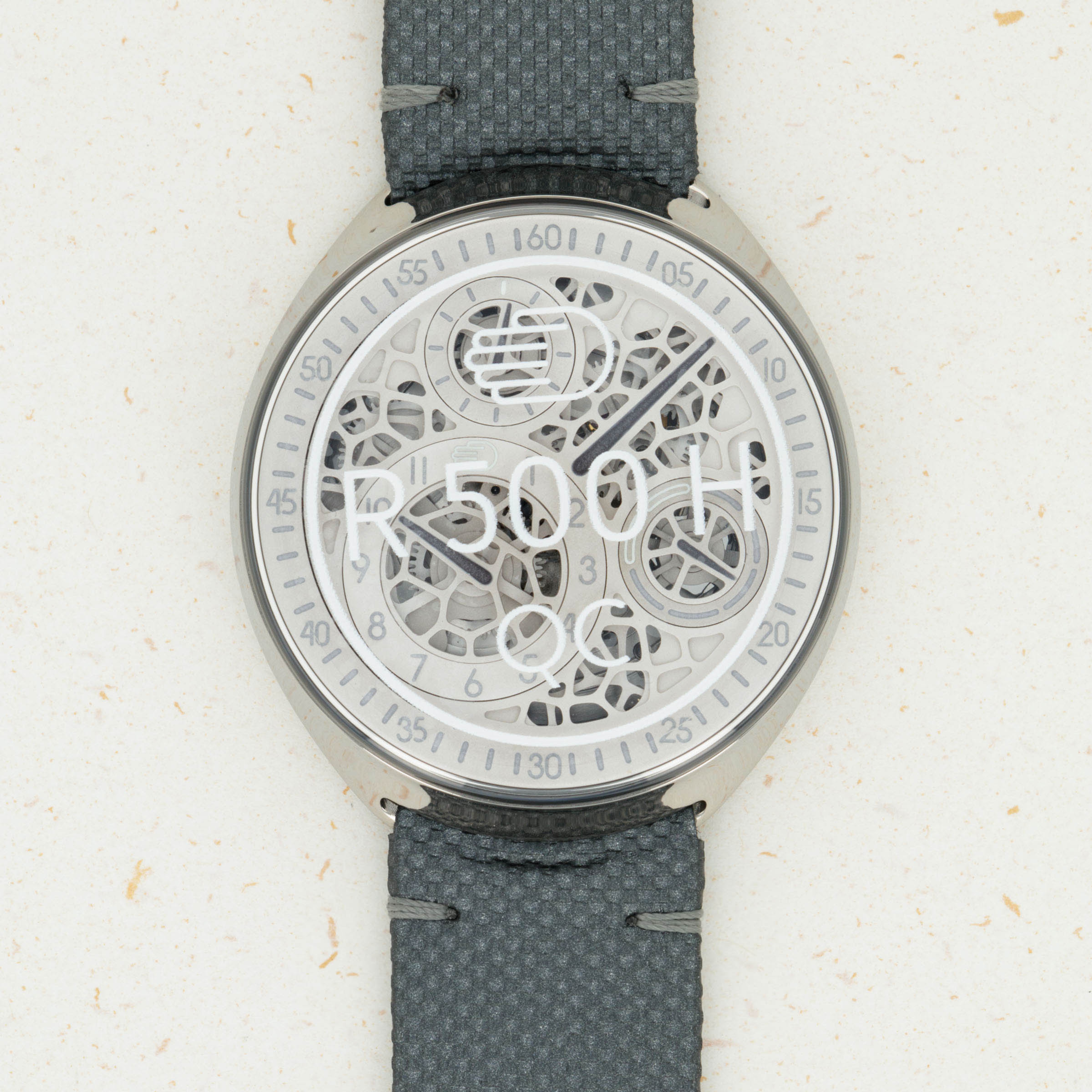 A collaboration between Ressence and the famed watch publication HODINKEE, the Ressence Type 1 Slim HOD is, as HODINKEE put it, "the most unadulterated take on a Ressence watch yet" as the two brands have worked to distill Ressence's signature design language and simultaneously remove any distracting design details. With its skeletonized dial, the timepiece highlights the movement beneath without compromising the unique display that has gone on to become one of Ressence's most important details in its aesthetic and mechanical execution. Offered in a monochromatic grey case and dial on a grey textile strap, the timepiece pays homage to HODINKEE's signature color while also playing to the timepiece's intention to refrain from being too loud. With only 20 pieces produced, this is an incredibly limited and rare timepiece that has the looks to back up its unique aesthetic and intriguing mechanics.