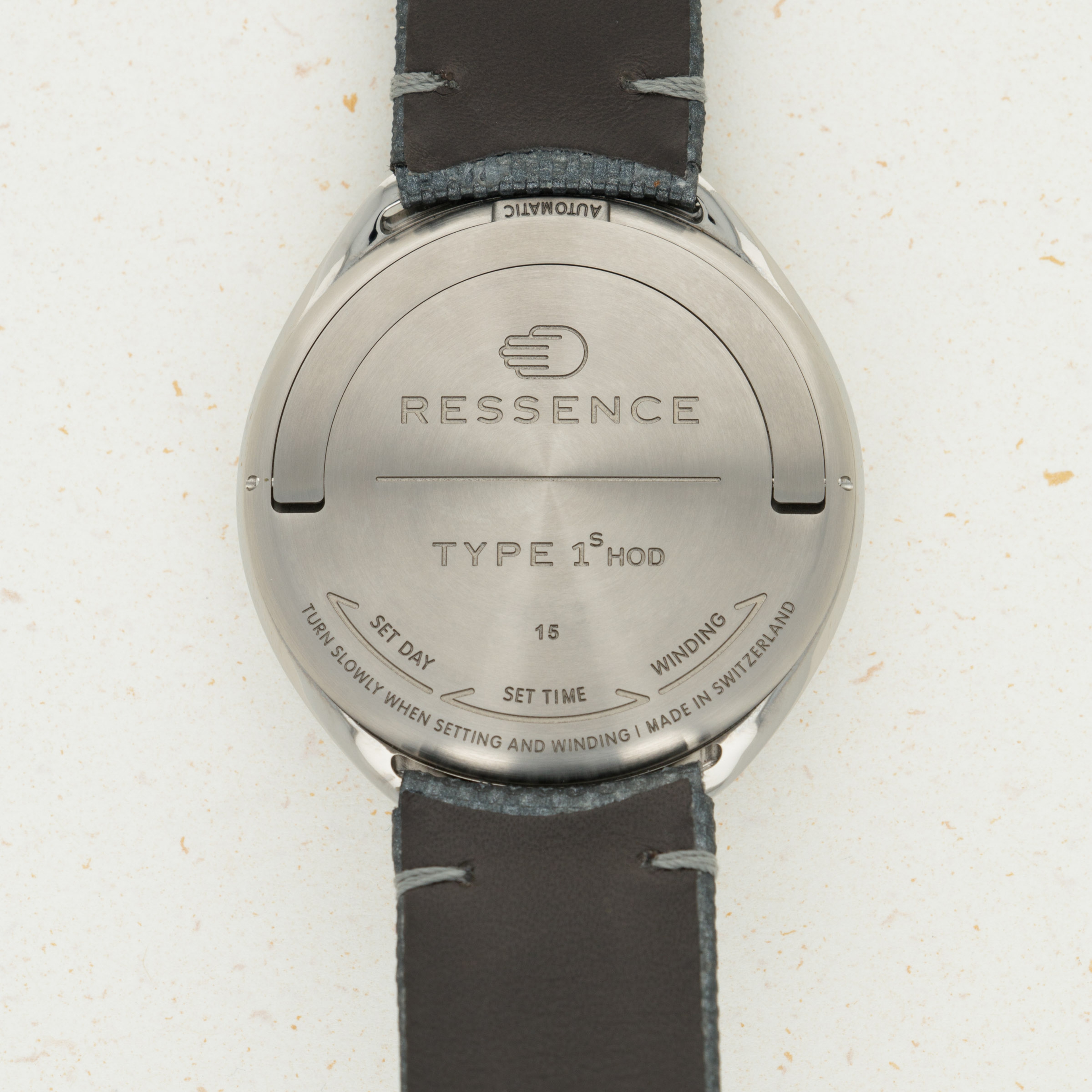 A streamlined version of Ressence's Type 1 case, the Type 1 Slim HOD earns its name thanks to an 11mm thick profile and a crown-less construction. Instead, it is wound and set via the crown built into its caseback.