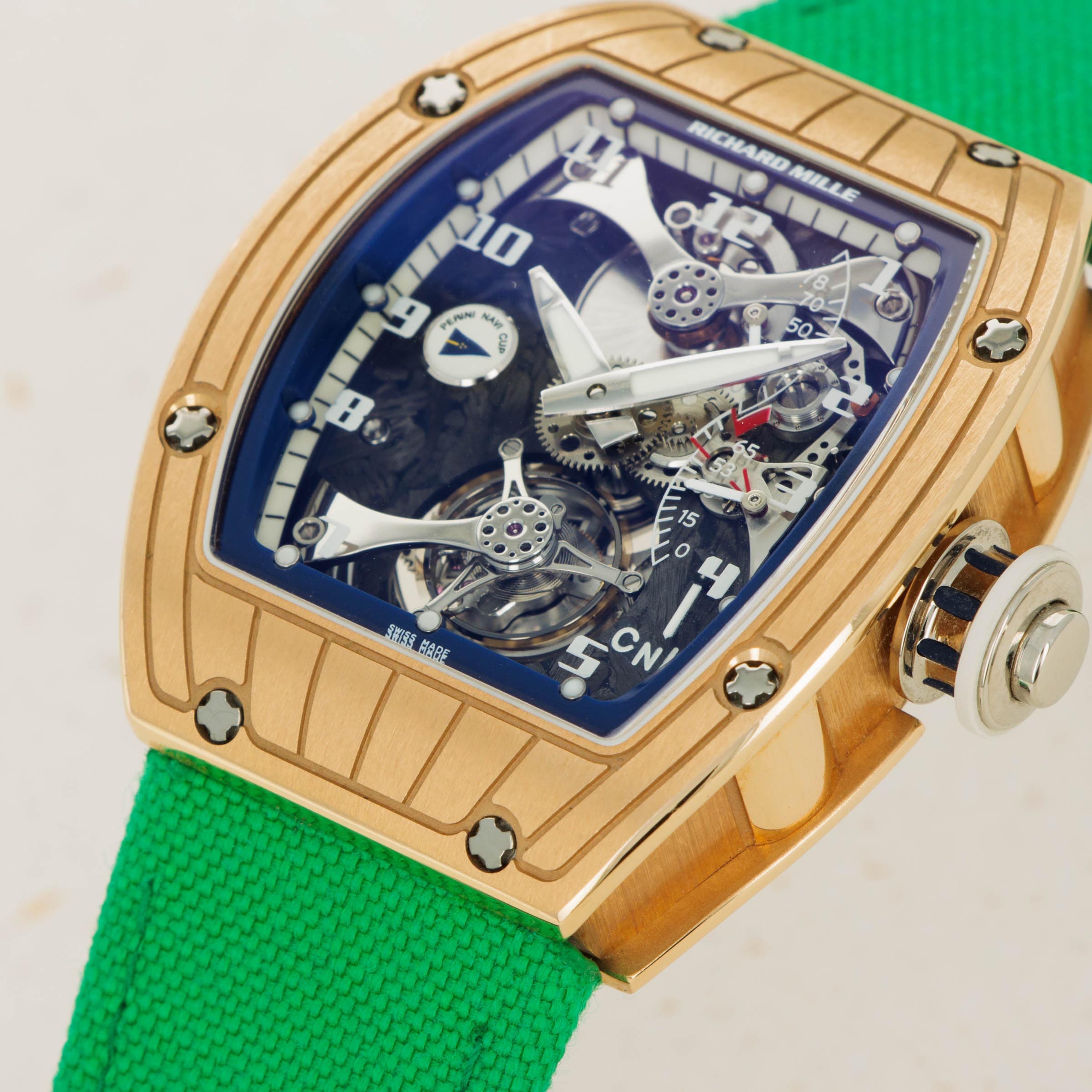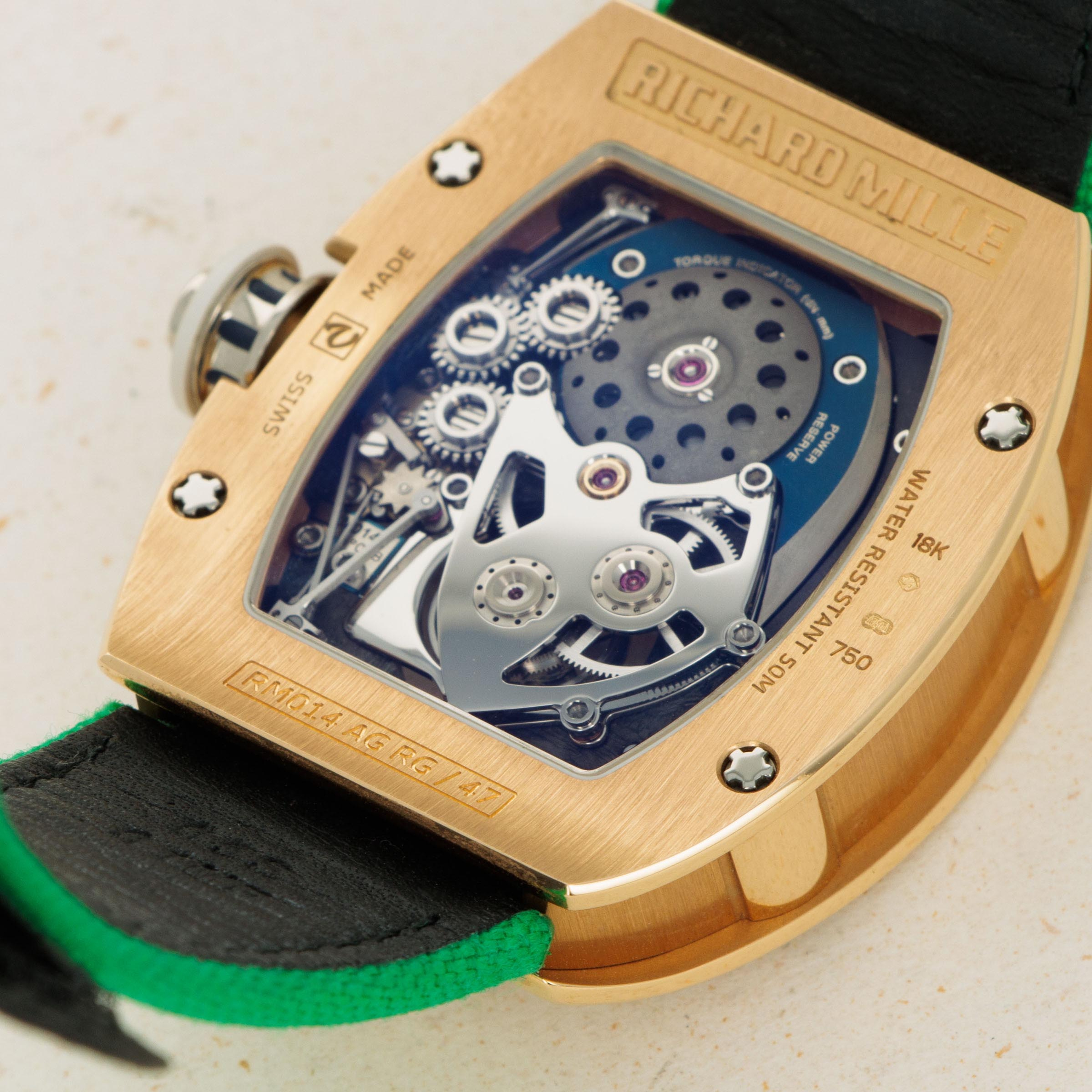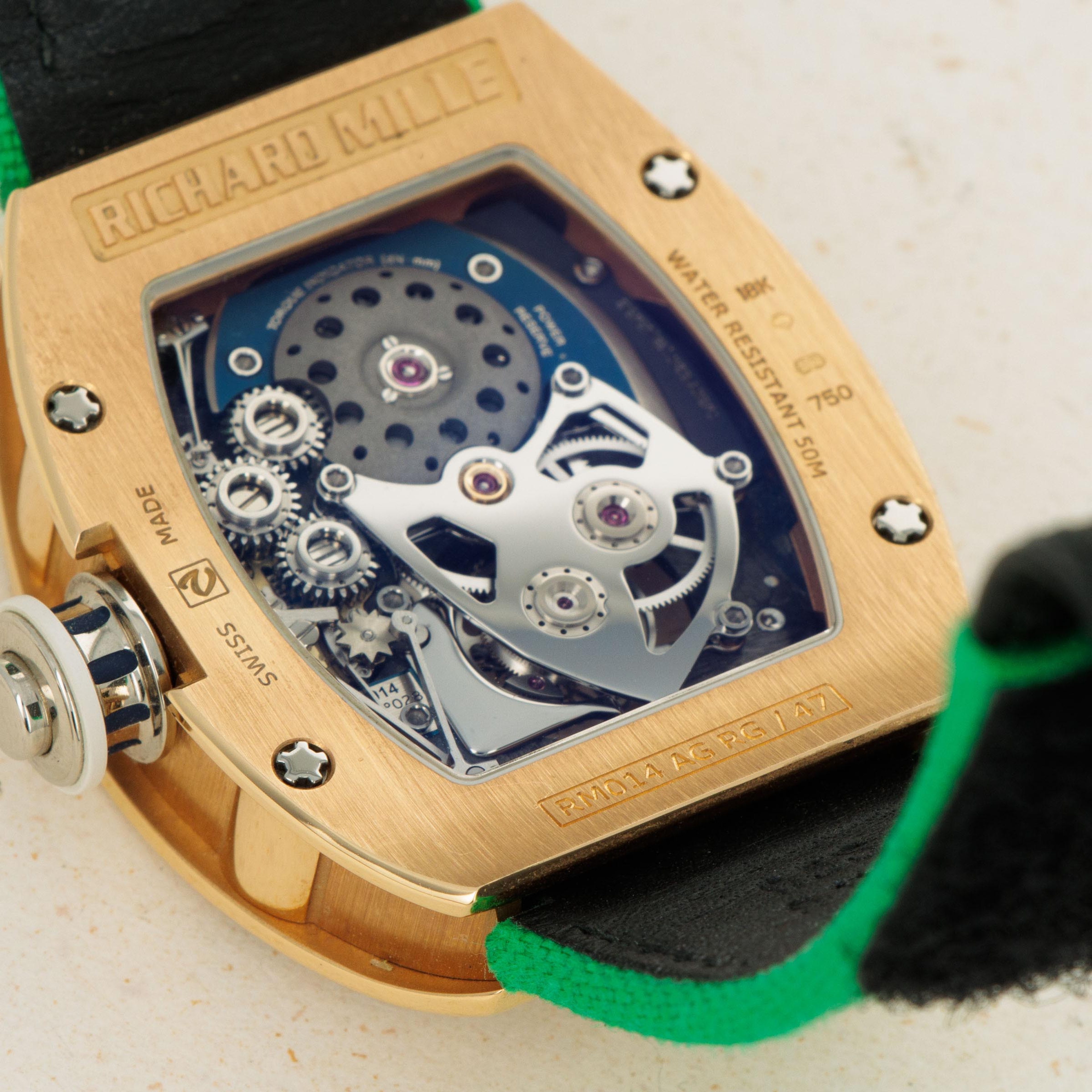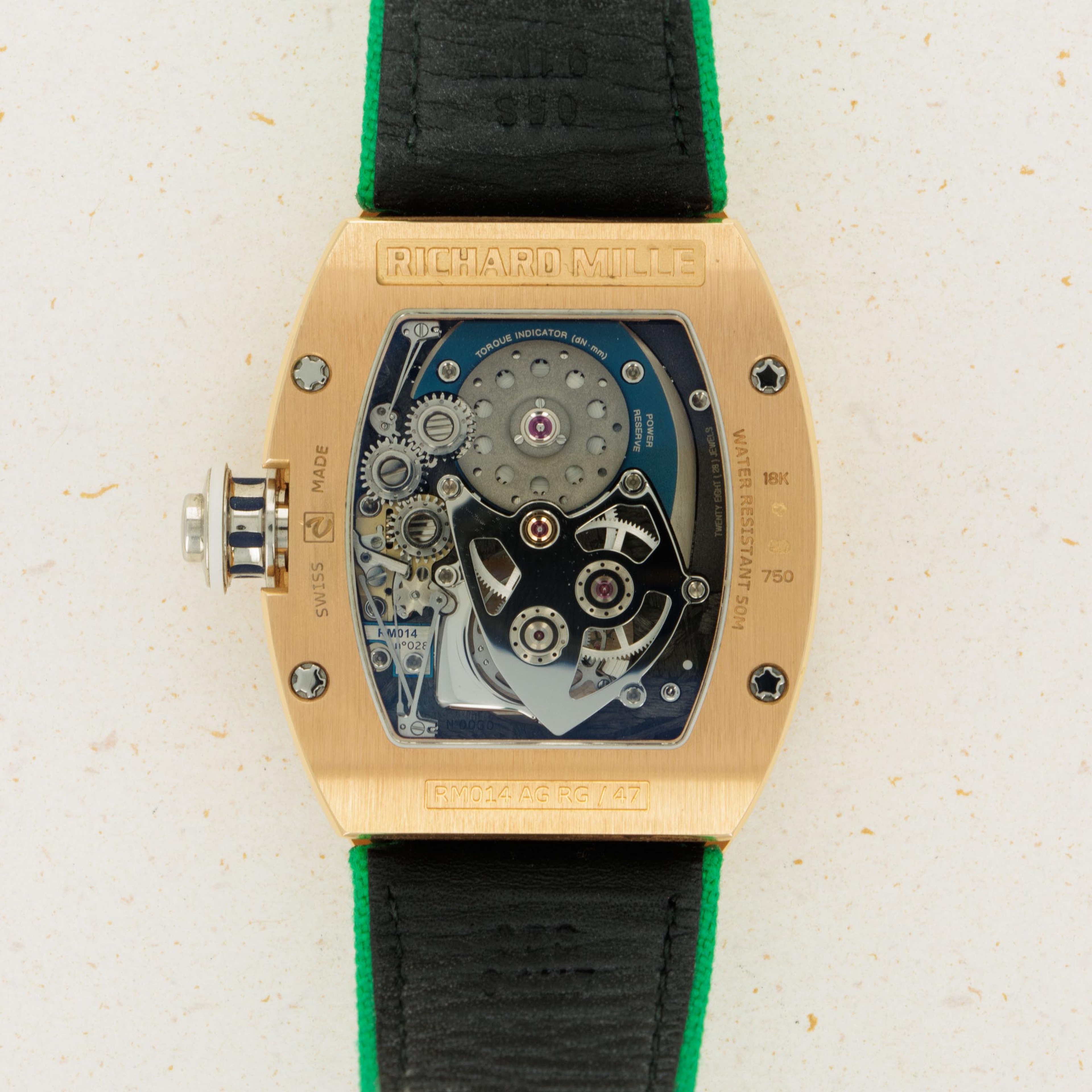 Featuring Richard Mille's signature tonneau-shaped construction with a ribbed design engraved across its 18kt rose gold bezel; the RM014 boasts the brand's emblematic wrist presence that has allowed the watchmaker to become instantly recognizable on the wrist of its collectors.